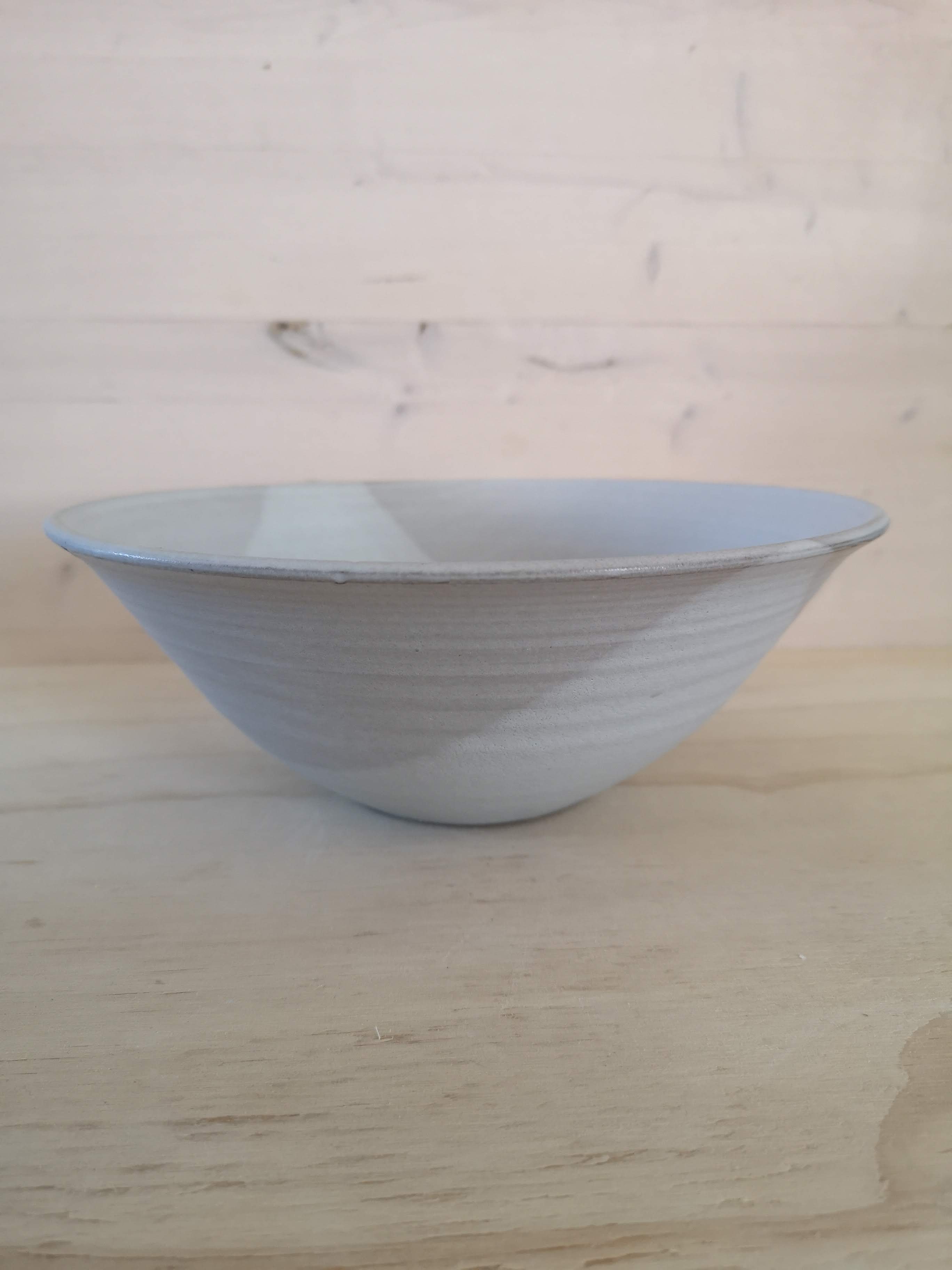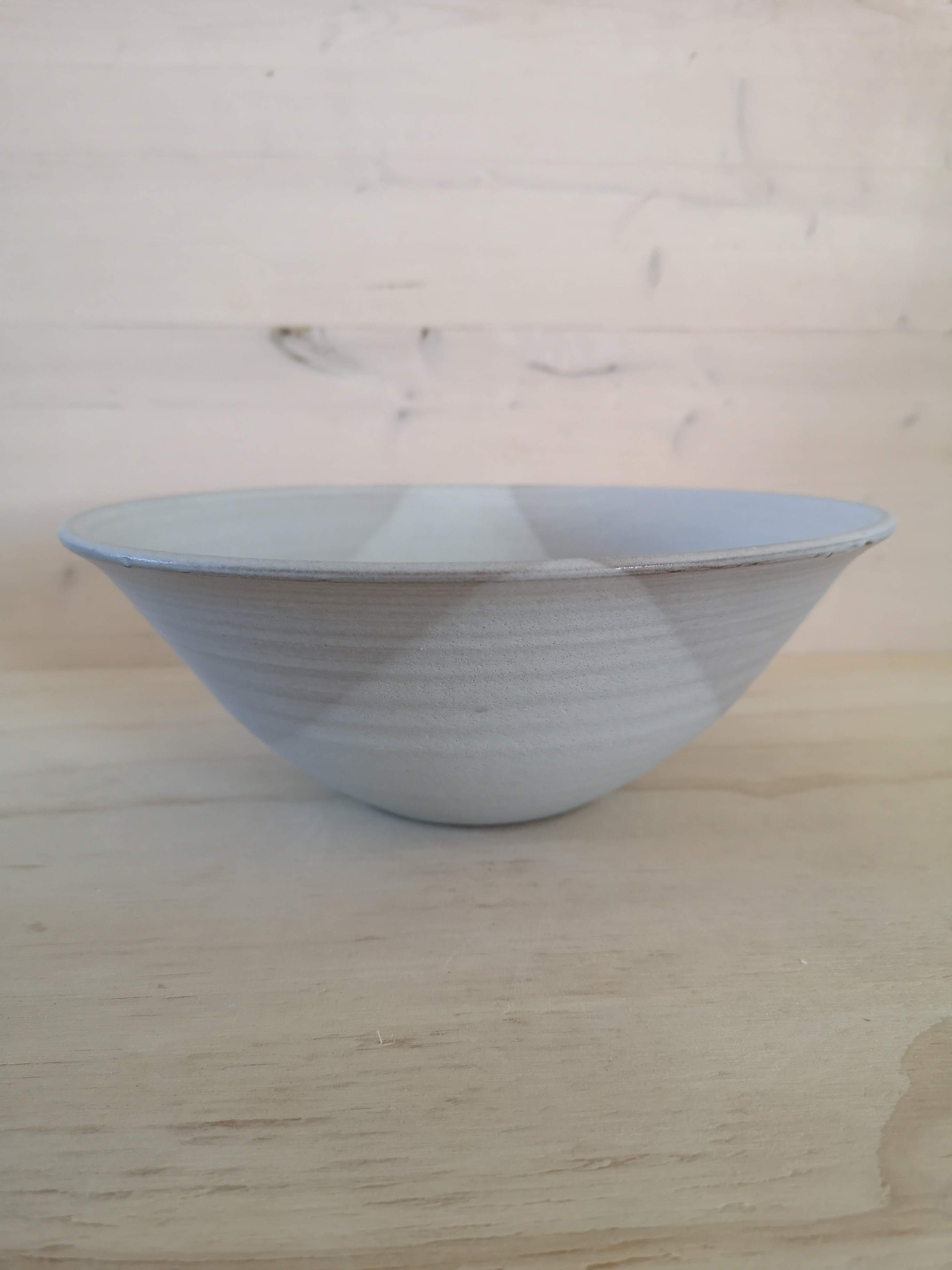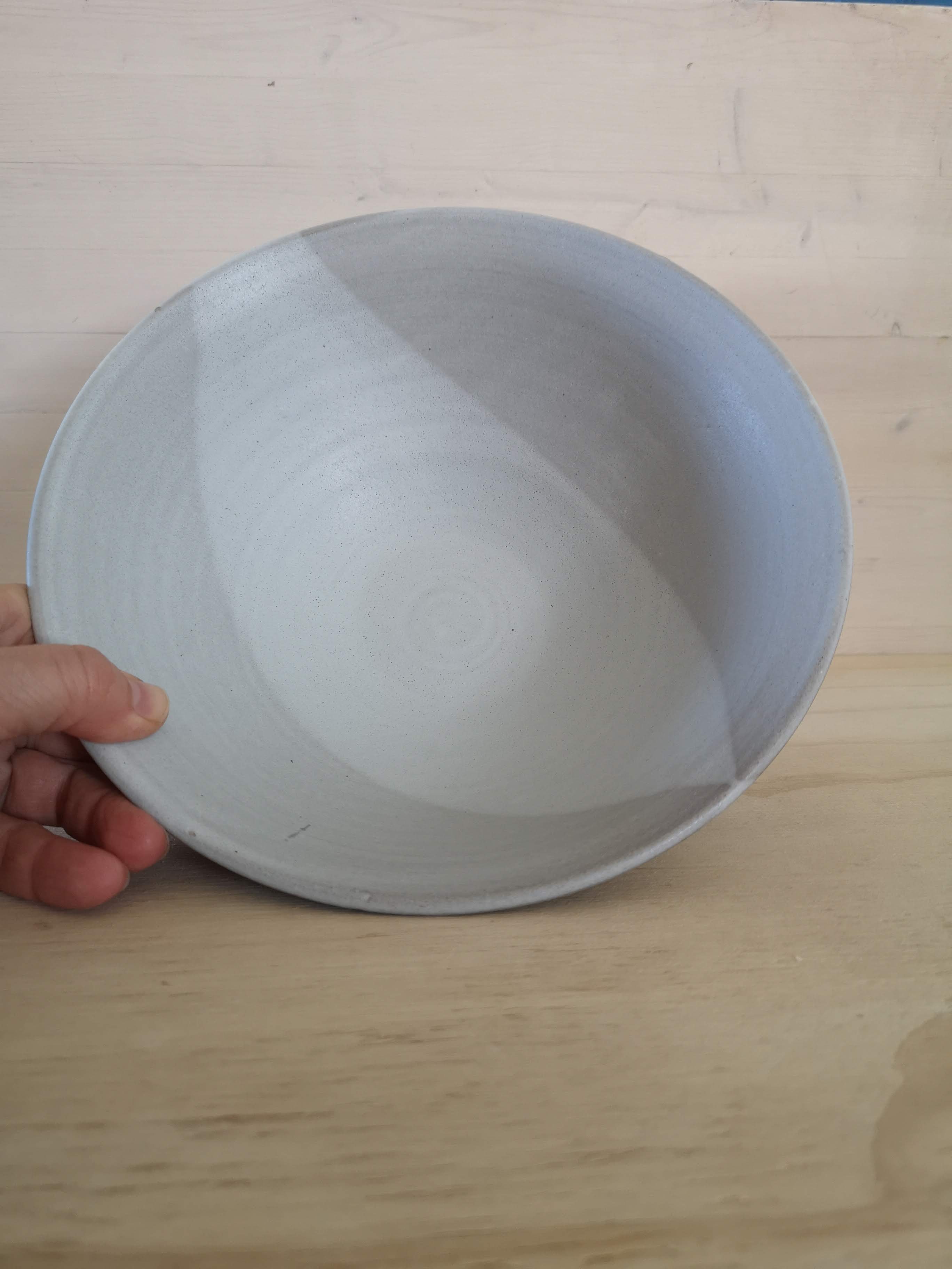 Large, deep bowl. Red stoneware glazed in foggy grey. About 5" x 1".