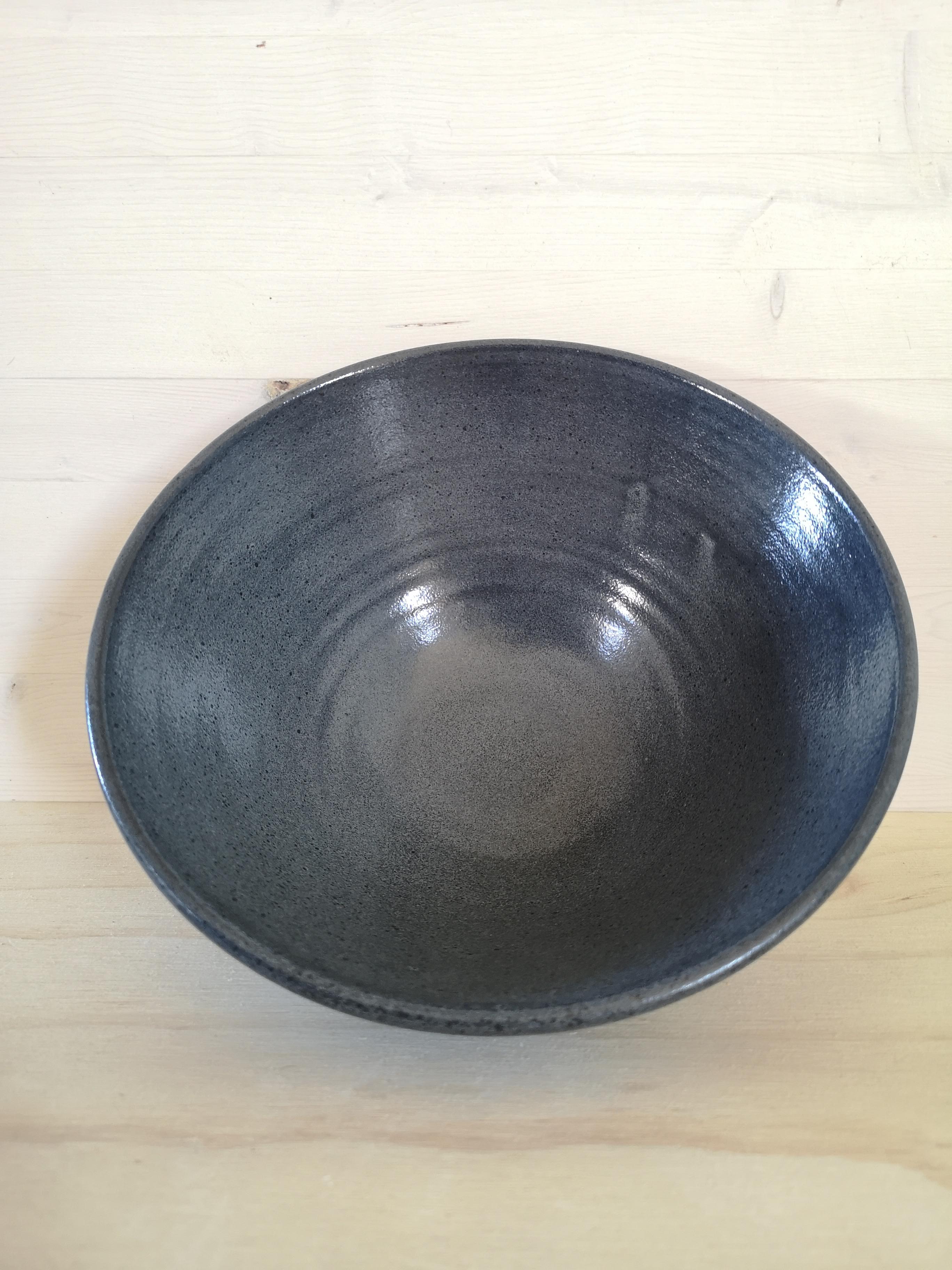 Large, deep bowl. Red stoneware glazed in charcoal. About 9" x 3 1/2".