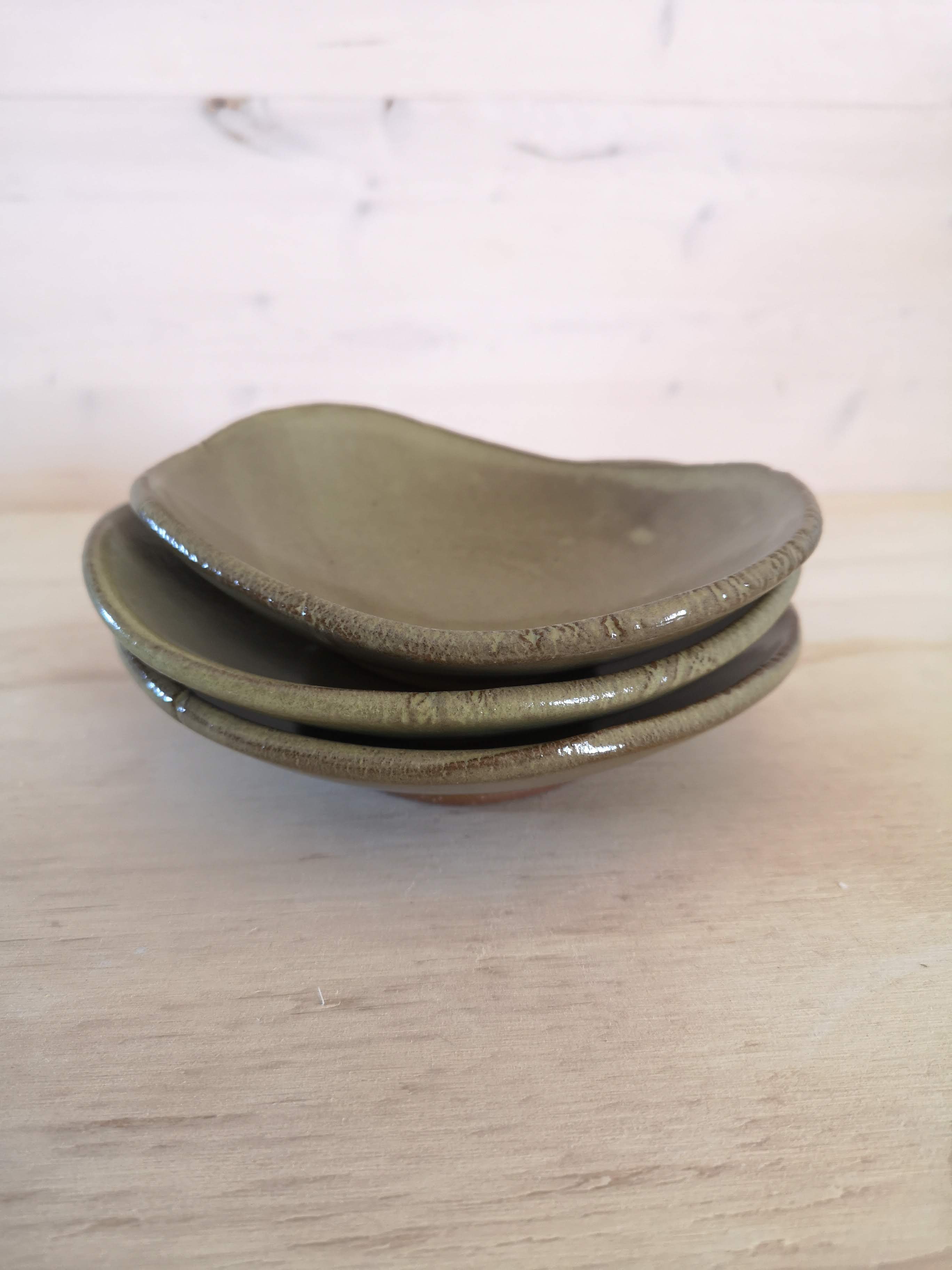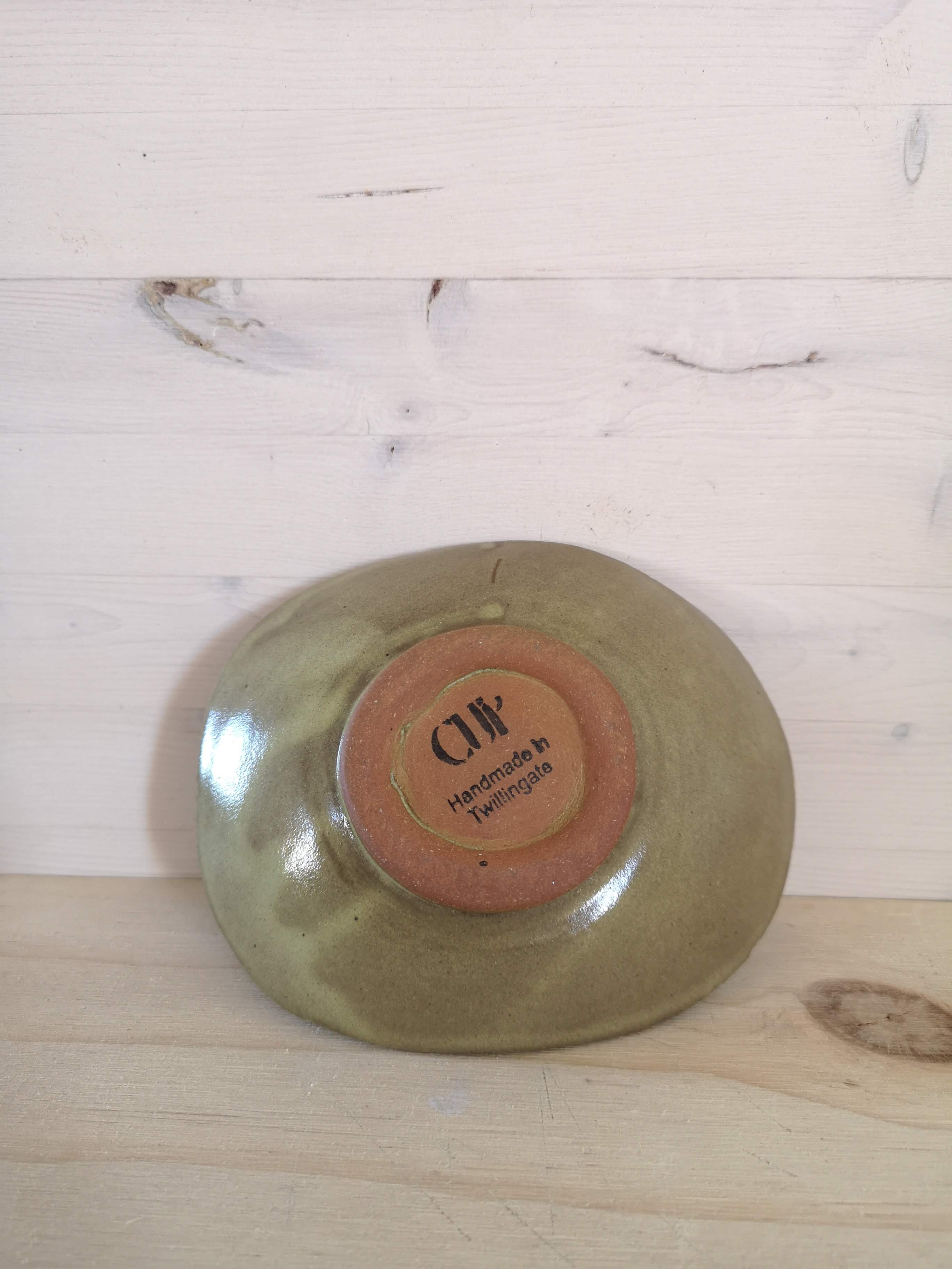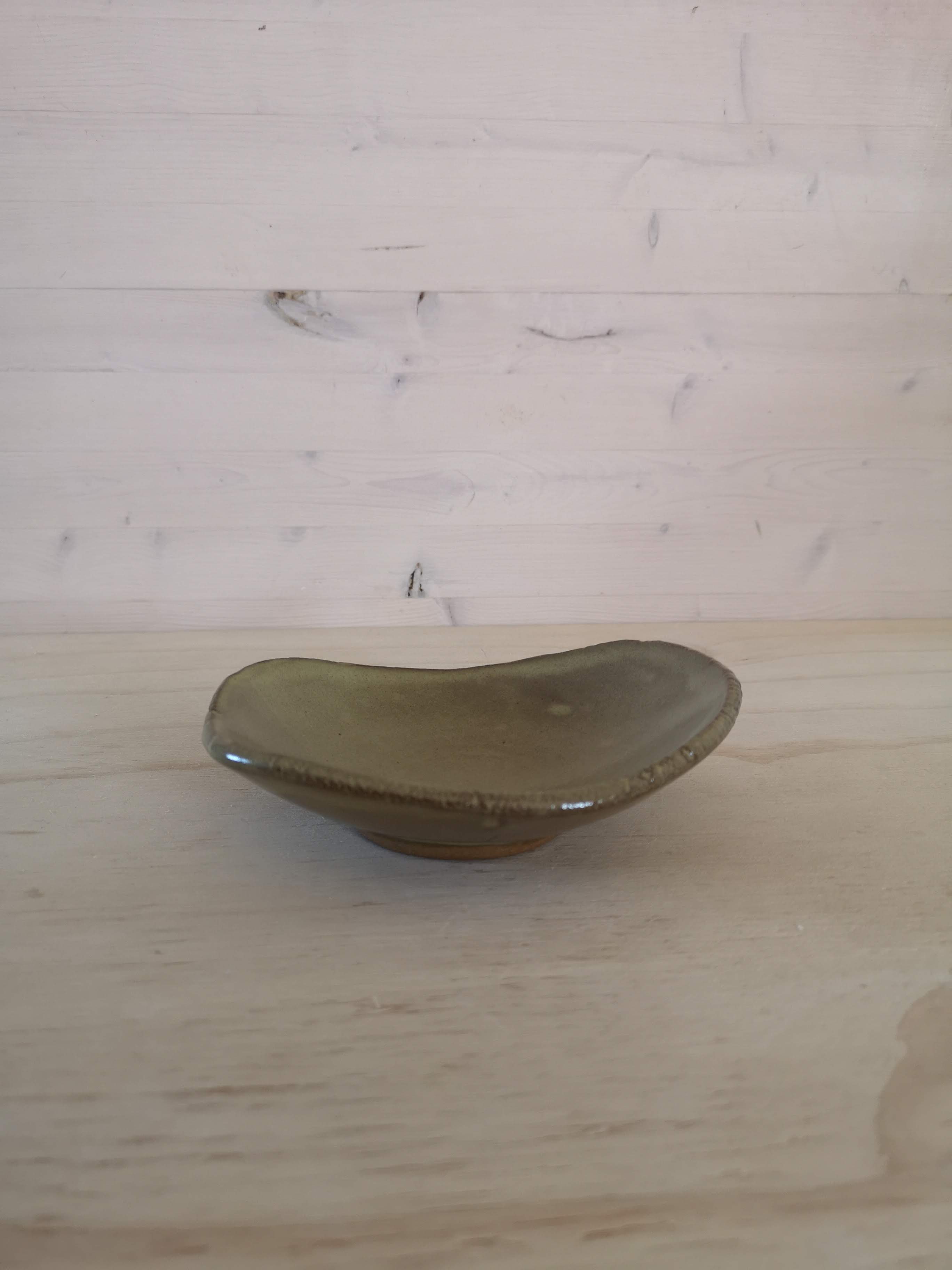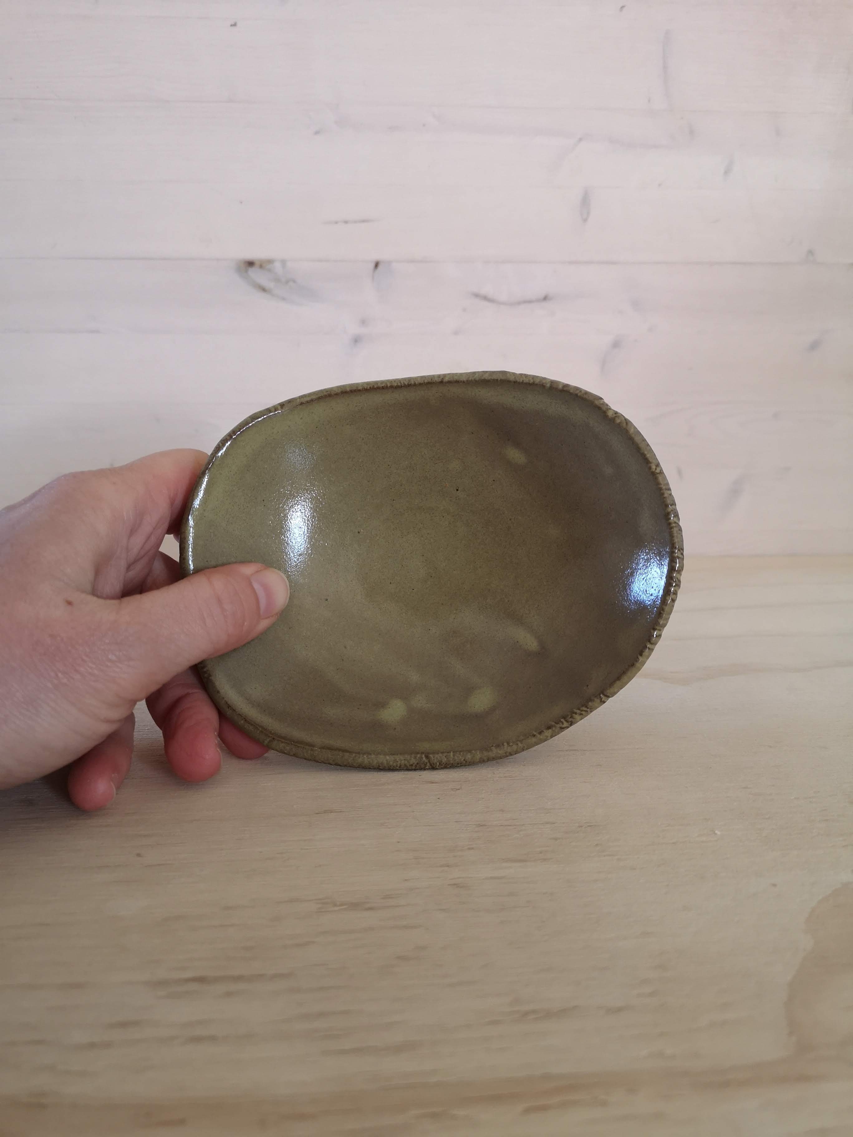 Small bowl with textured edge. Red stoneware glazed in mossy green. About 5" x 1".