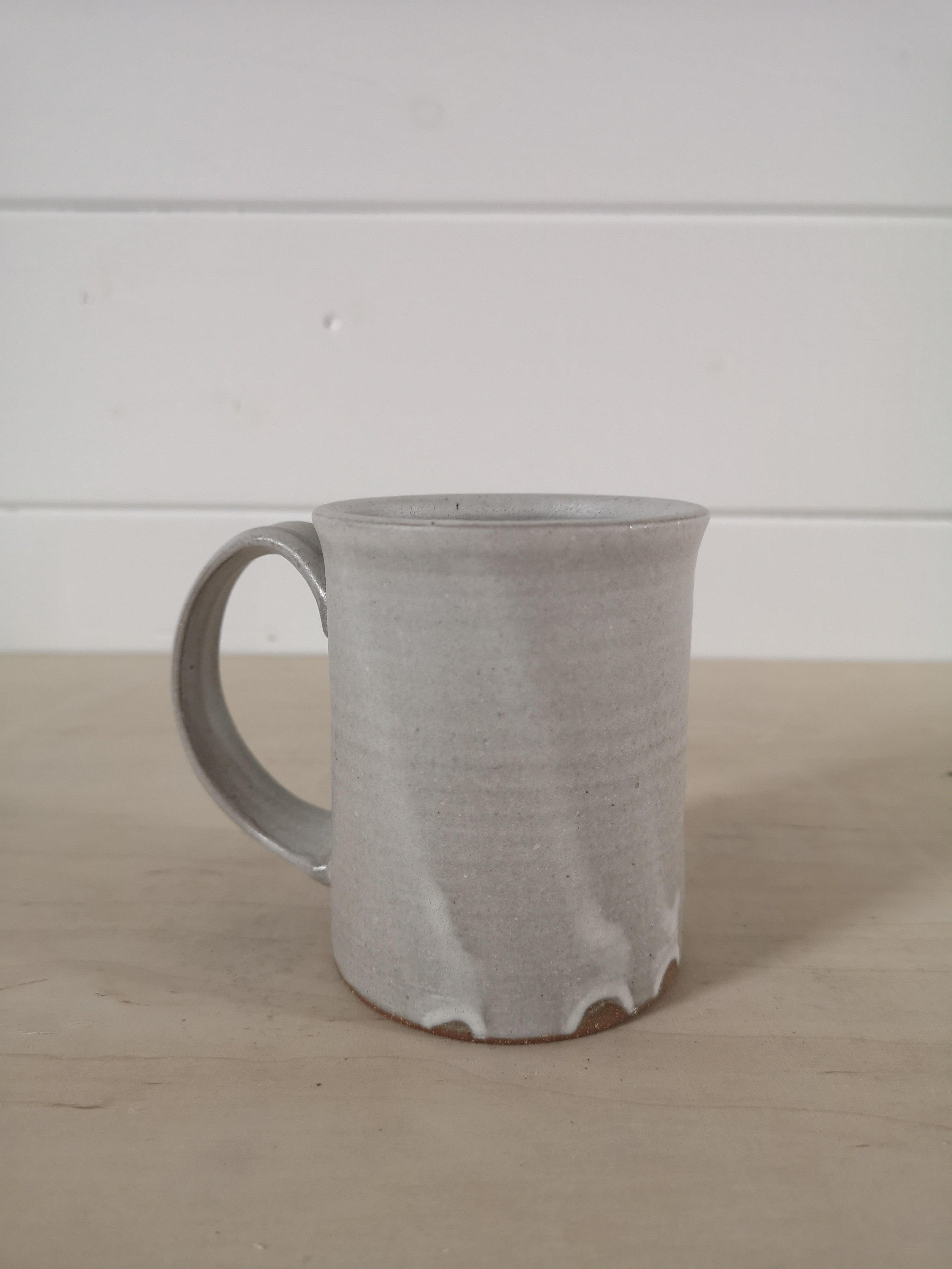 Short, straight-sided mug handthrown in red stoneware, glazed in soft grey. The perfect size for a quick coffee.