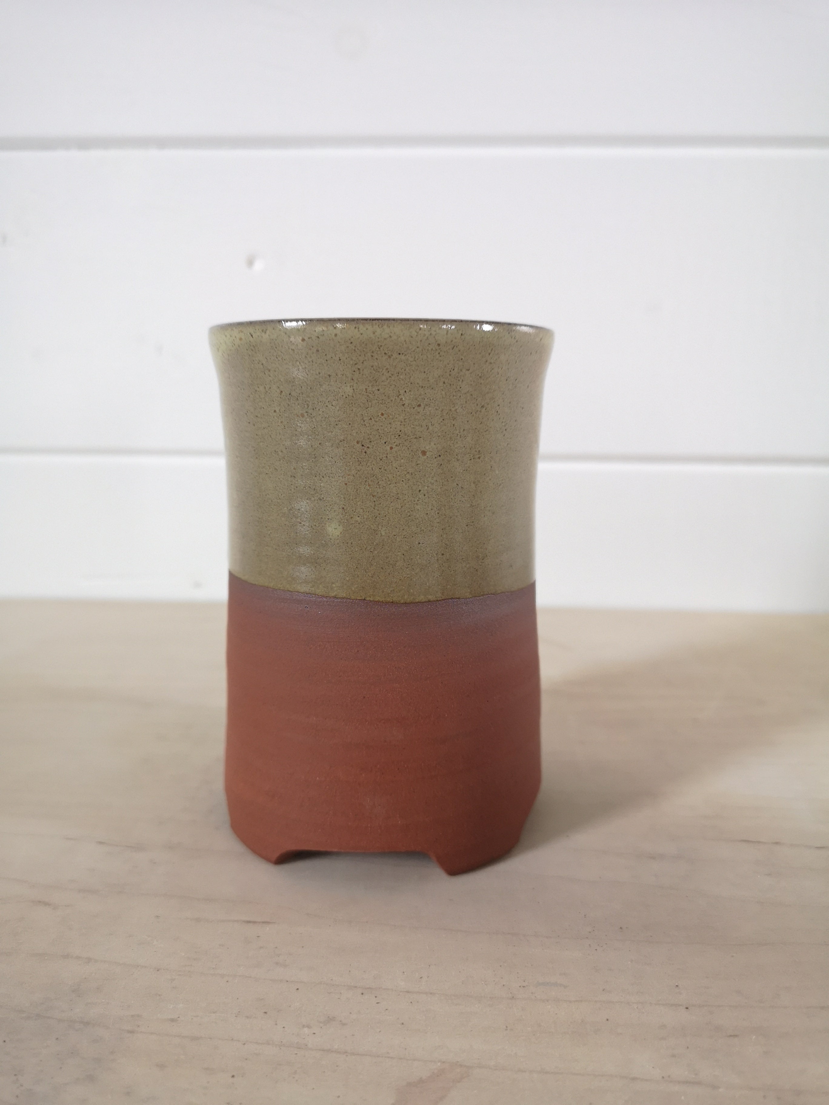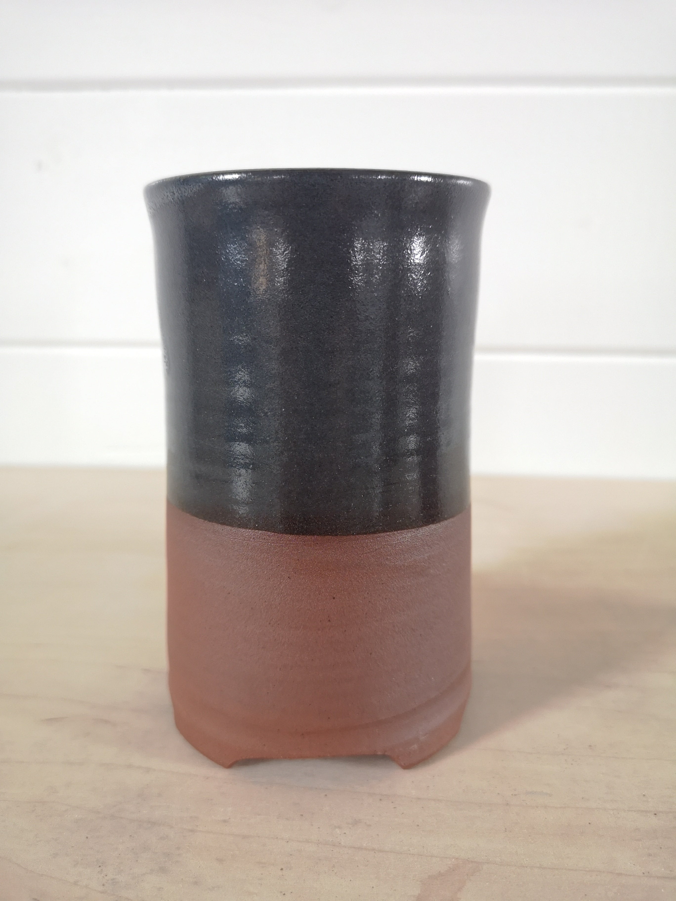 Tall, elegant mug in red stoneware, glazed in charcoal or mossy green. Vase holds about 475mL/16oz.