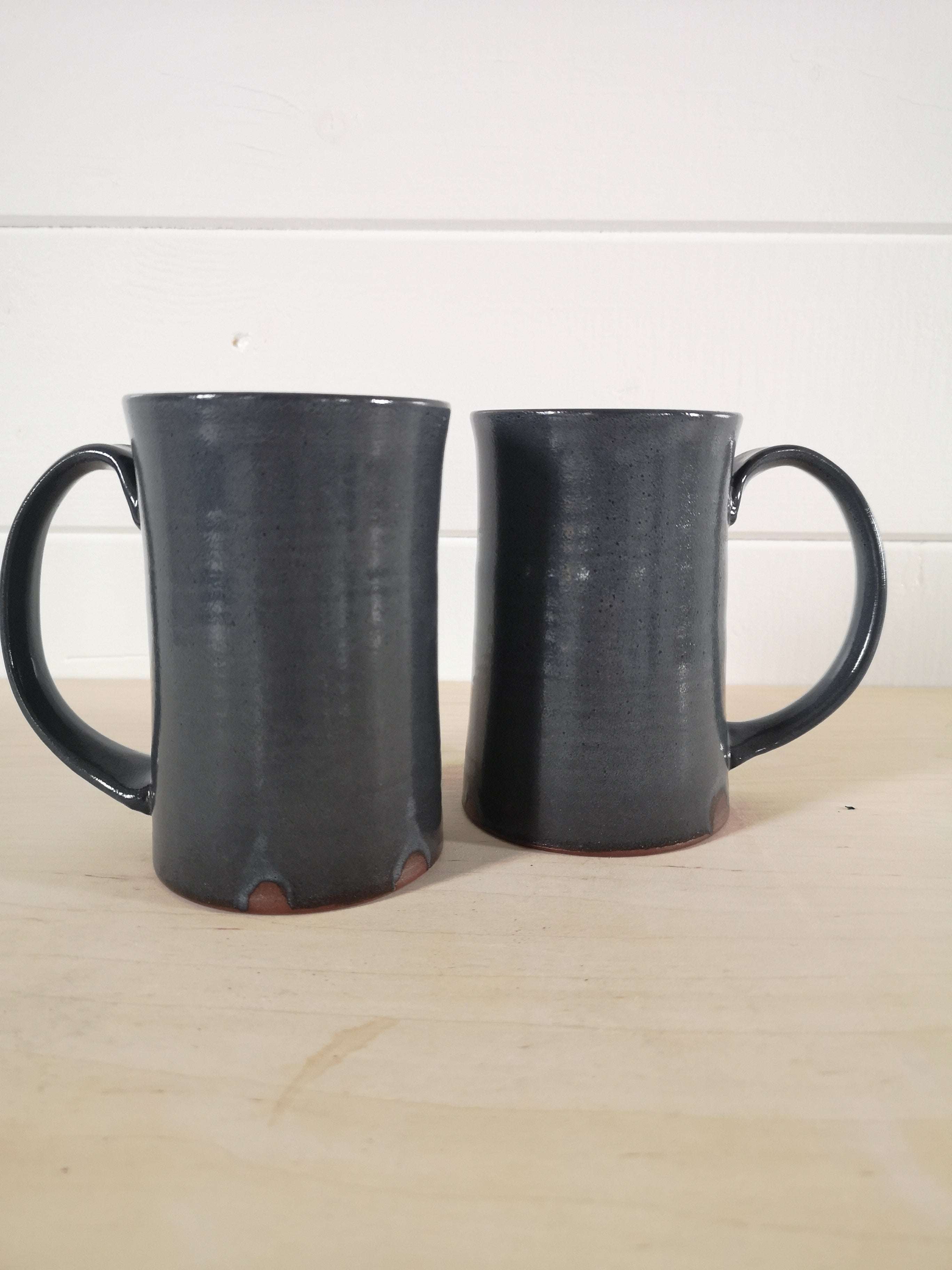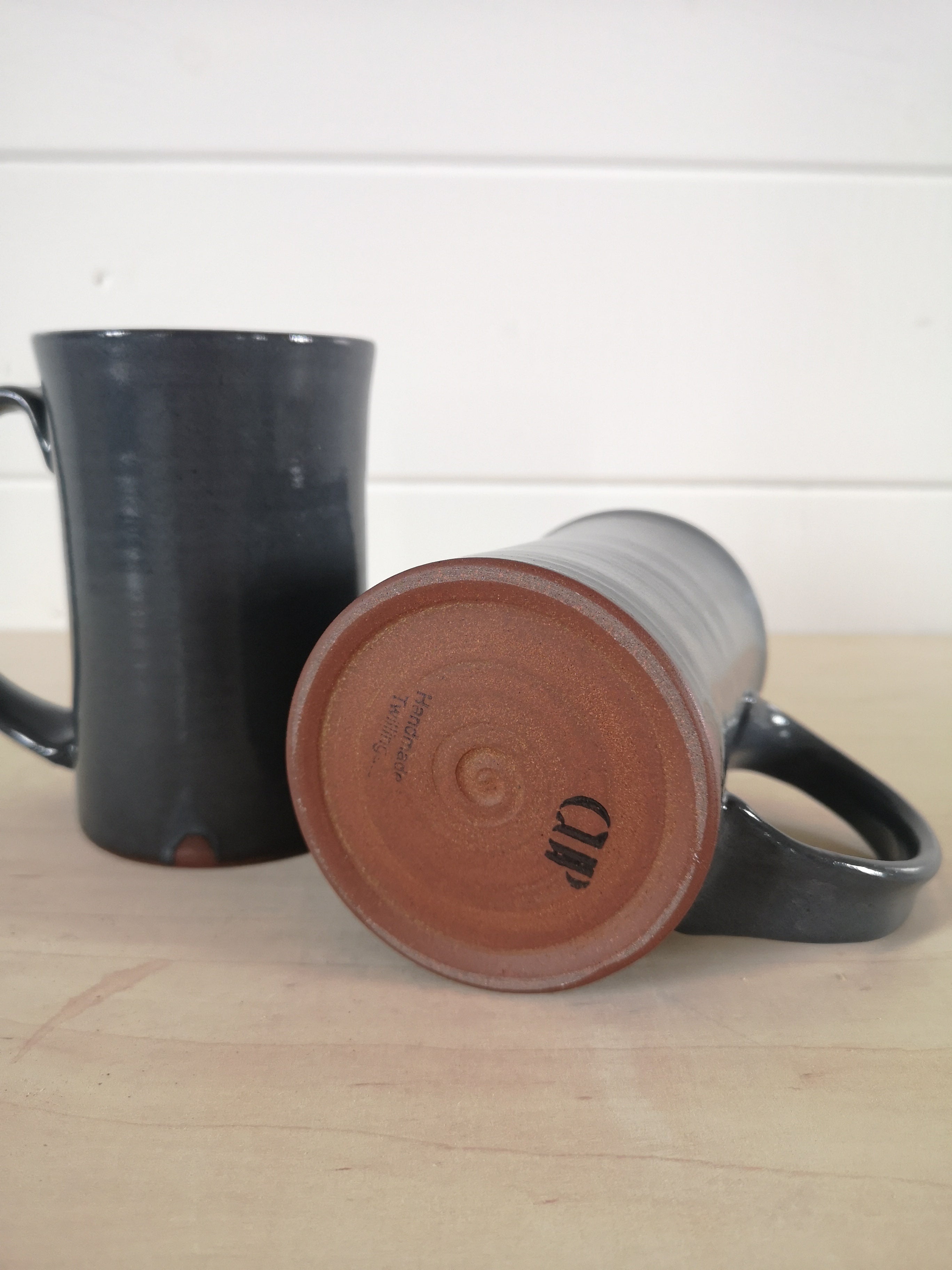 Tall, elegant mug in red stoneware, glazed in charcoal. This mug holds about 475mL/16oz.