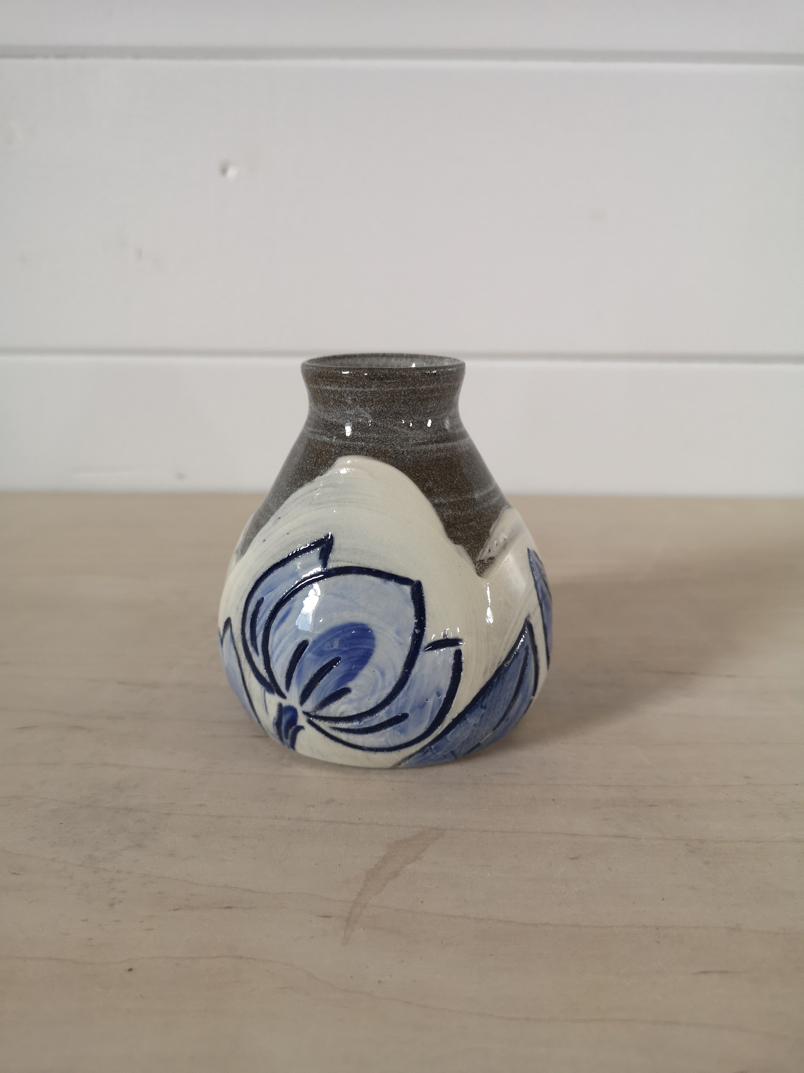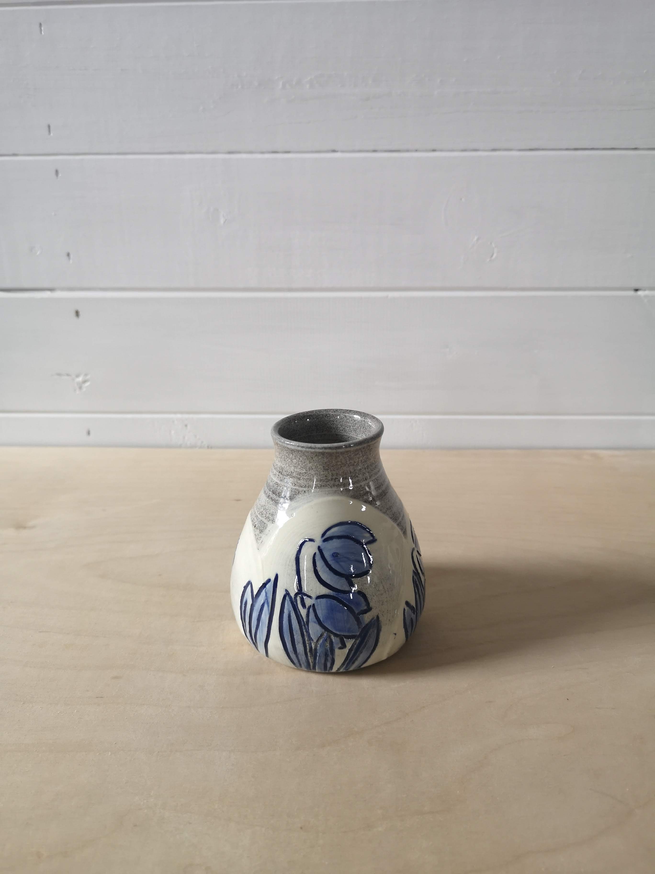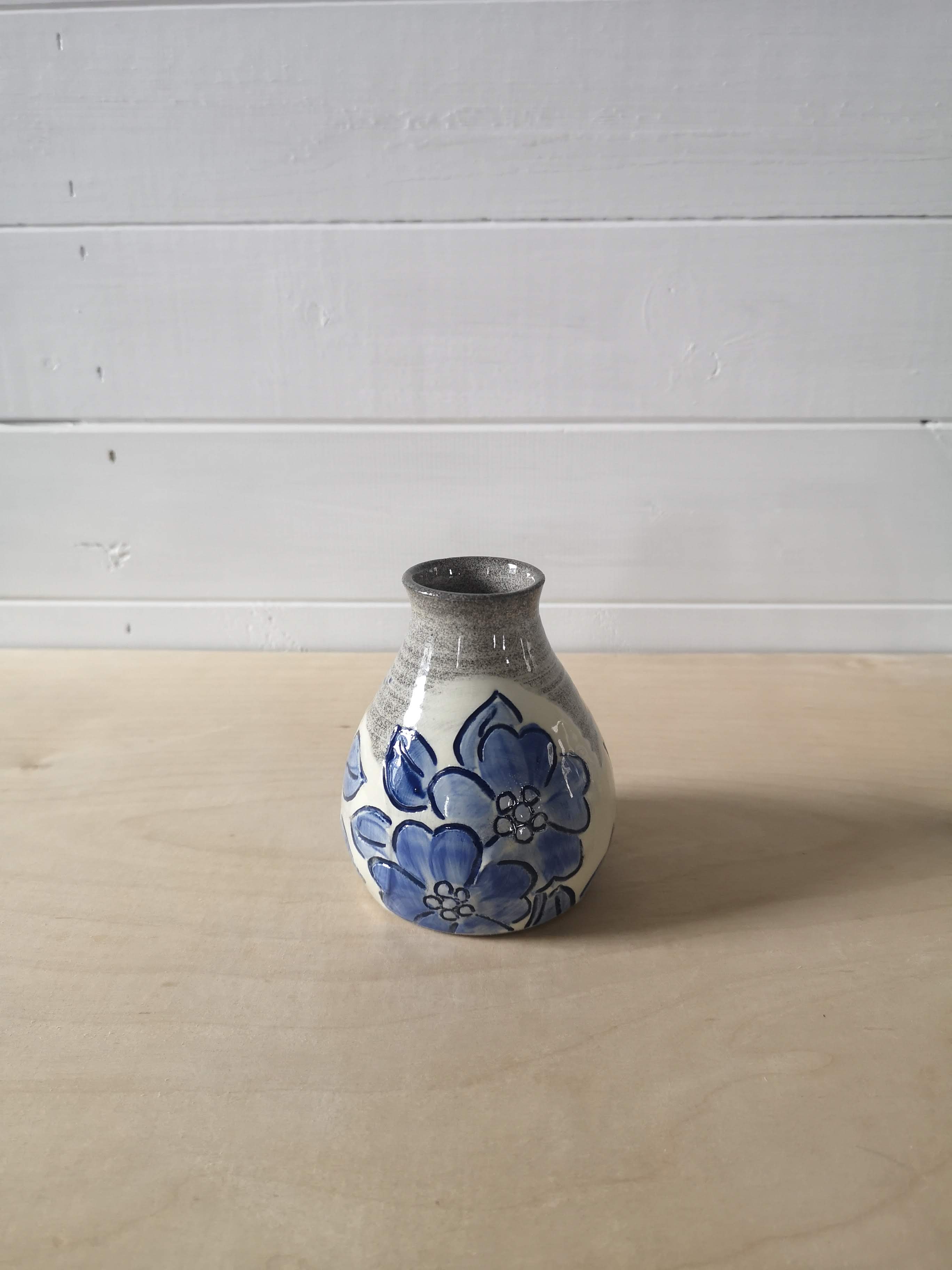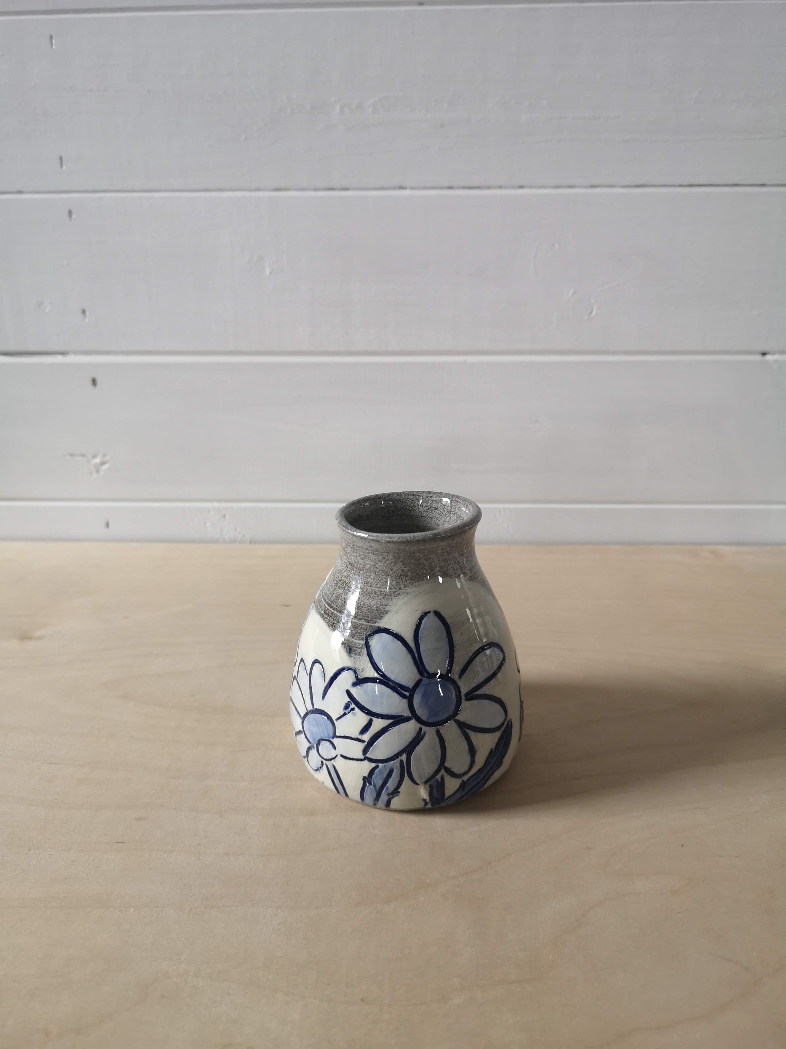 This grey stoneware vase features a round belly and is hand decorated with bright flowers. It's about 5 inches tall.