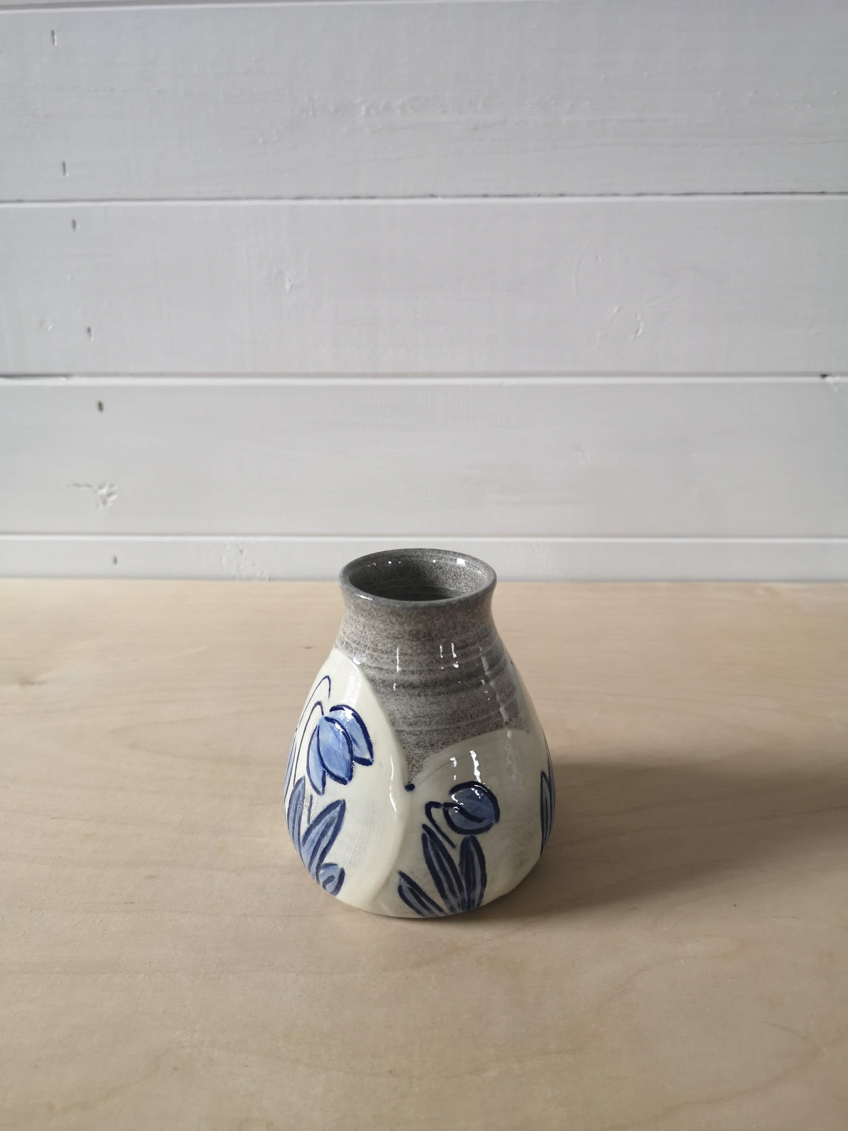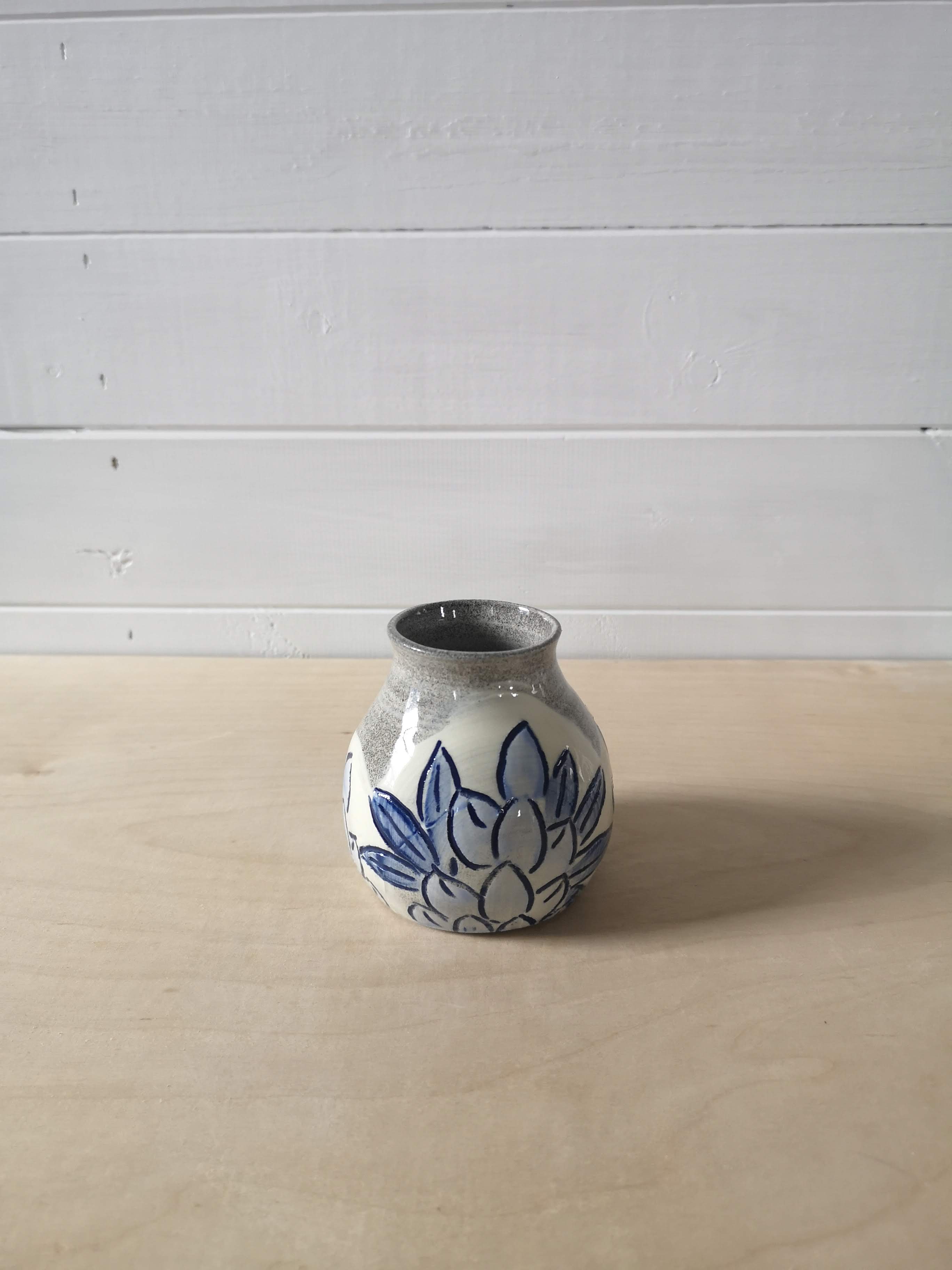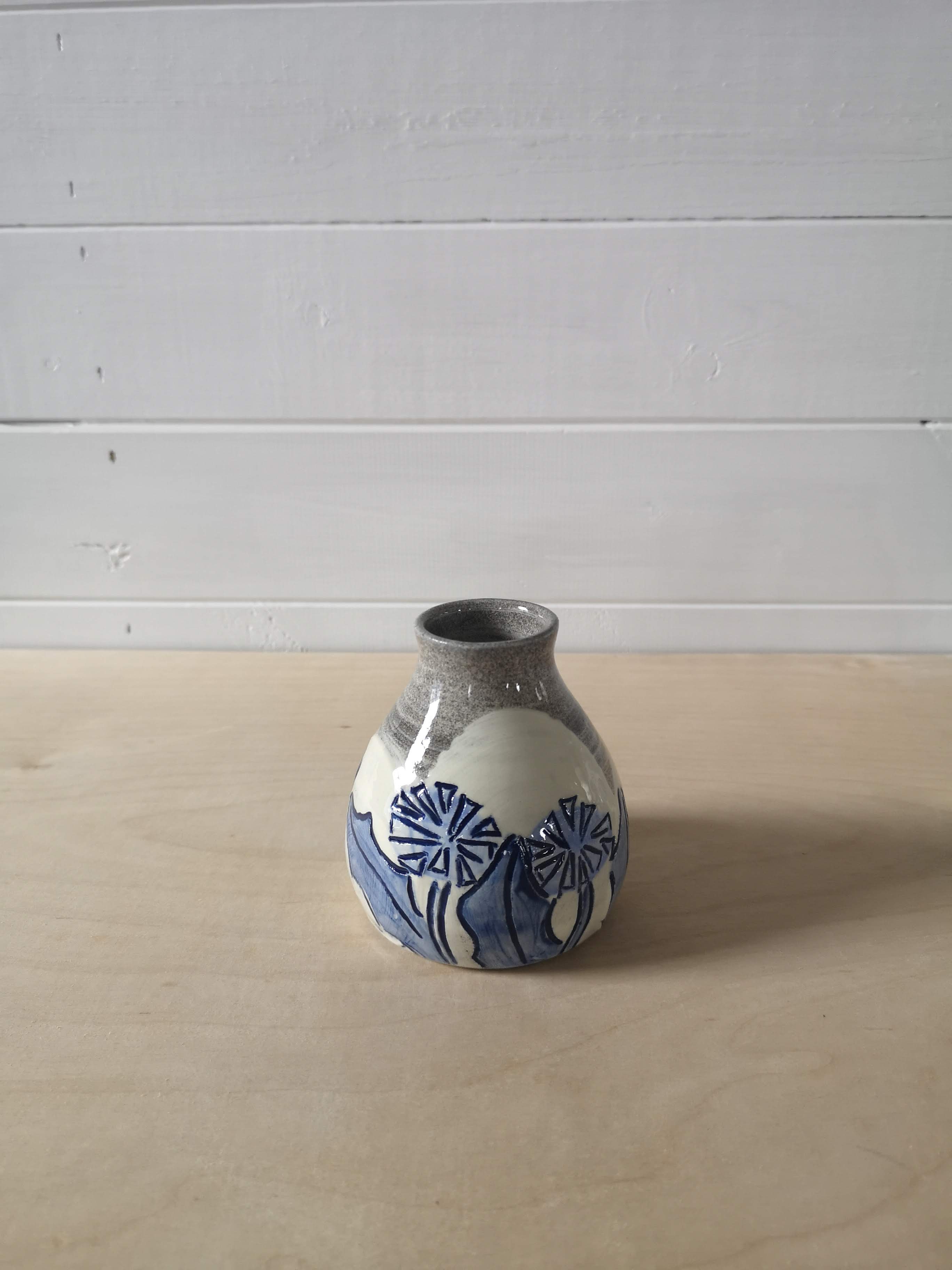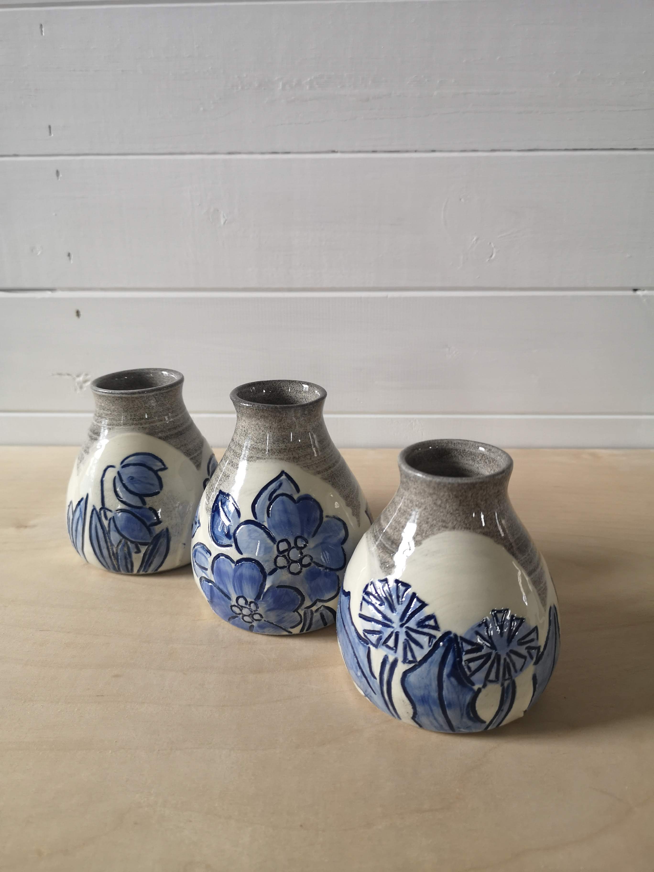 This grey stoneware vase features a round belly and is hand decorated with bright flowers. It's about 5 inches tall.