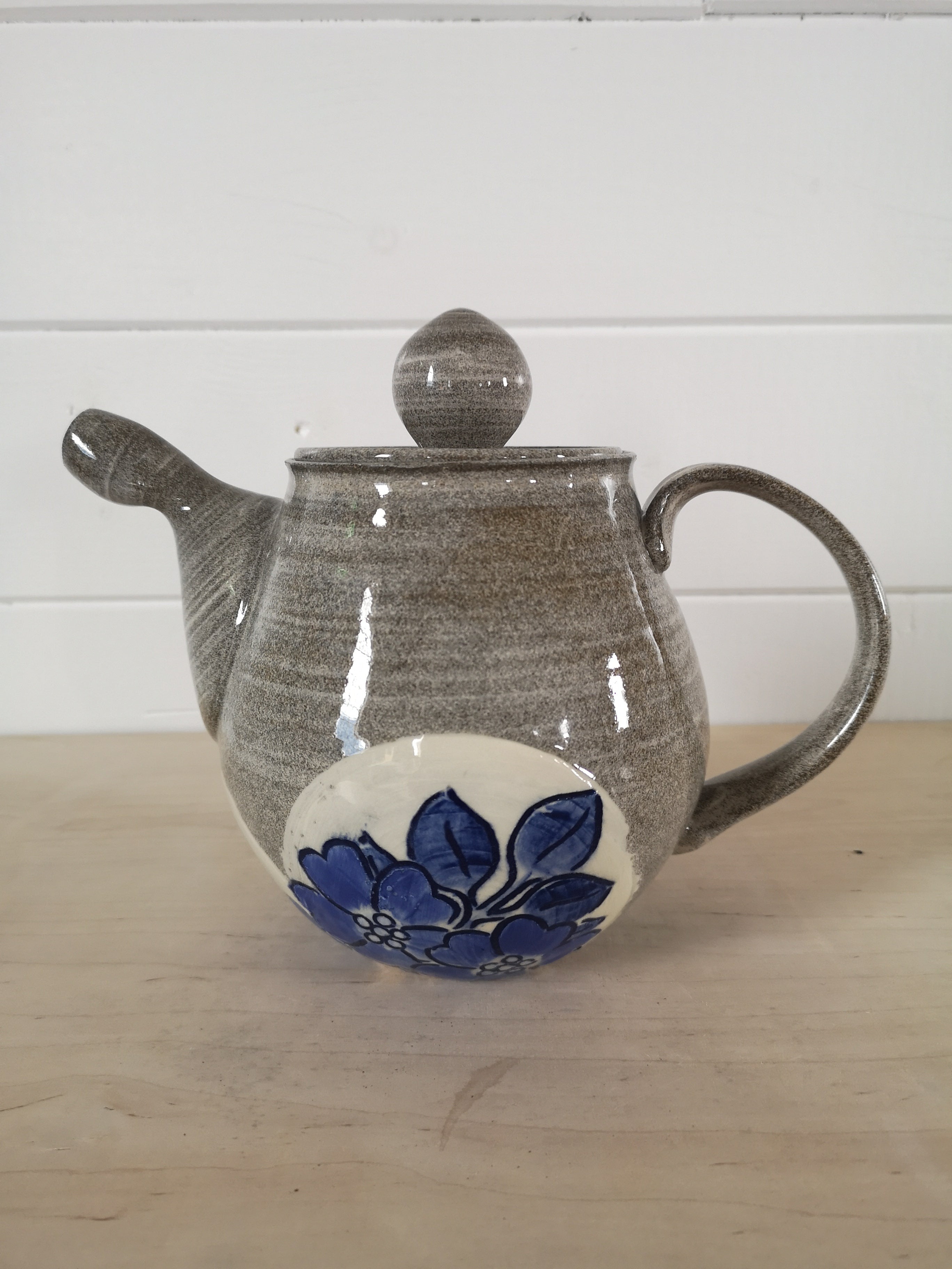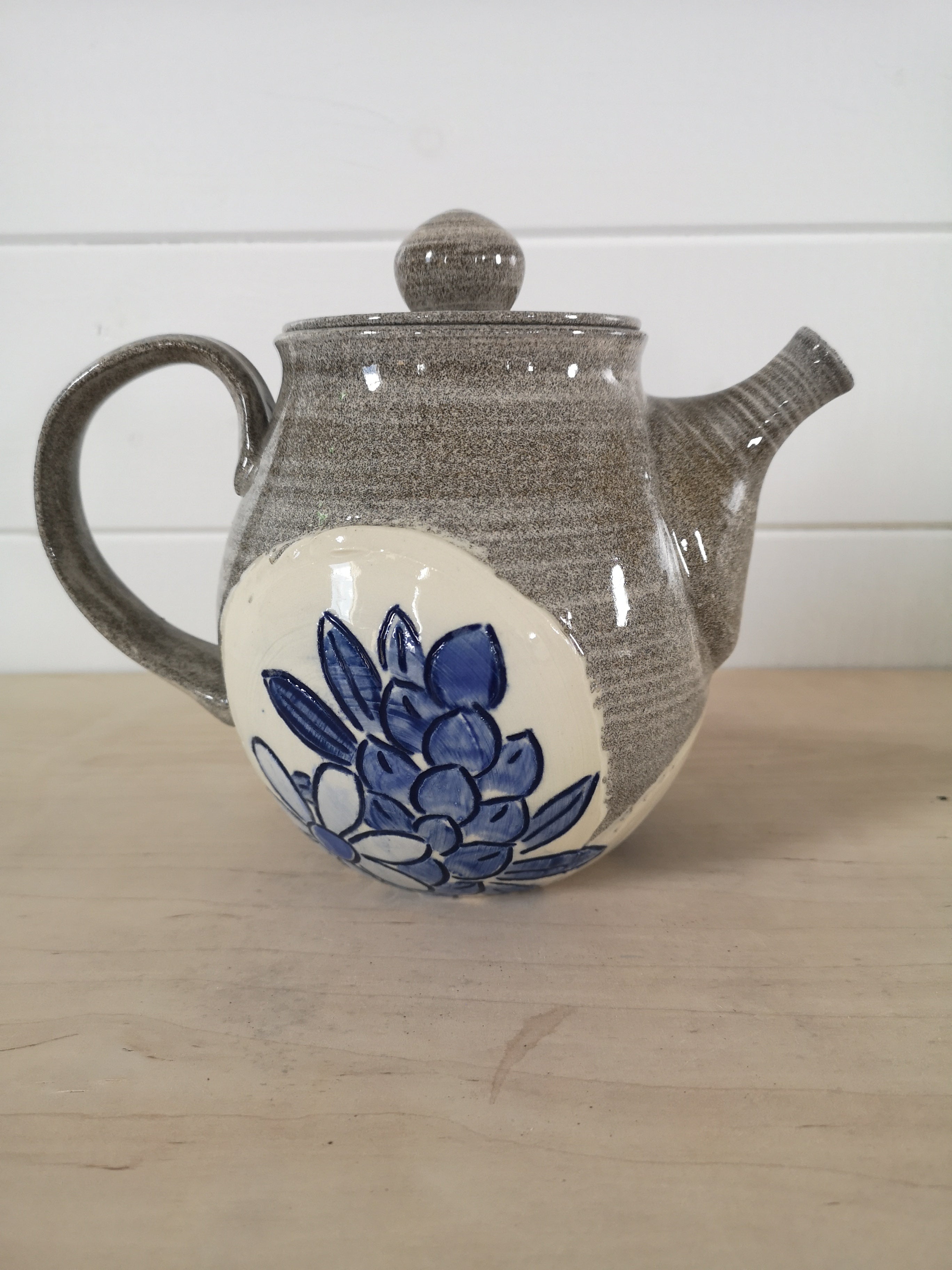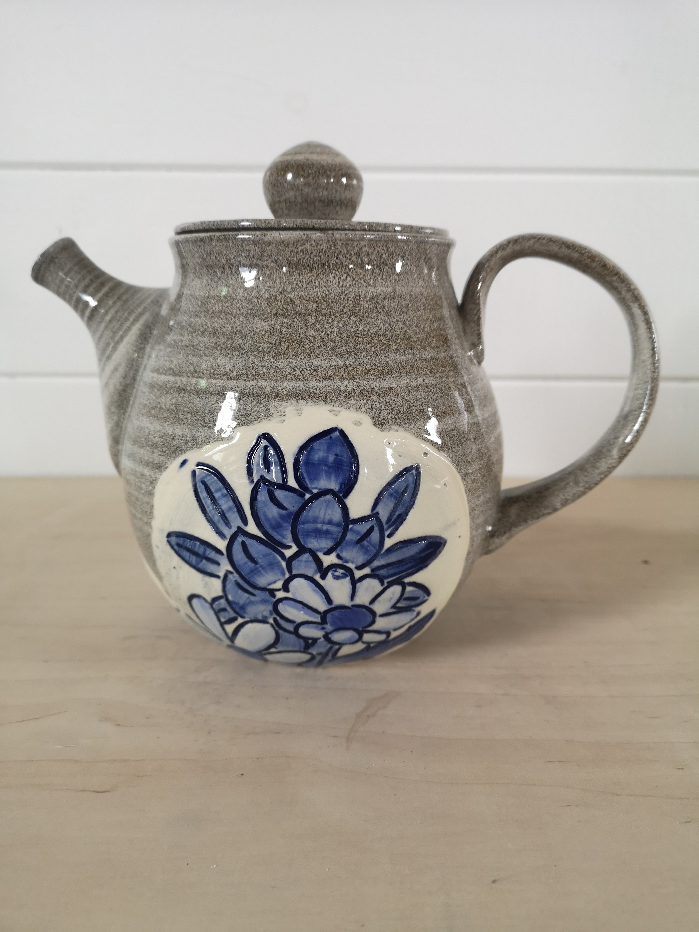 Large handmade stoneware teapot, decorated with blue and white flowers. They hold about four mugs worth of tea.