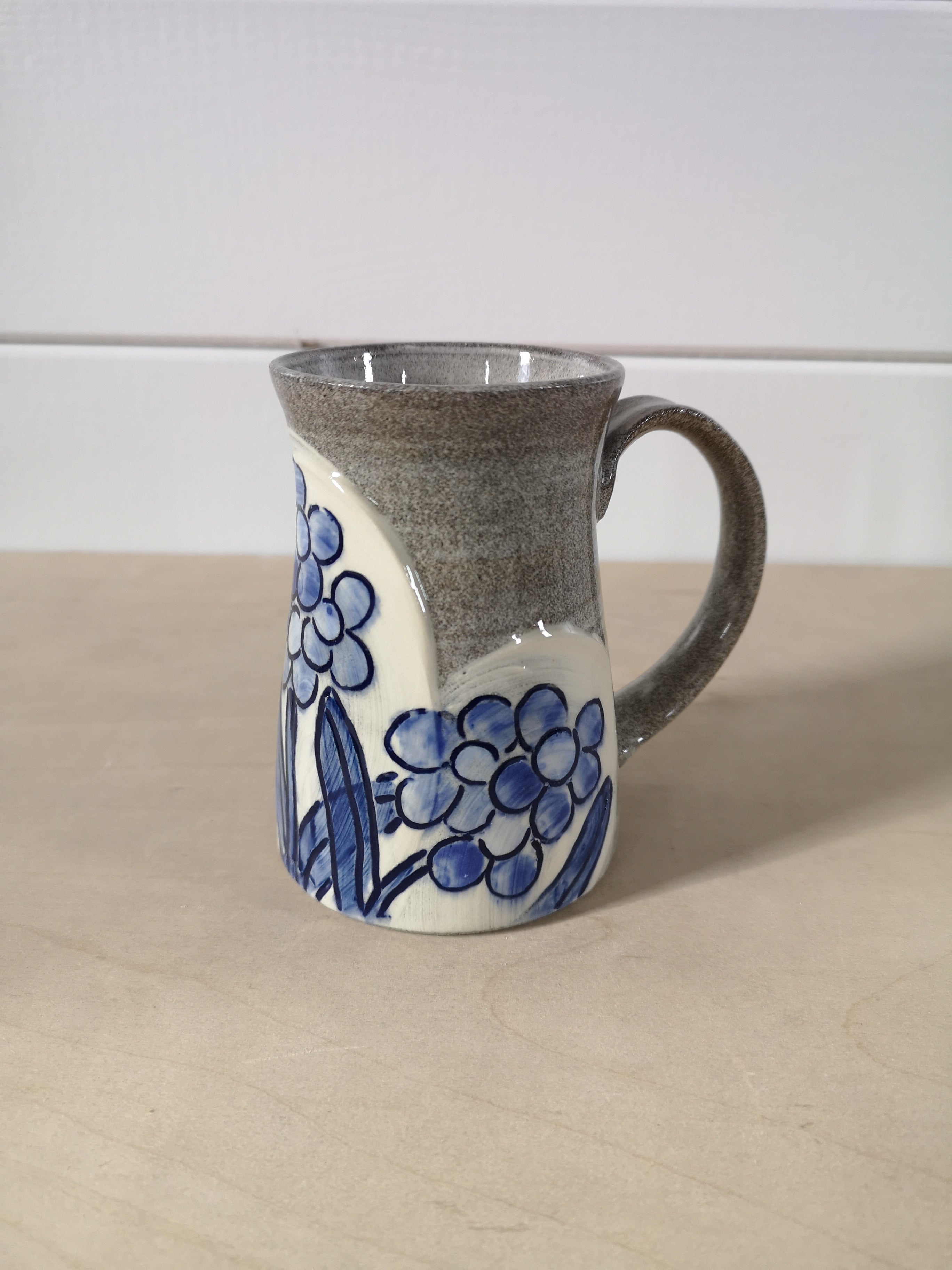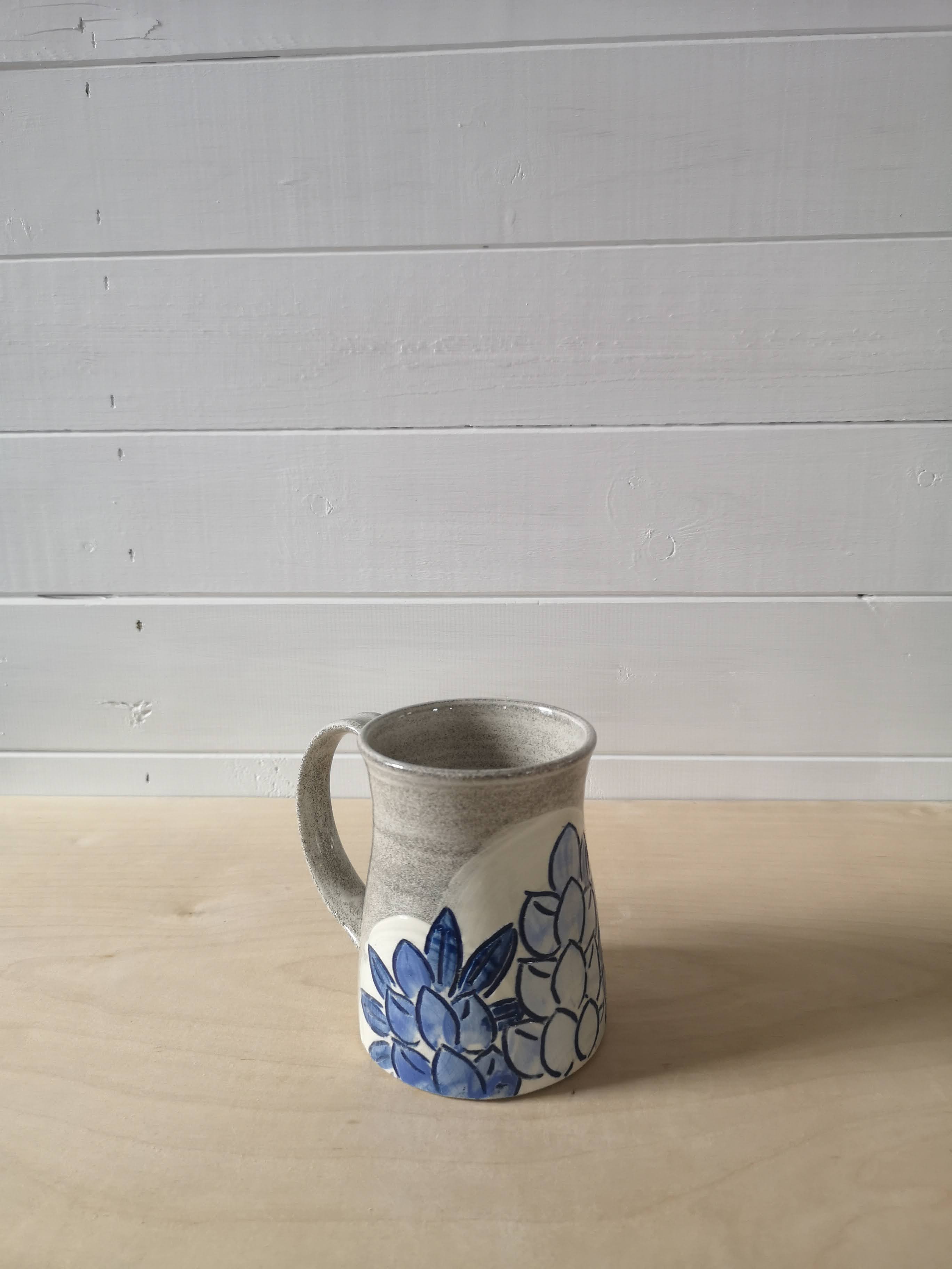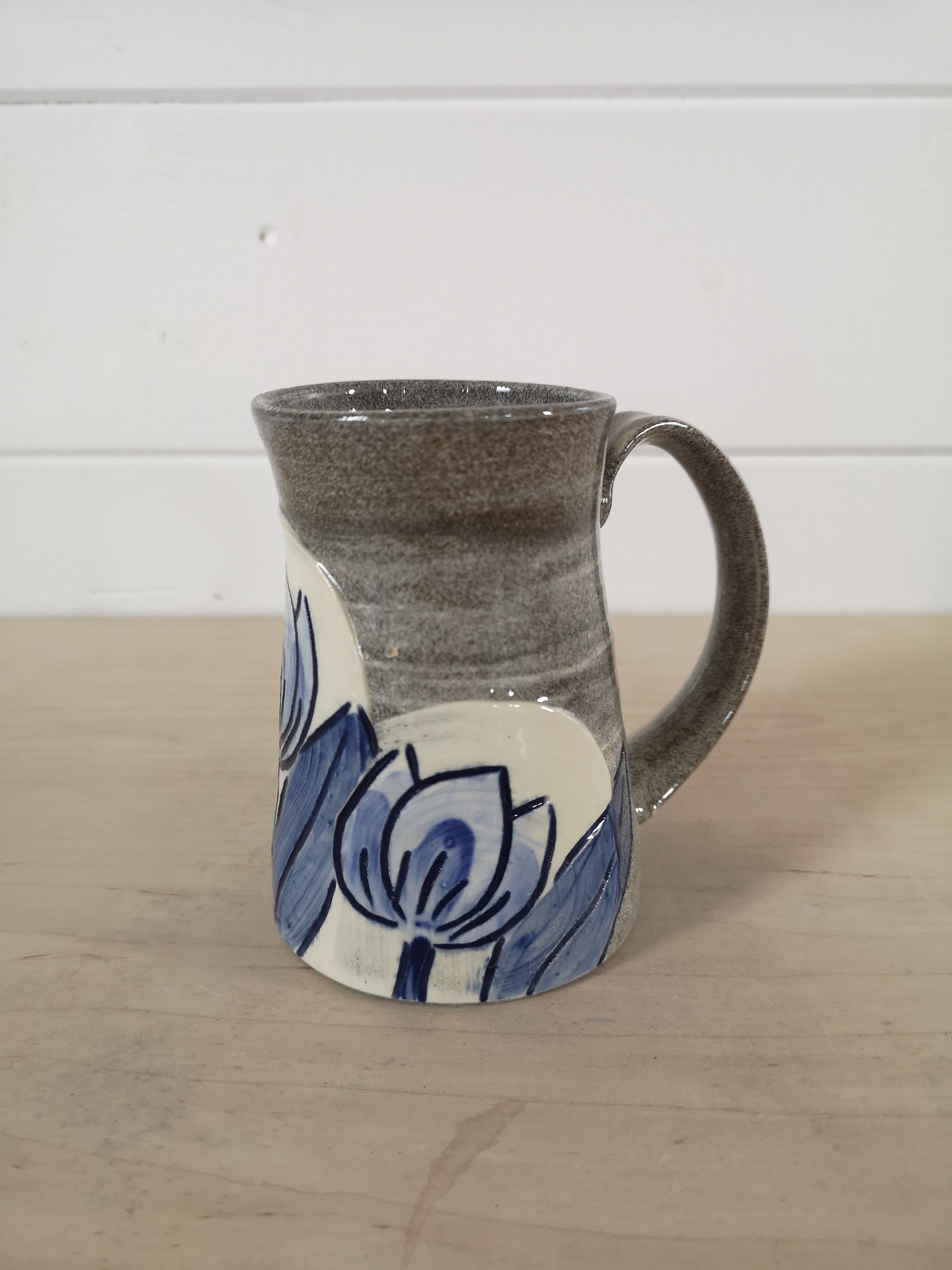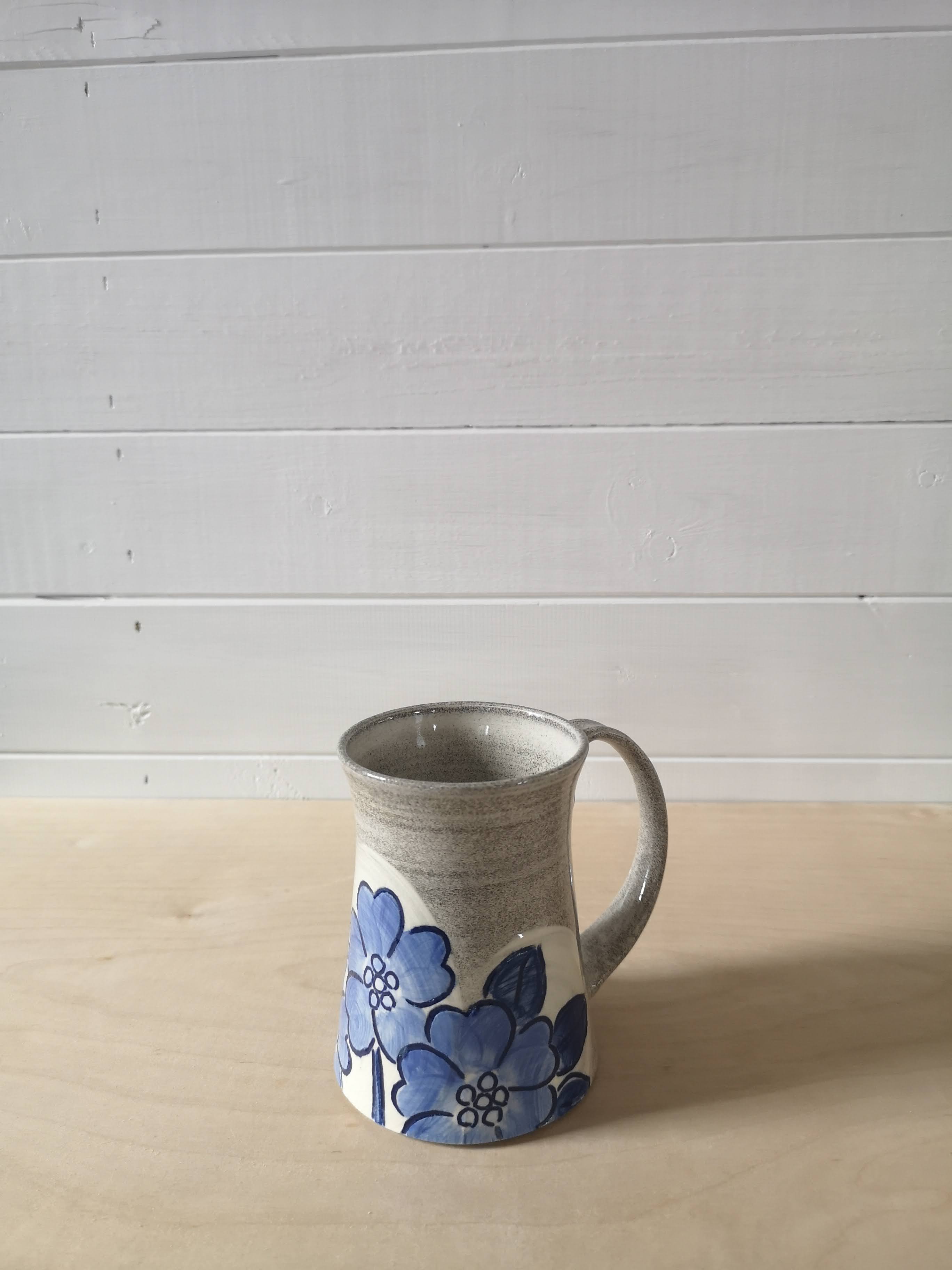This grey stoneware mug is nice and tall, narrowing in at the lip to help keep your tea hot. Hand decorated with flowers, it holds about 16 oz of your favourite hot beverage and features a generous handle.