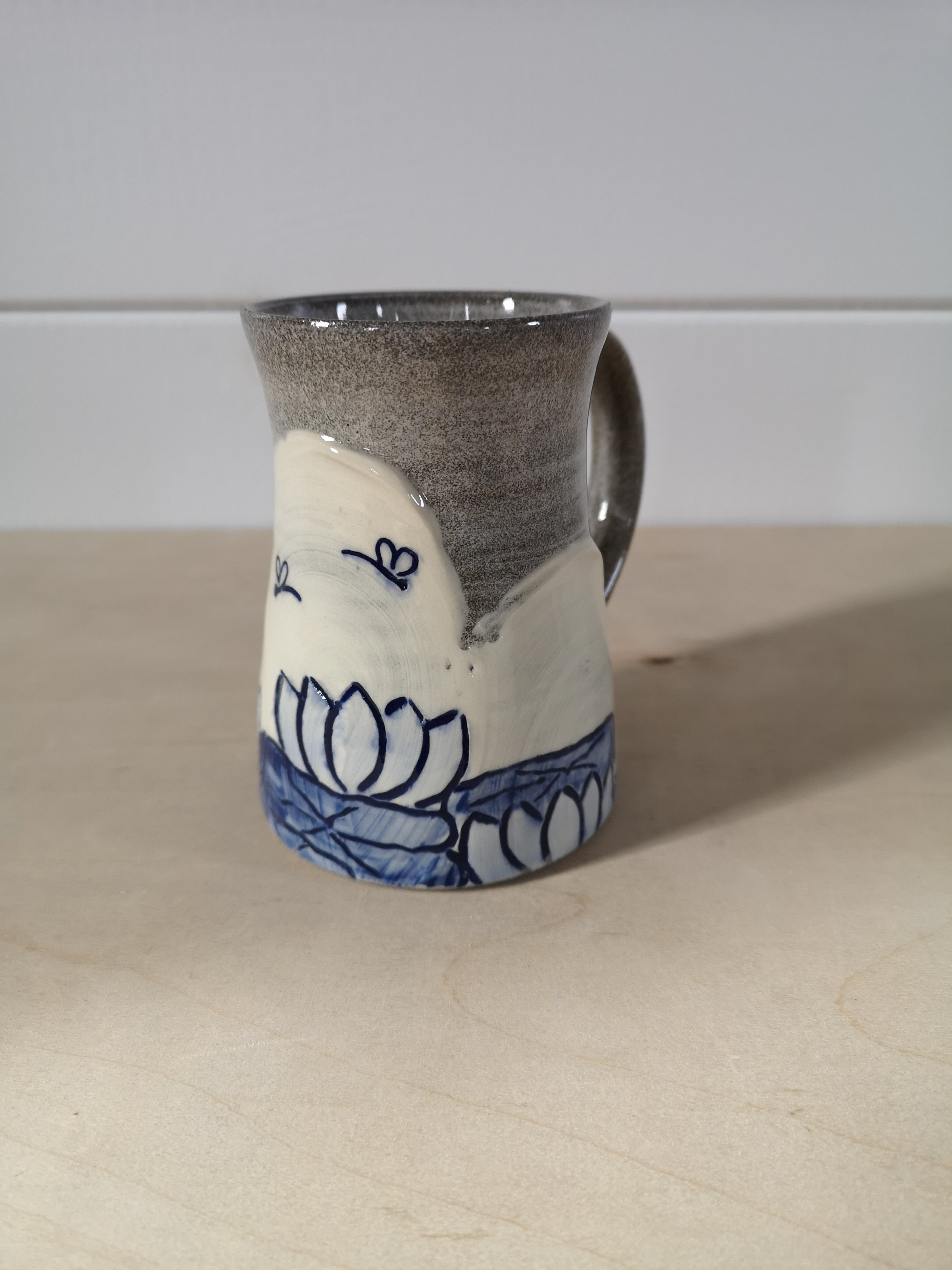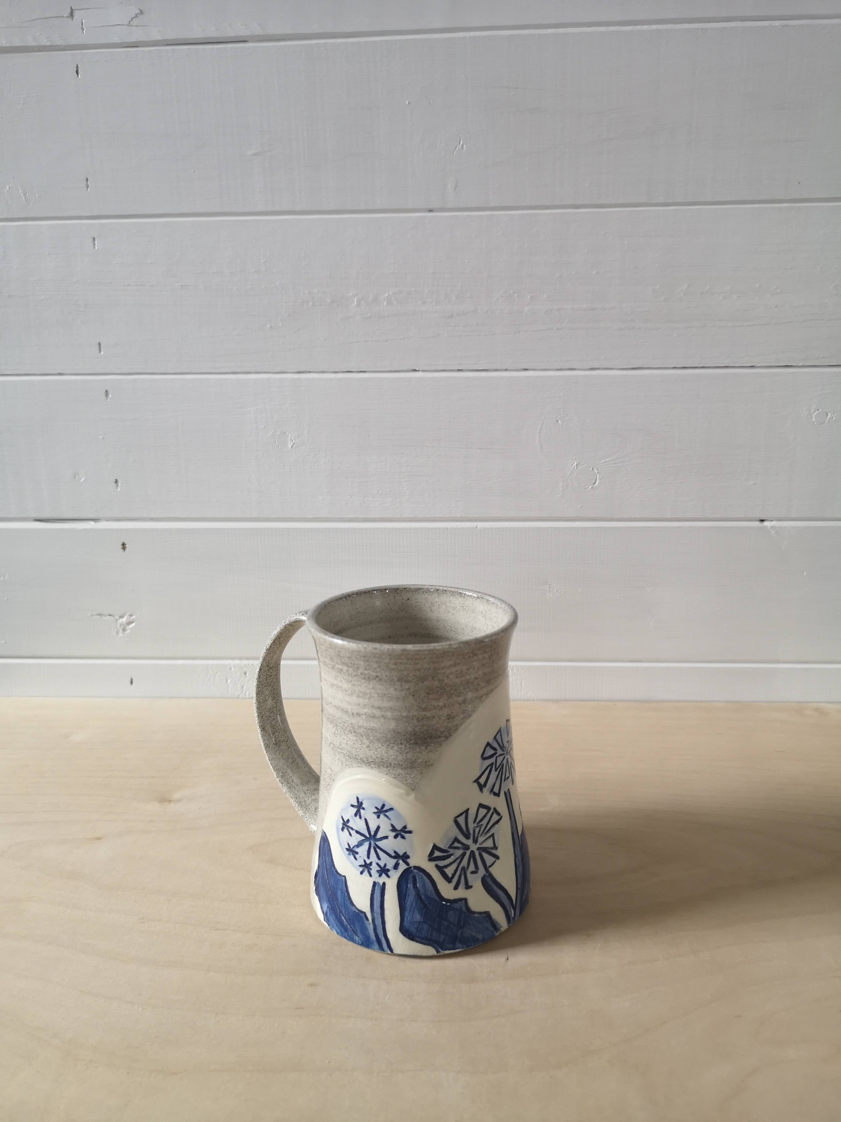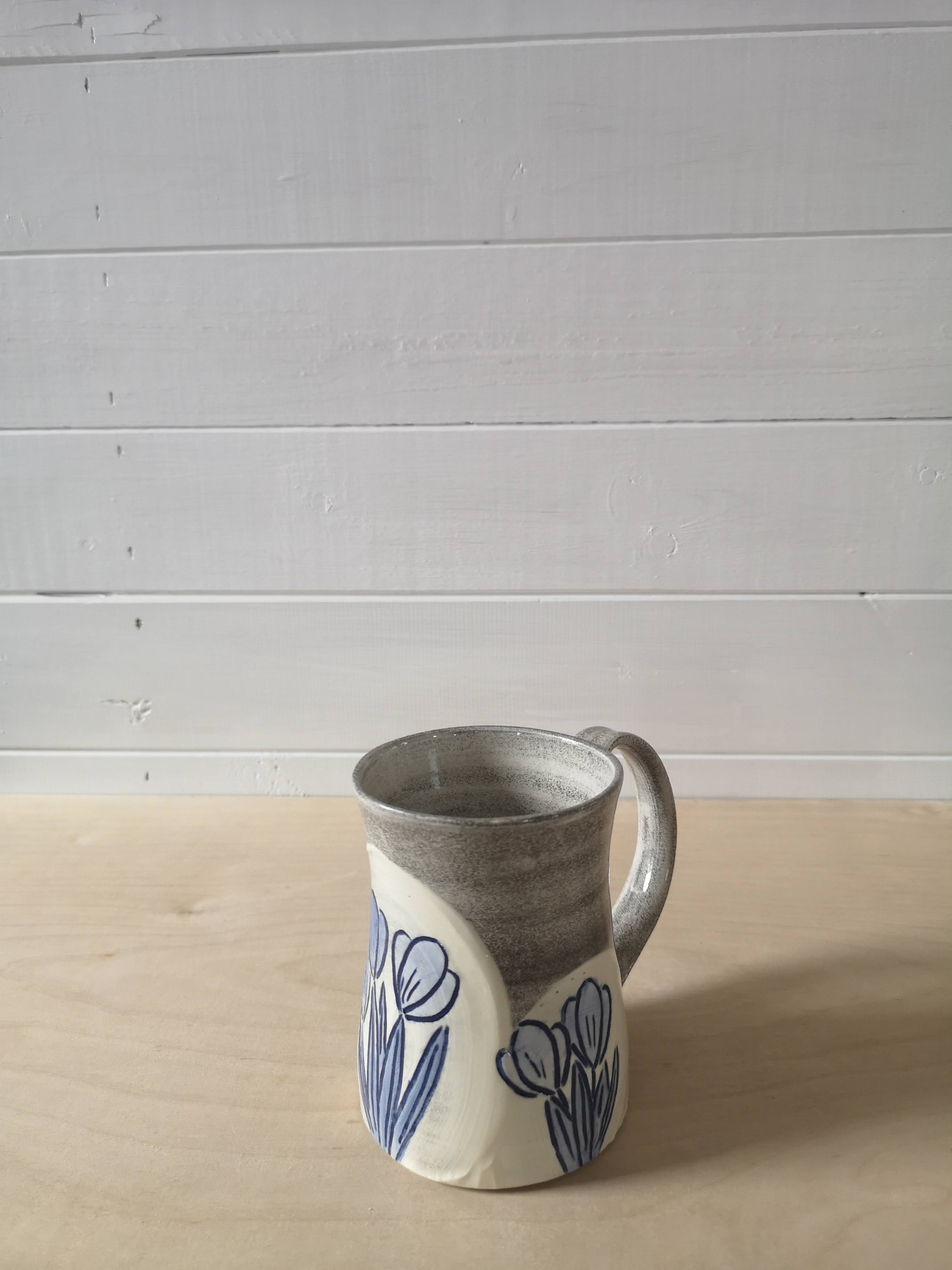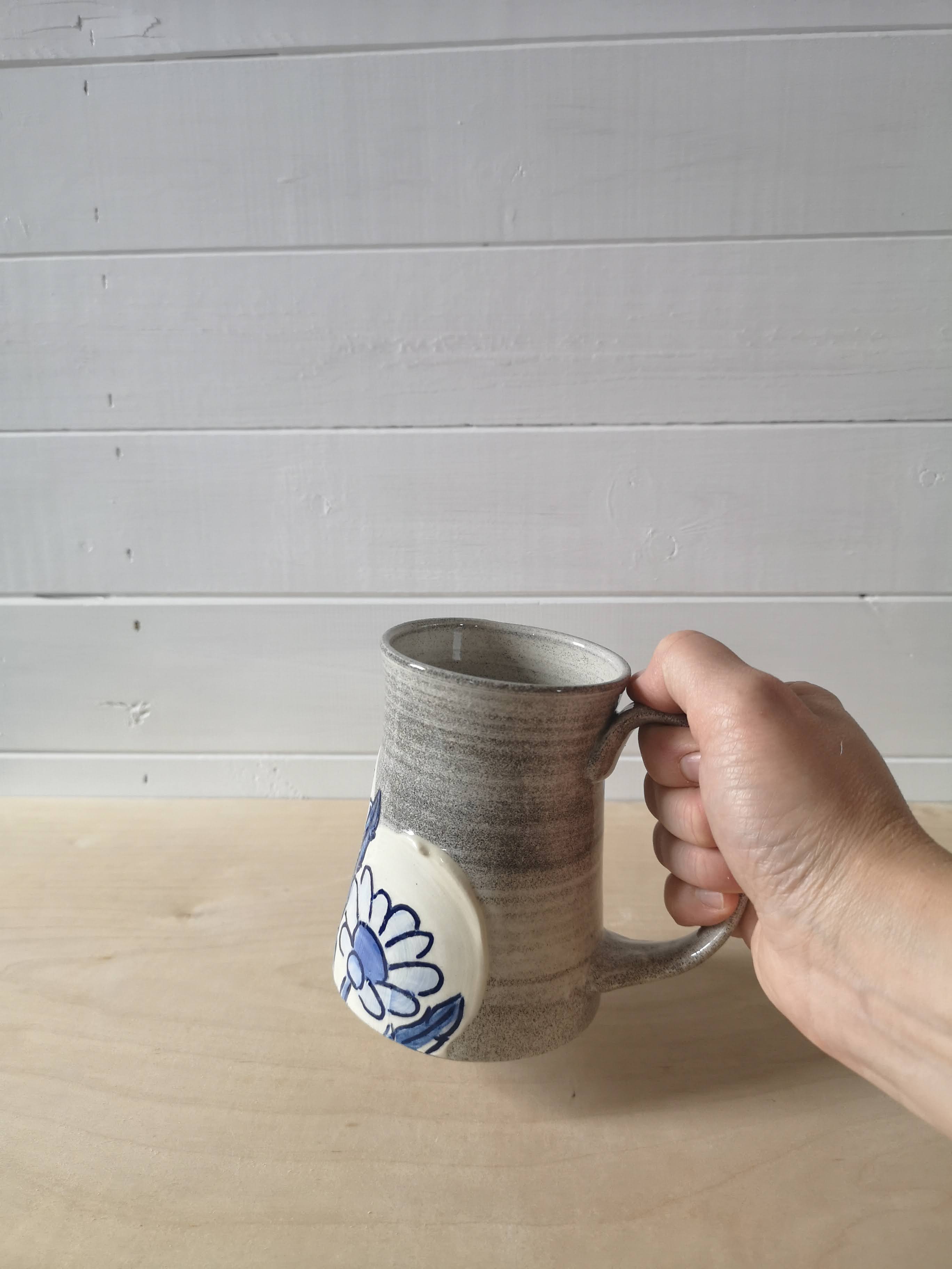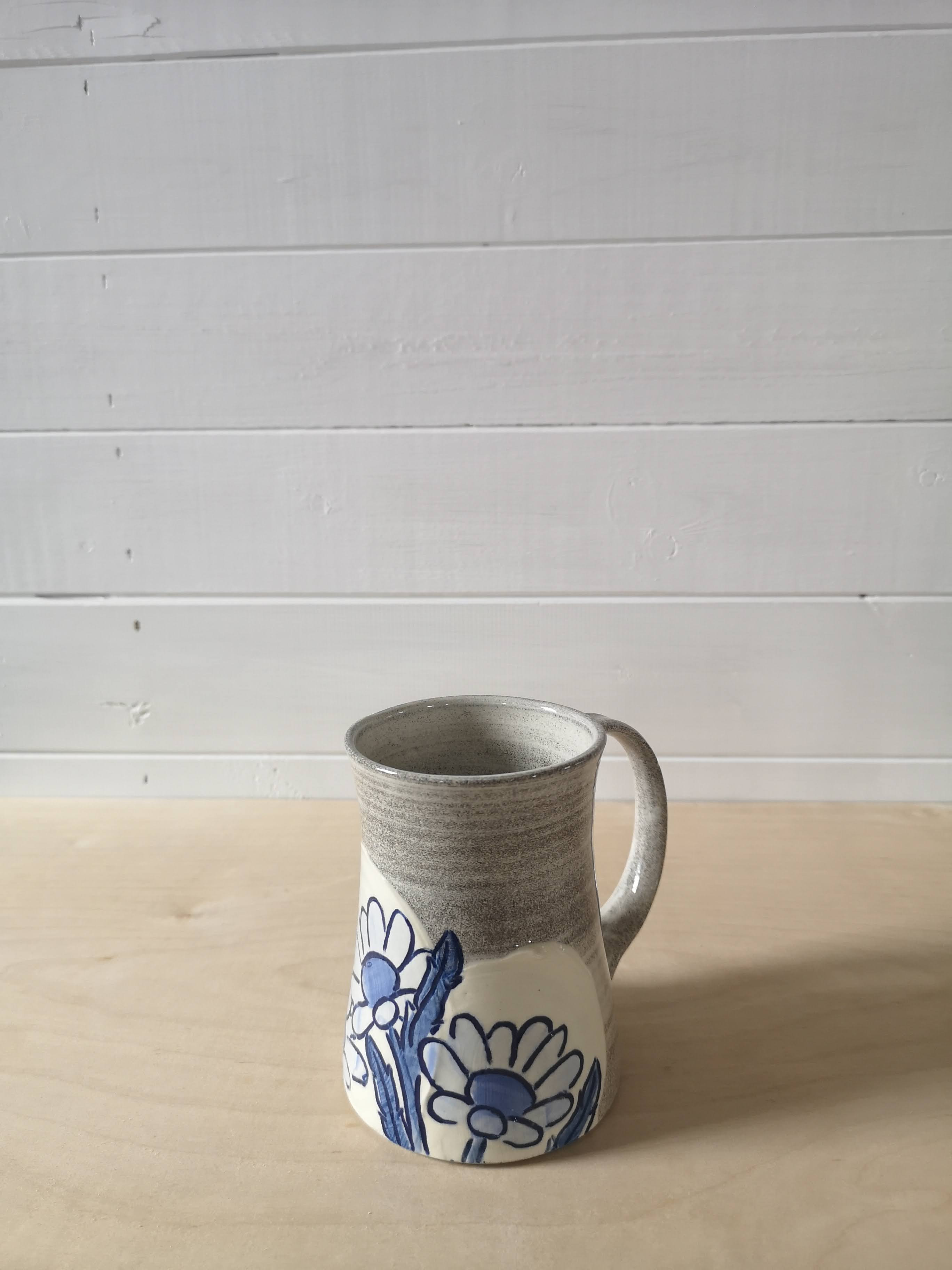 This grey stoneware mug is nice and tall, narrowing in at the lip to help keep your tea hot. Hand decorated with flowers, it holds about 16 oz of your favourite hot beverage and features a generous handle.