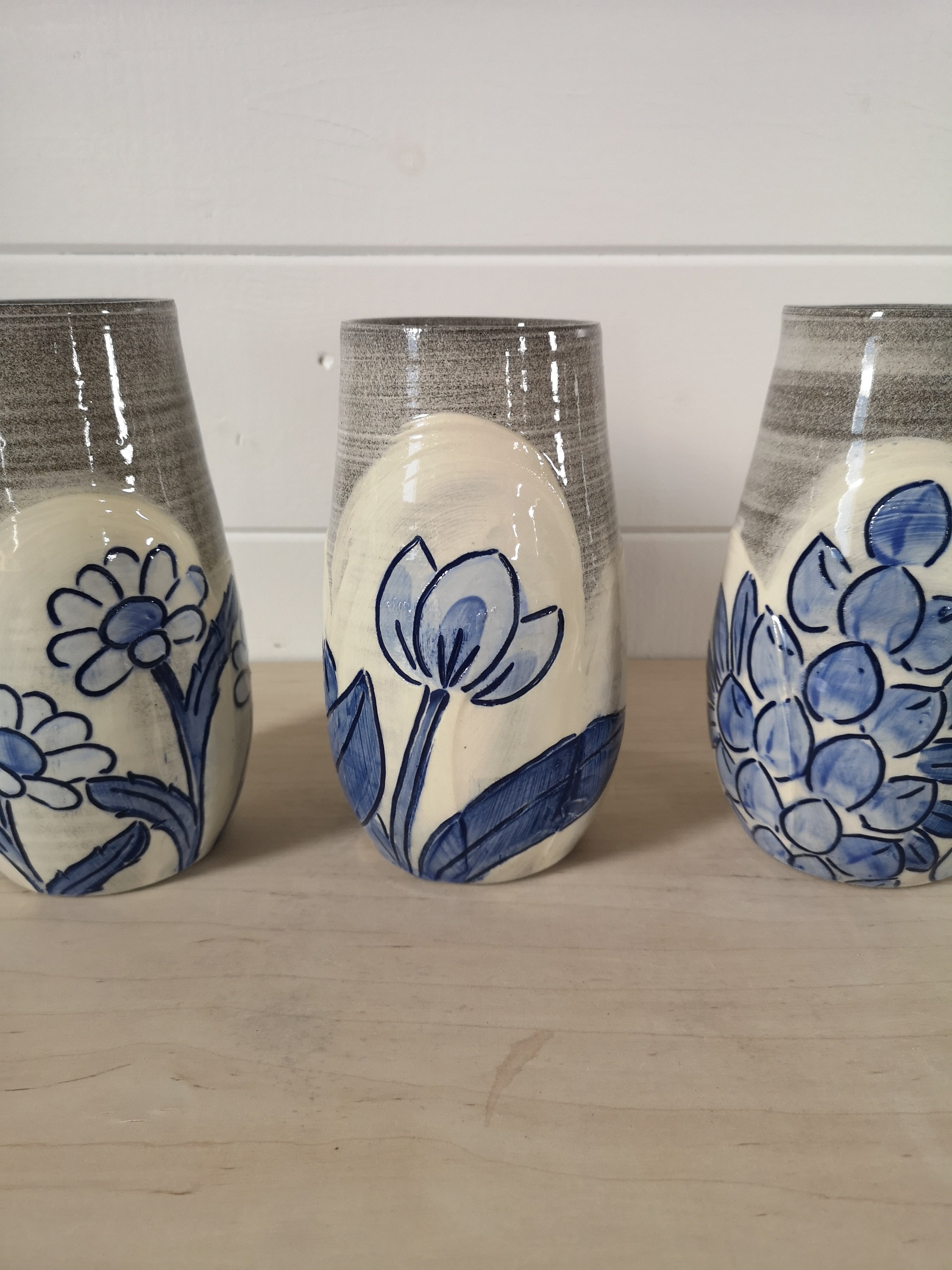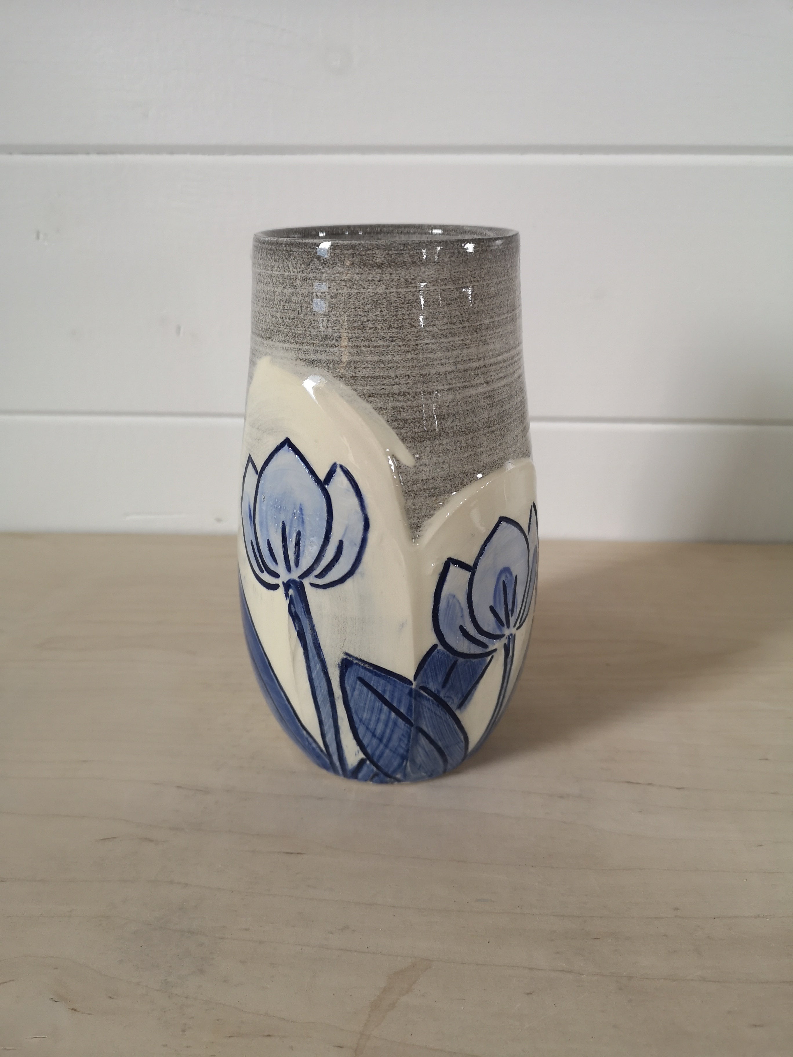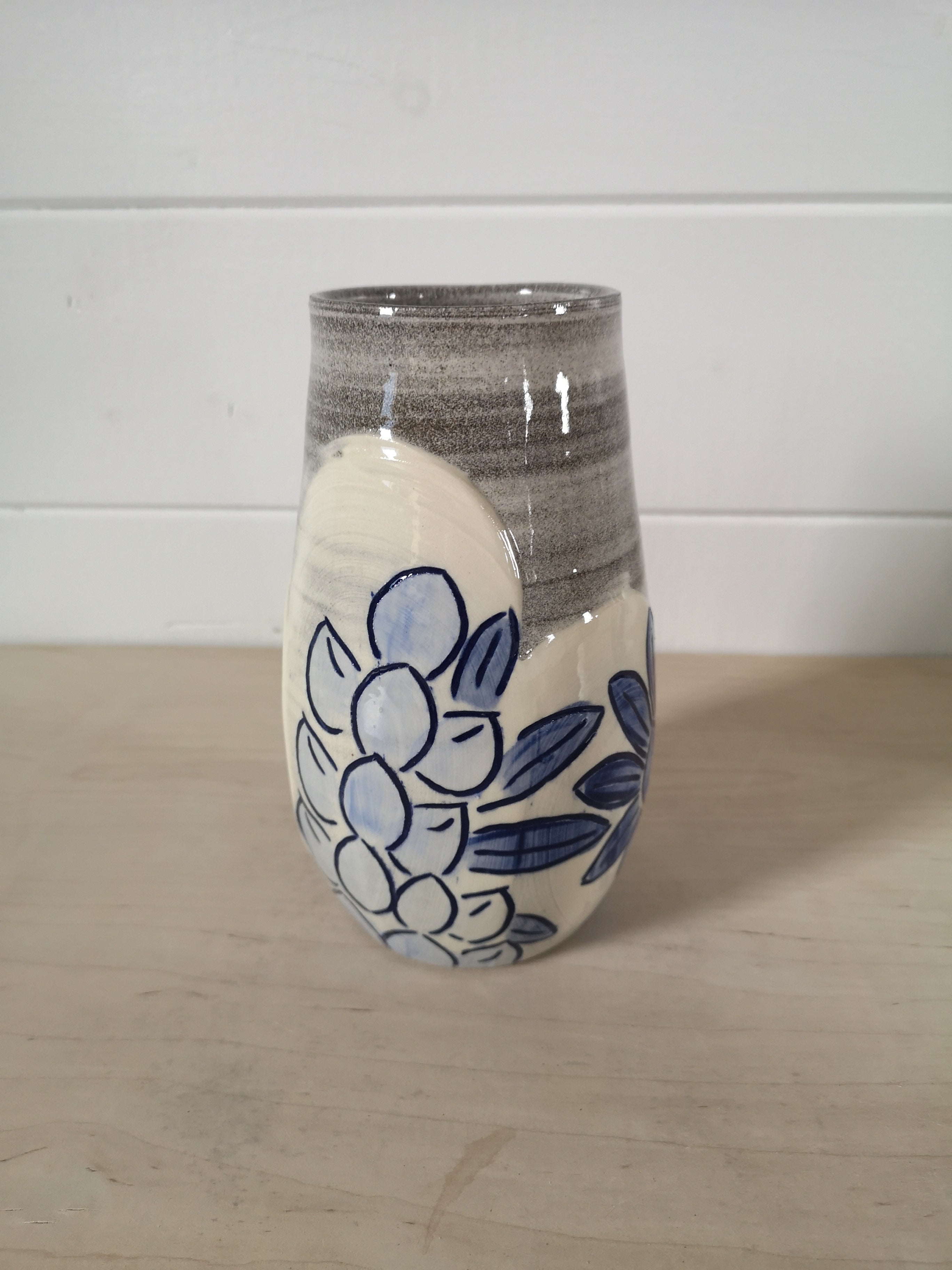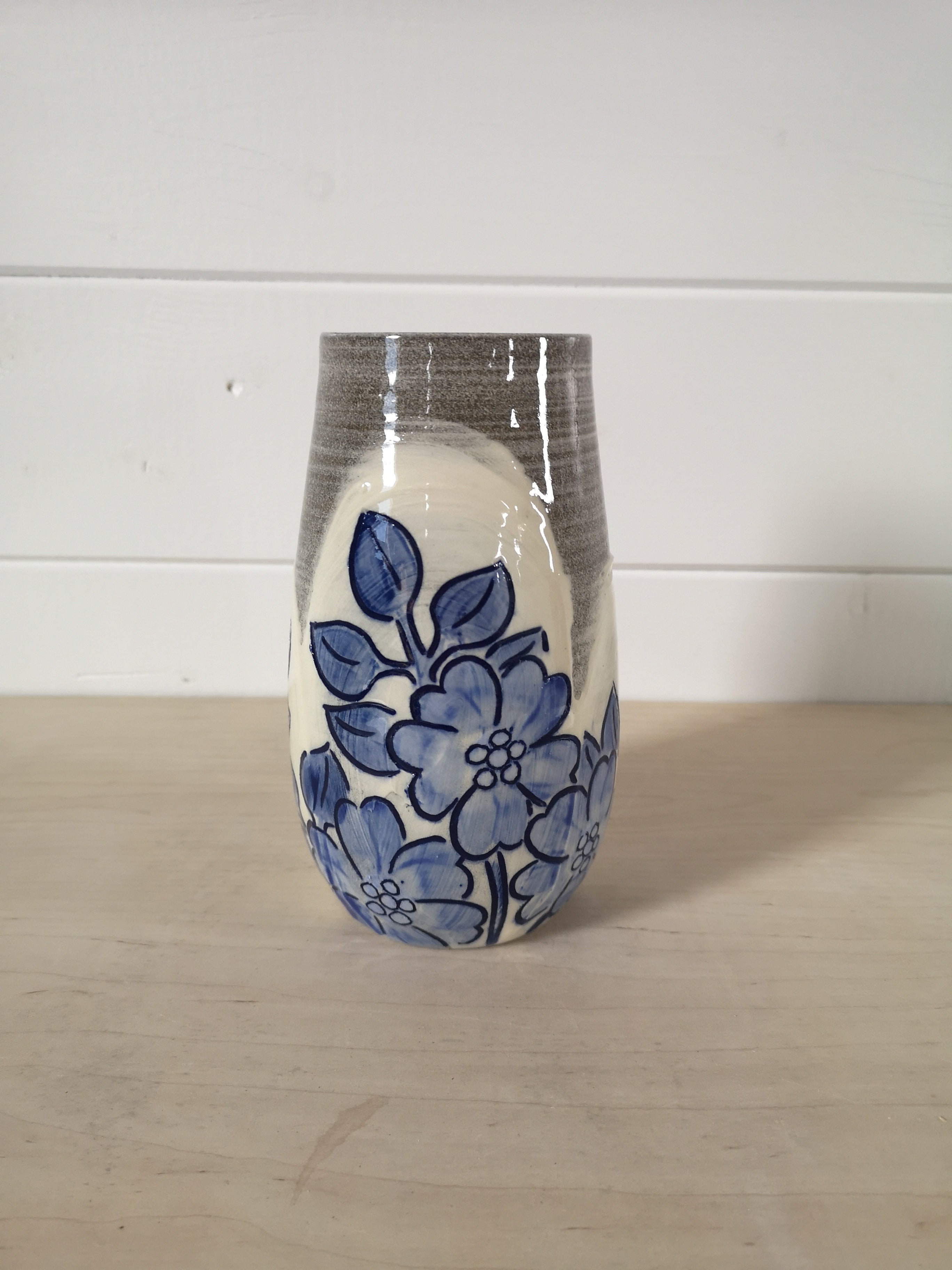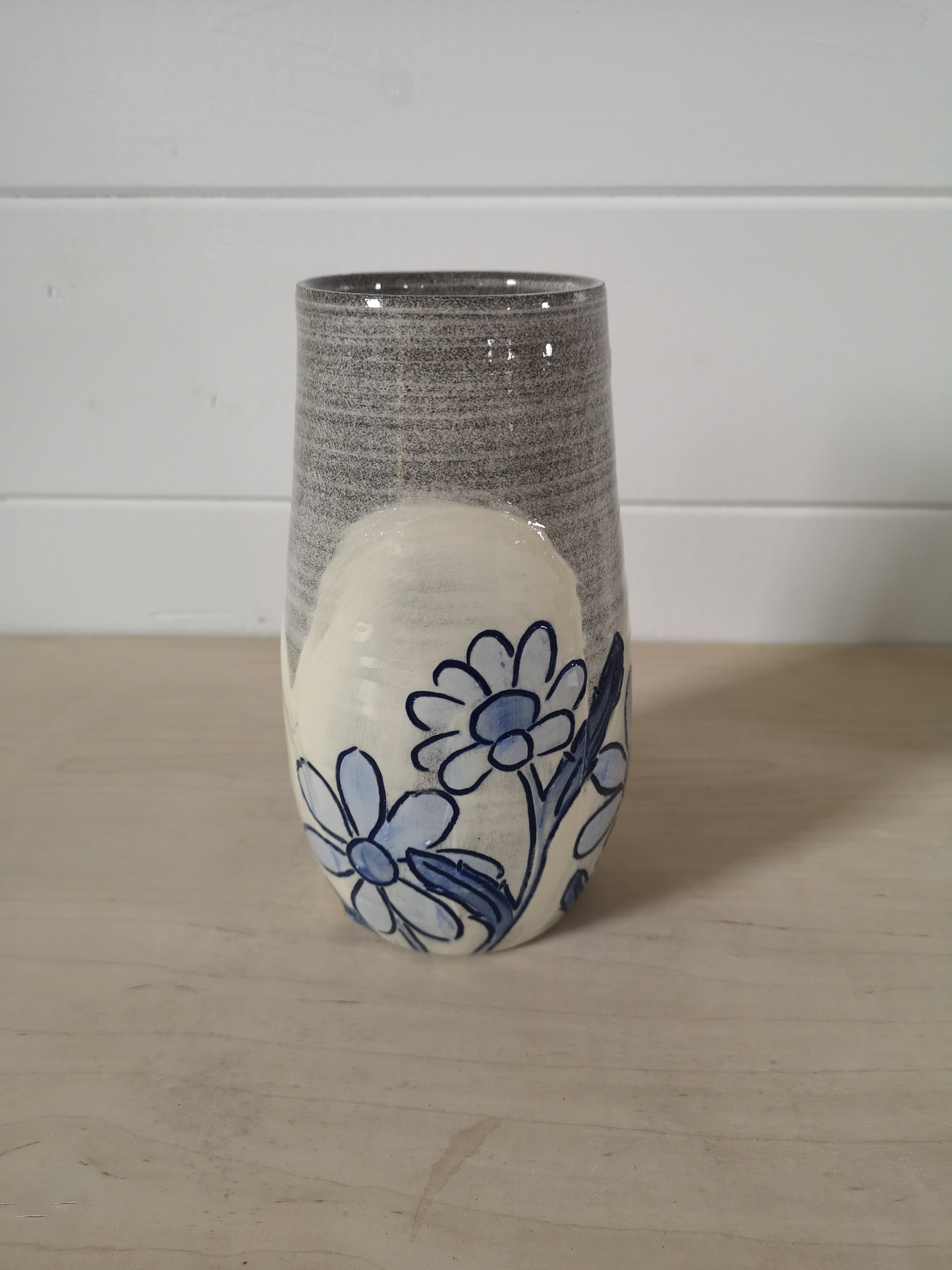 This grey stoneware vase is hand decorated with flowers. It's about 8 inches tall.