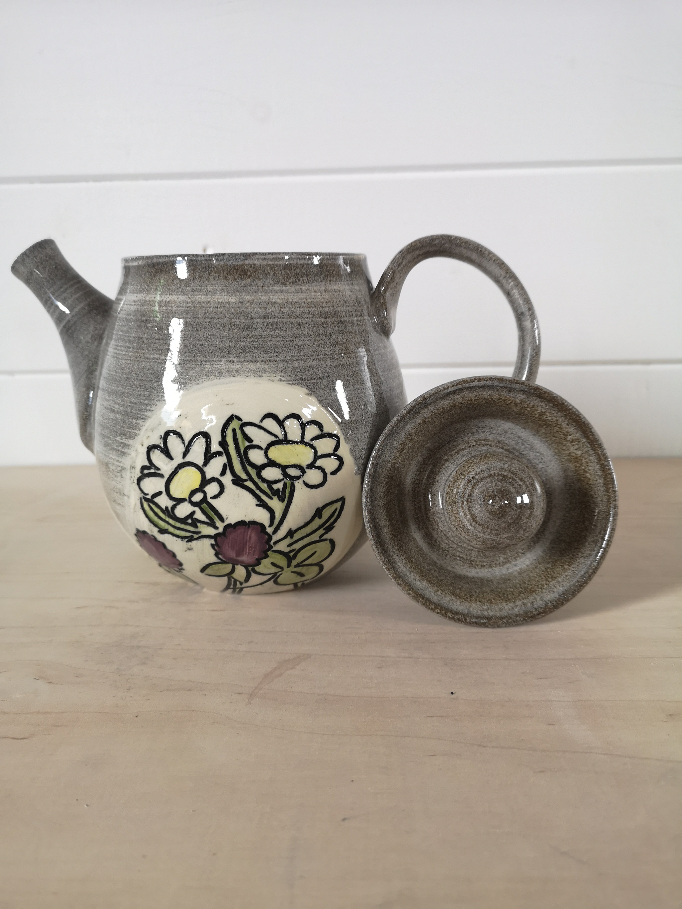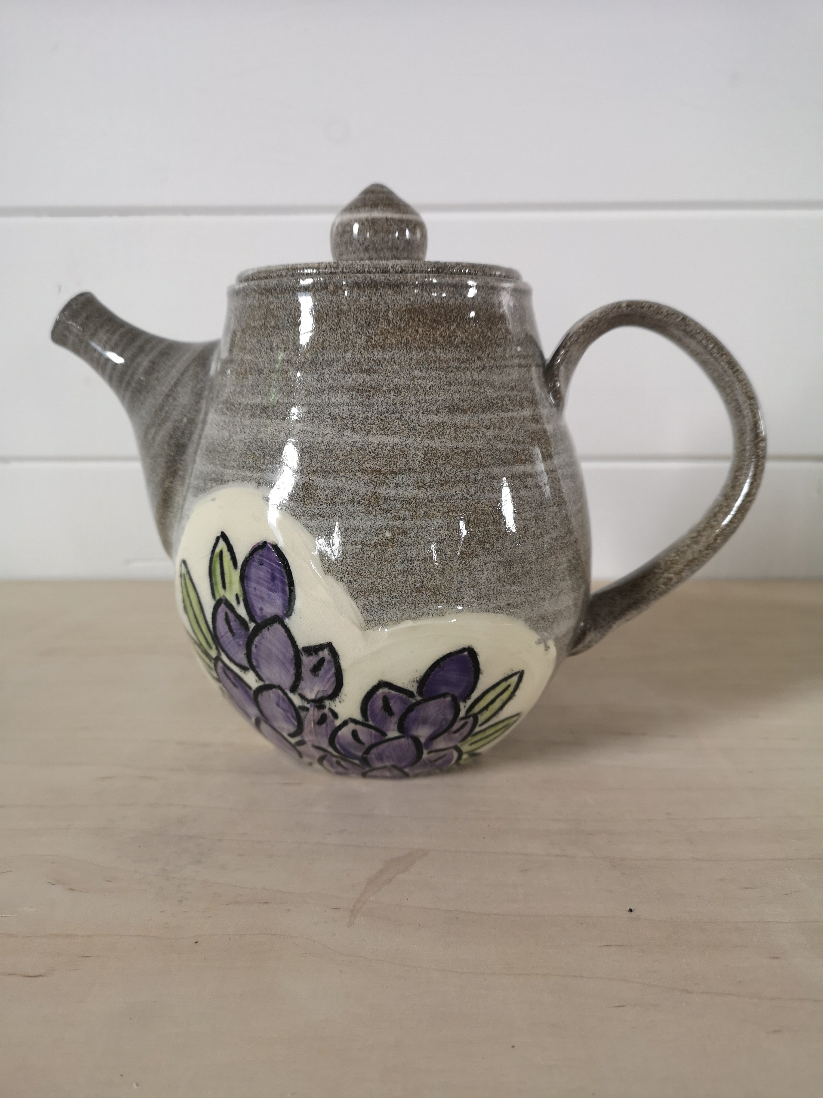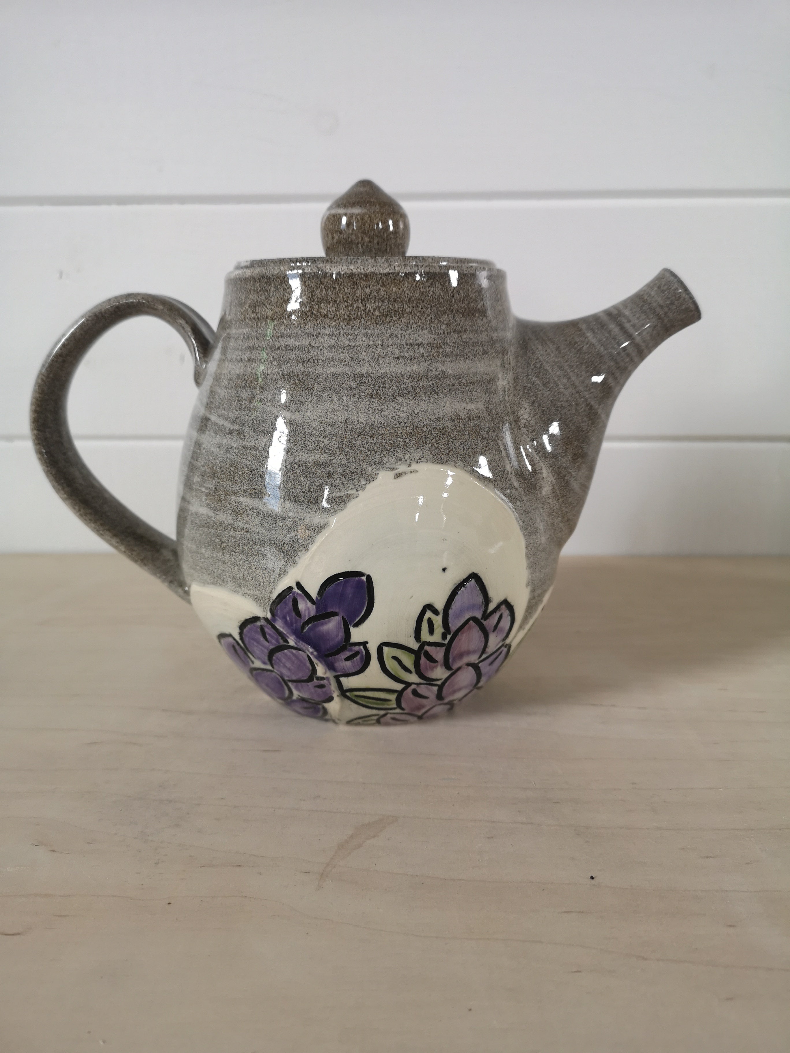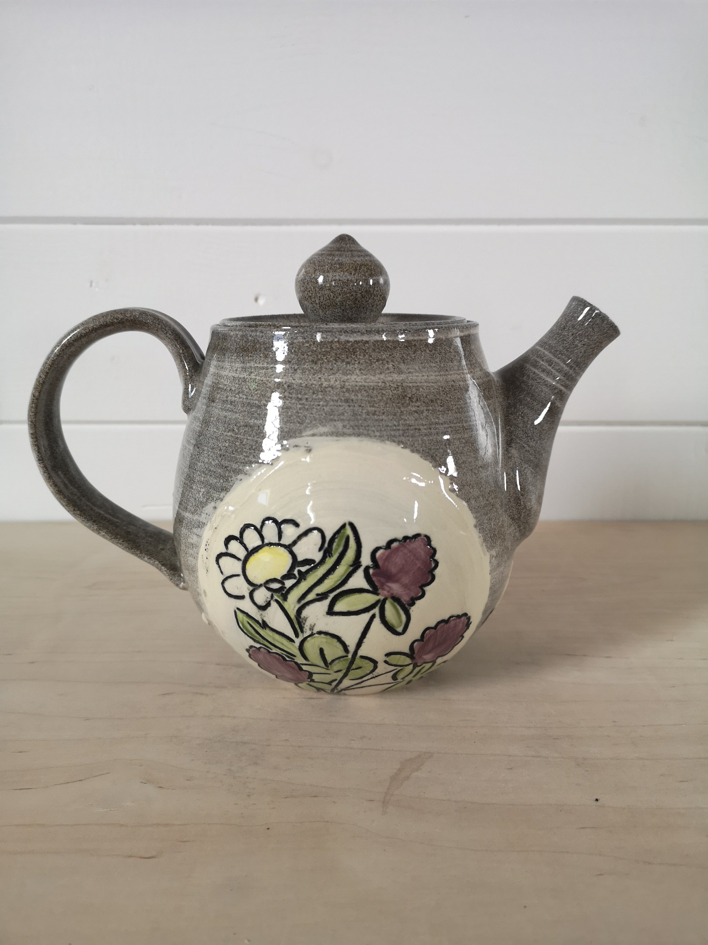 Large handmade stoneware teapot, decorated with blue and white flowers. They hold about four mugs worth of tea.