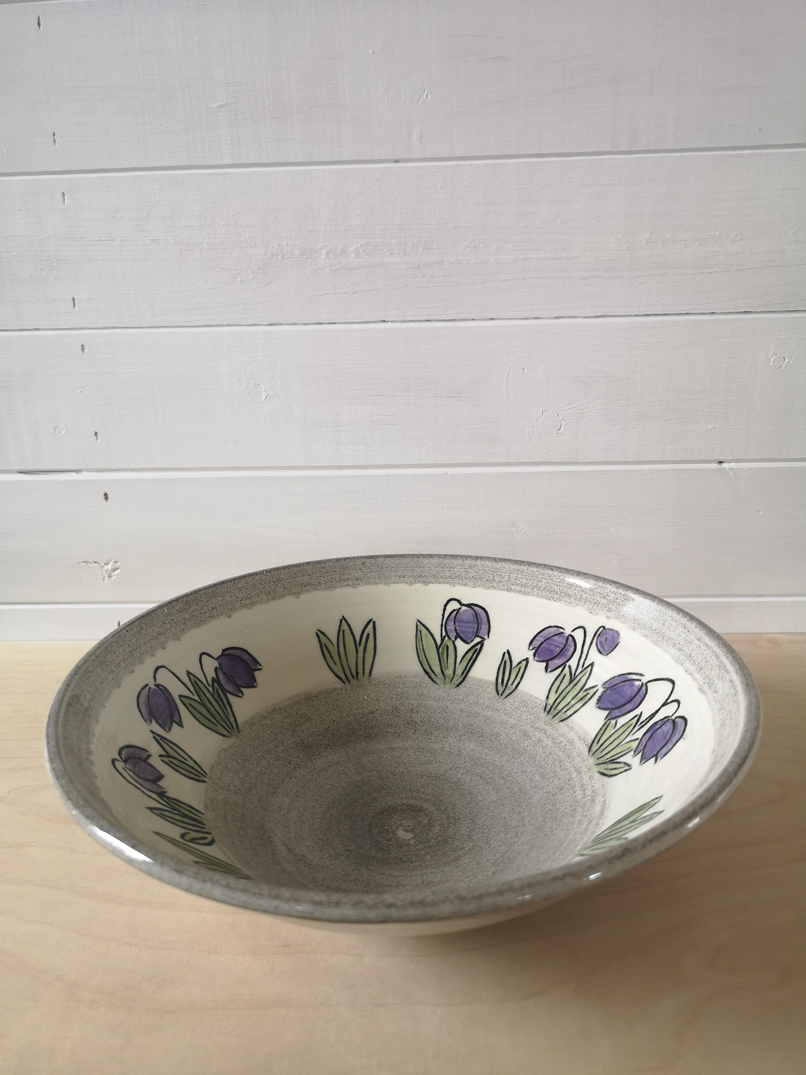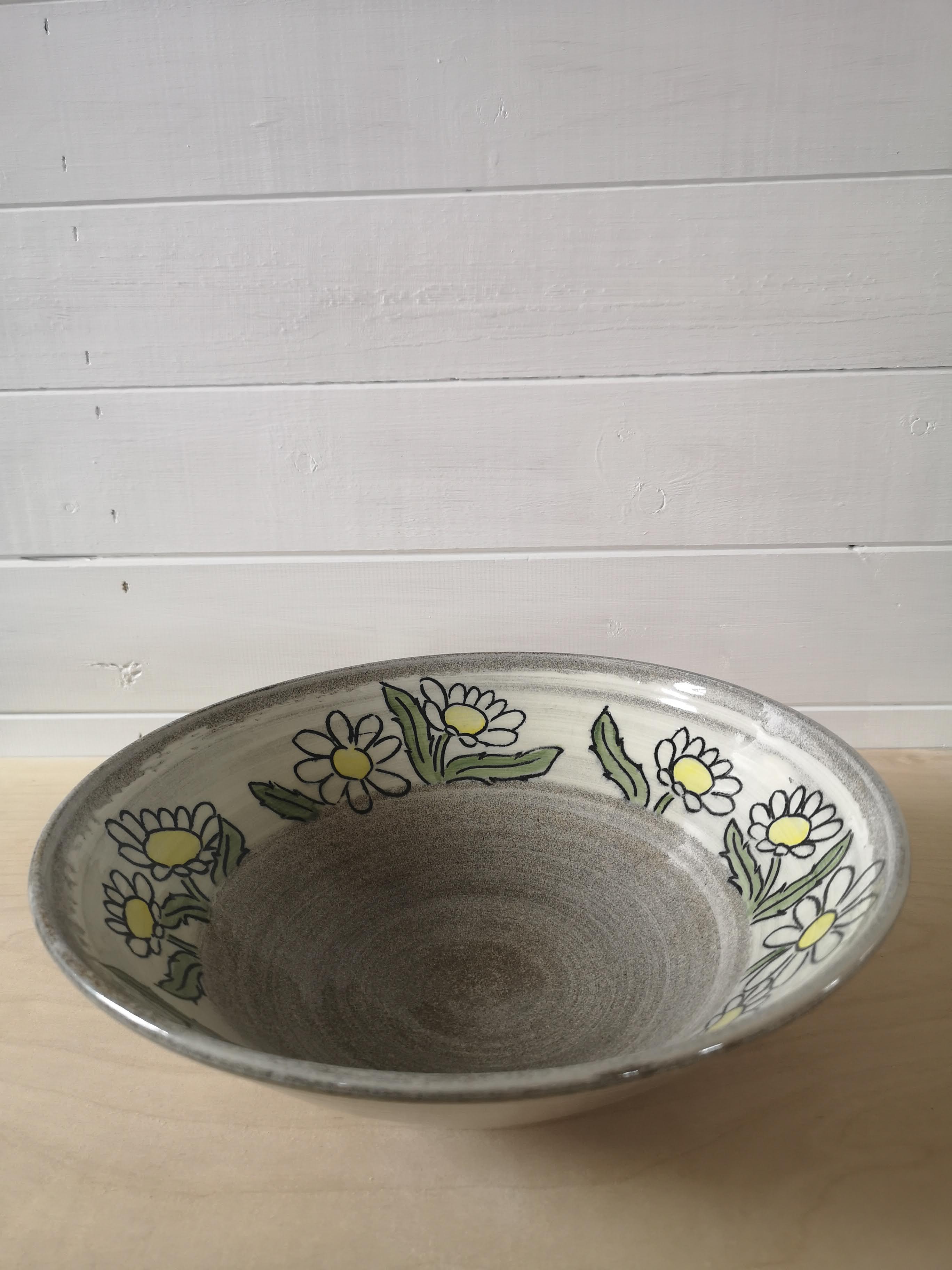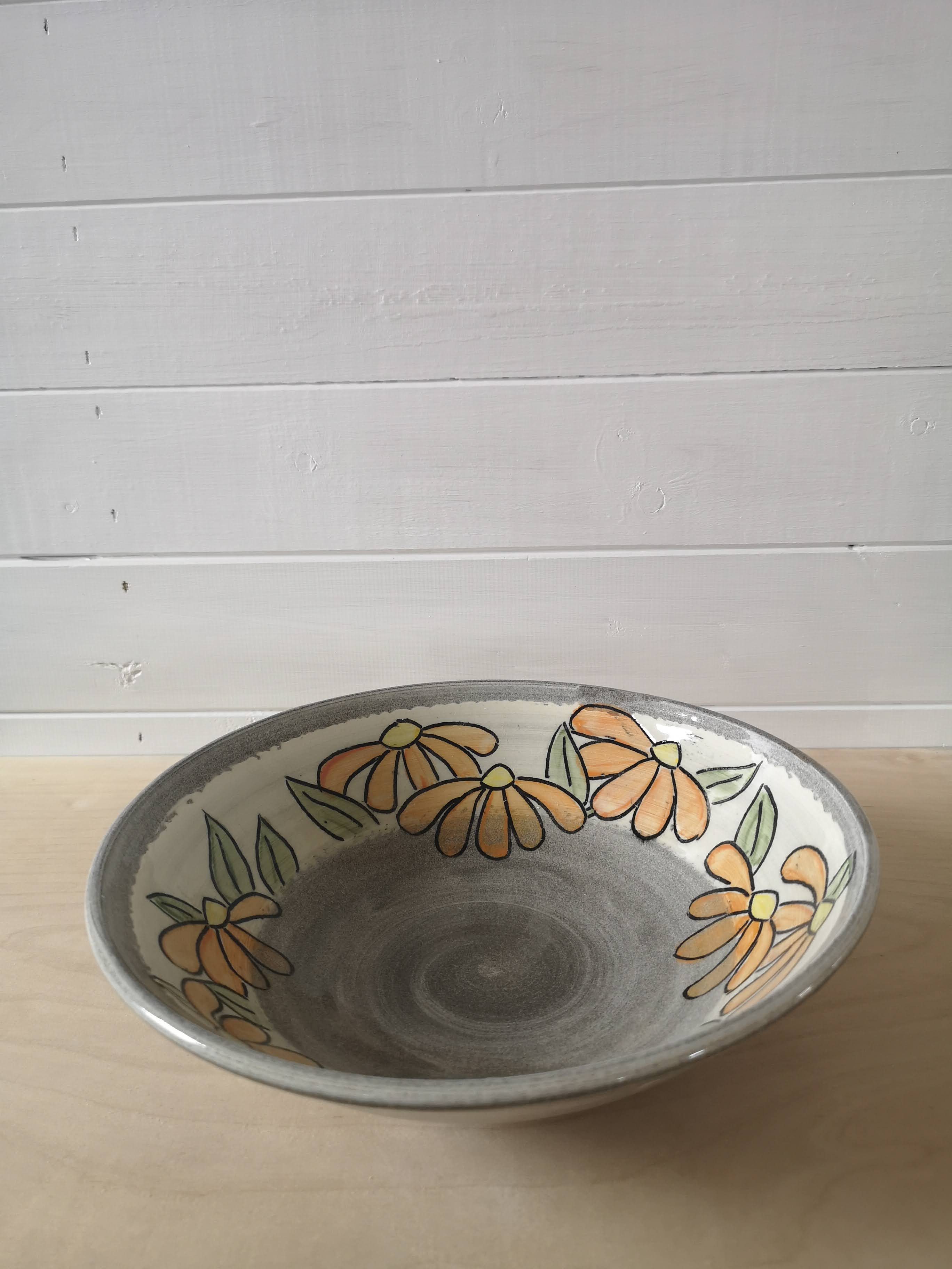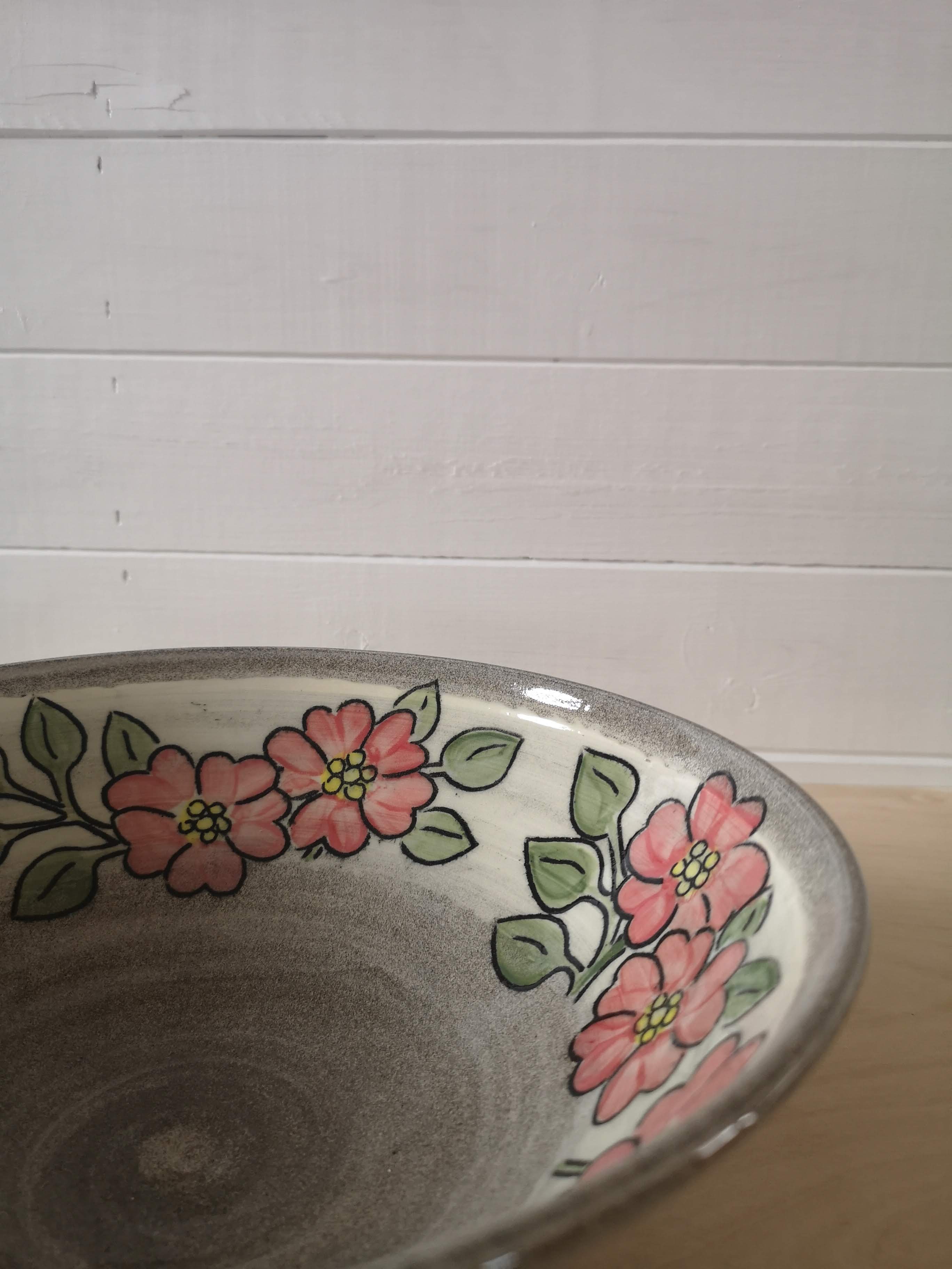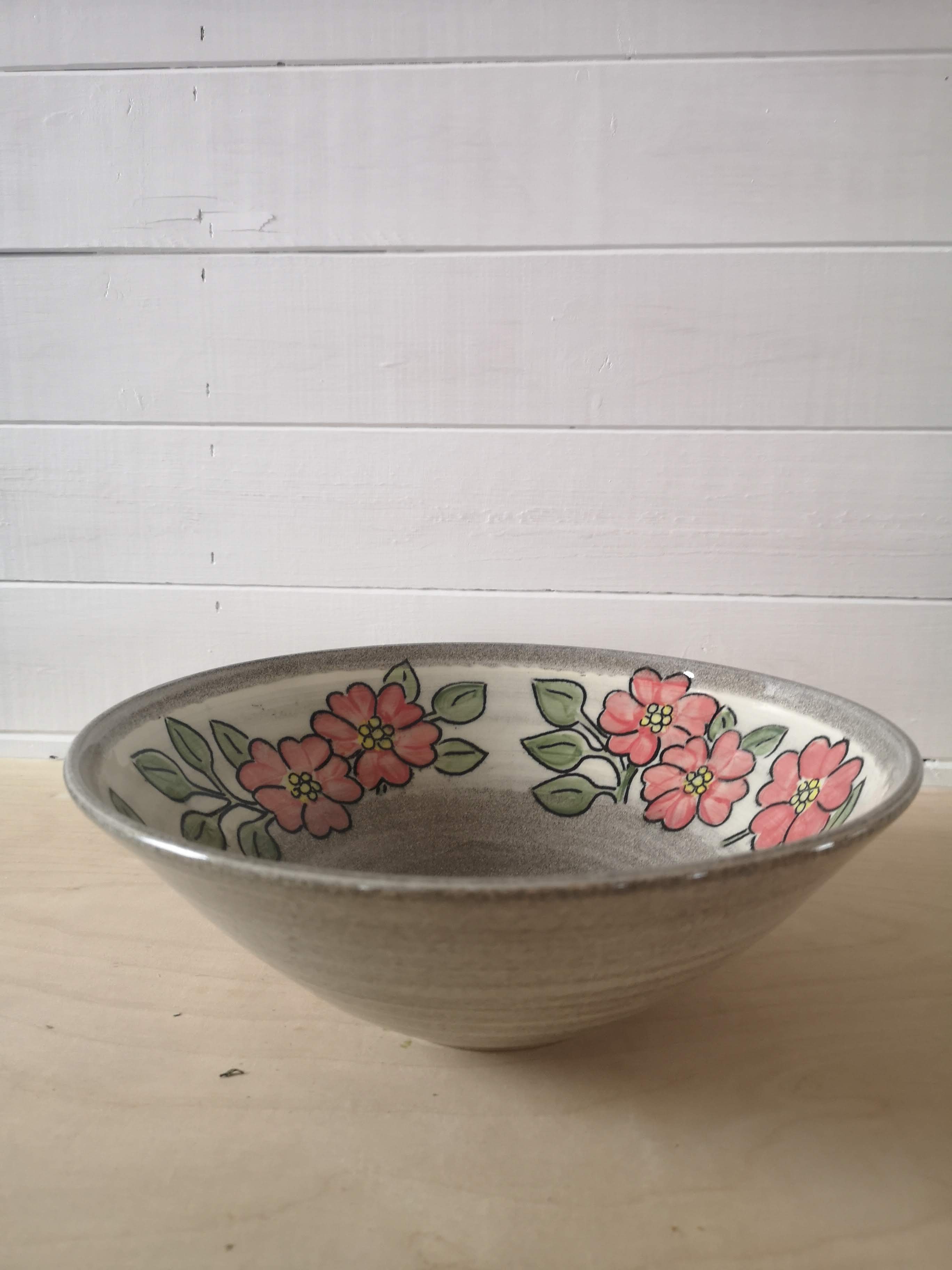 This grey stoneware bowl is hand decorated with brightly coloured flowers. It's about 10 inches wide and three inches tall.