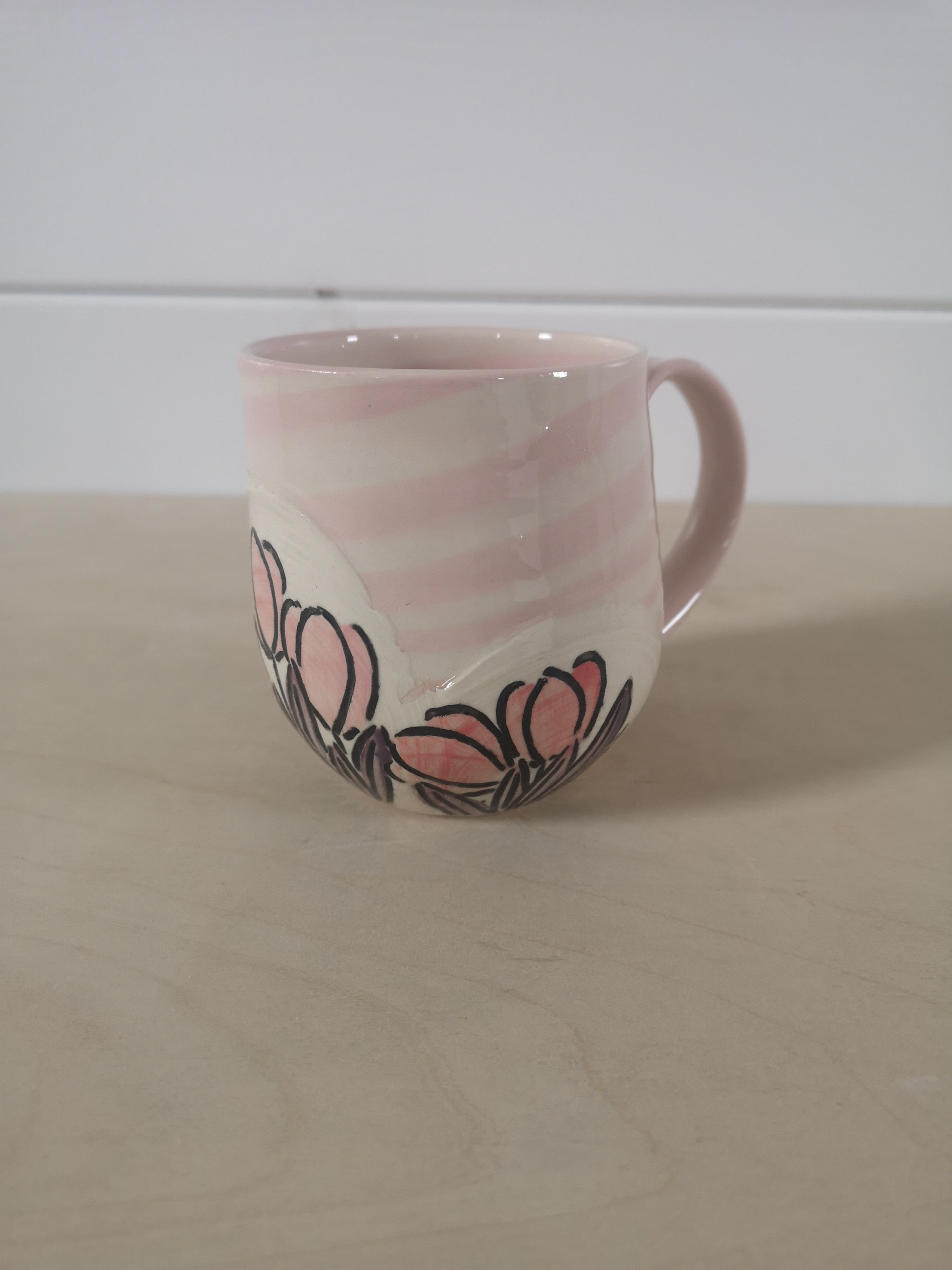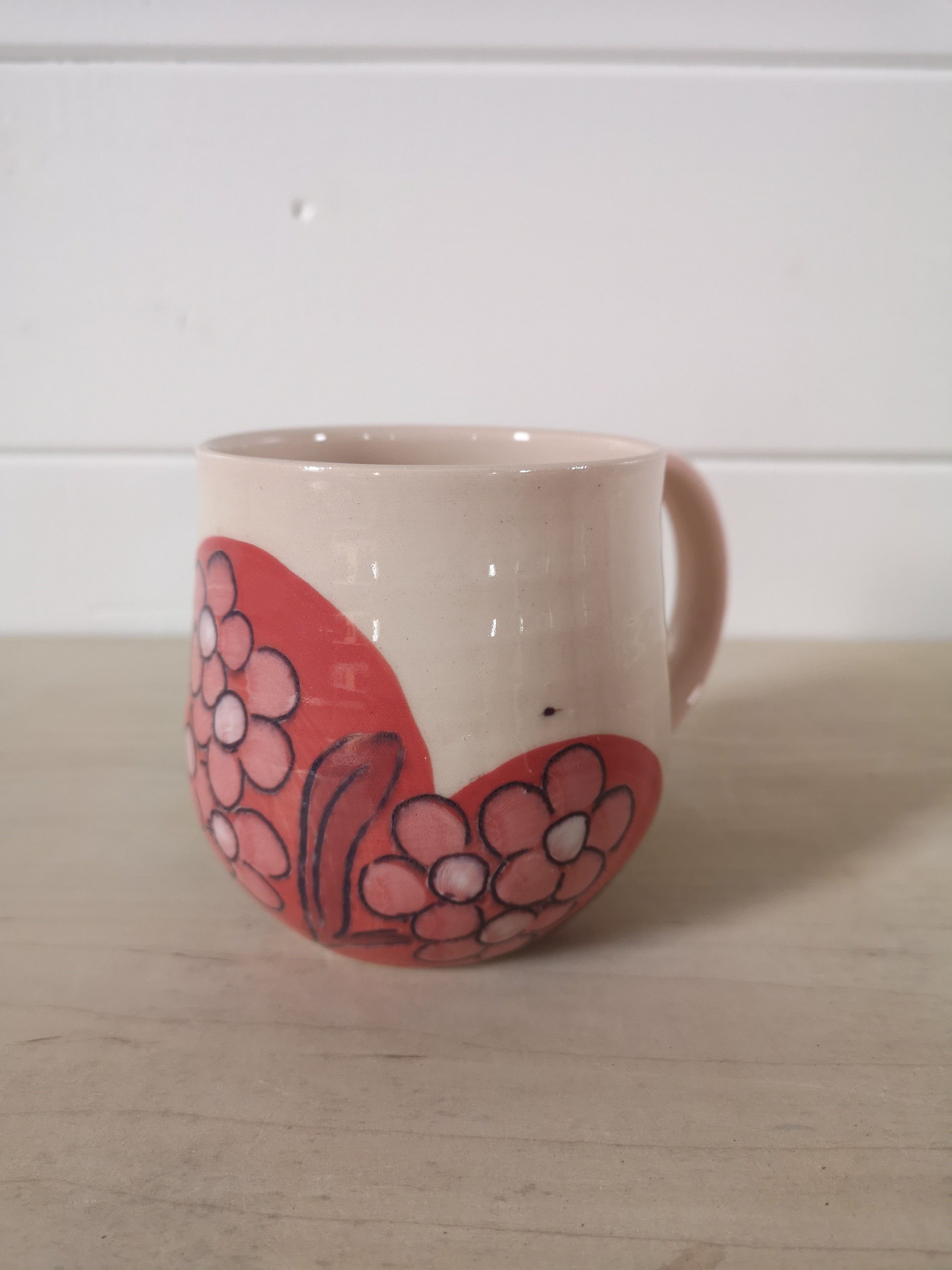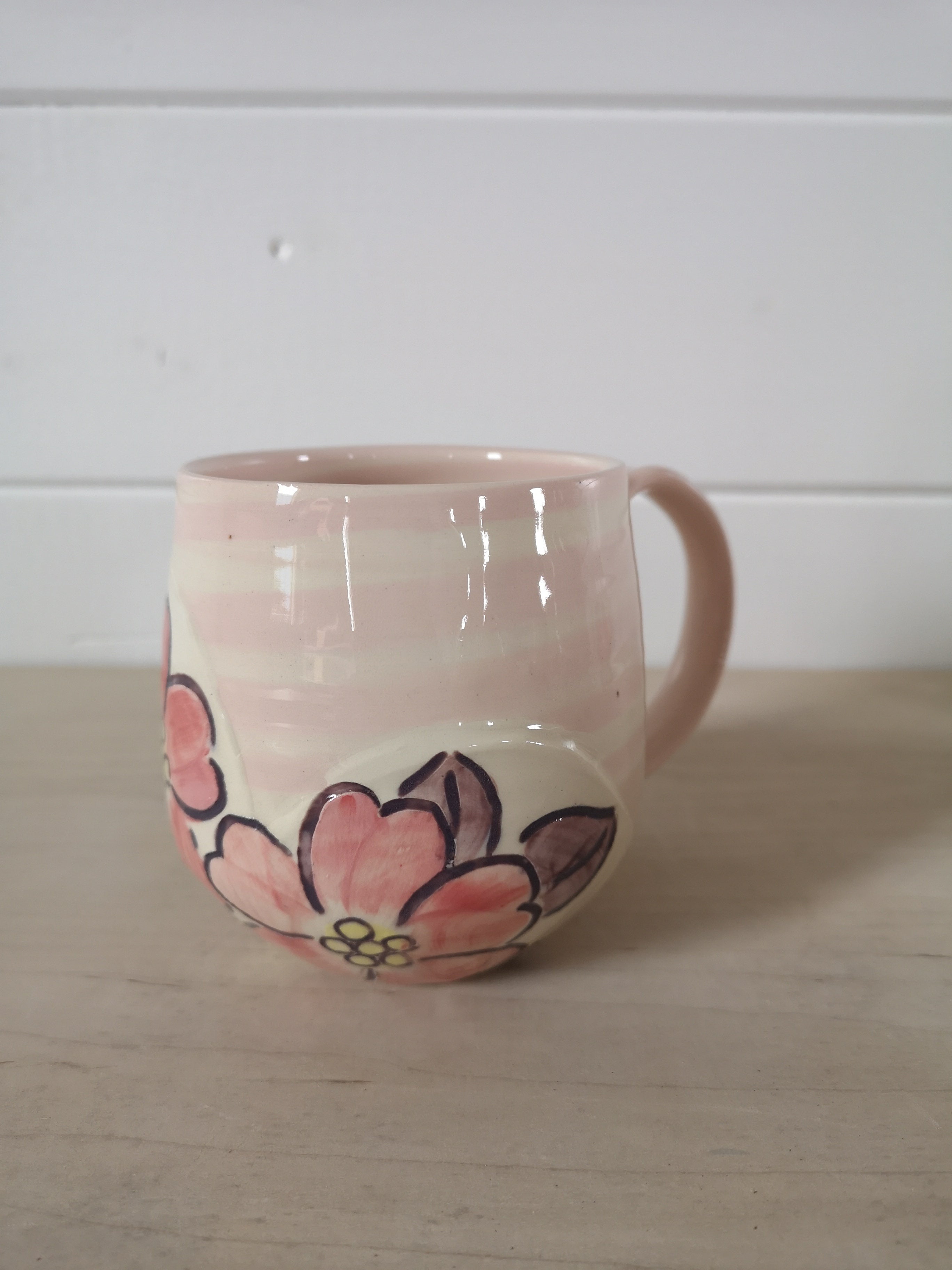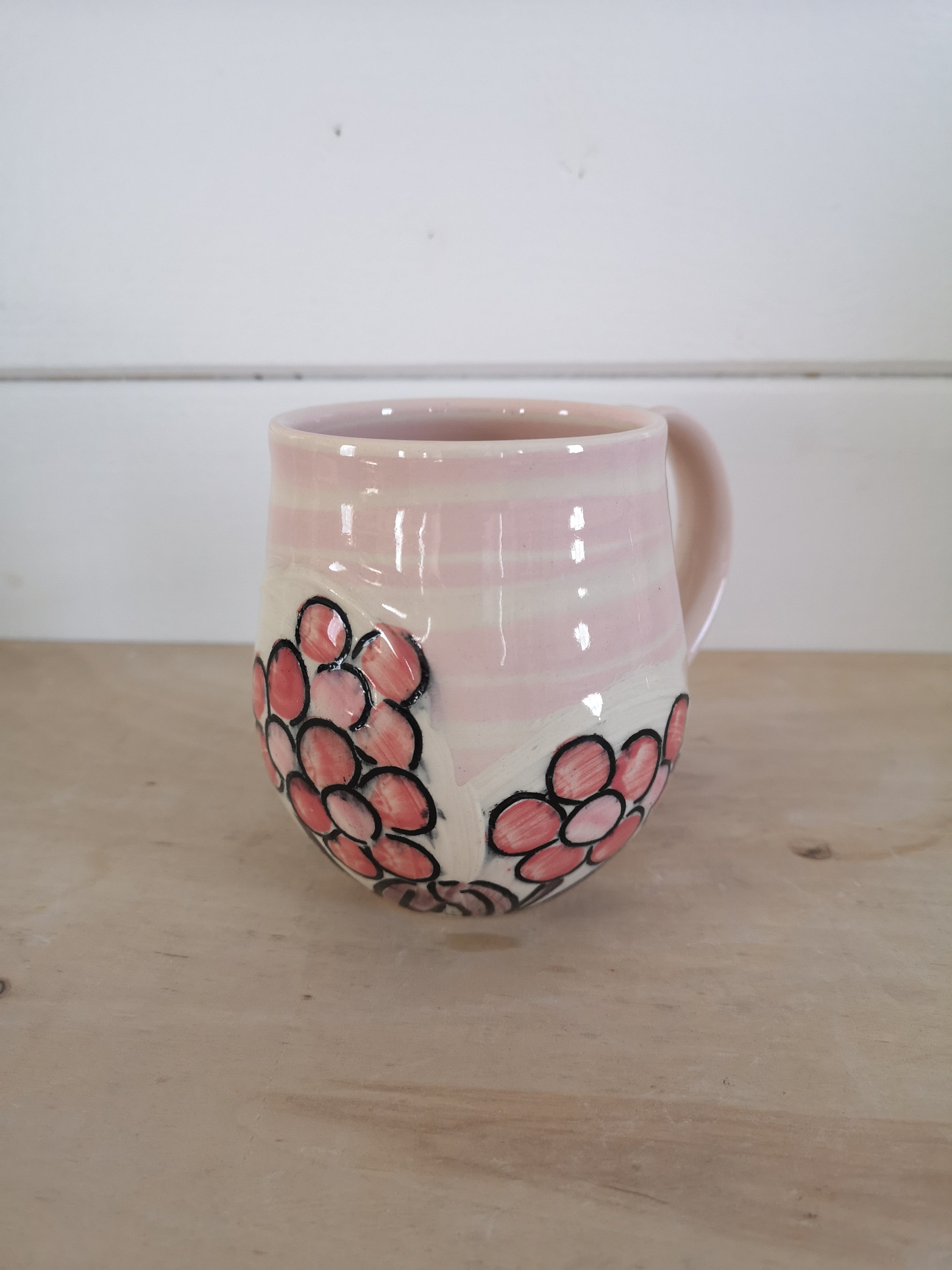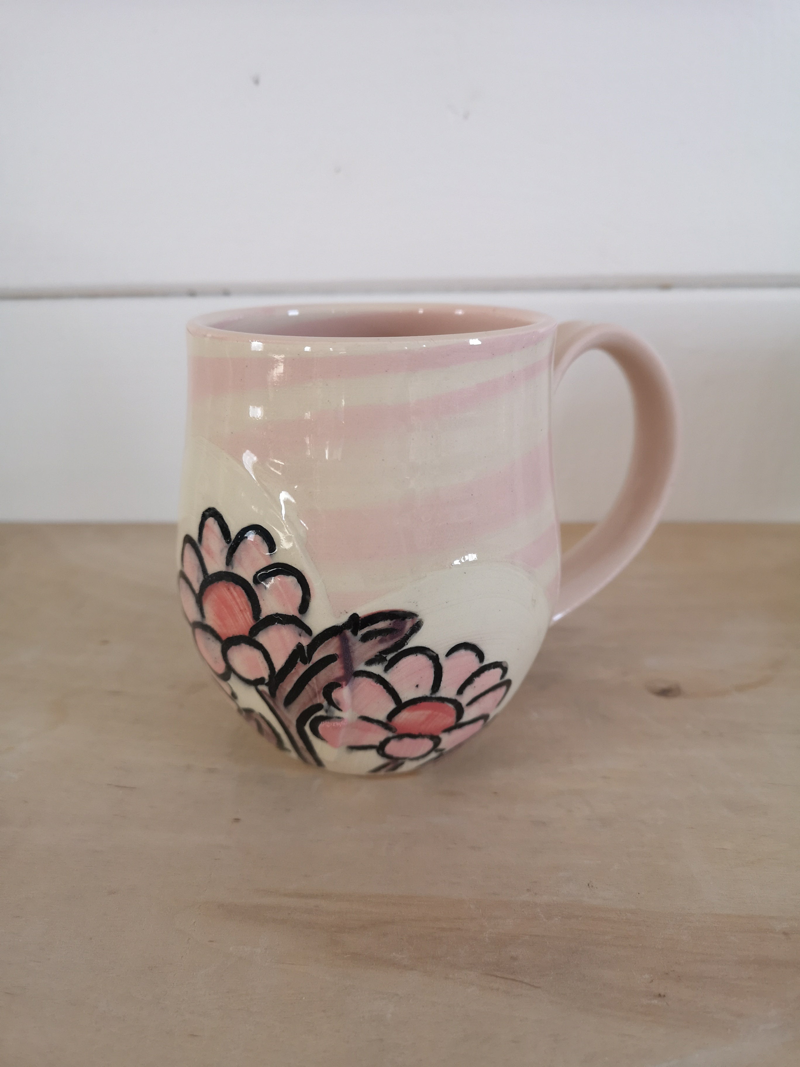 This swirly pink porcelain mug features a round belly and a generous handle. Hand decorated with flowers in shades of pink and purple, it holds about 16 oz of your favourite hot beverage.