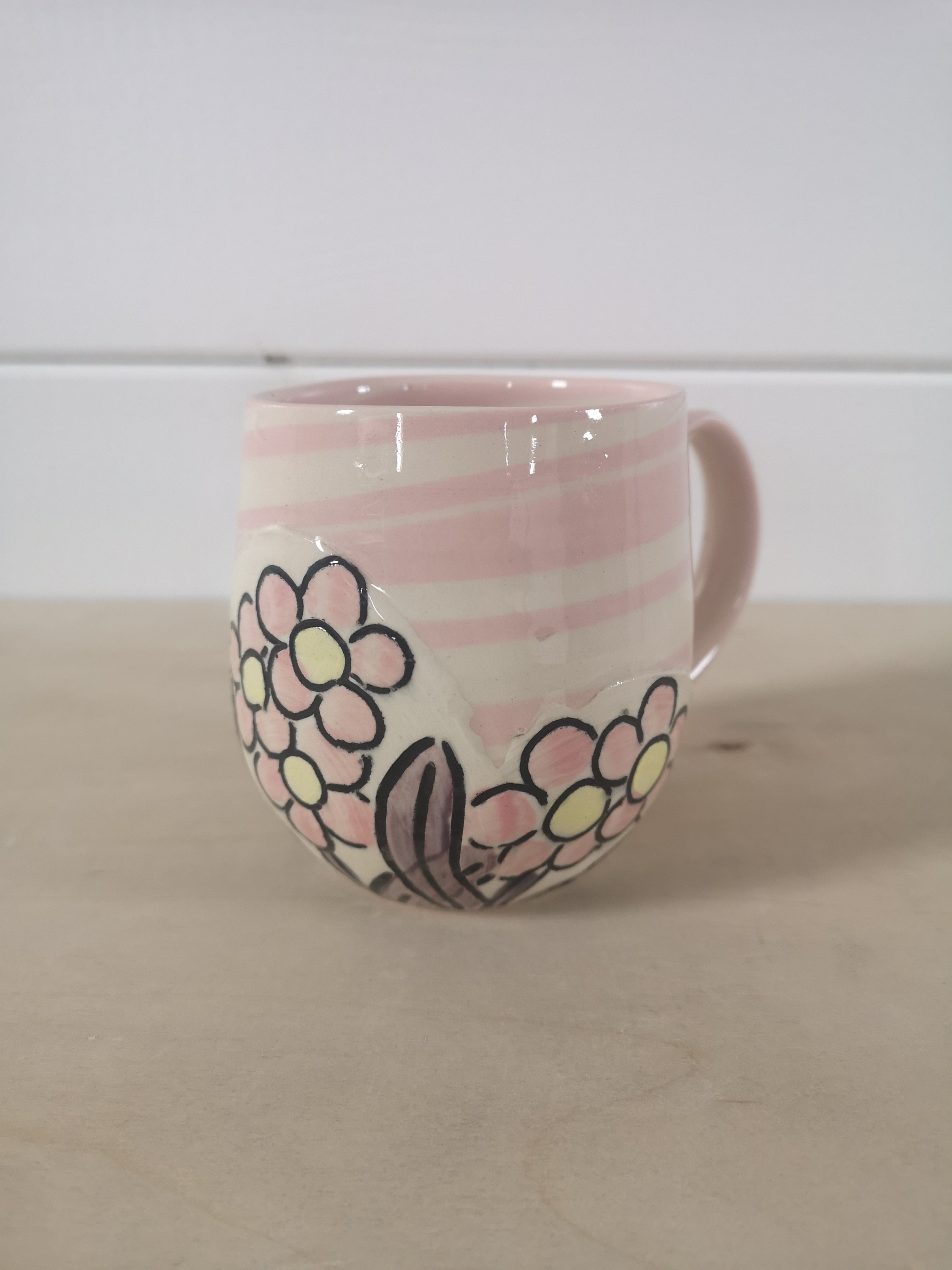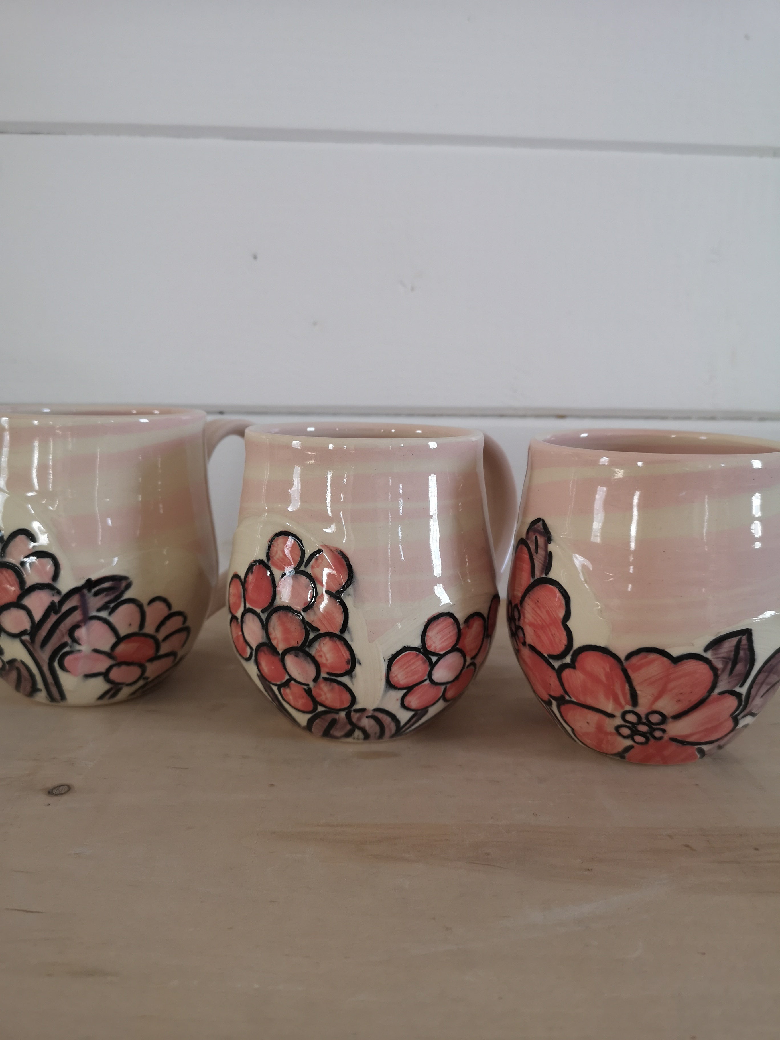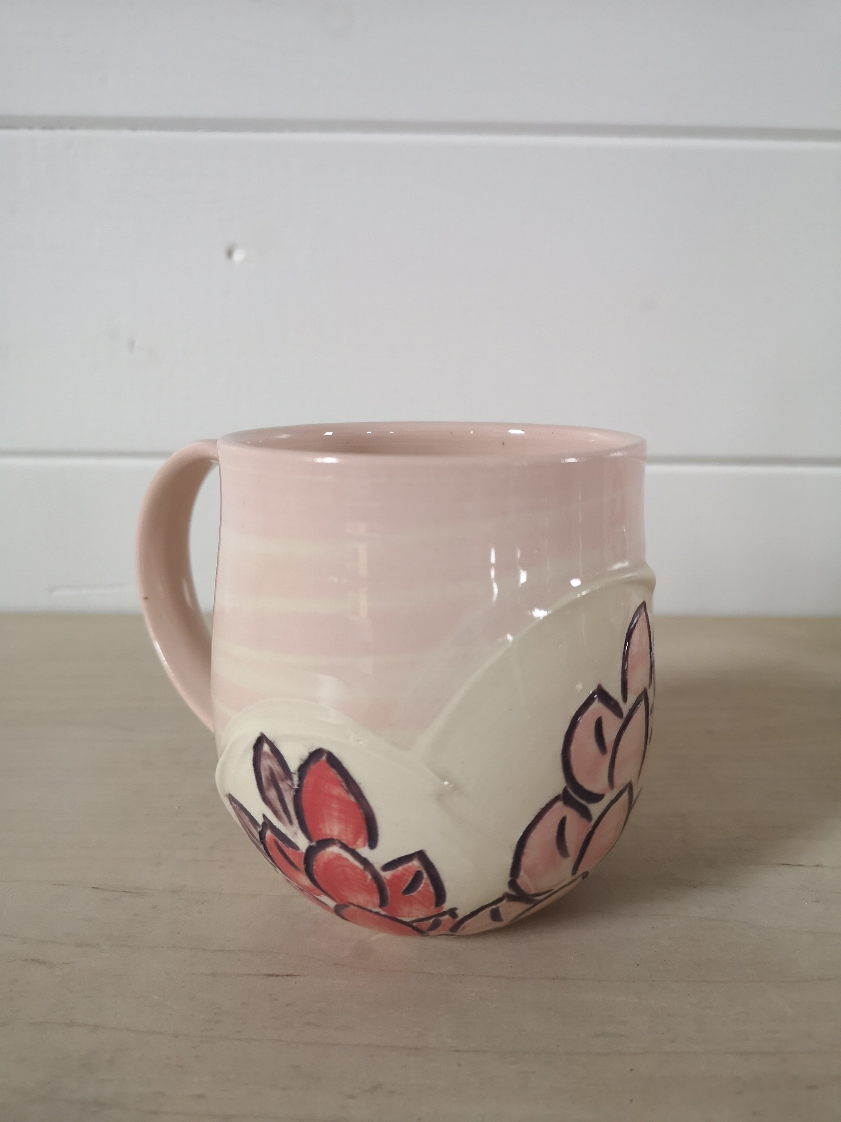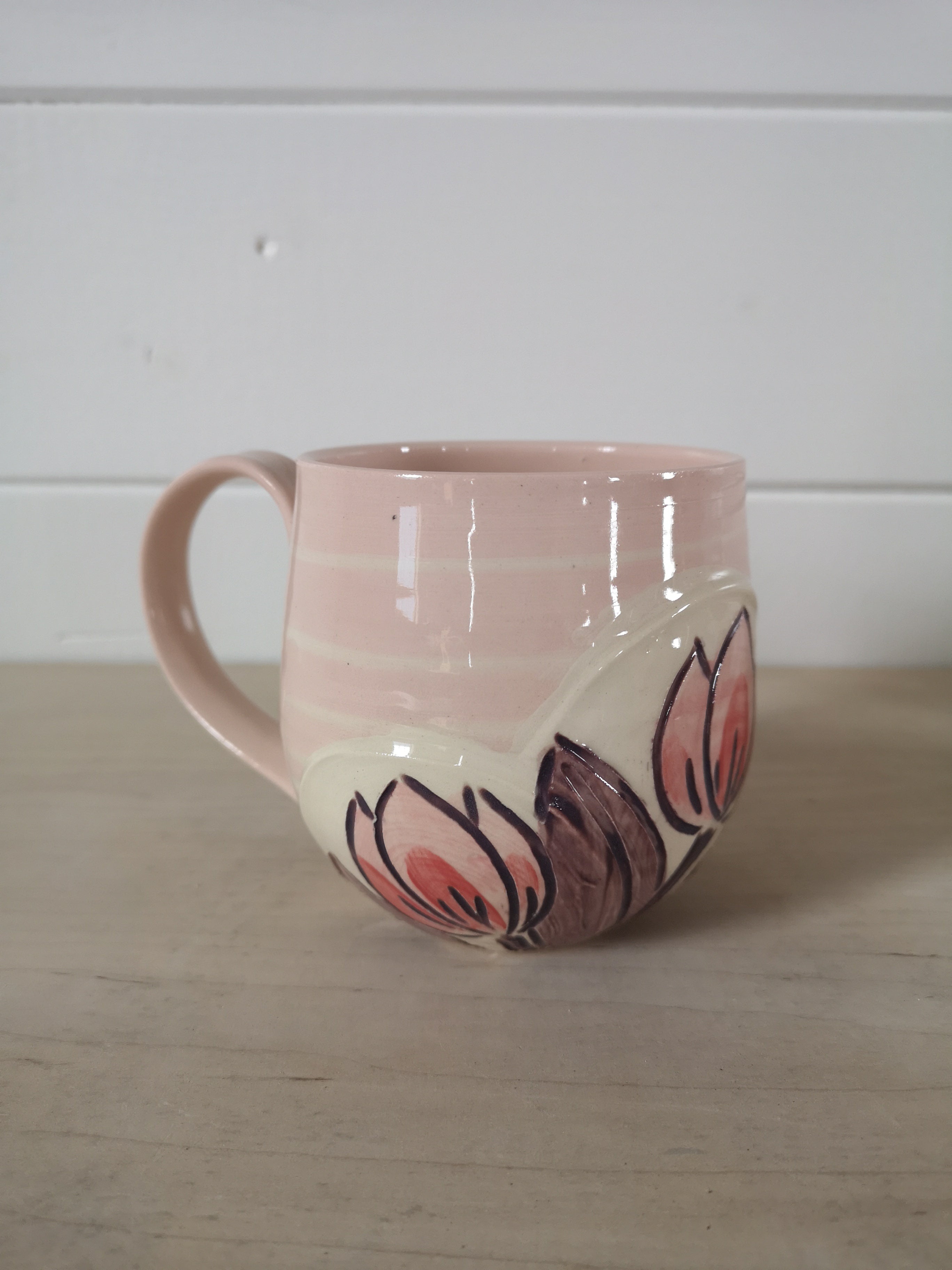 This swirly pink porcelain mug features a round belly and a generous handle. Hand decorated with flowers in shades of pink and purple, it holds about 16 oz of your favourite hot beverage.