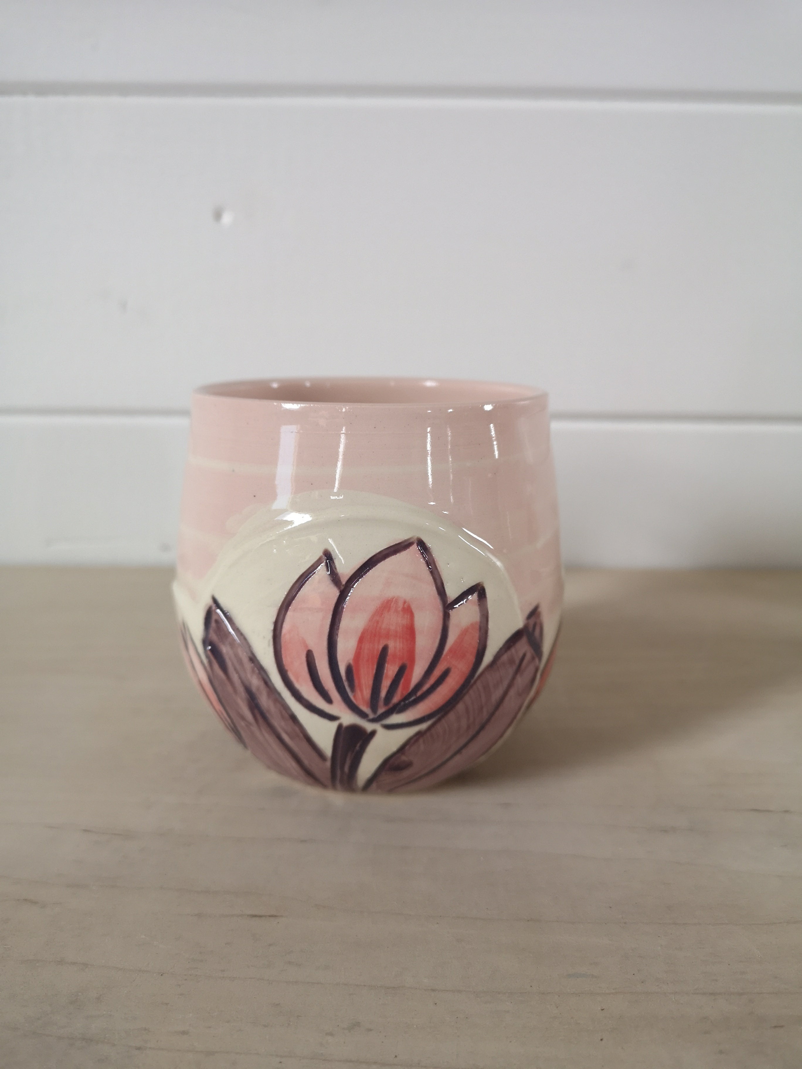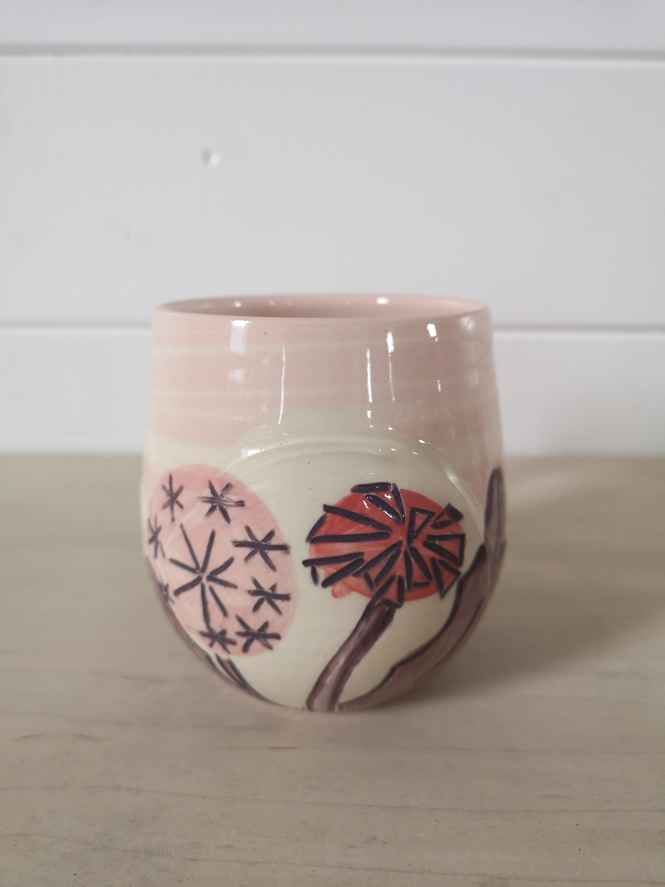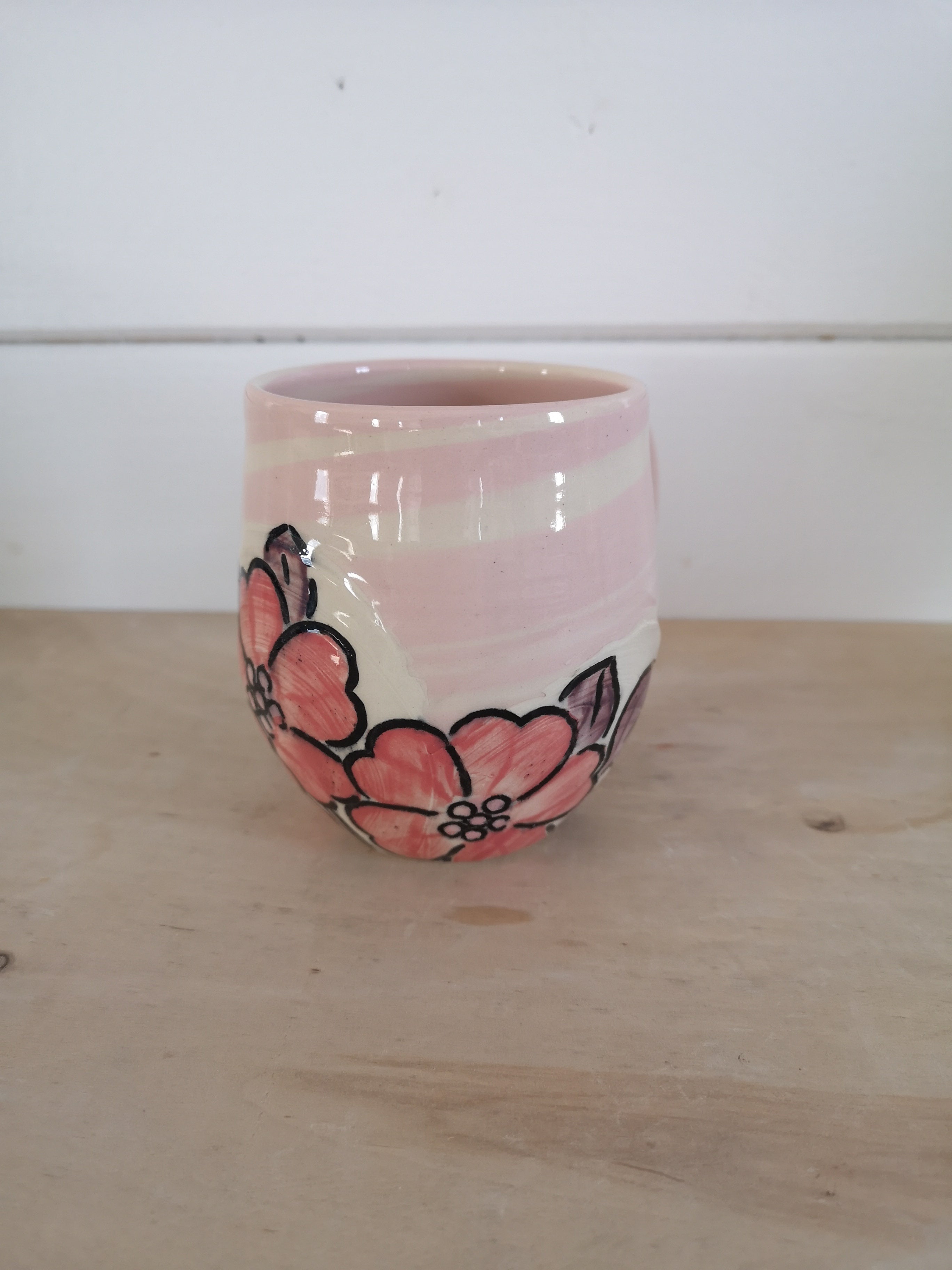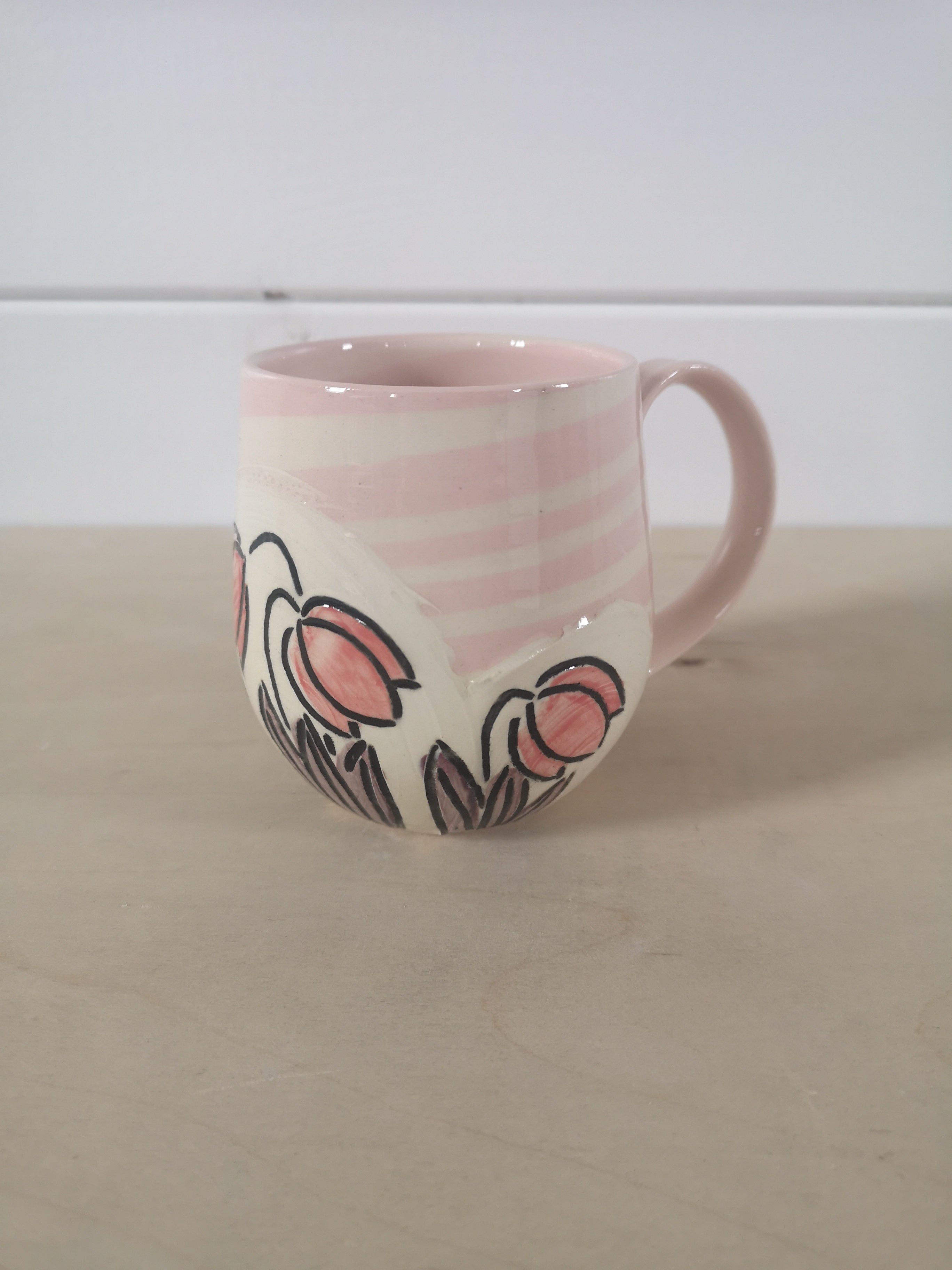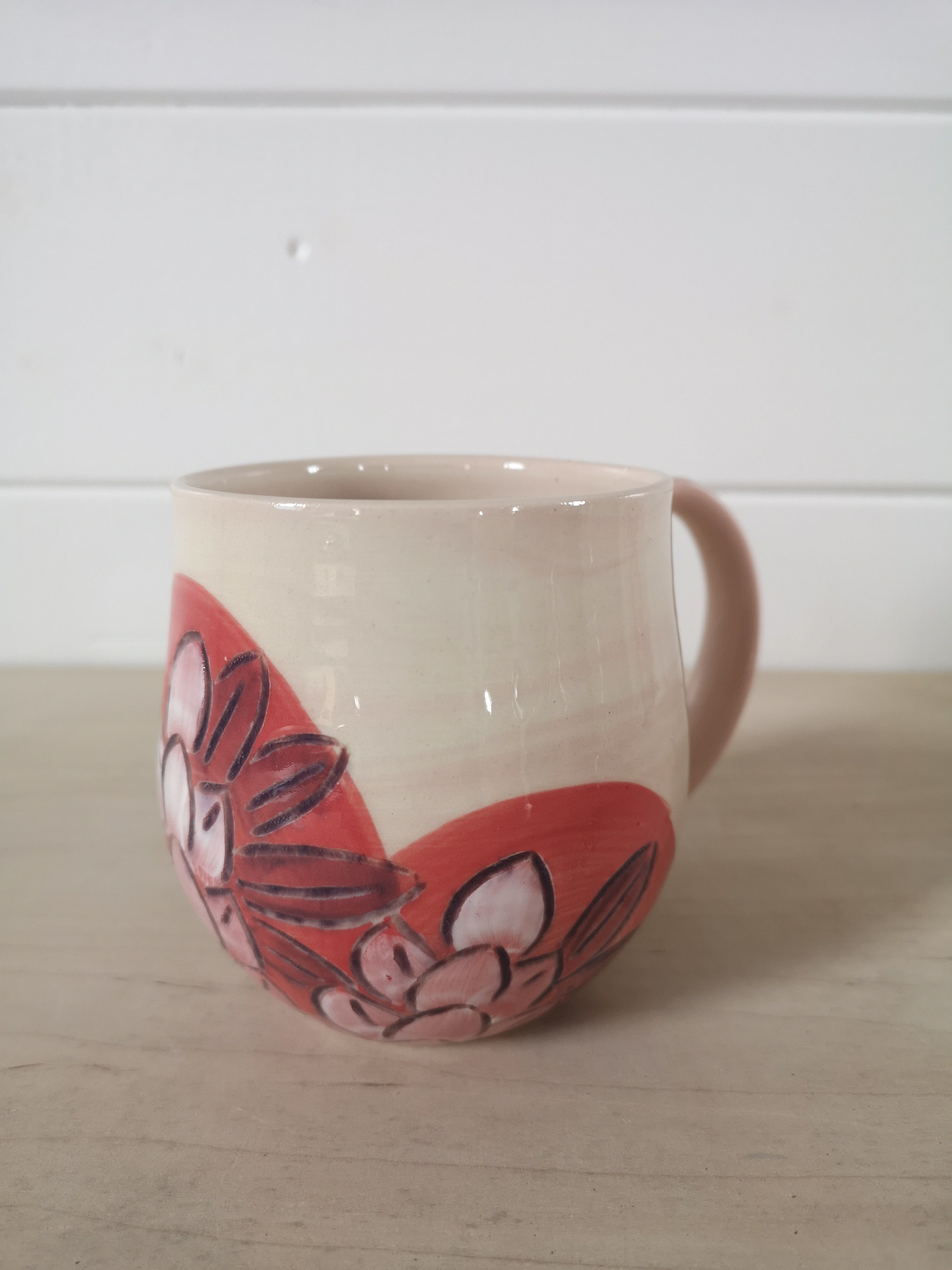 This swirly pink porcelain mug features a round belly and a generous handle. Hand decorated with flowers in shades of pink and purple, it holds about 16 oz of your favourite hot beverage.