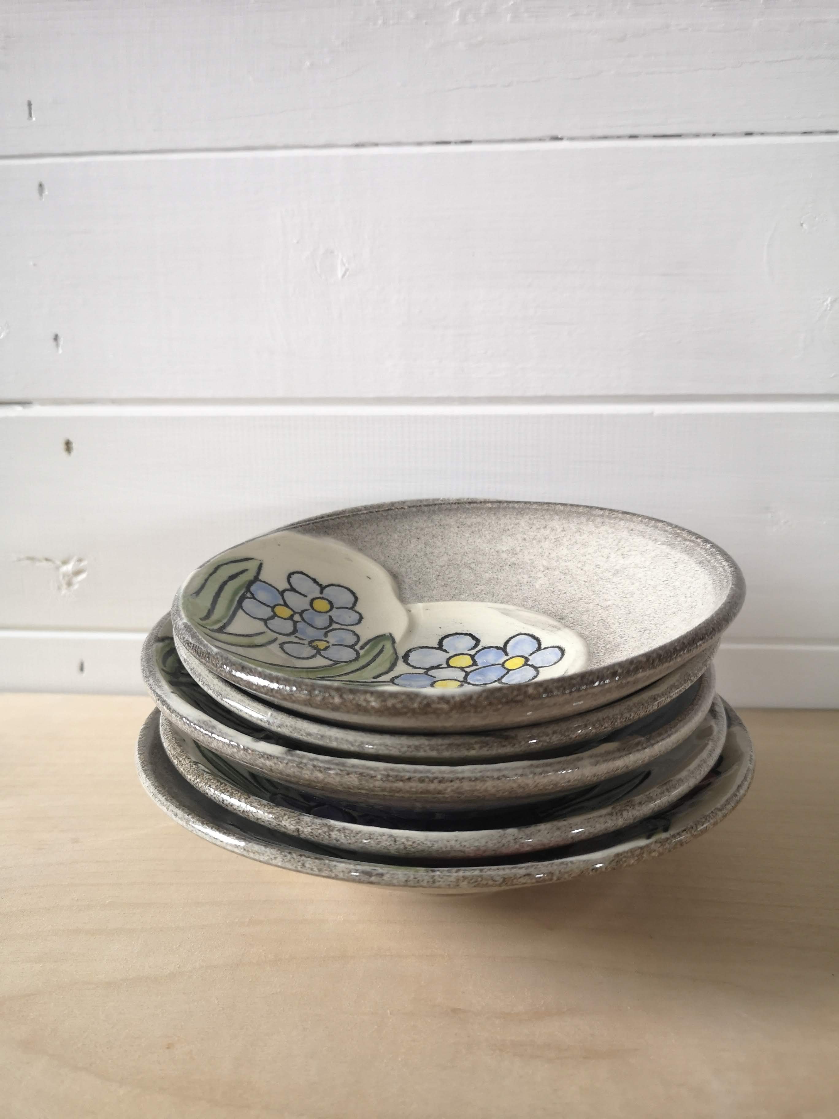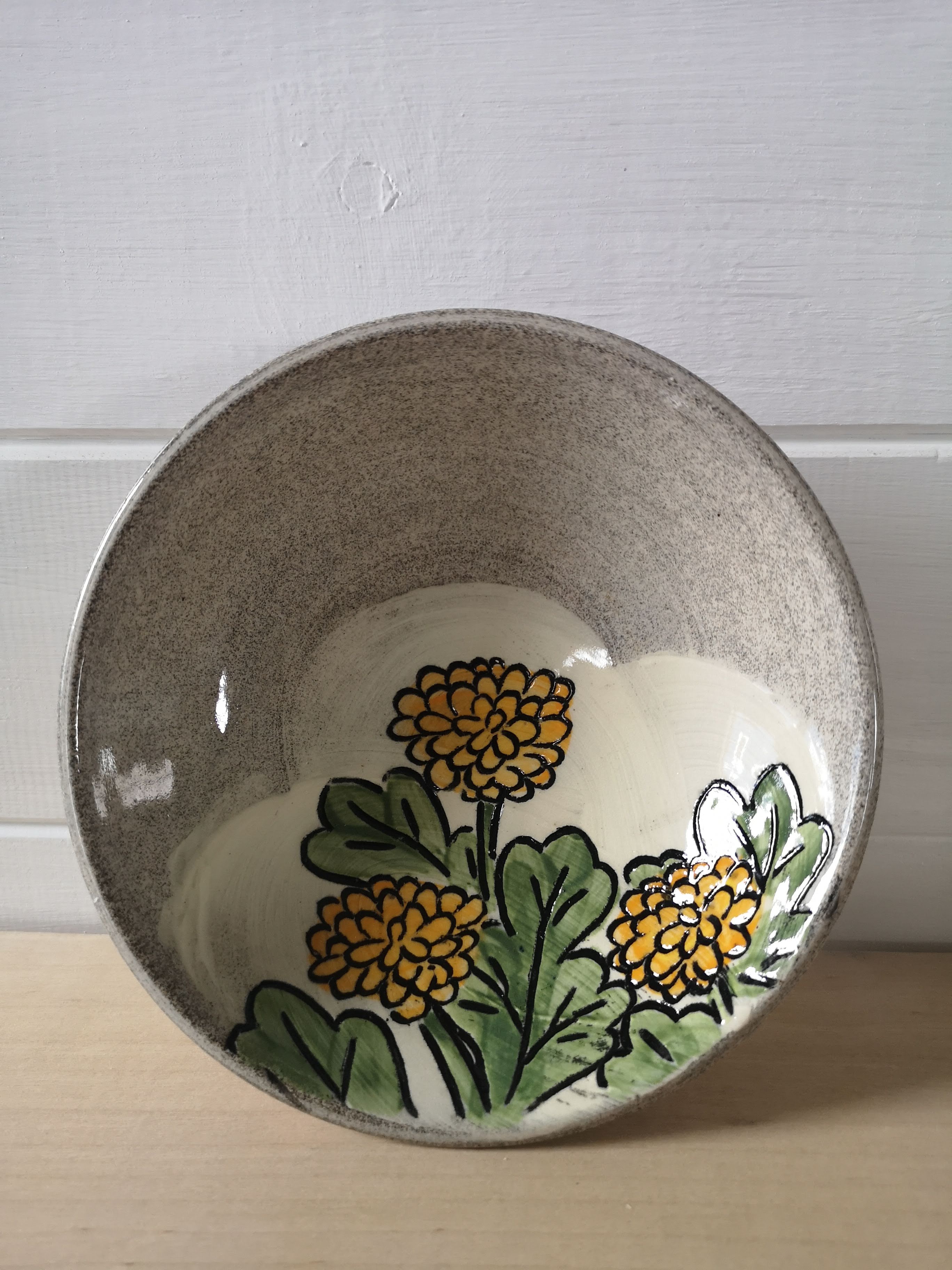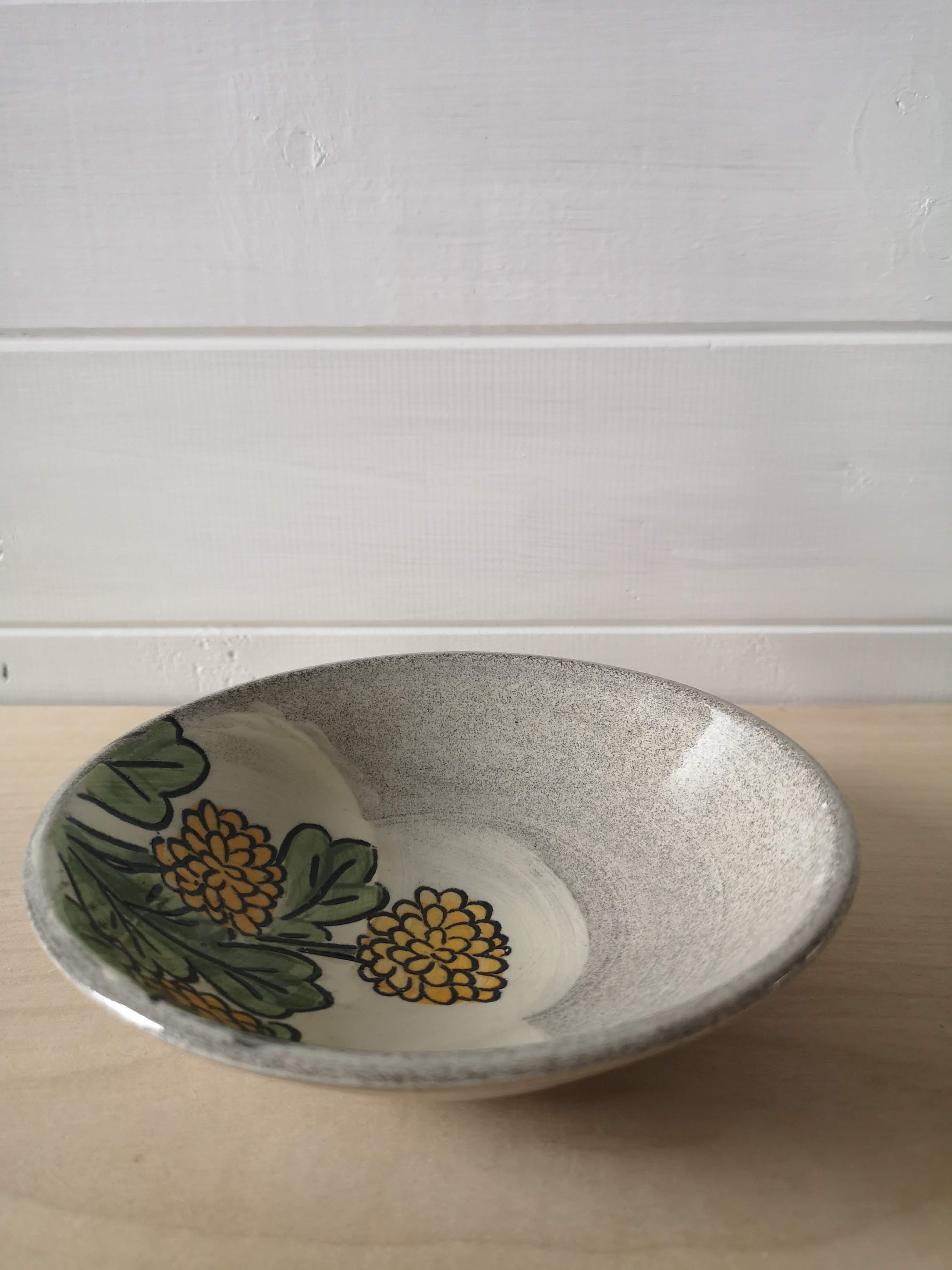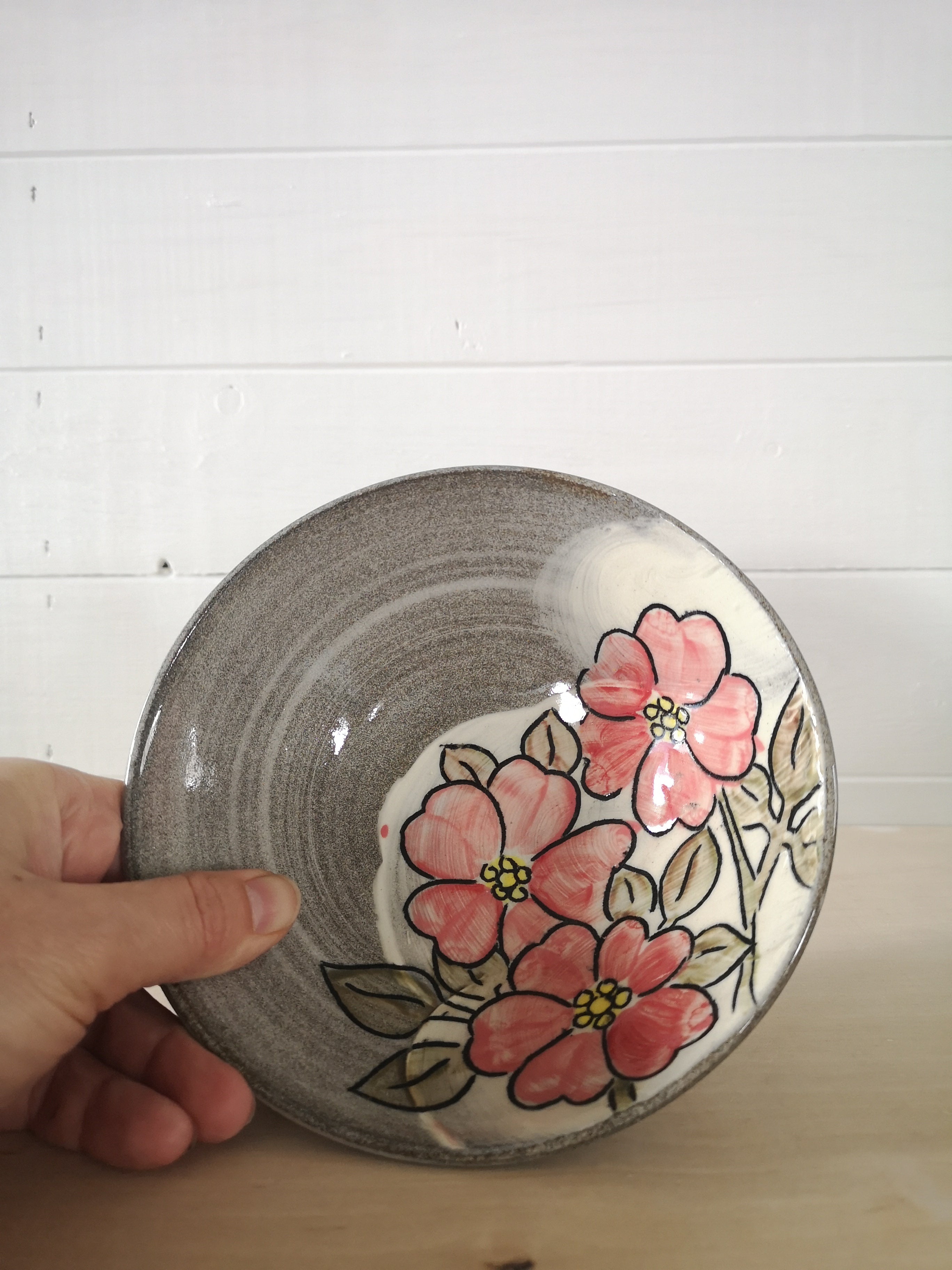 These grey stoneware bowls are hand decorated with bright flowers. They’re about 5 inches wide and two inches tall.
