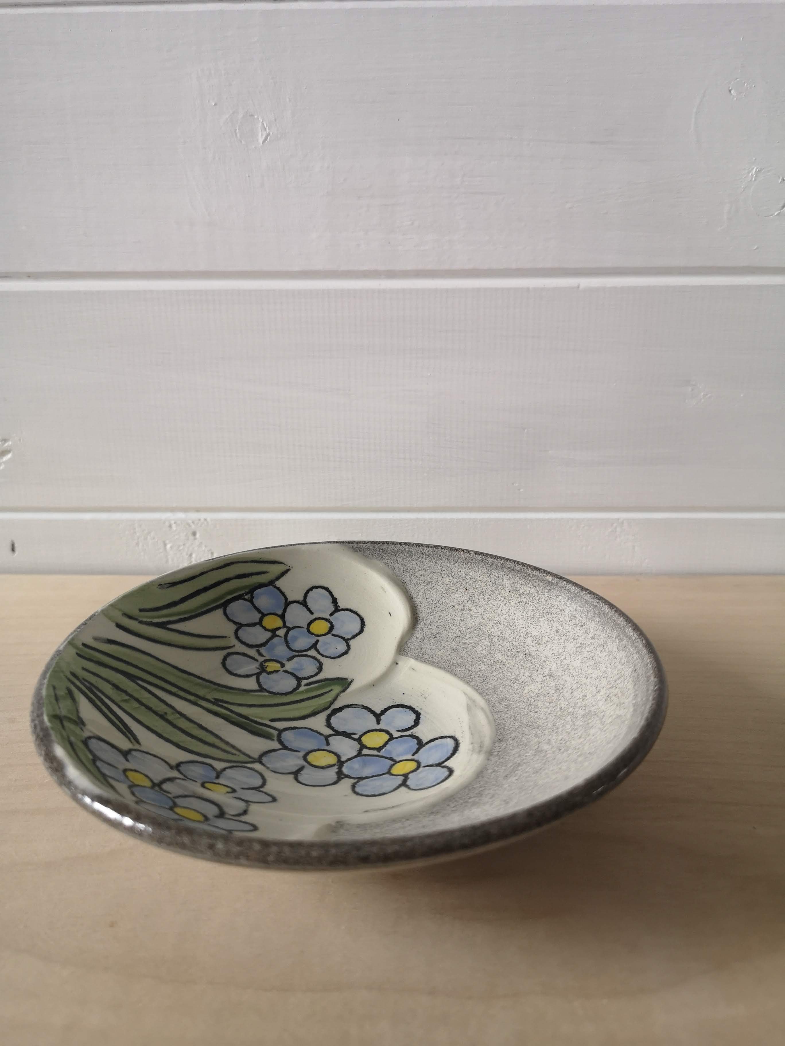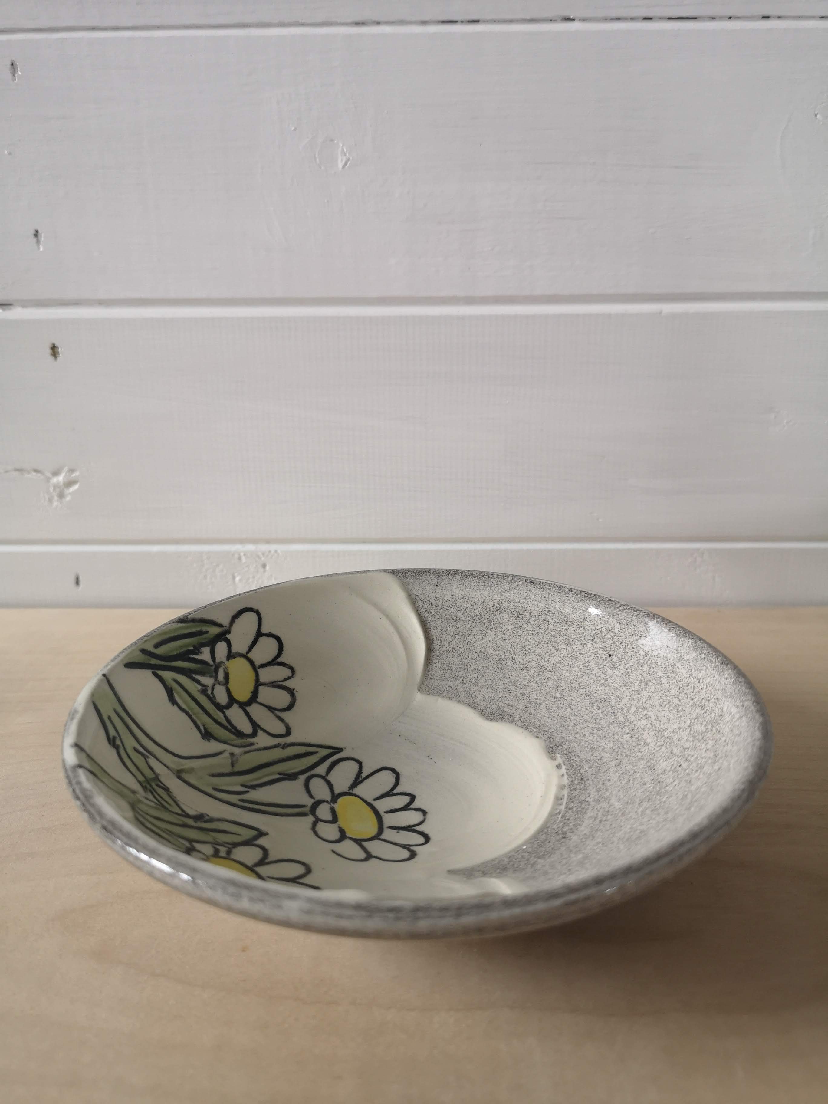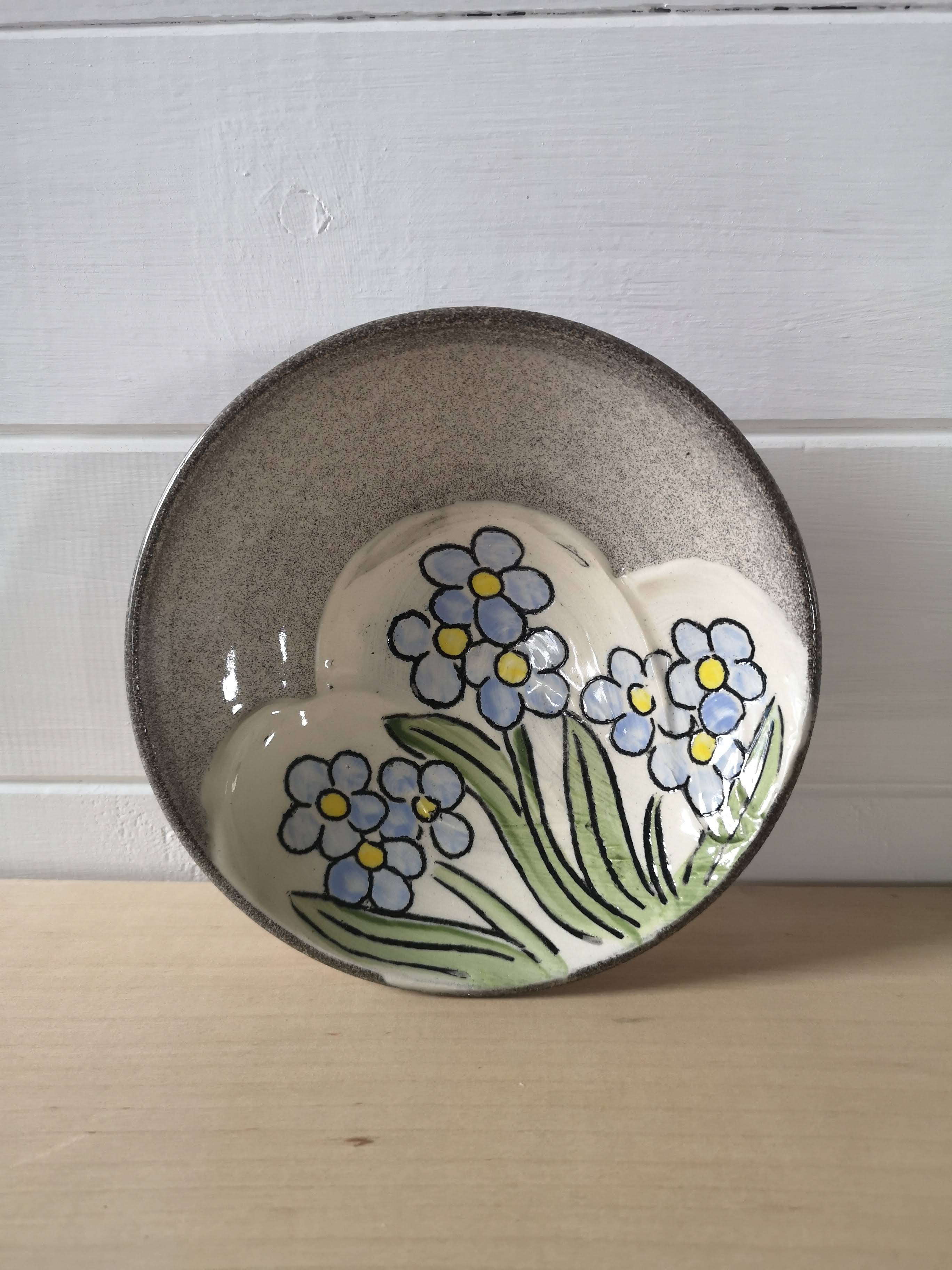 These grey stoneware bowls are hand decorated with bright flowers. They’re about 5 inches wide and two inches tall.