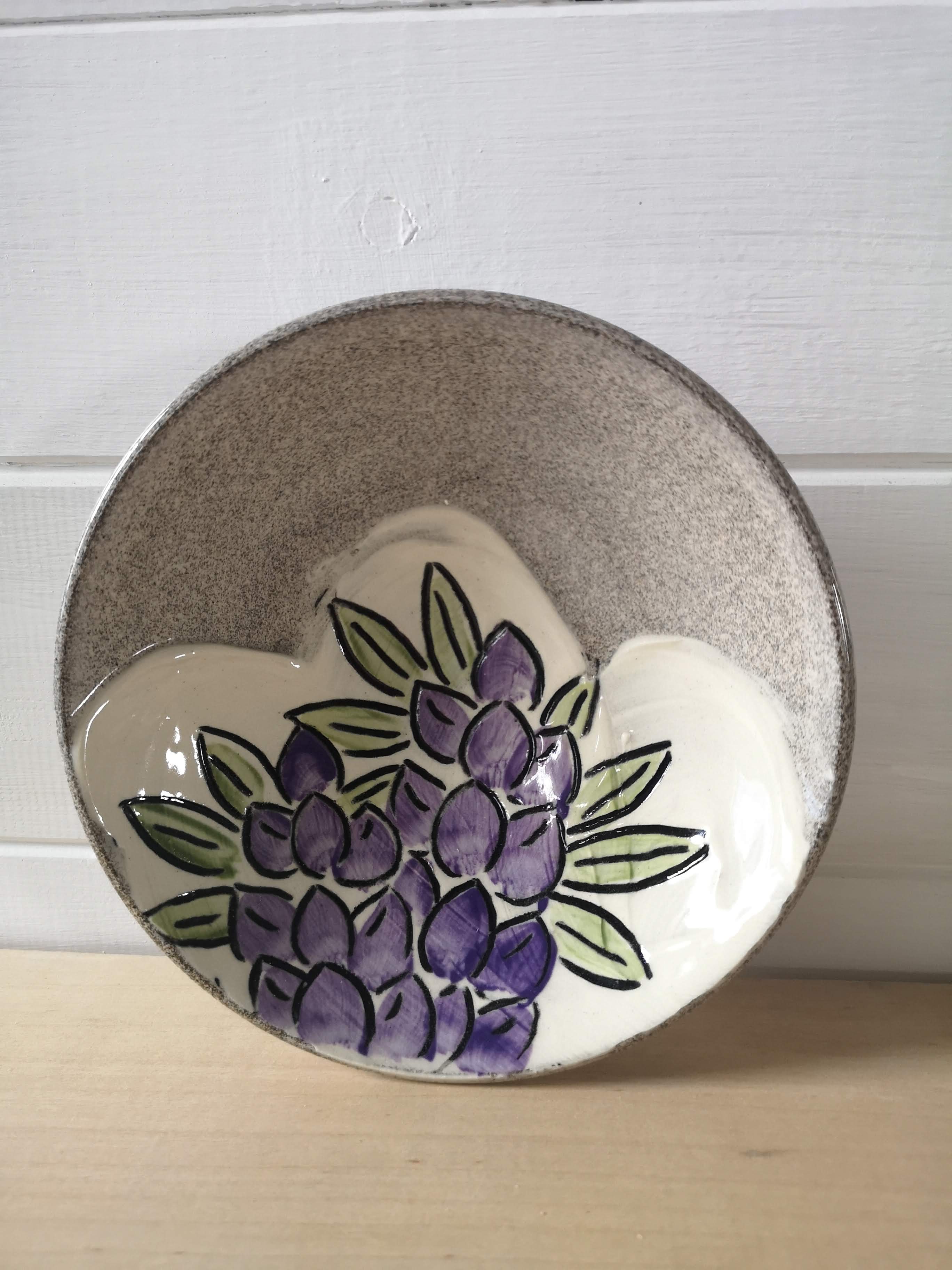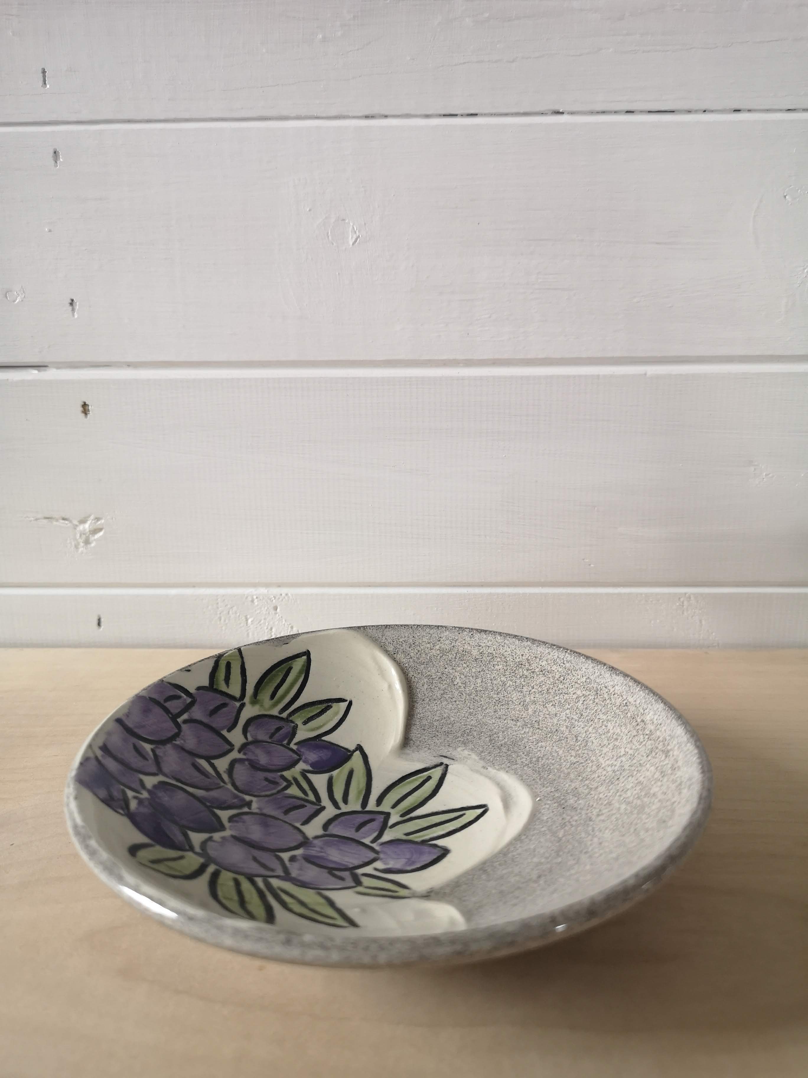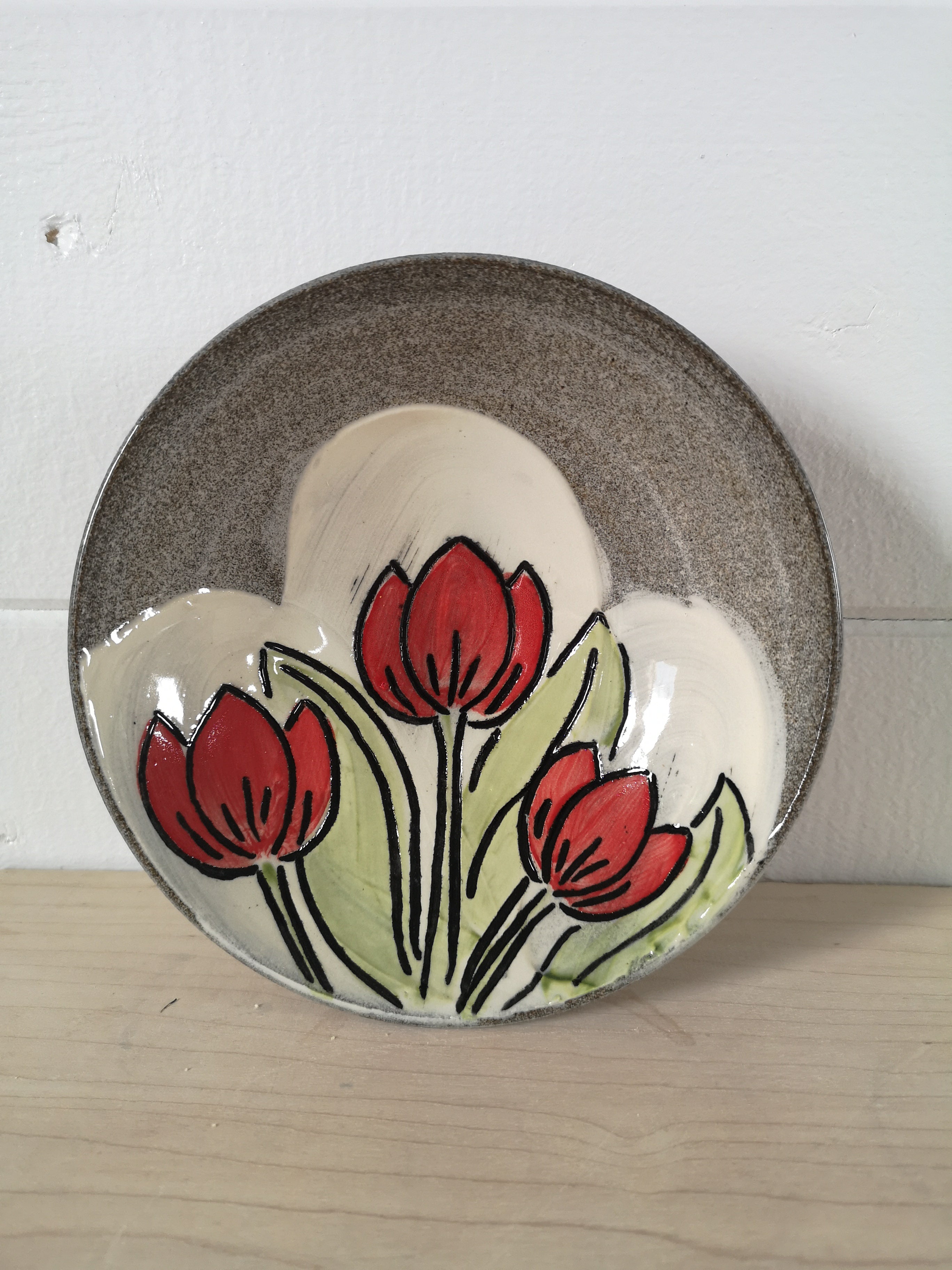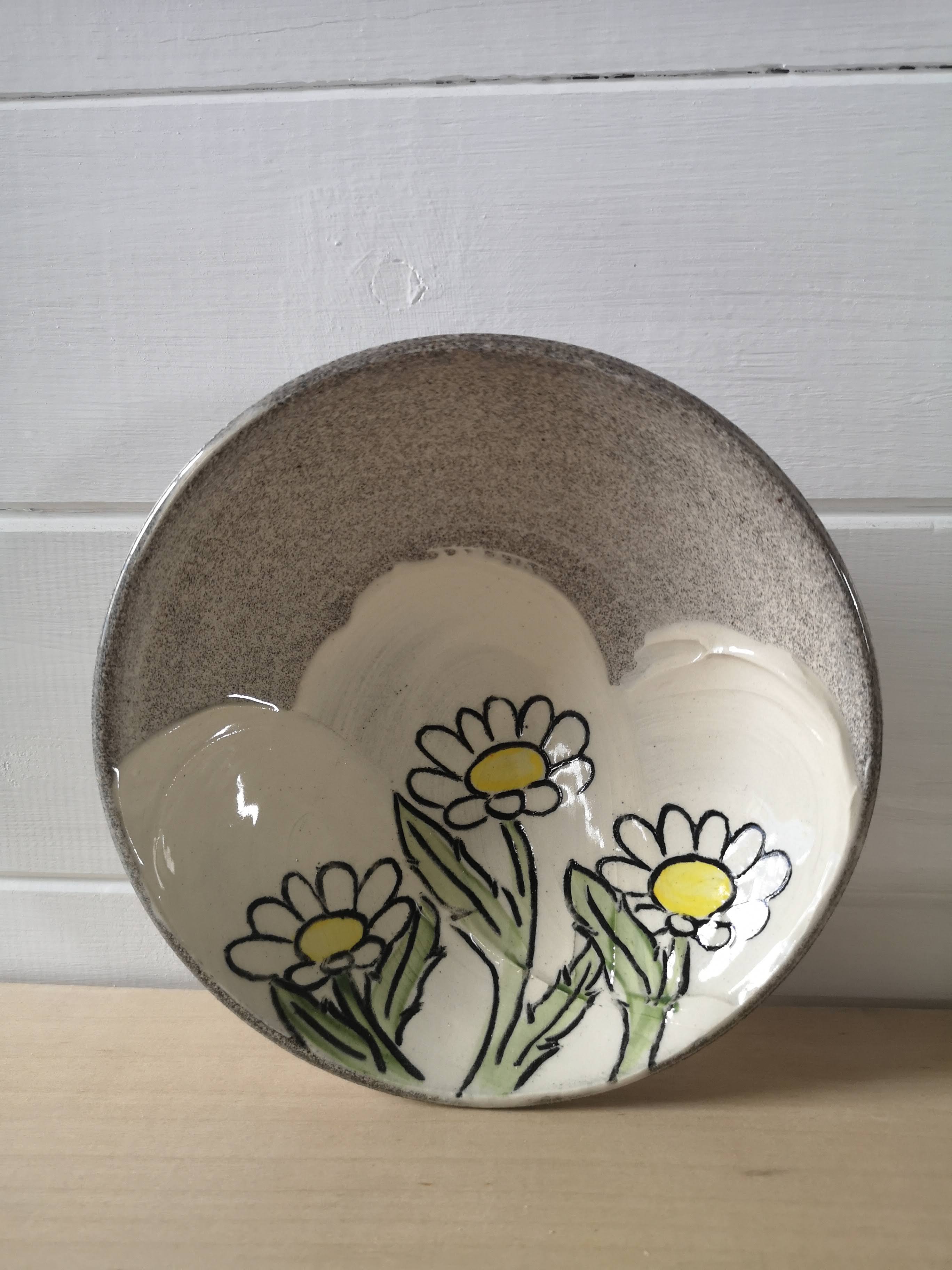 These grey stoneware bowls are hand decorated with bright flowers. They’re about 5 inches wide and two inches tall.