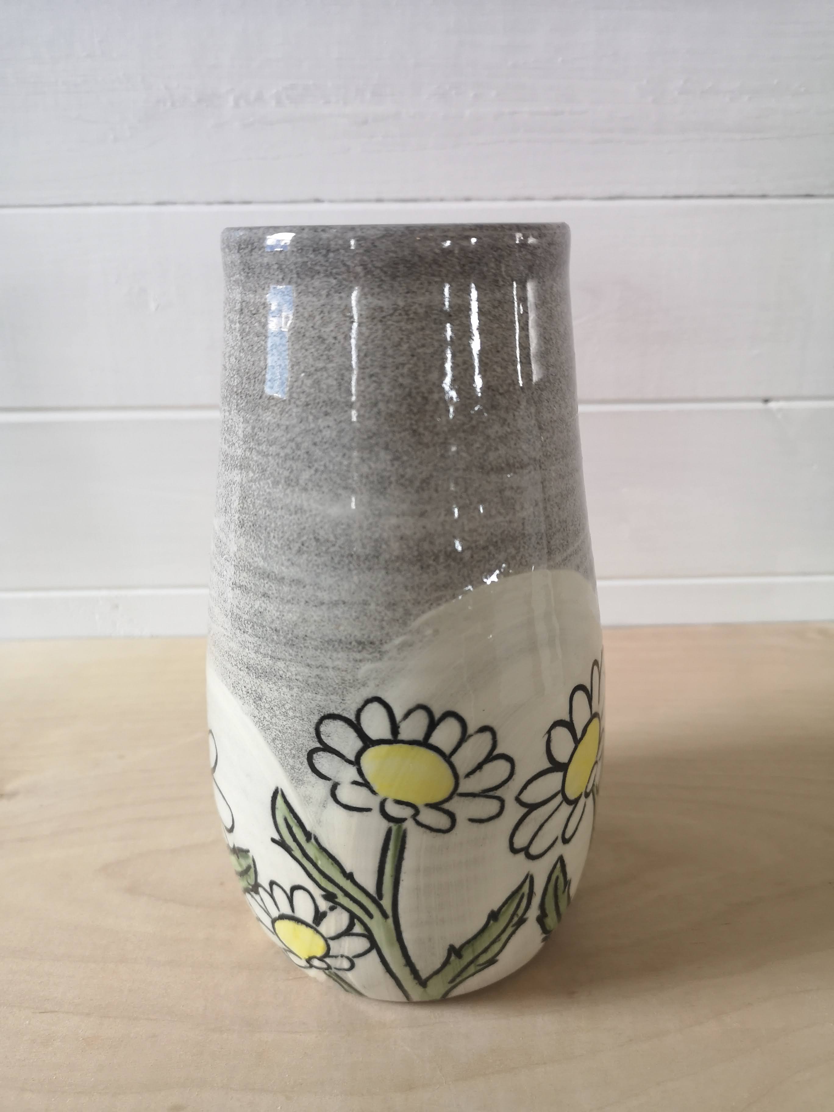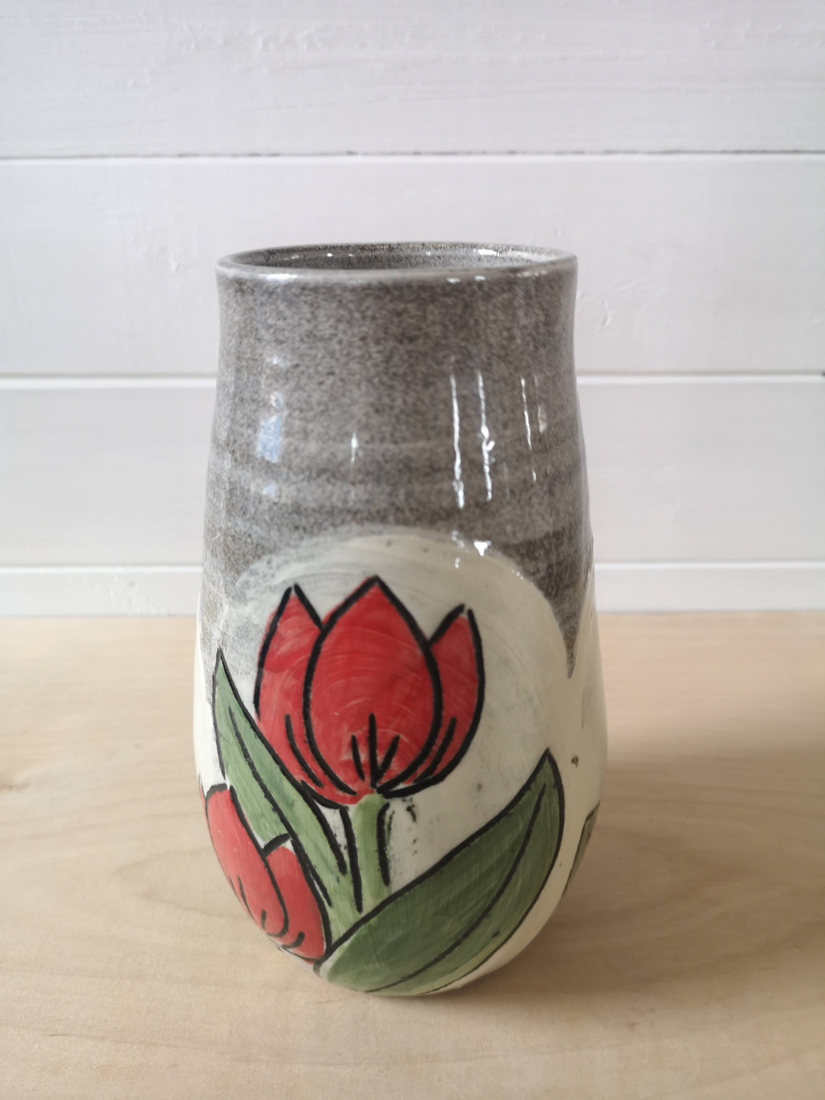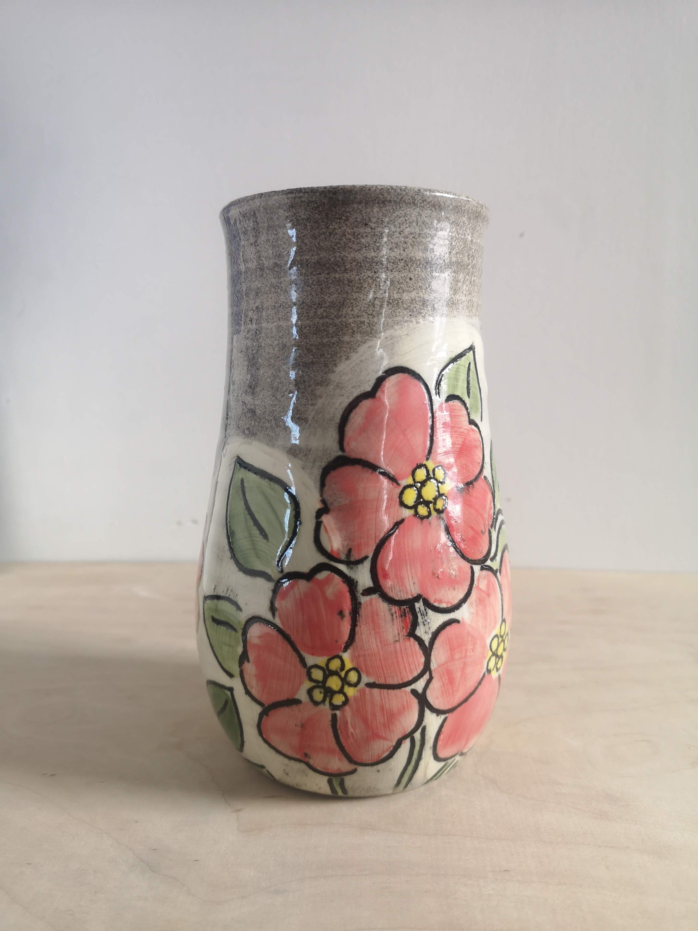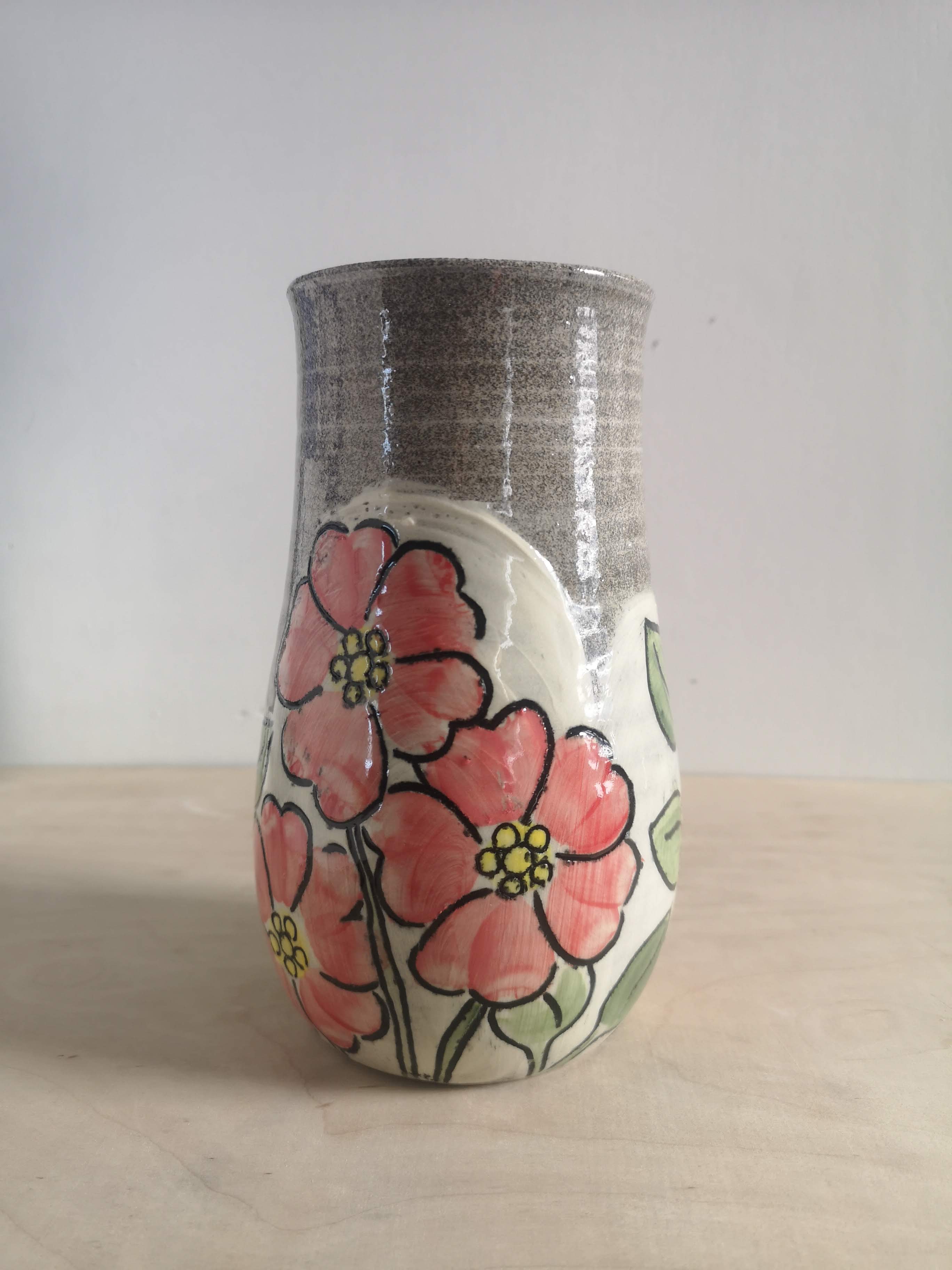 This handthrown grey stoneware vase is hand decorated with bright flowers. It's about 8 inches tall.