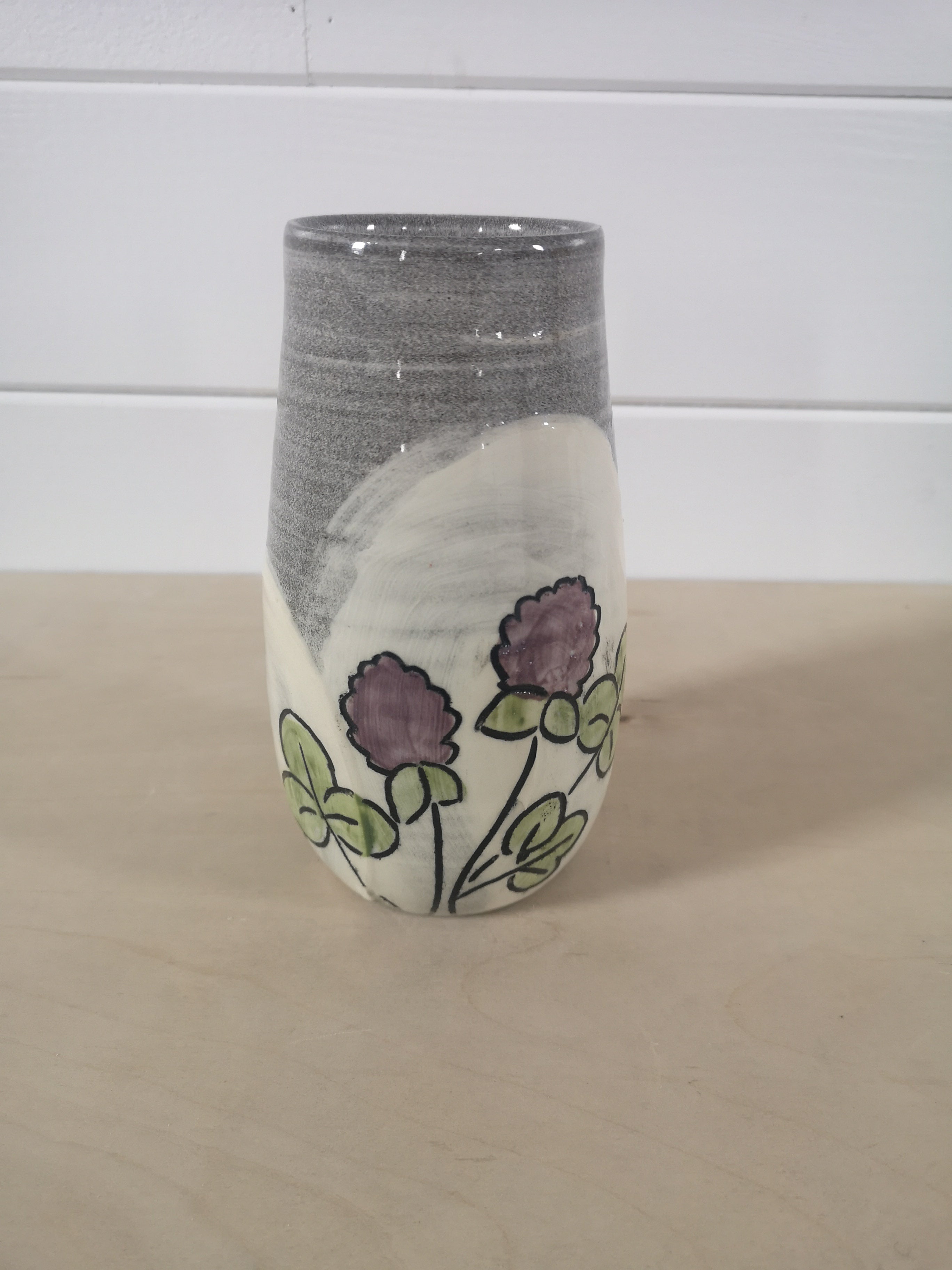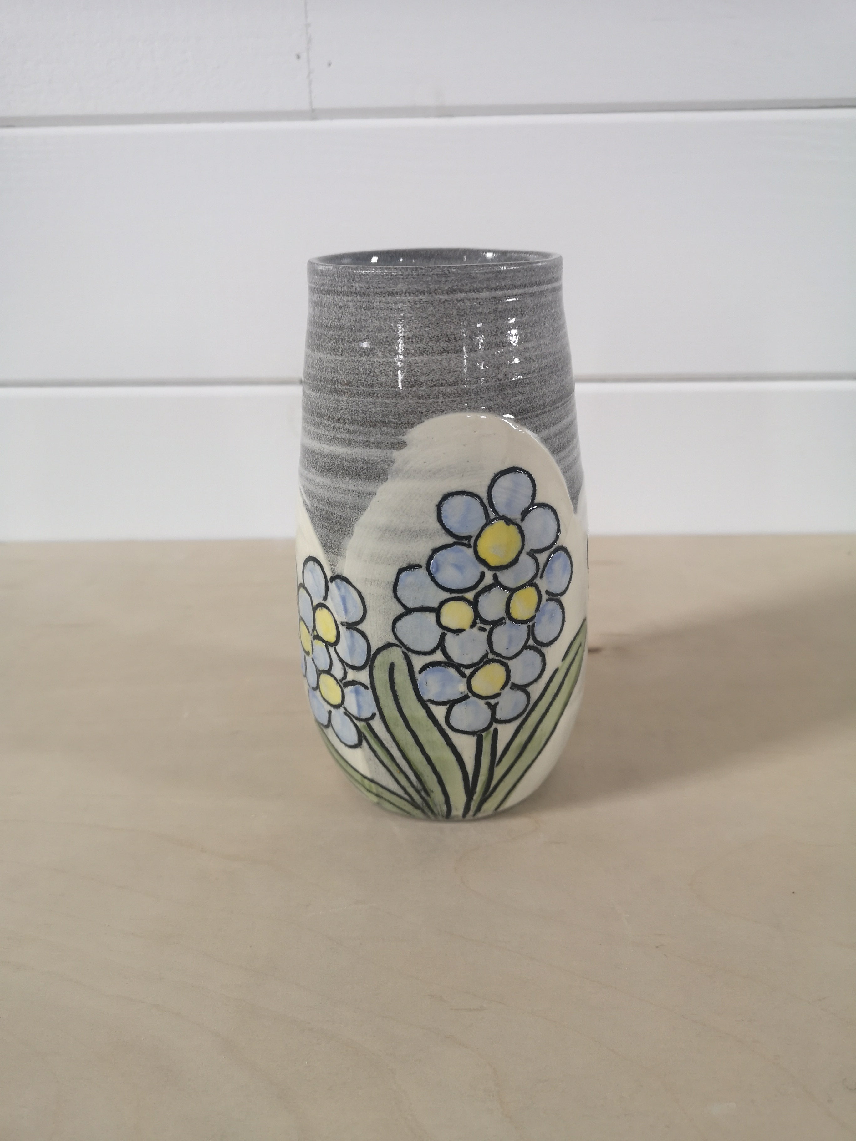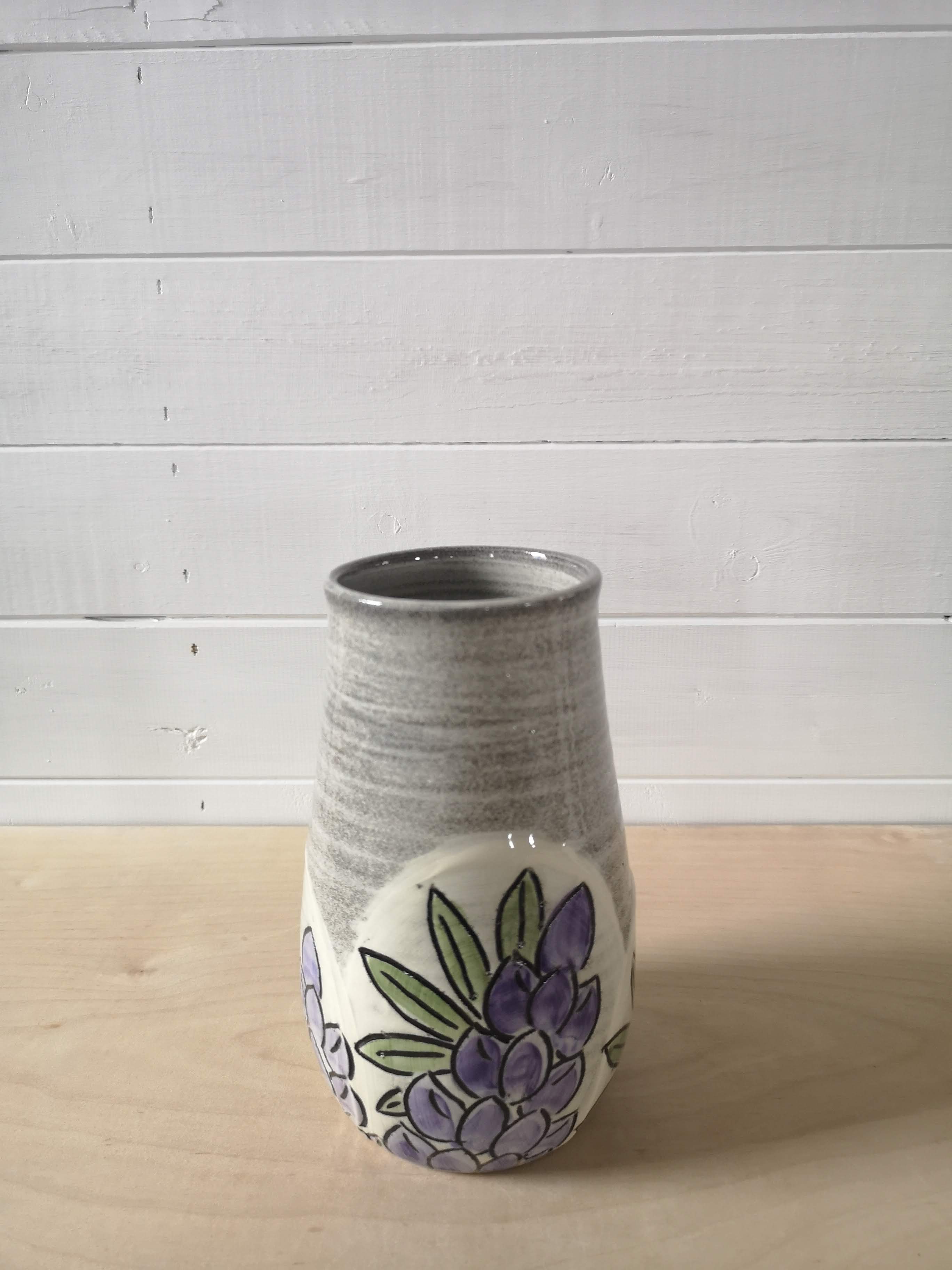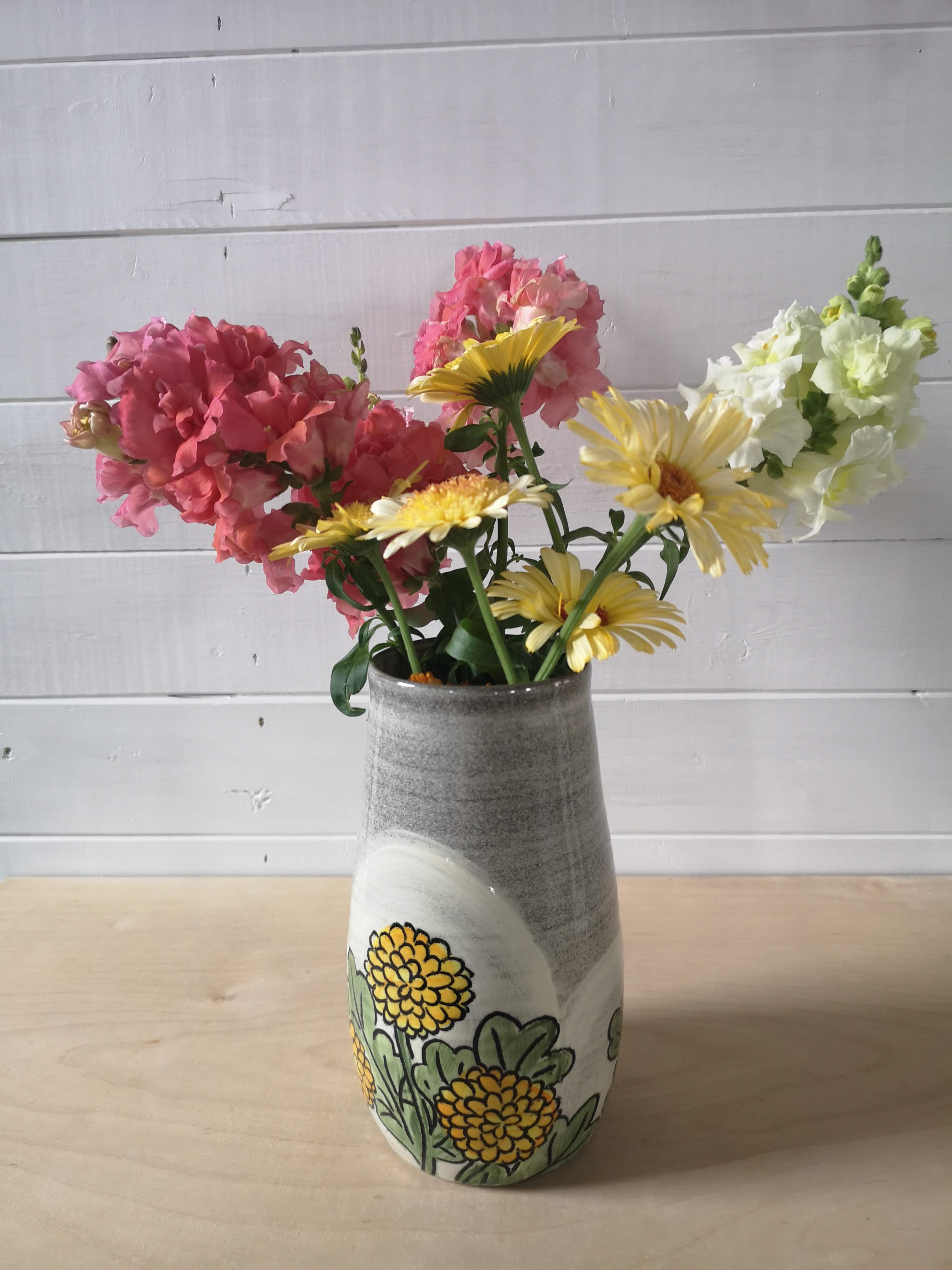 This handthrown grey stoneware vase is hand decorated with bright flowers. It's about 8 inches tall.