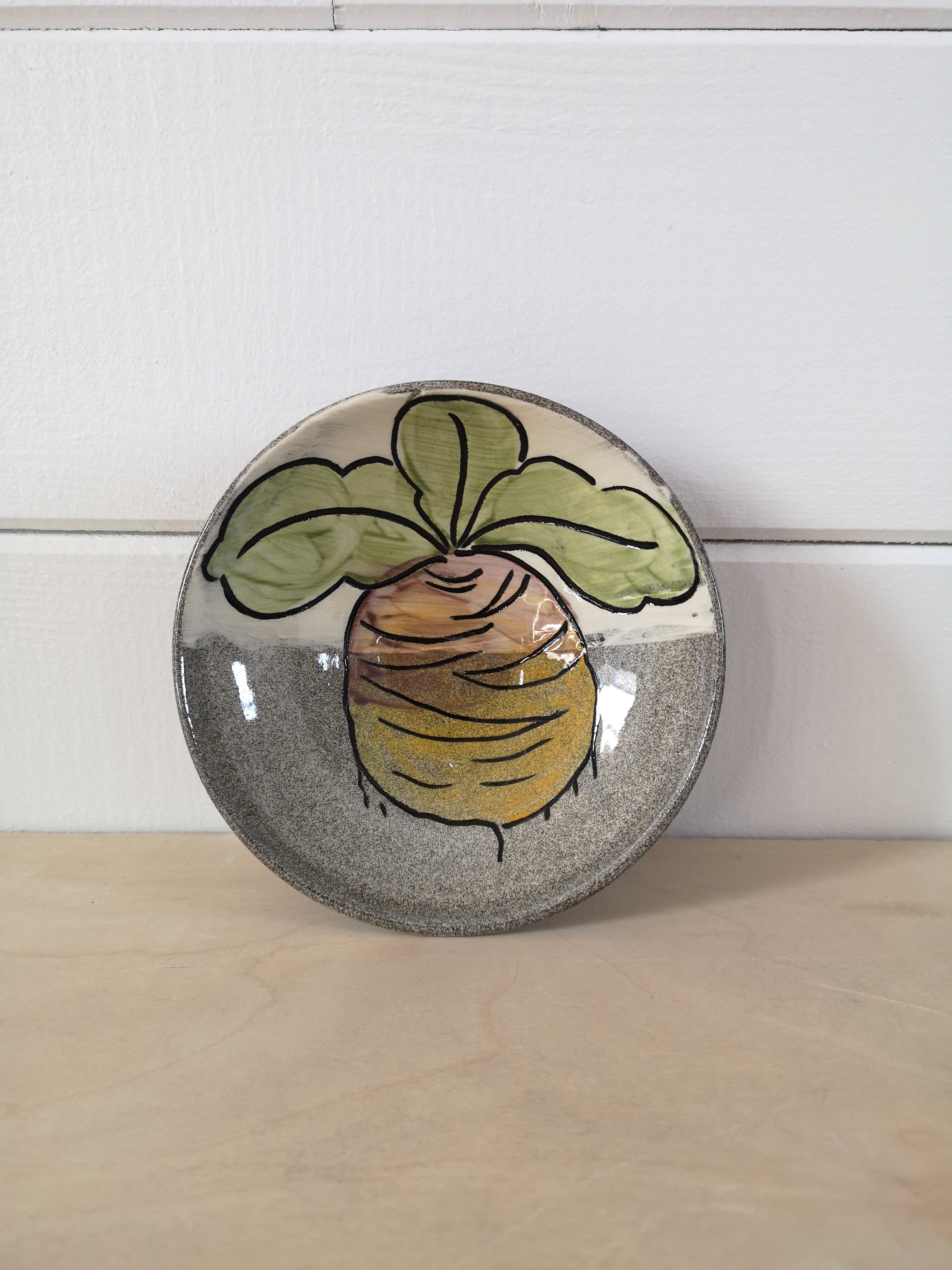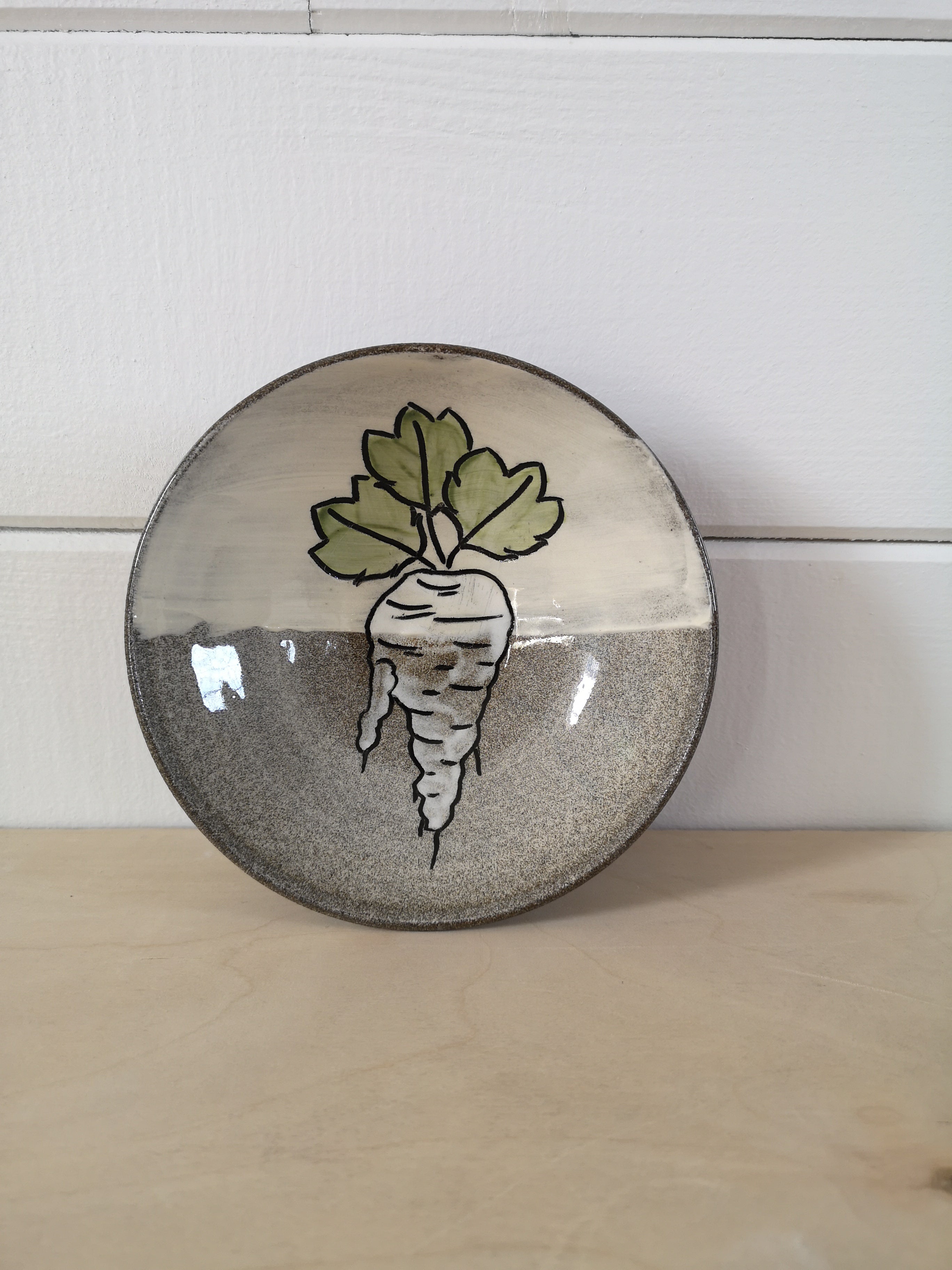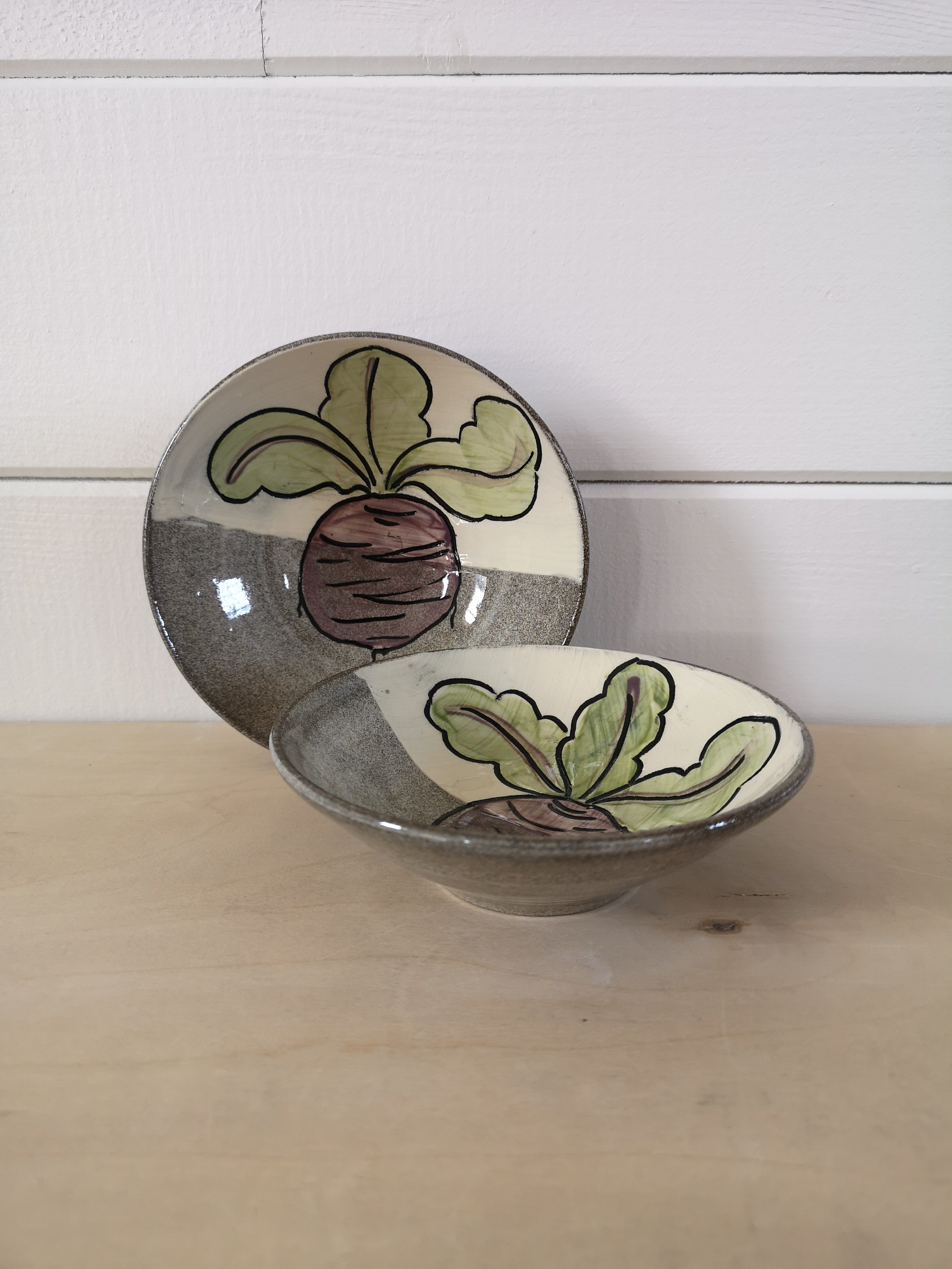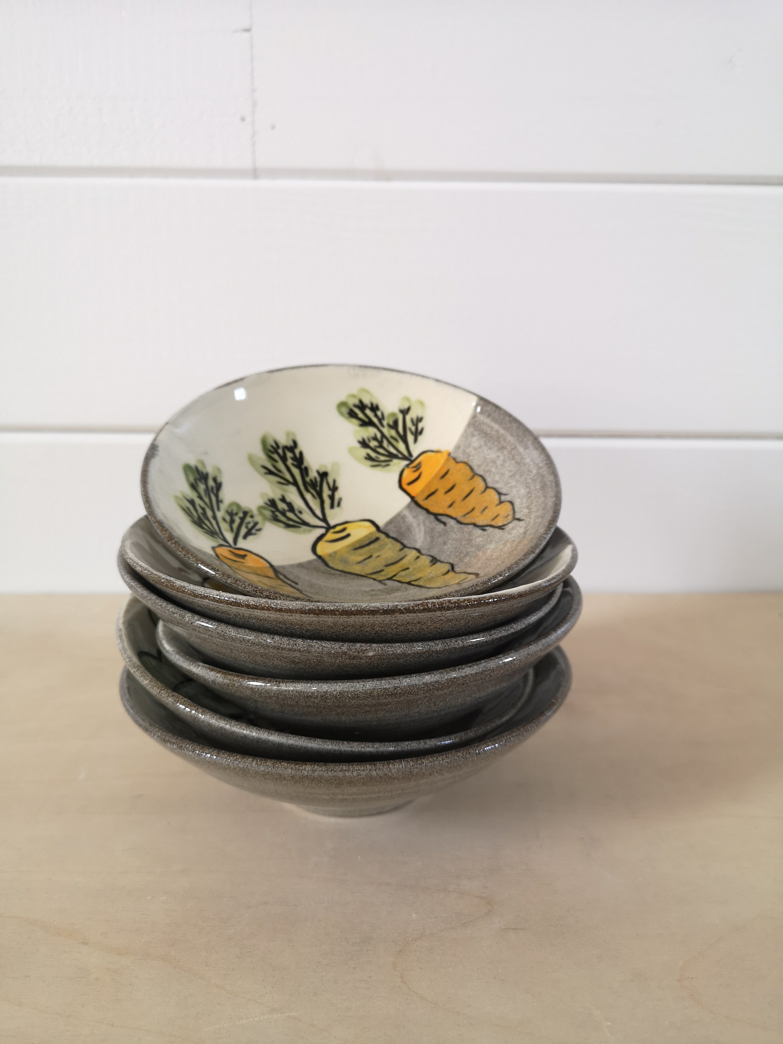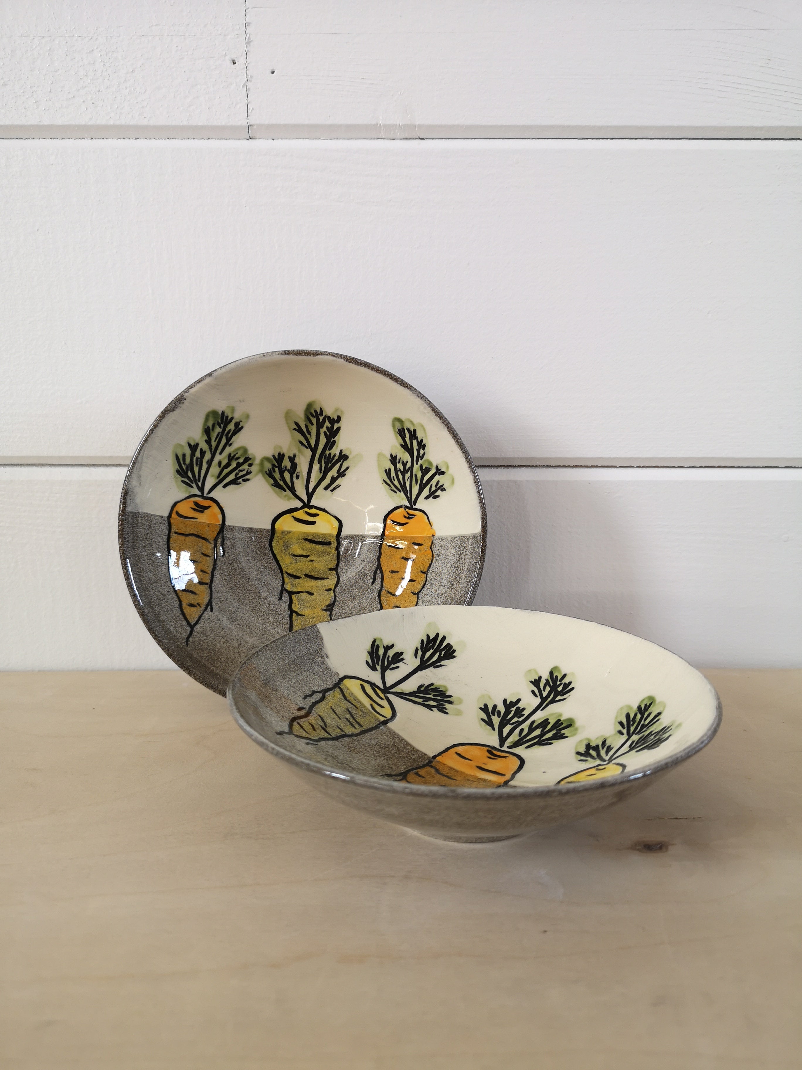 These desert bowls are hand thrown and hand illustrated with colourful vegetables.