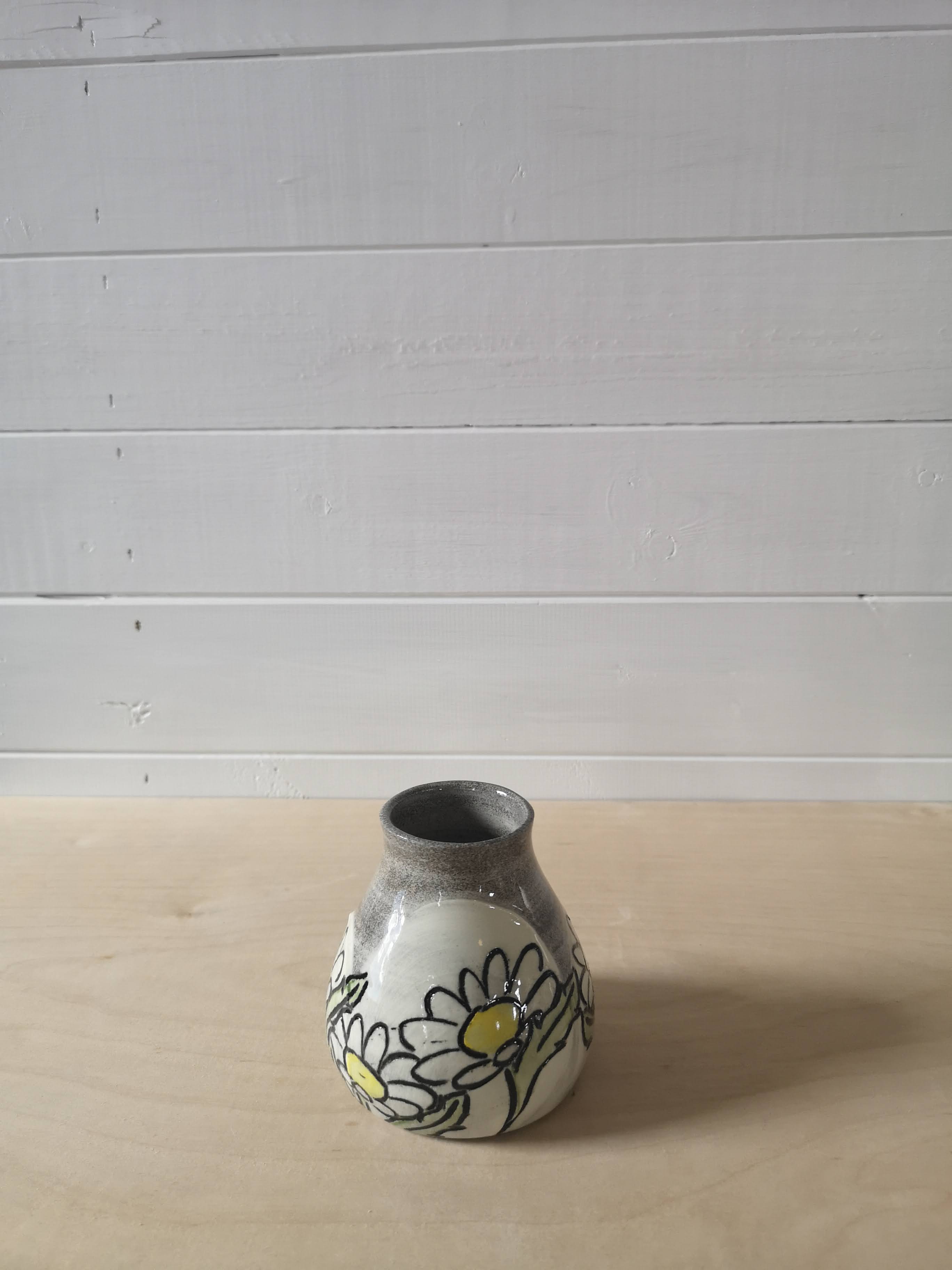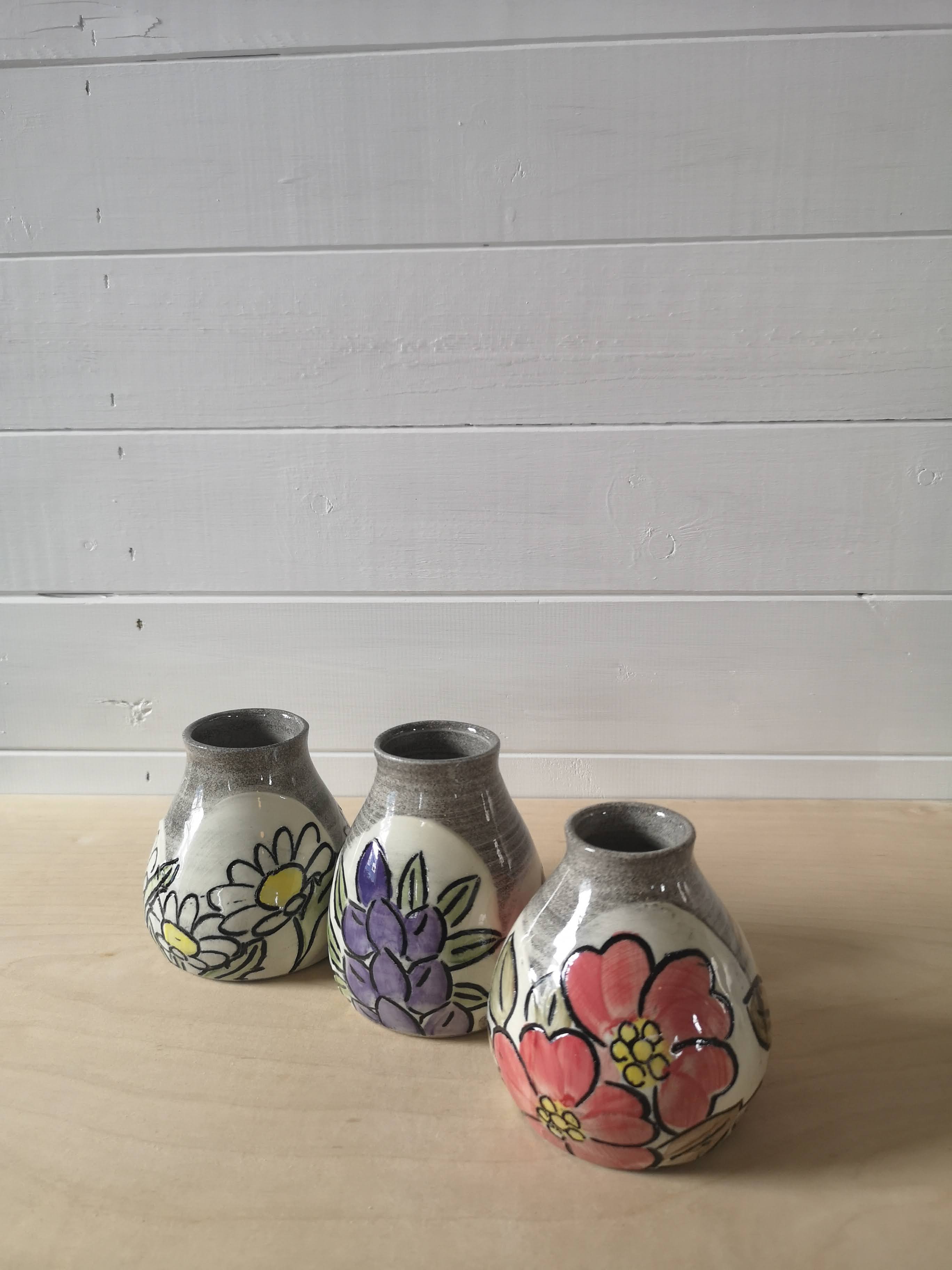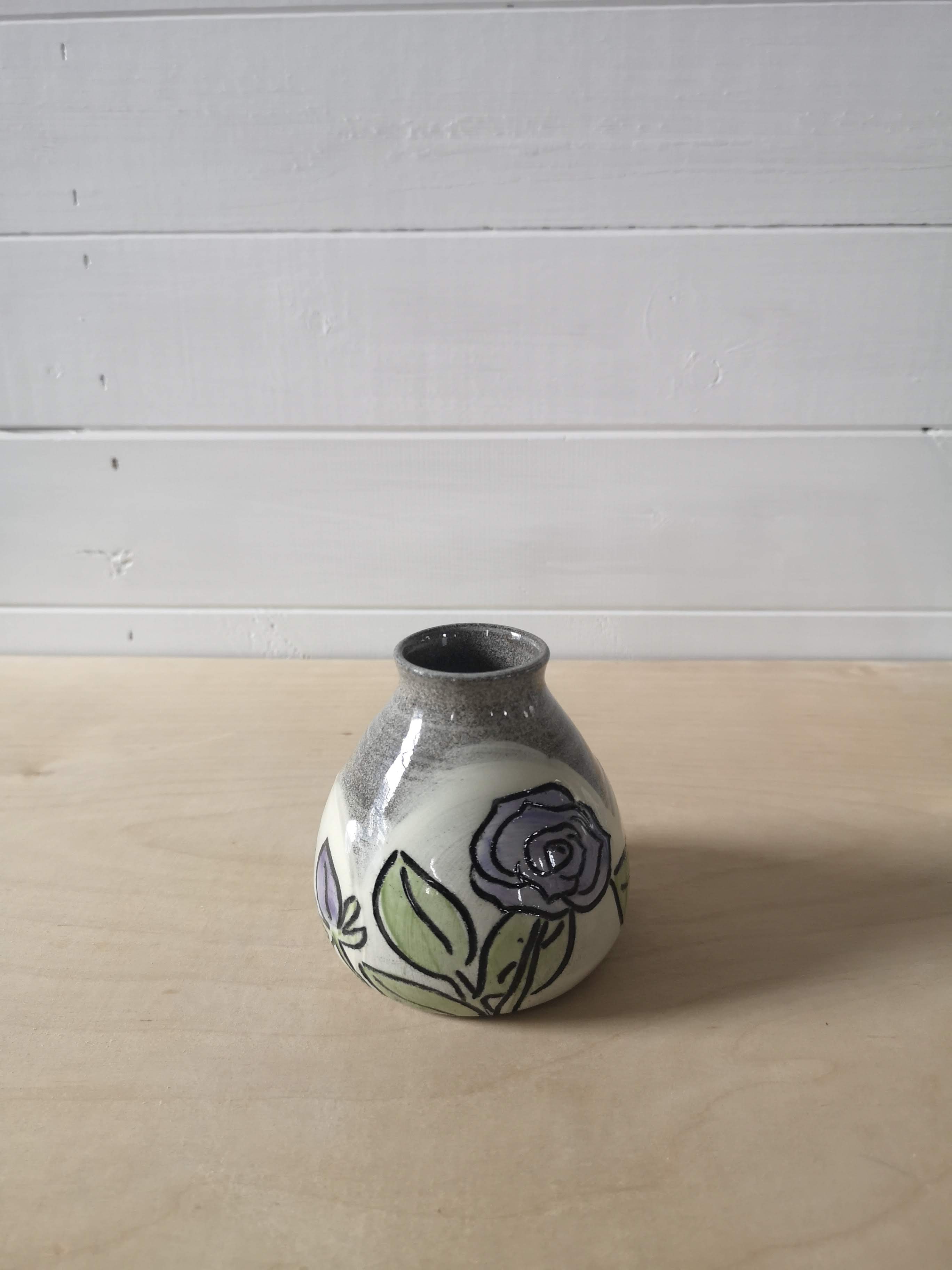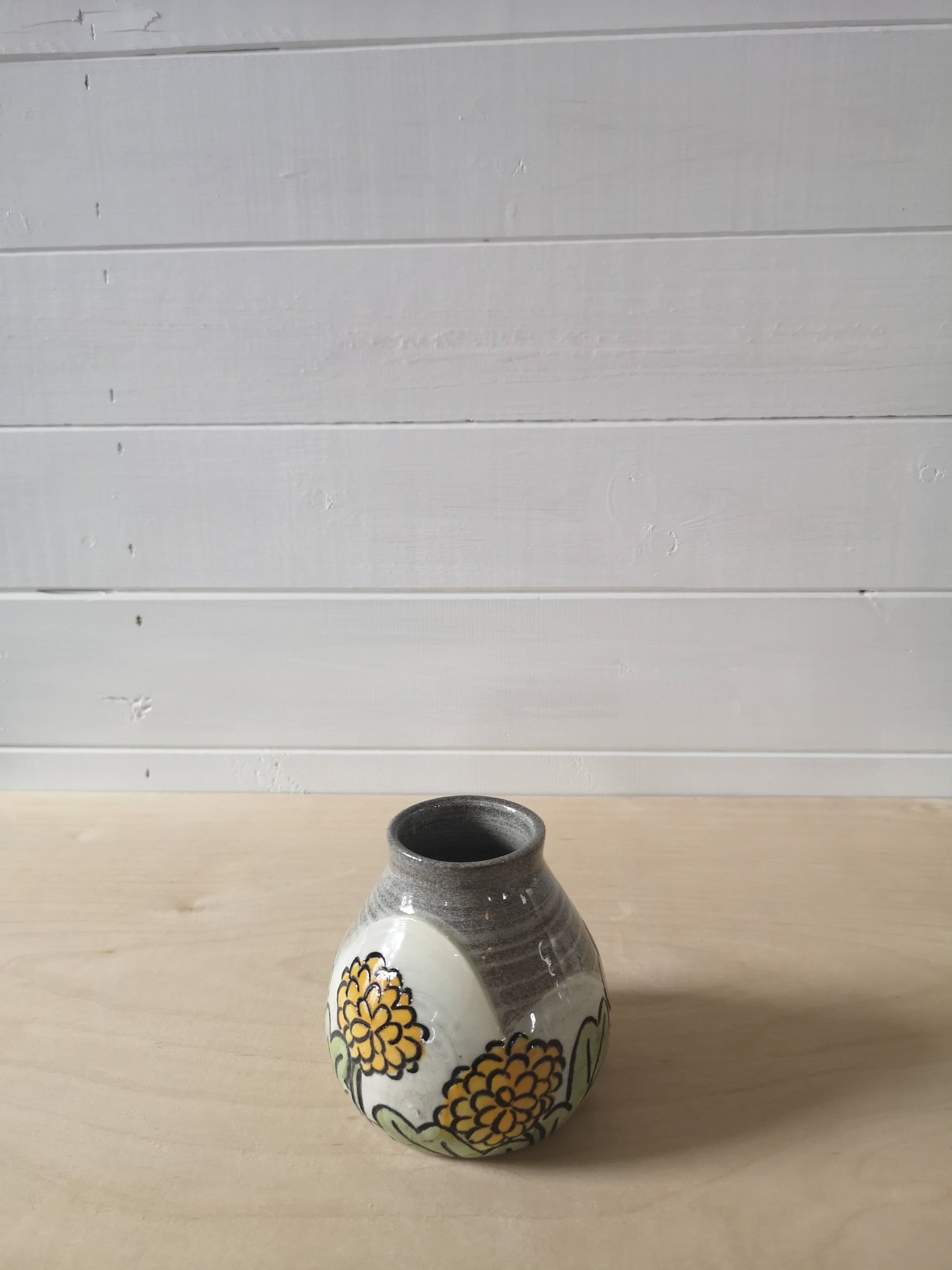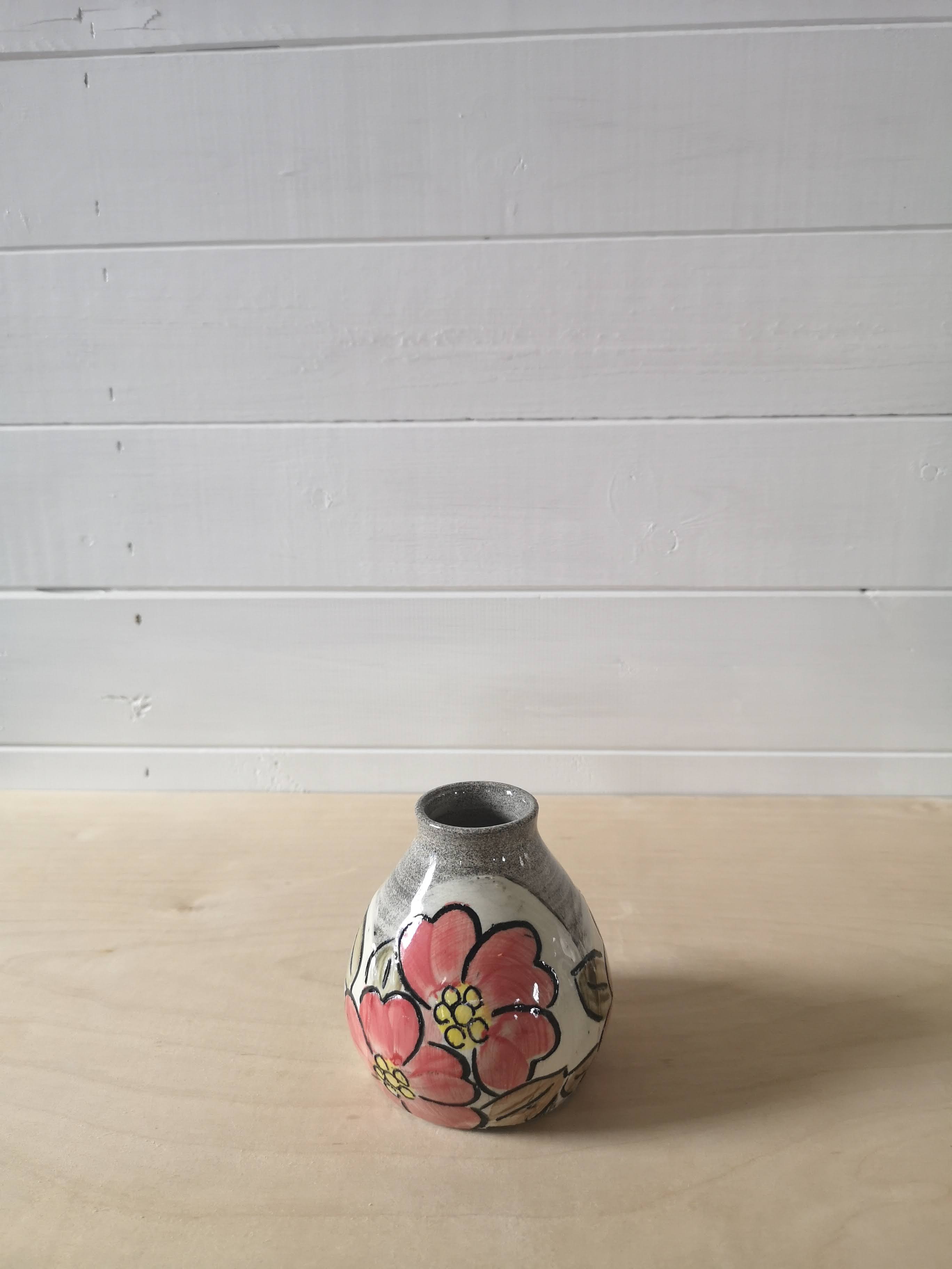 This grey stoneware vase features a round belly and is hand decorated with bright flowers. It's about 5 inches tall.