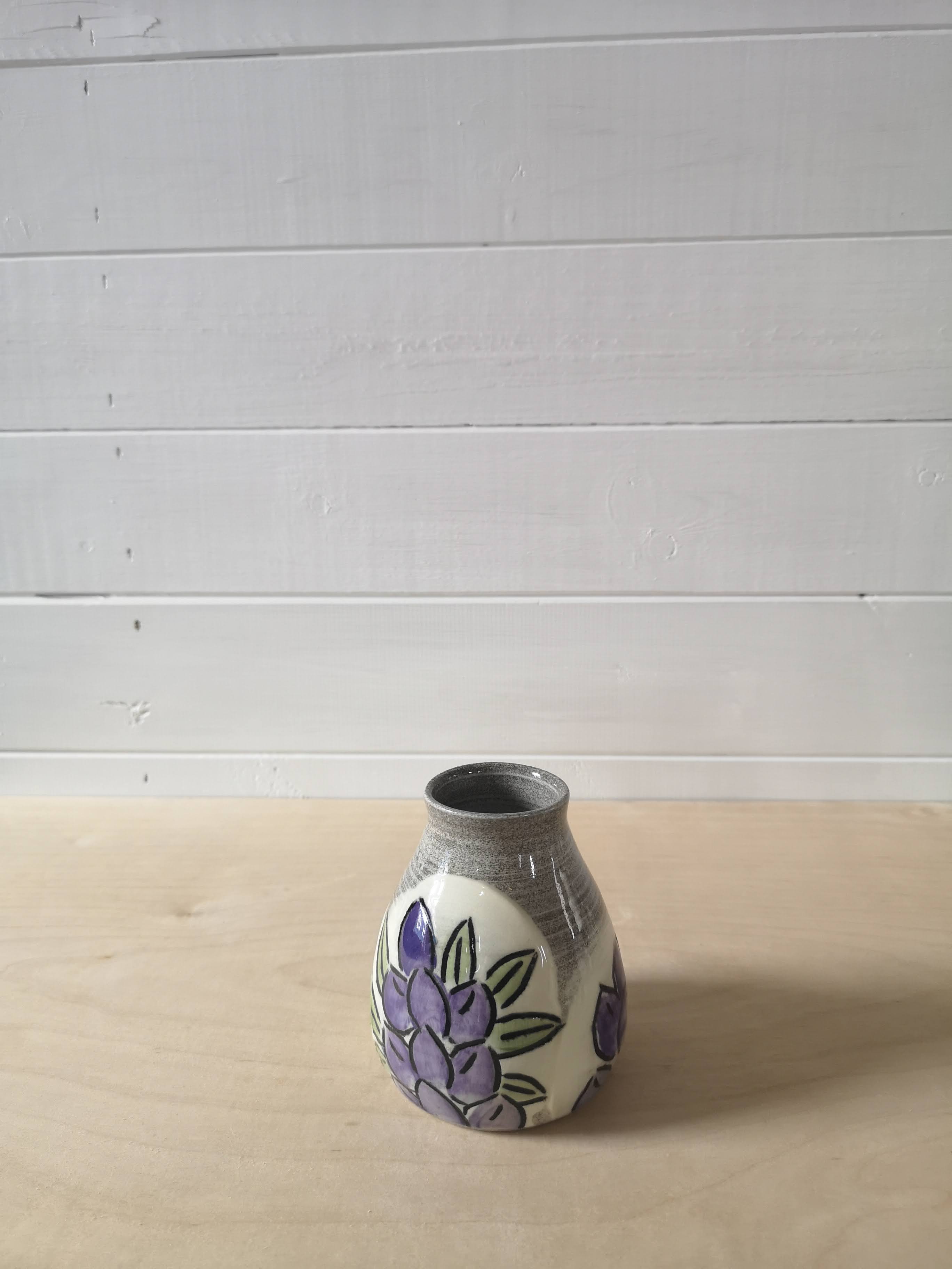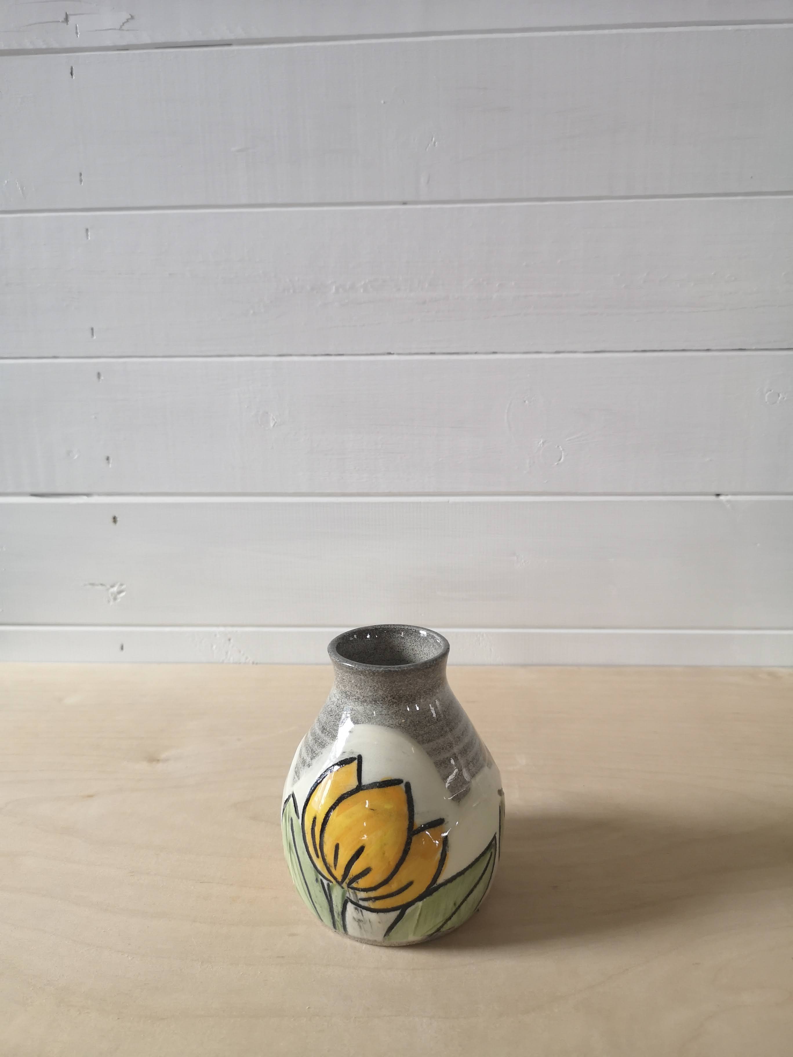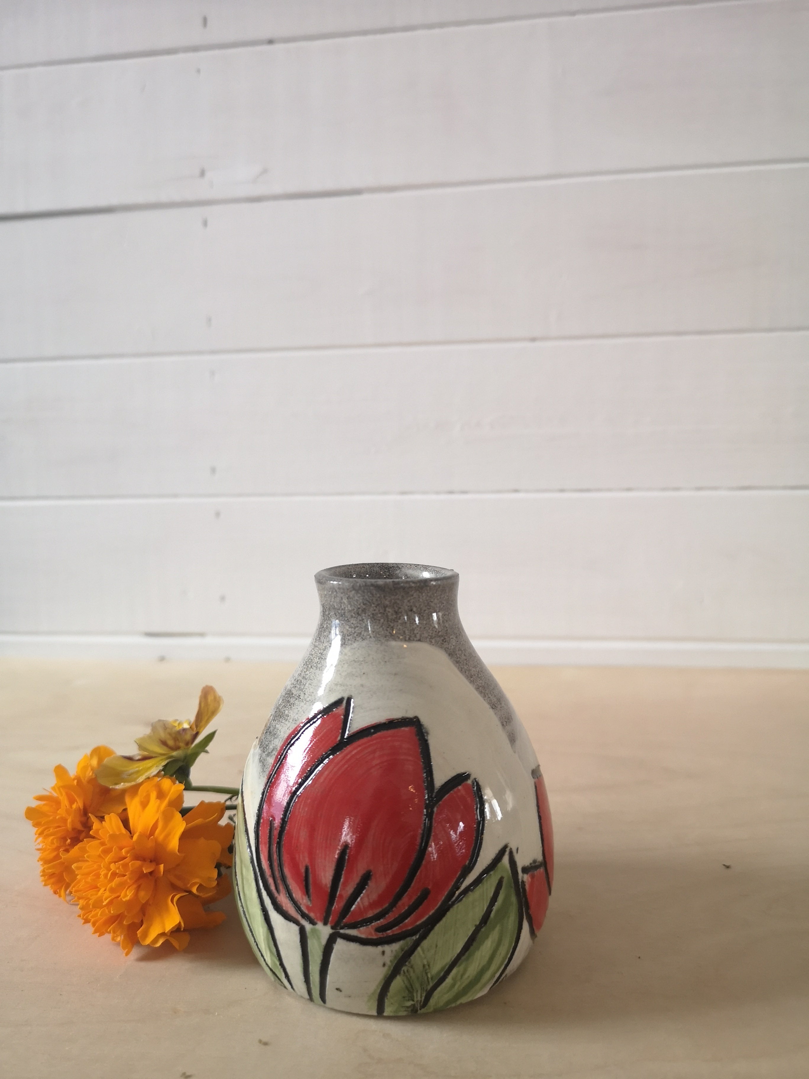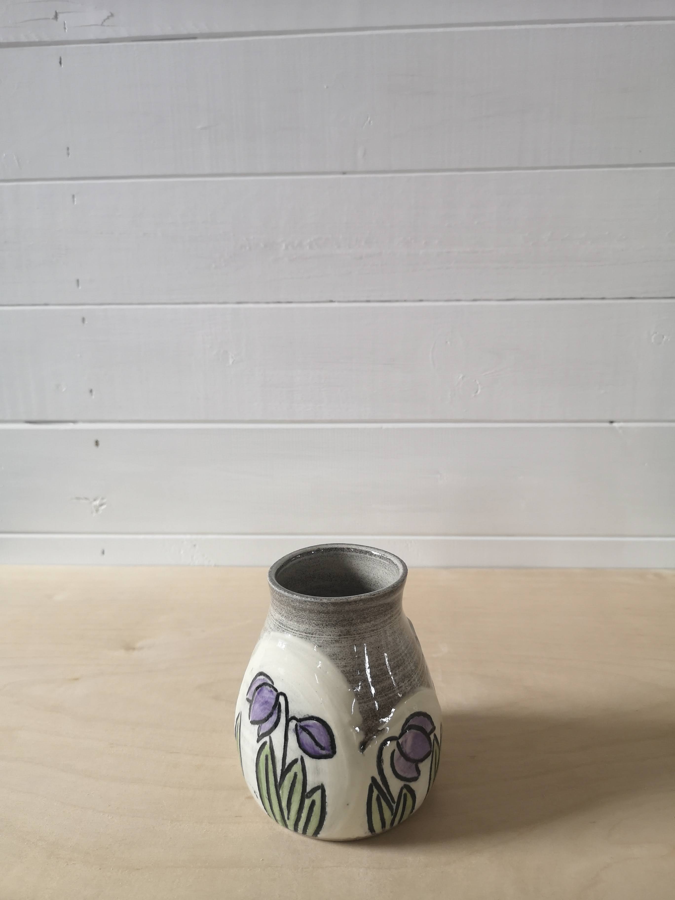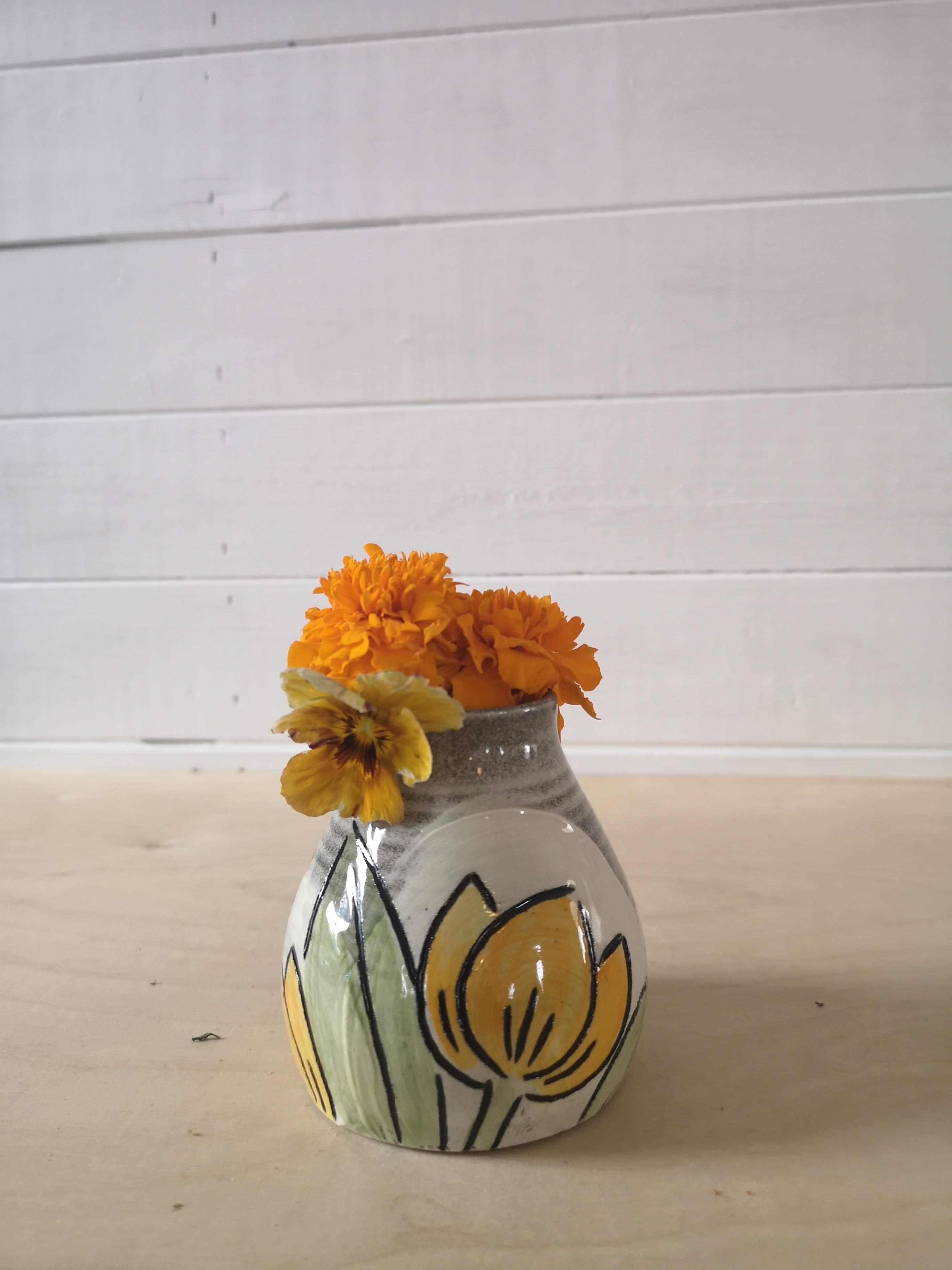 This grey stoneware vase features a round belly and is hand decorated with bright flowers. It's about 5 inches tall.