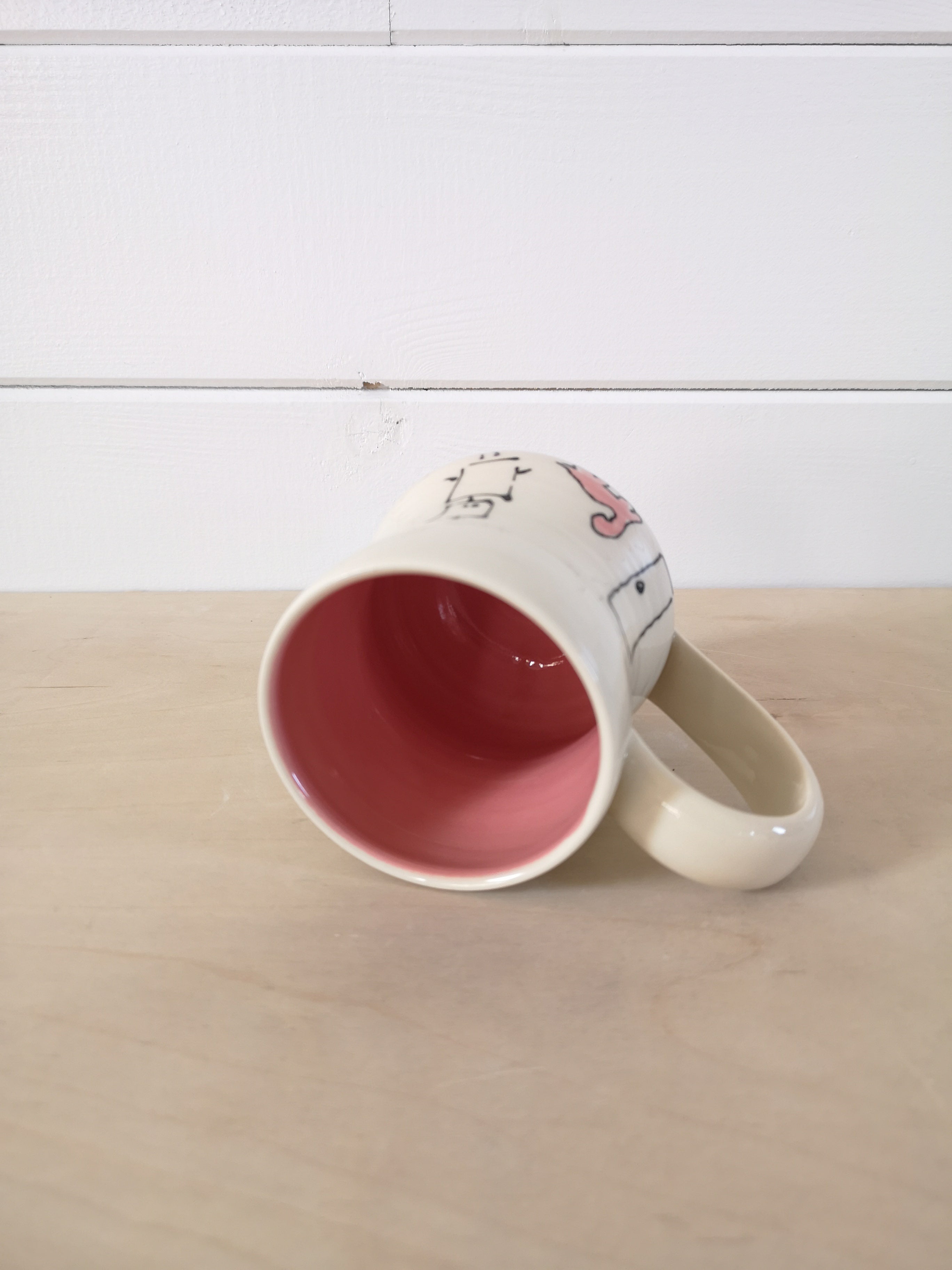 This handmade porcelain mug features a cartoon of Dinosaur standing by a door, looking over it's shoulder at Robot. It holds about 475mL/16oz. The inside is a bright pink.