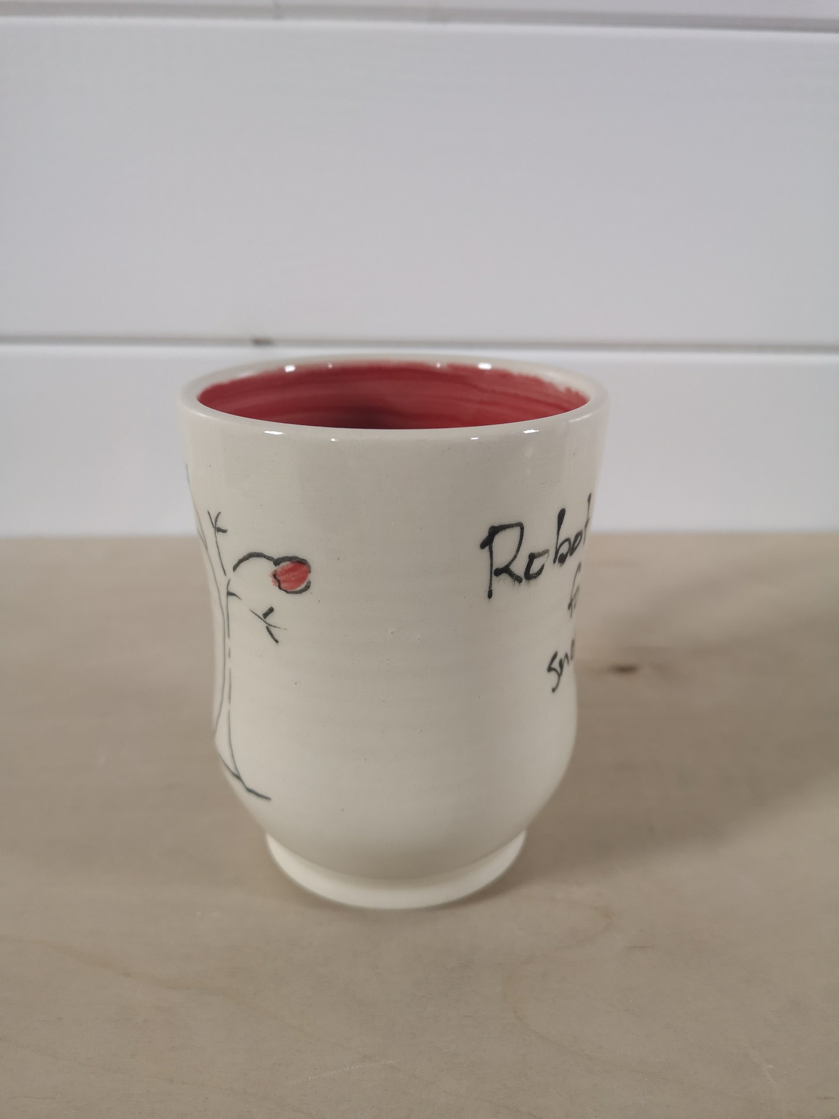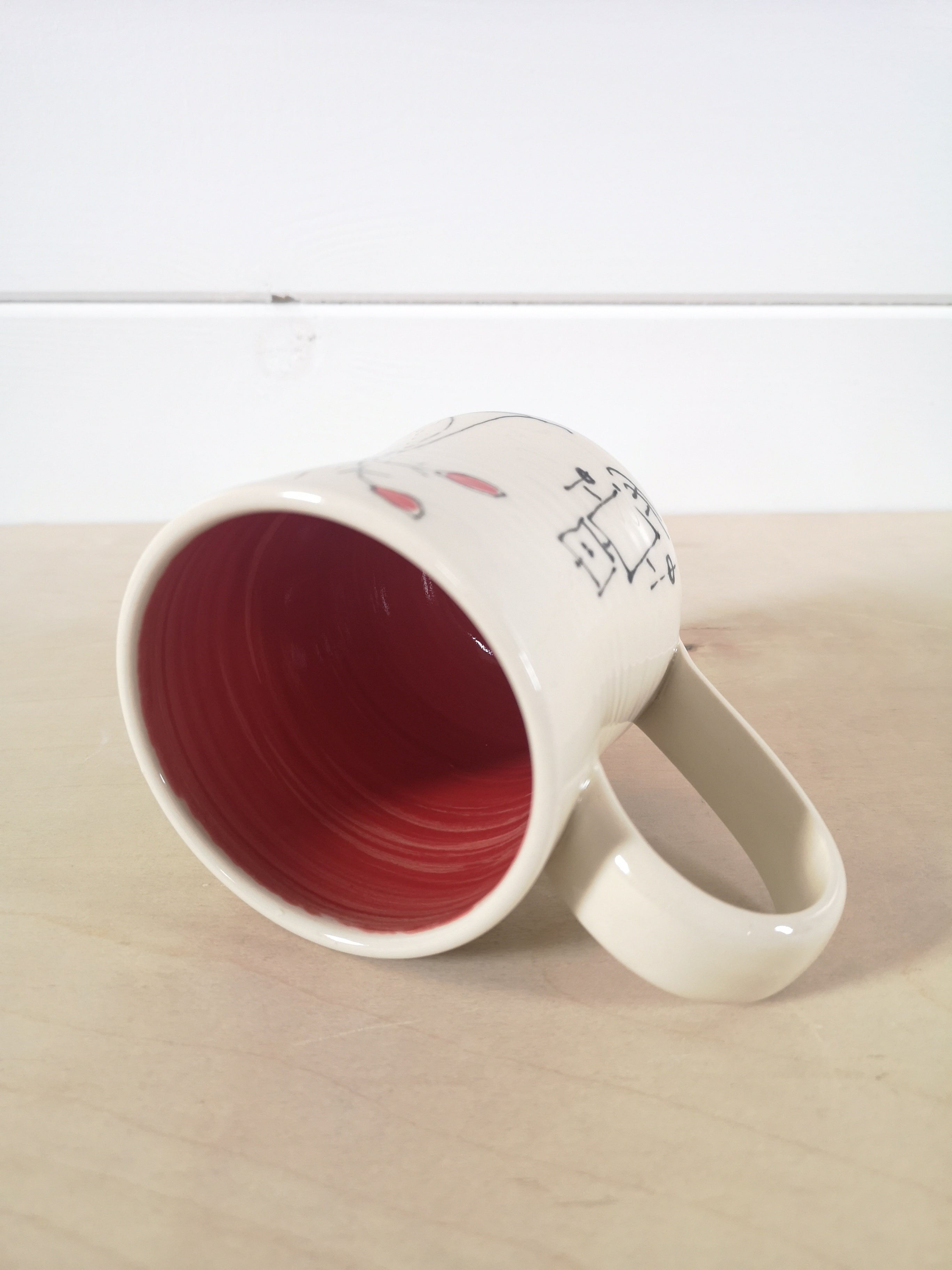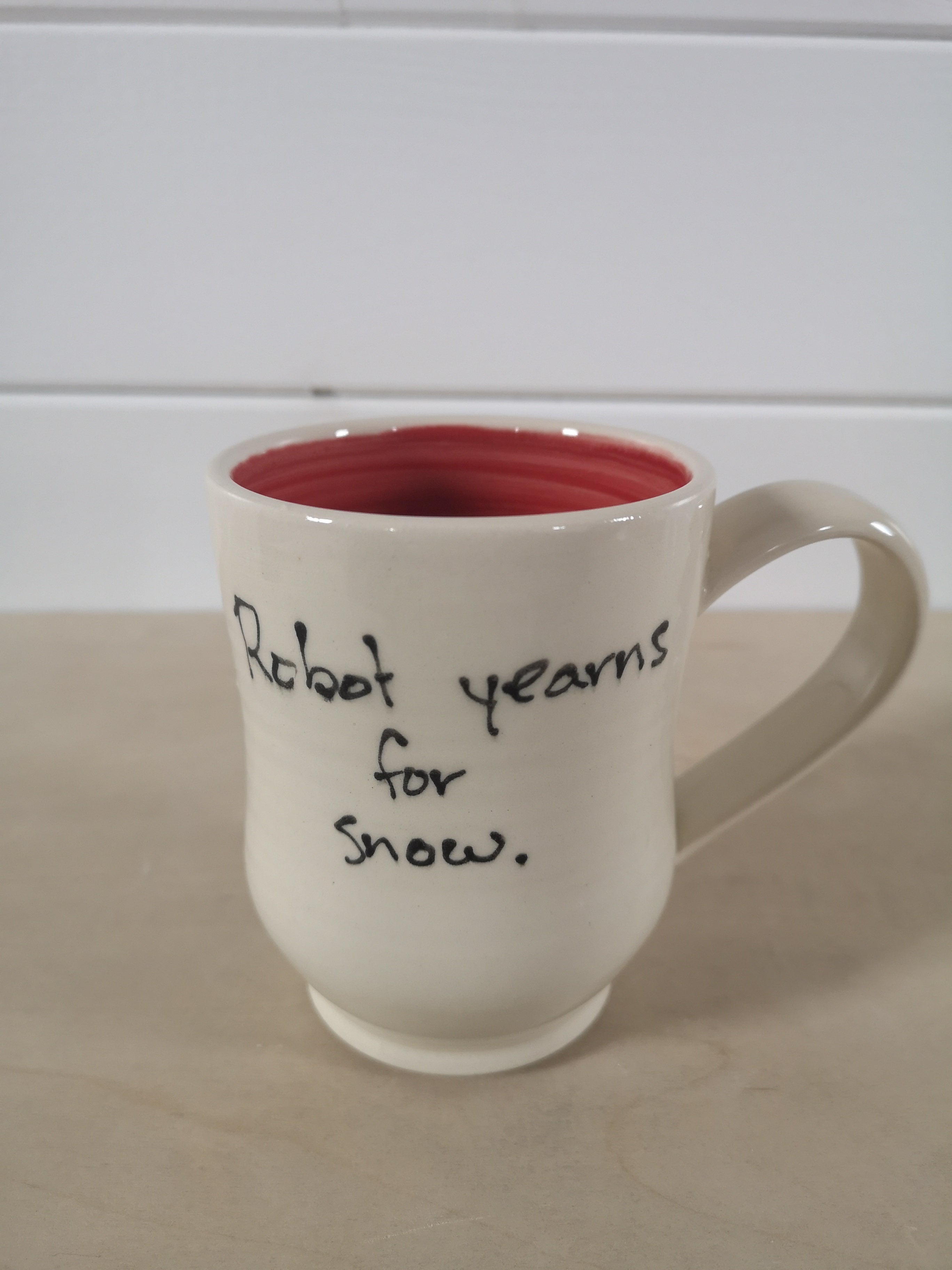 This handmade porcelain mug features a cartoon of Robot in skis, looking up at a tree that still has a few red leaves. It holds about 475mL/16oz. The inside is a bright red