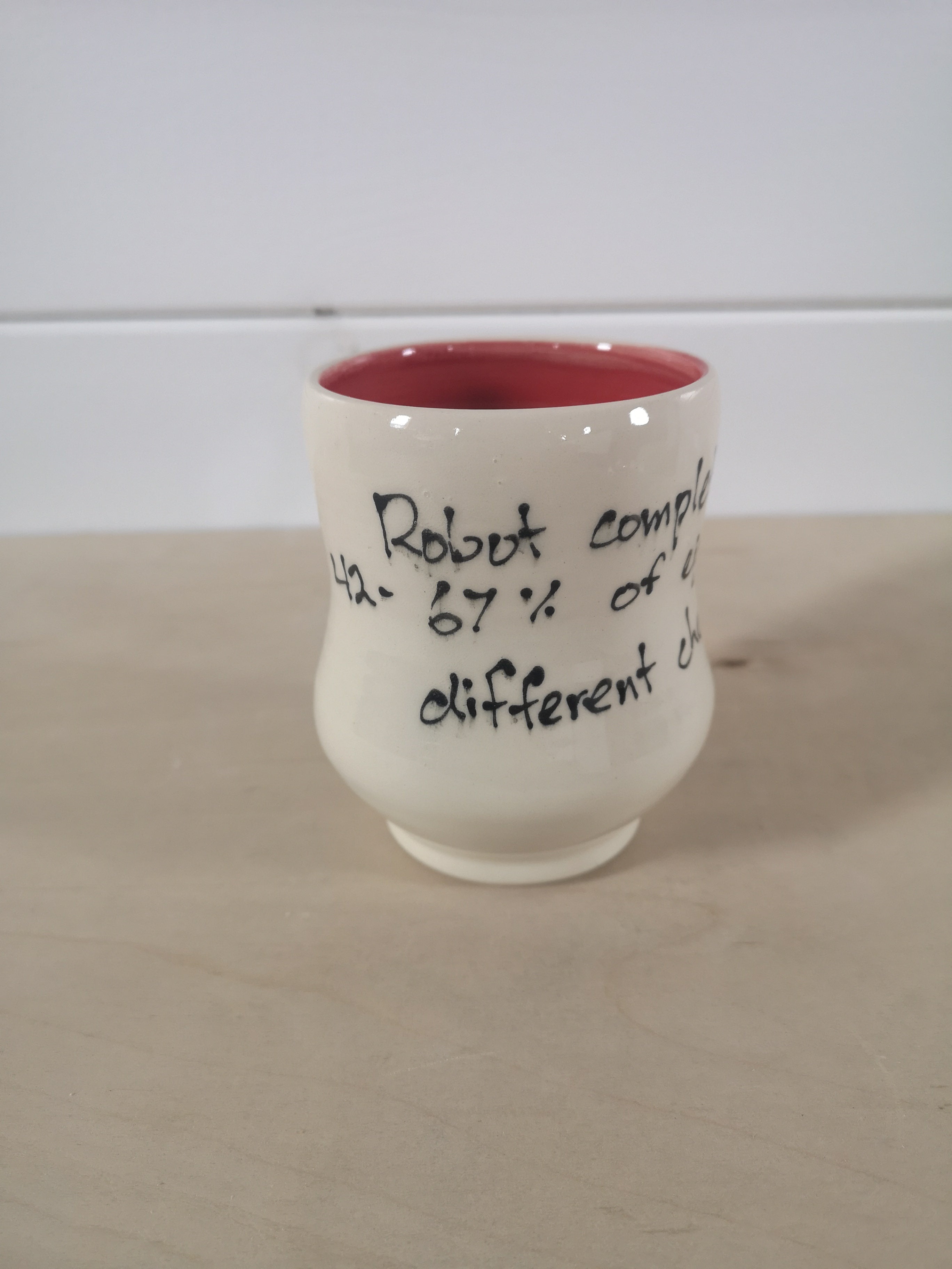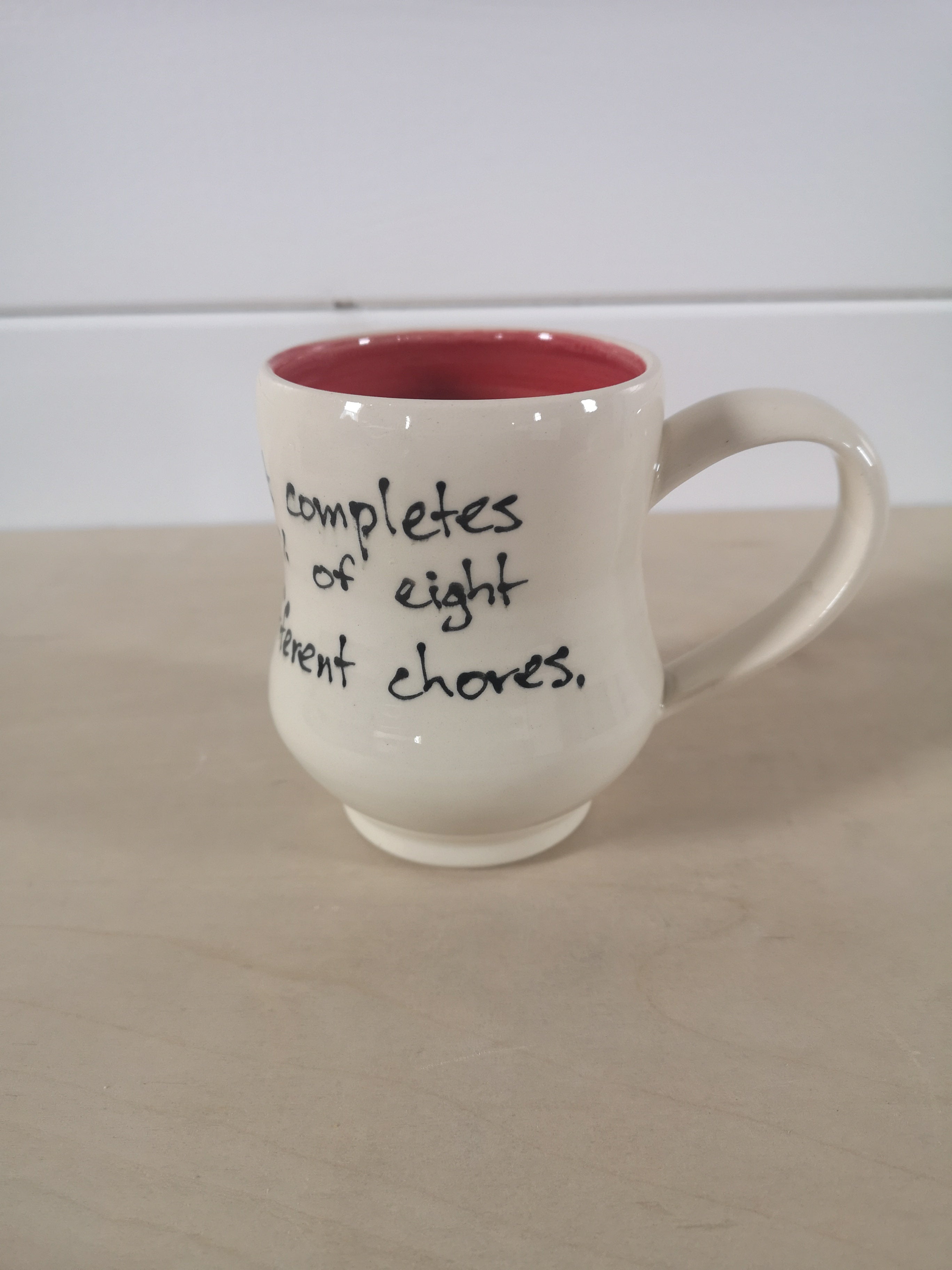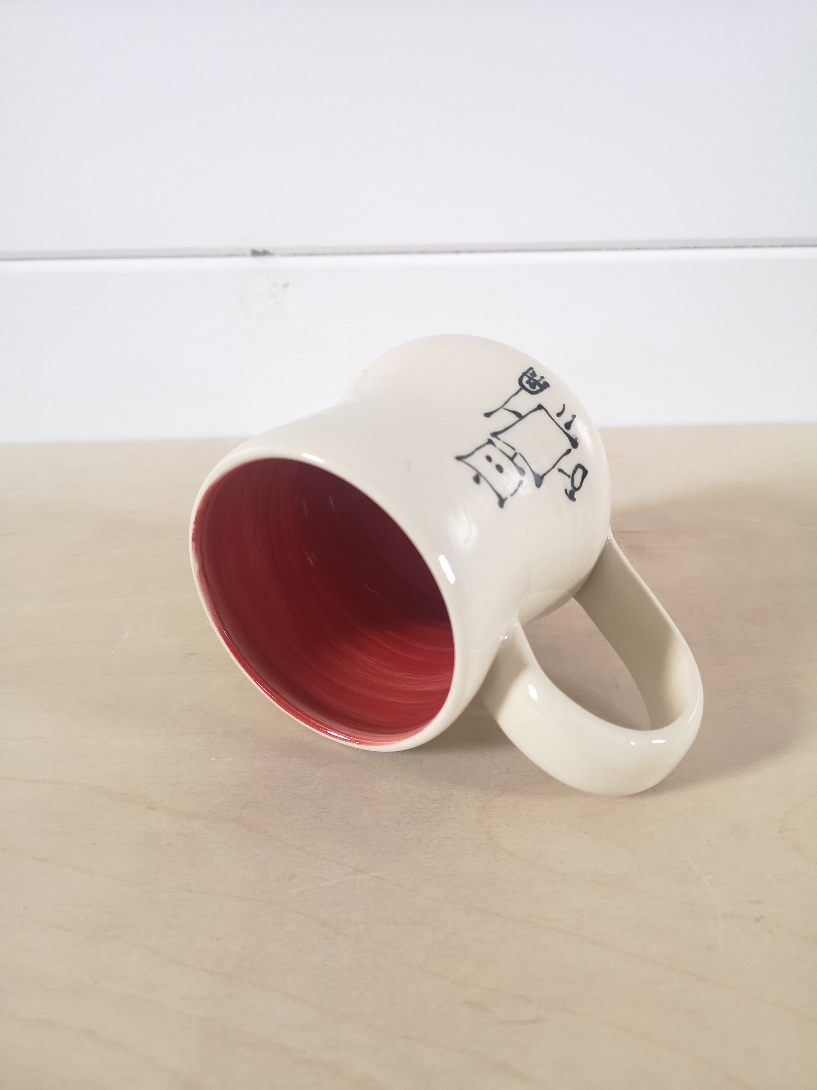 This handmade porcelain mug holds about 475mL/16oz. The inside is painted red.