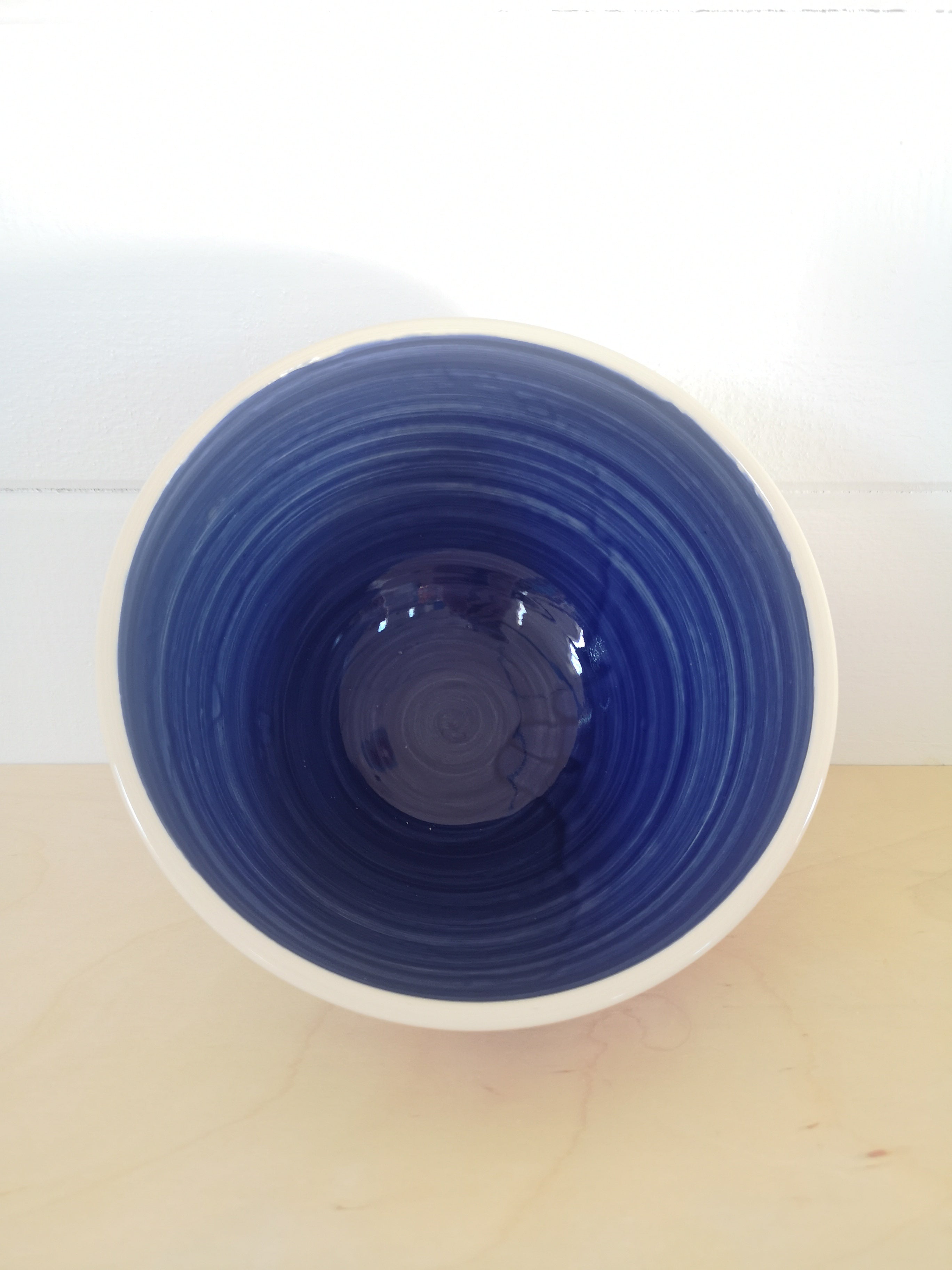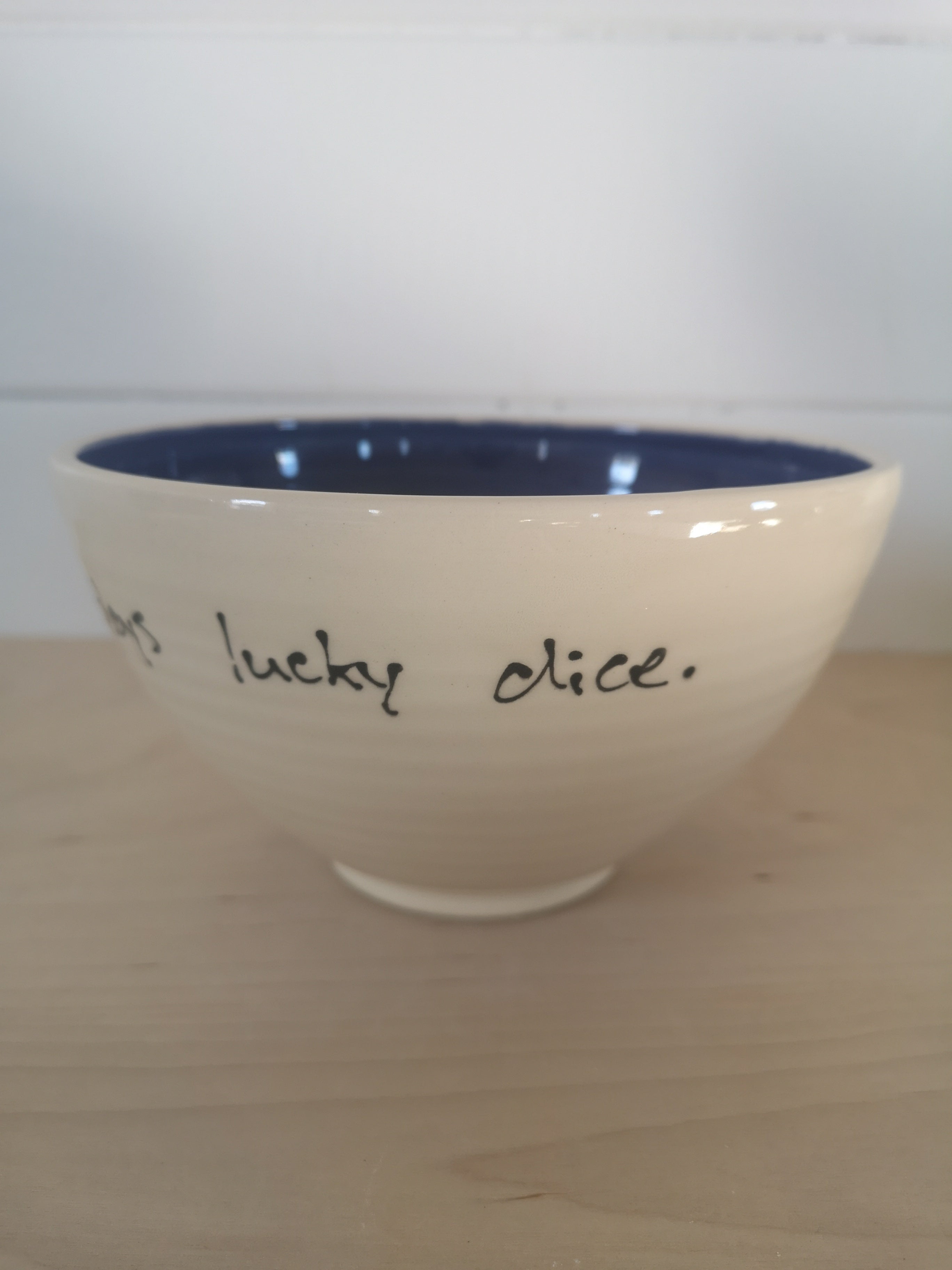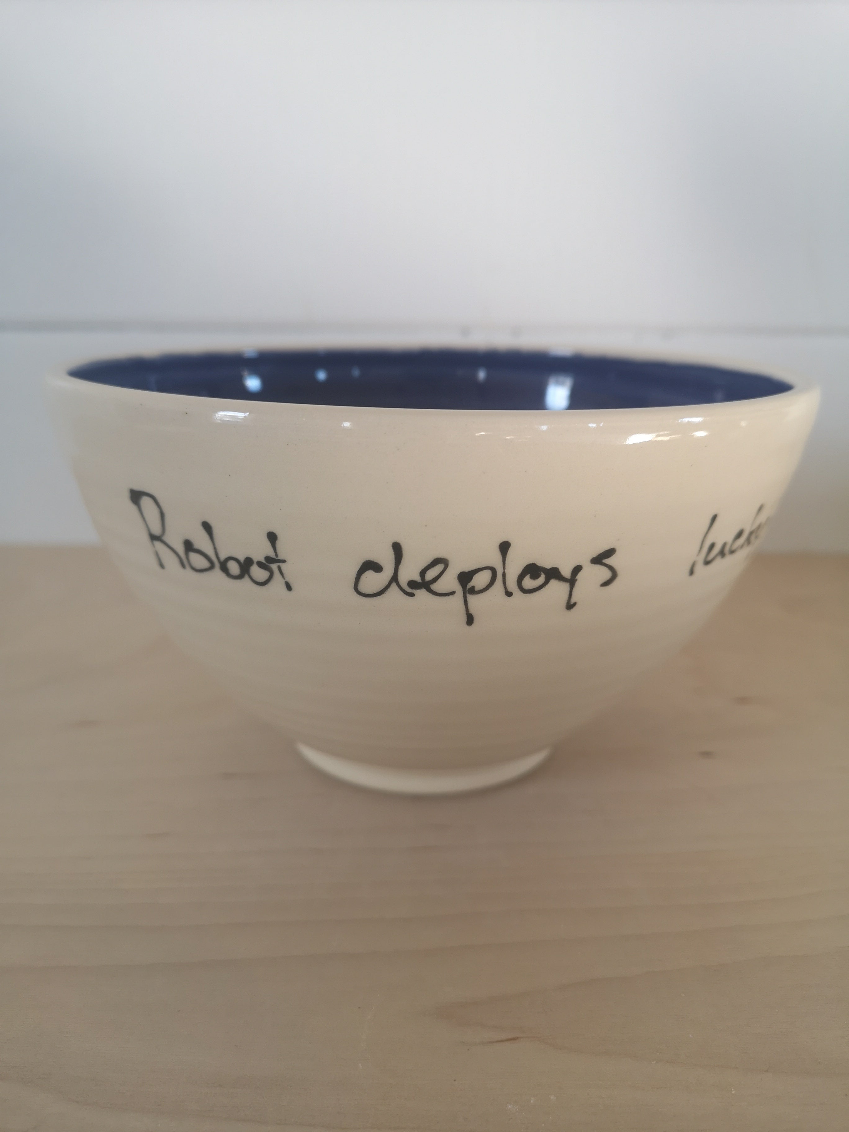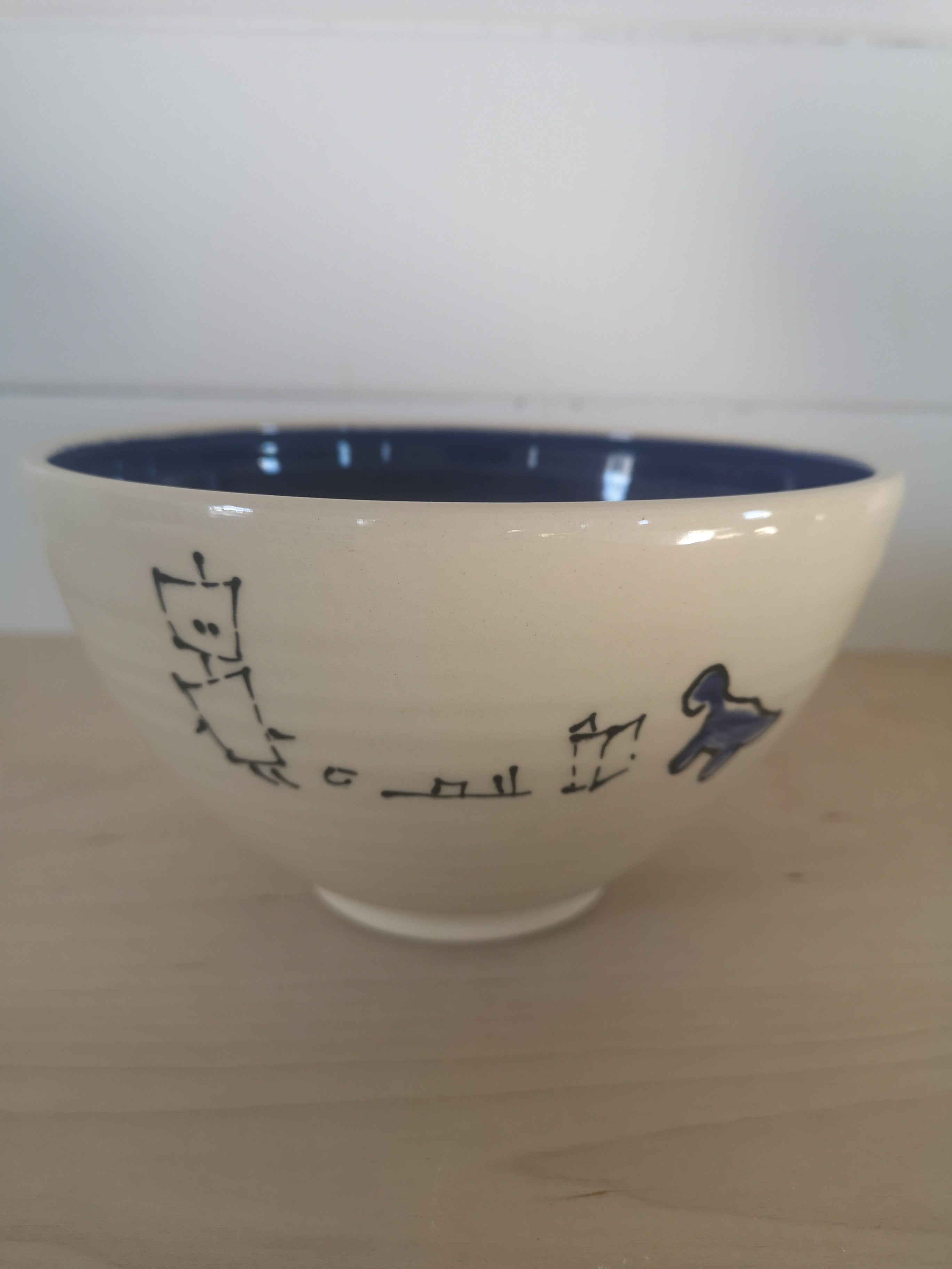 This handmade porcelain bowl features a cartoon of Robot and Dinosaur playing a tabletop RPG. It's about 17 cm wide and 8 cm tall. (6 1/2 inches by 3 inches.)