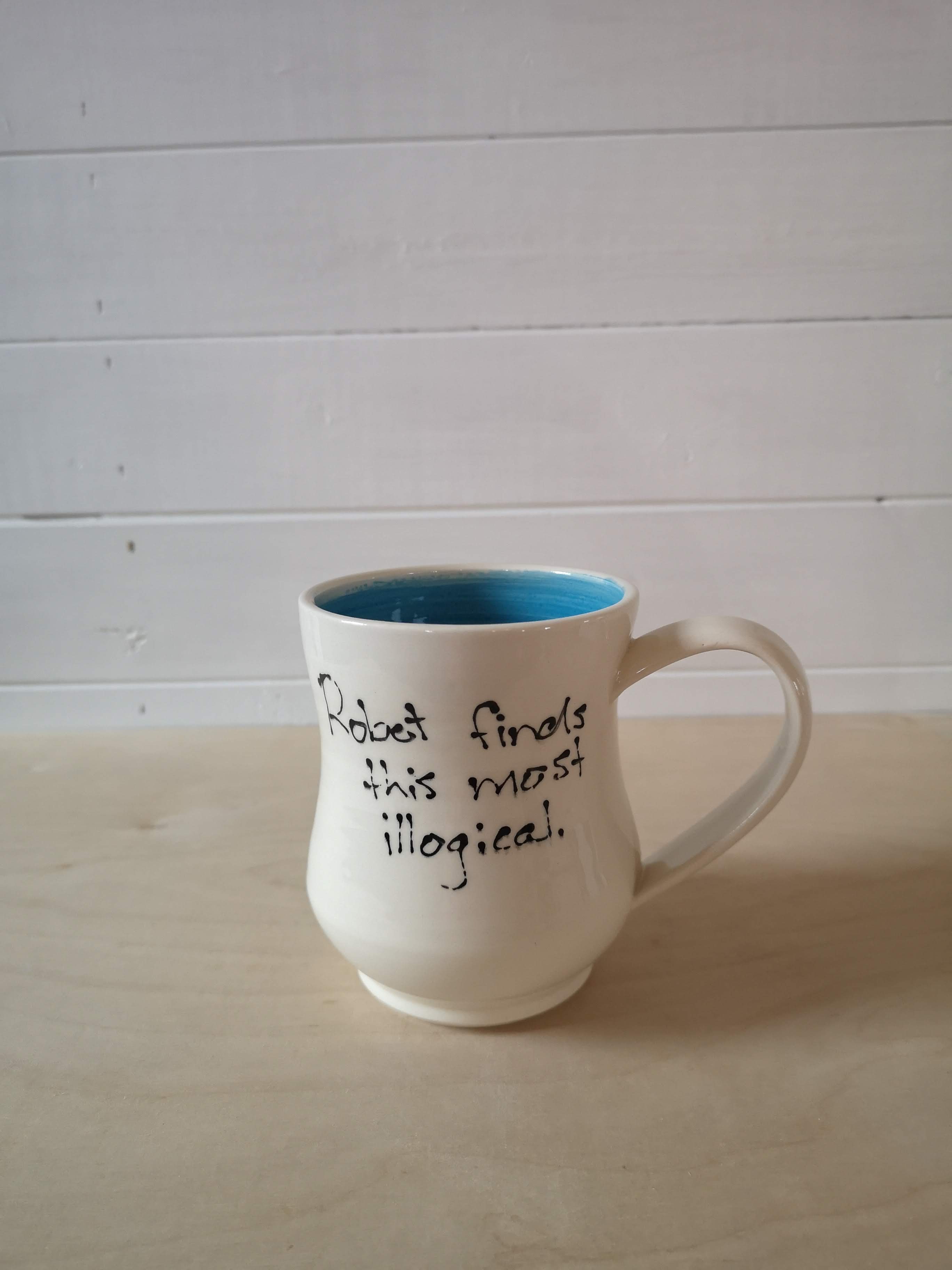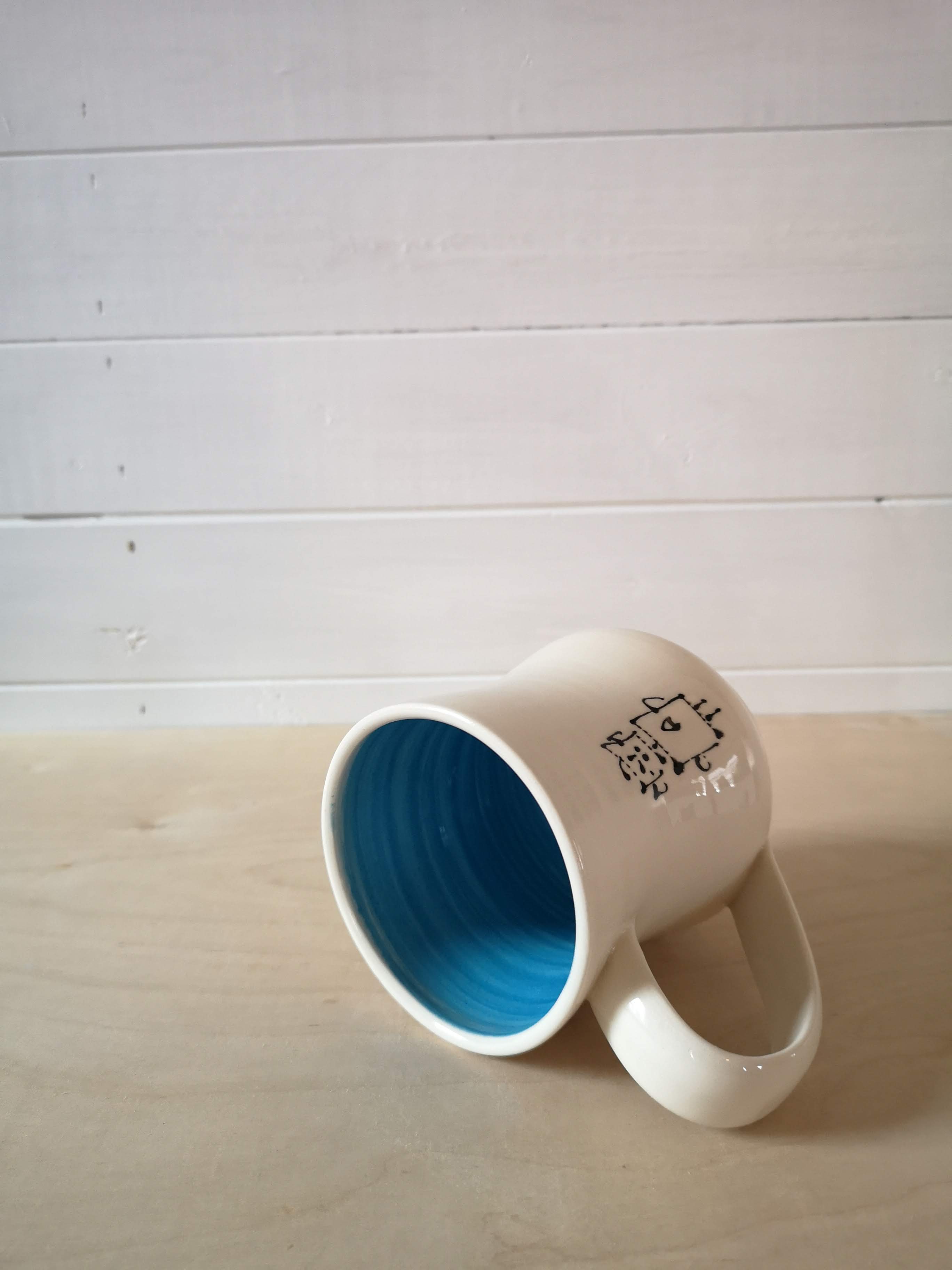 This handmade porcelain mug holds about 475mL/16oz. The inside is painted bright blue.
