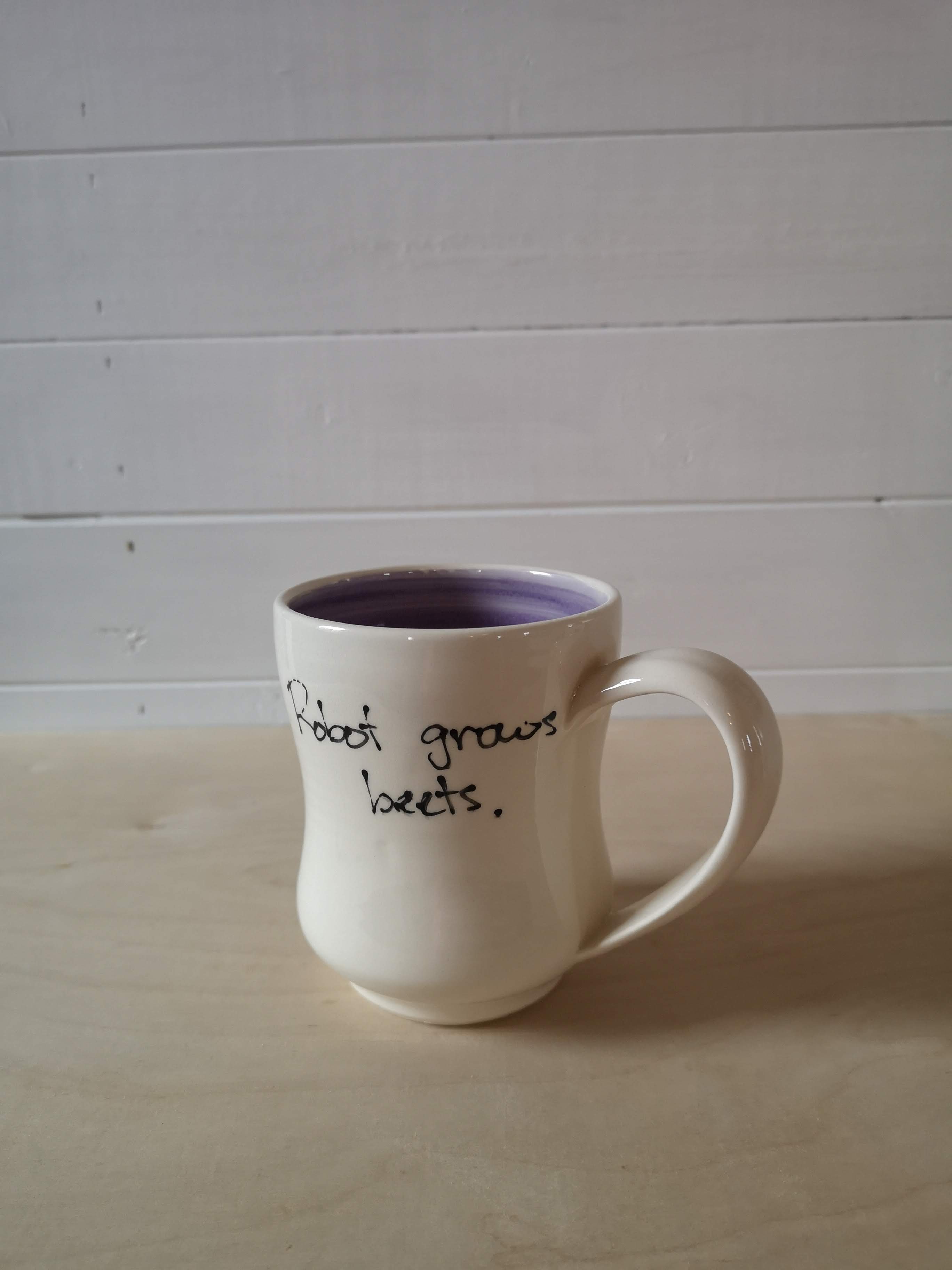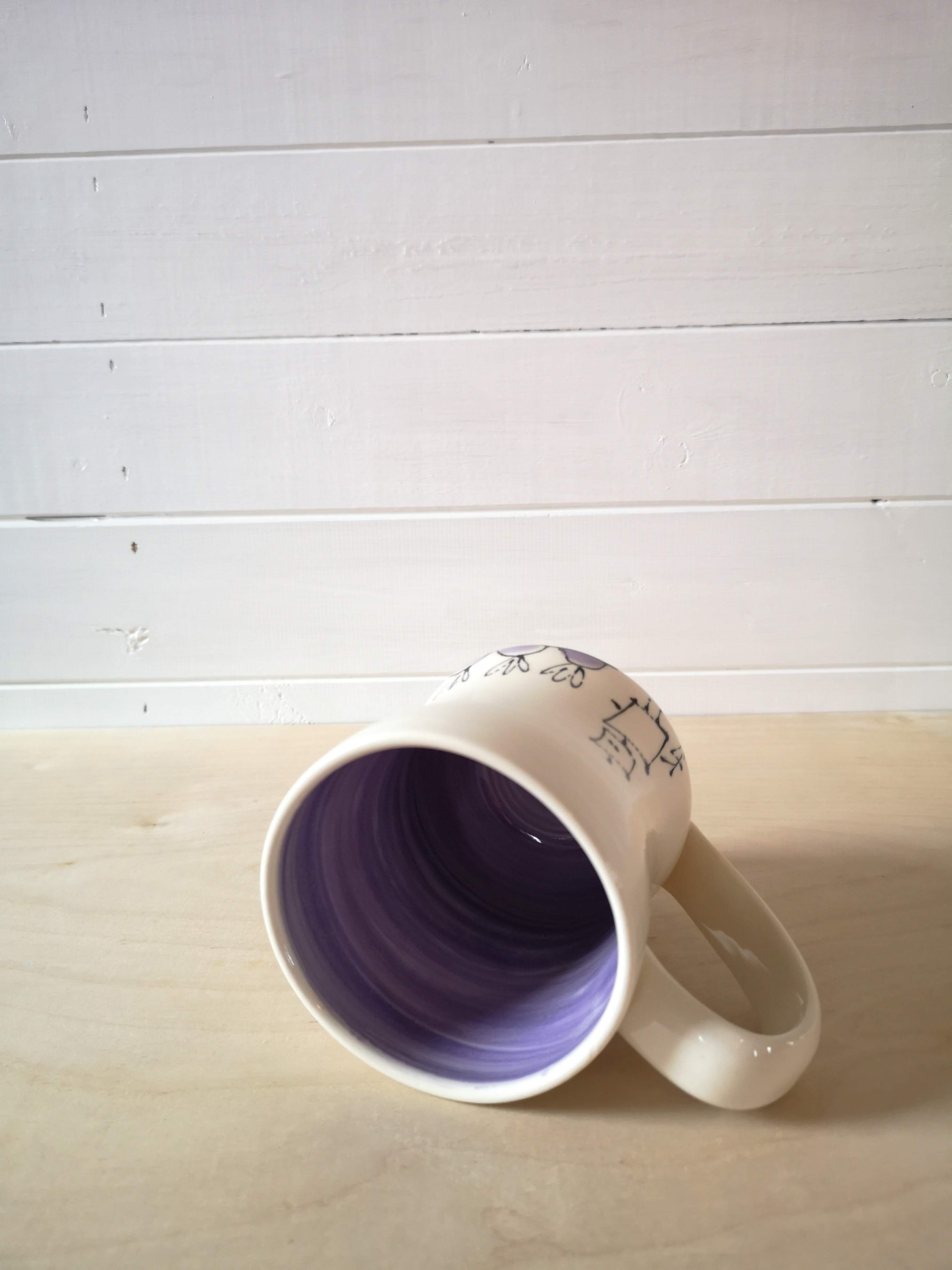This handmade porcelain mug holds about 475mL/16oz. The inside is painted a cheery purple.