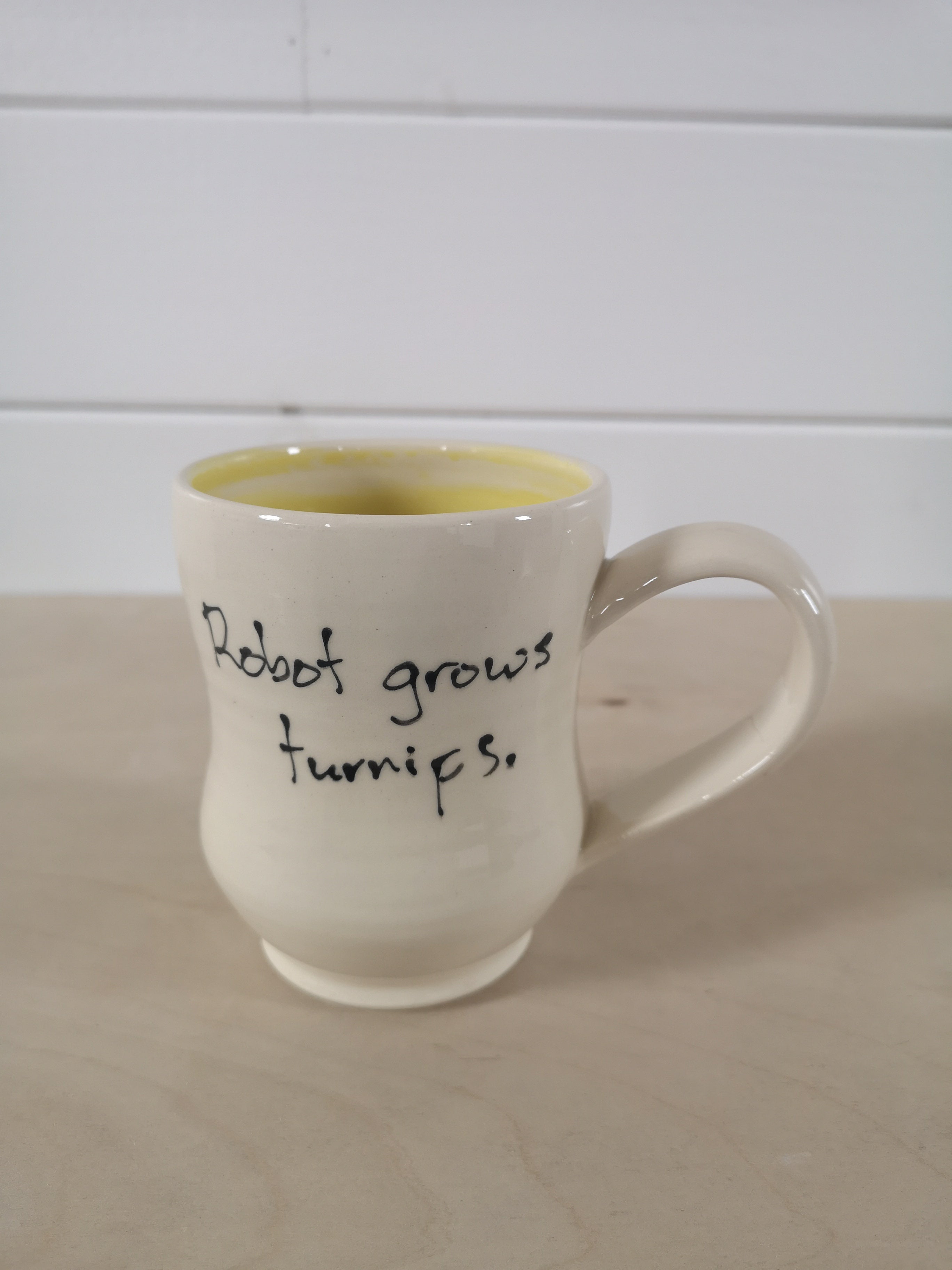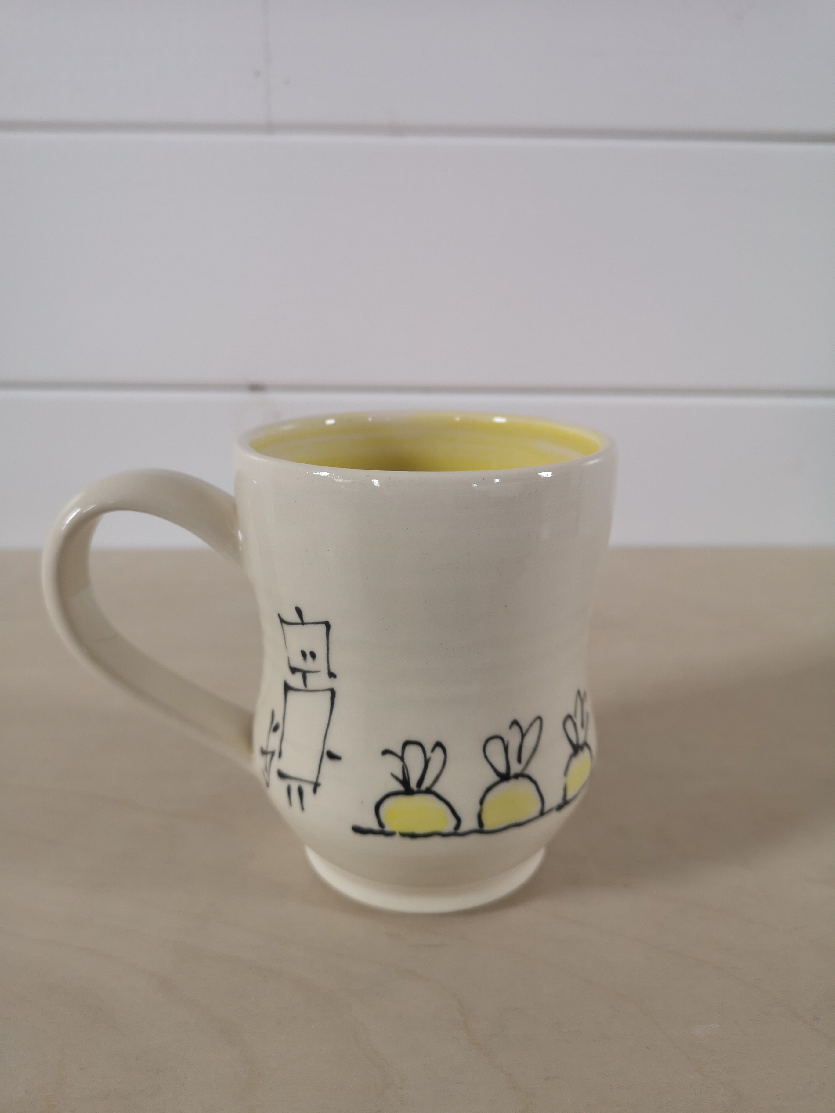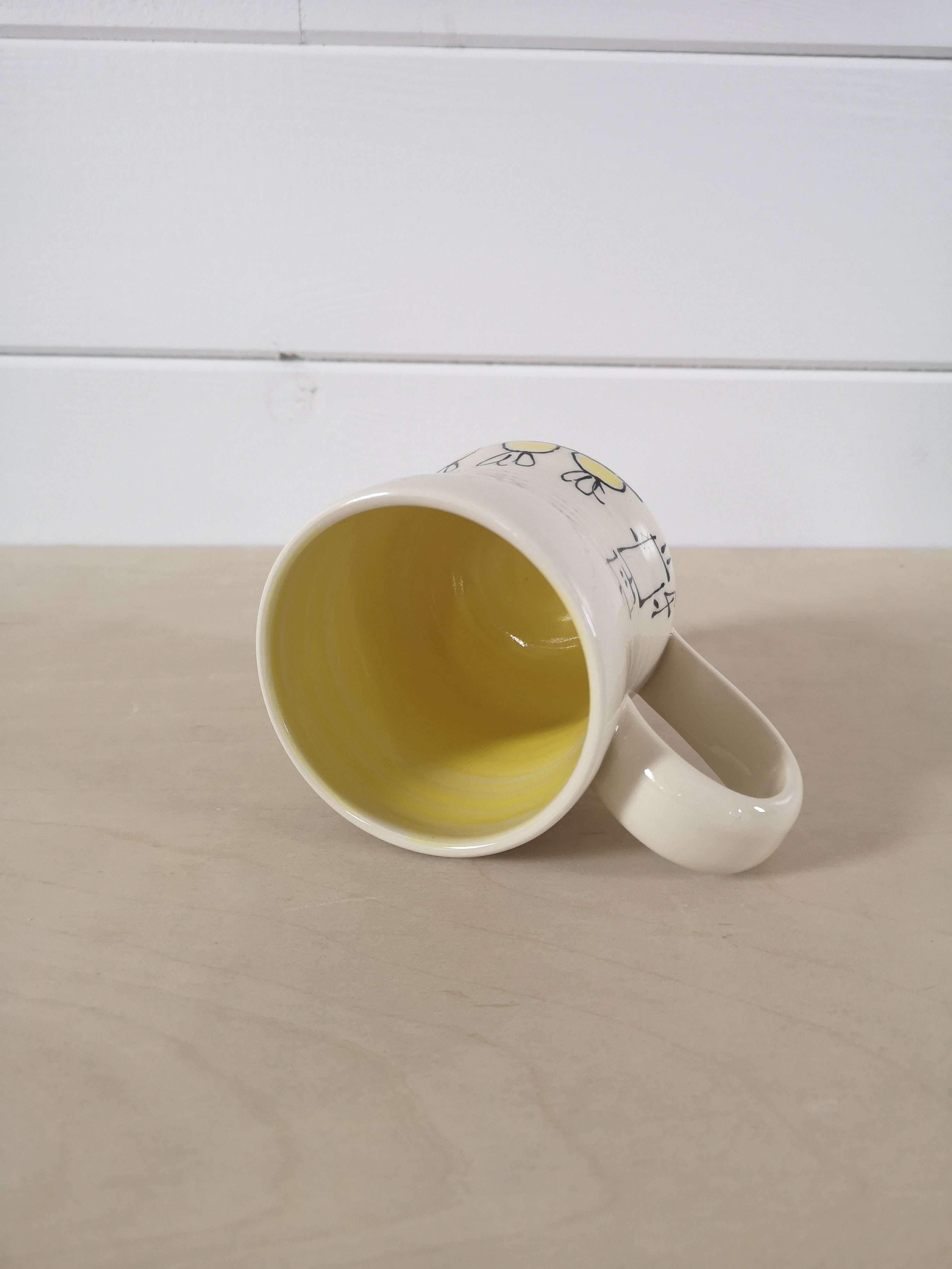 This handmade porcelain mug holds about 475mL/16oz. The inside is painted yellow.