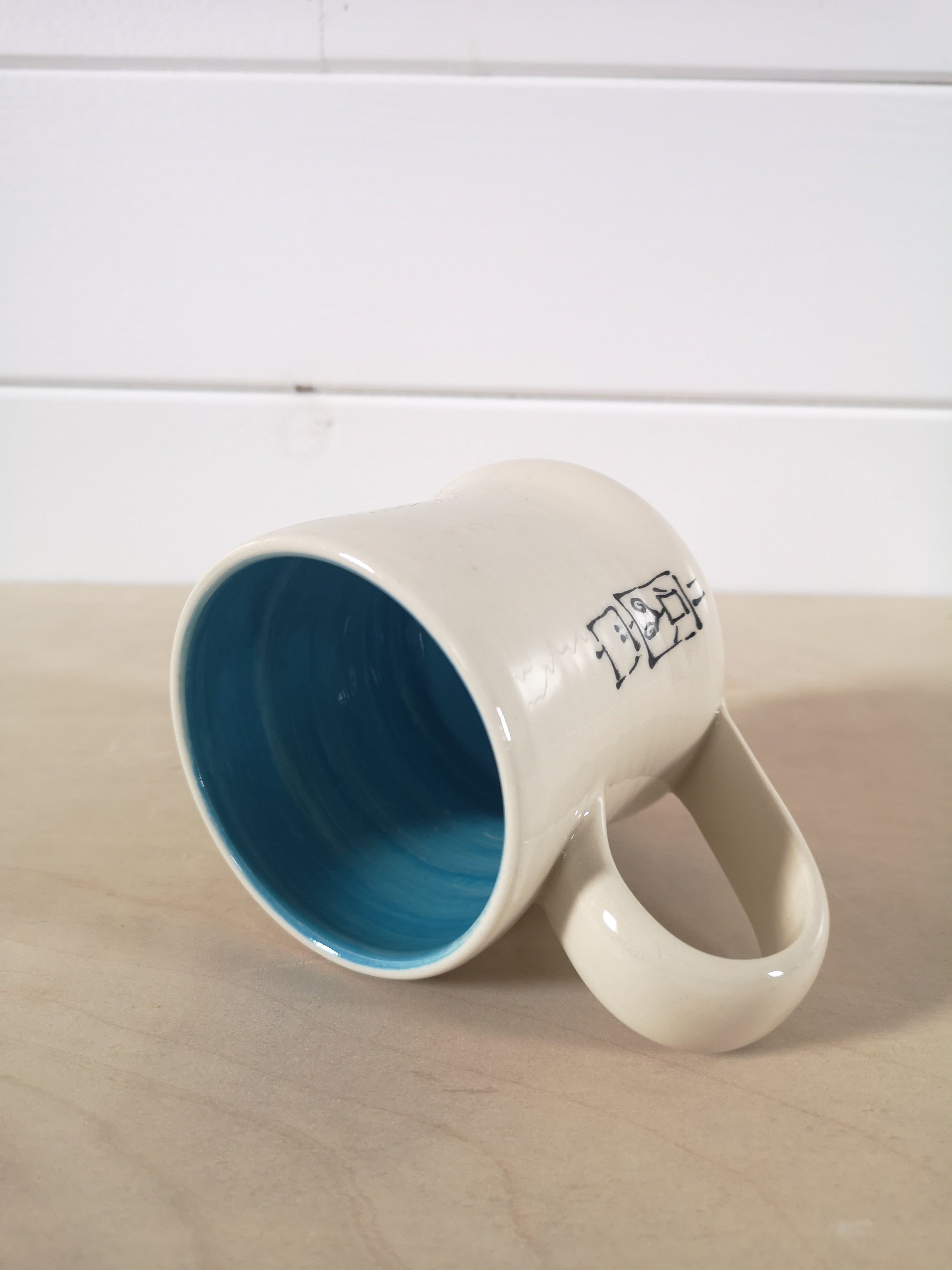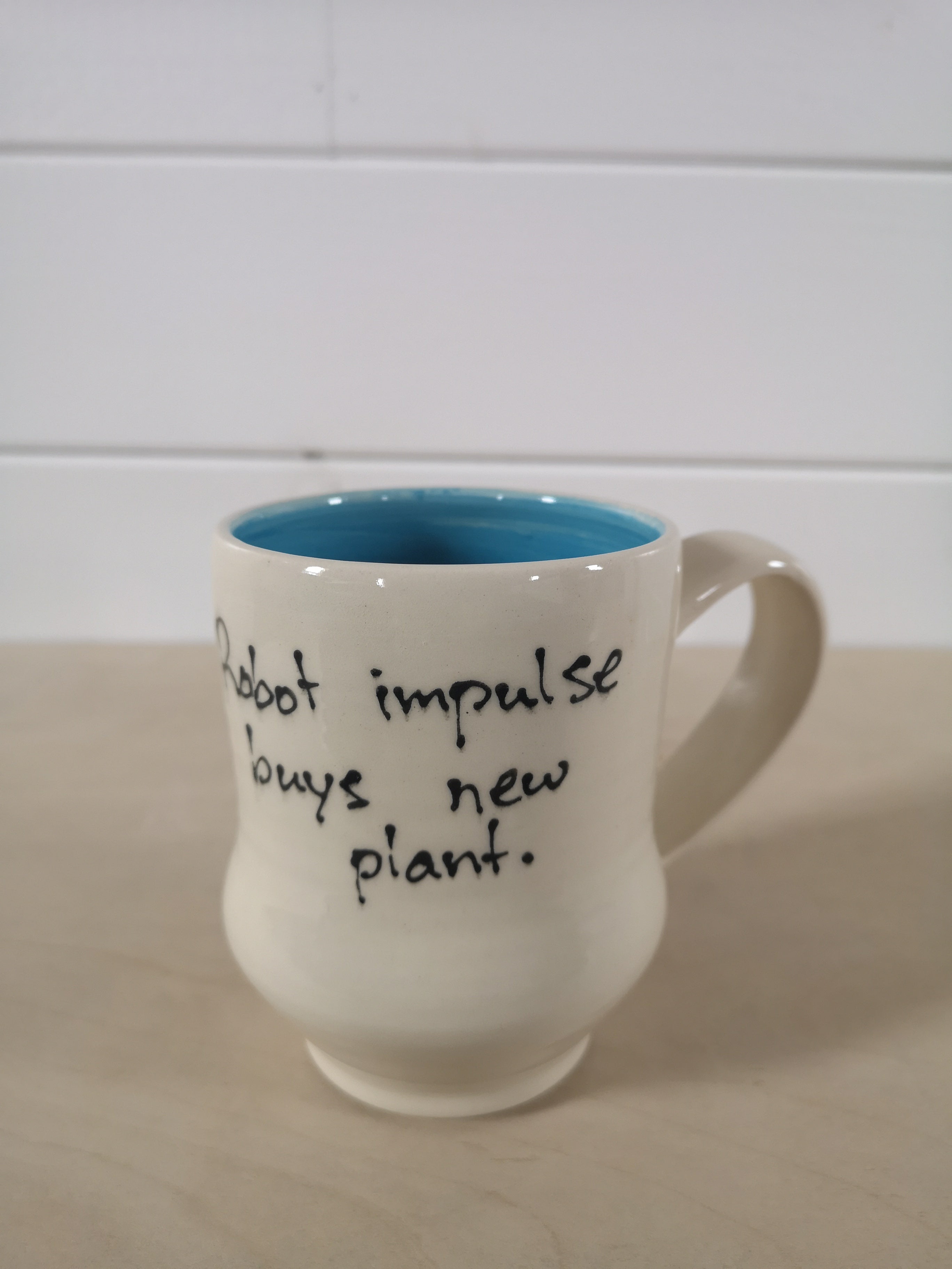 This handmade porcelain mug features a cartoon of Robot holding a small potted plant. It holds about 475mL/16oz. The inside is a bright blue.