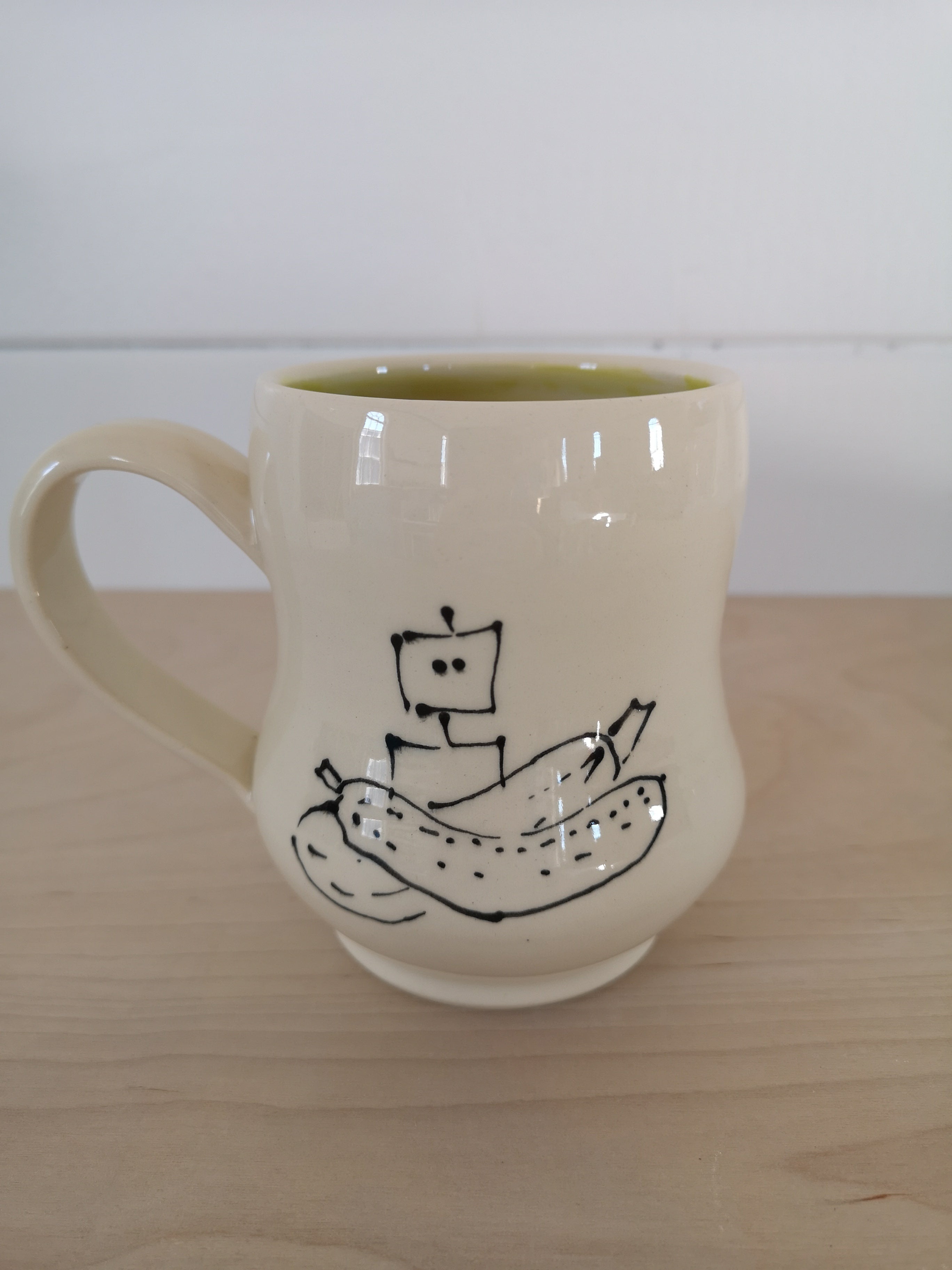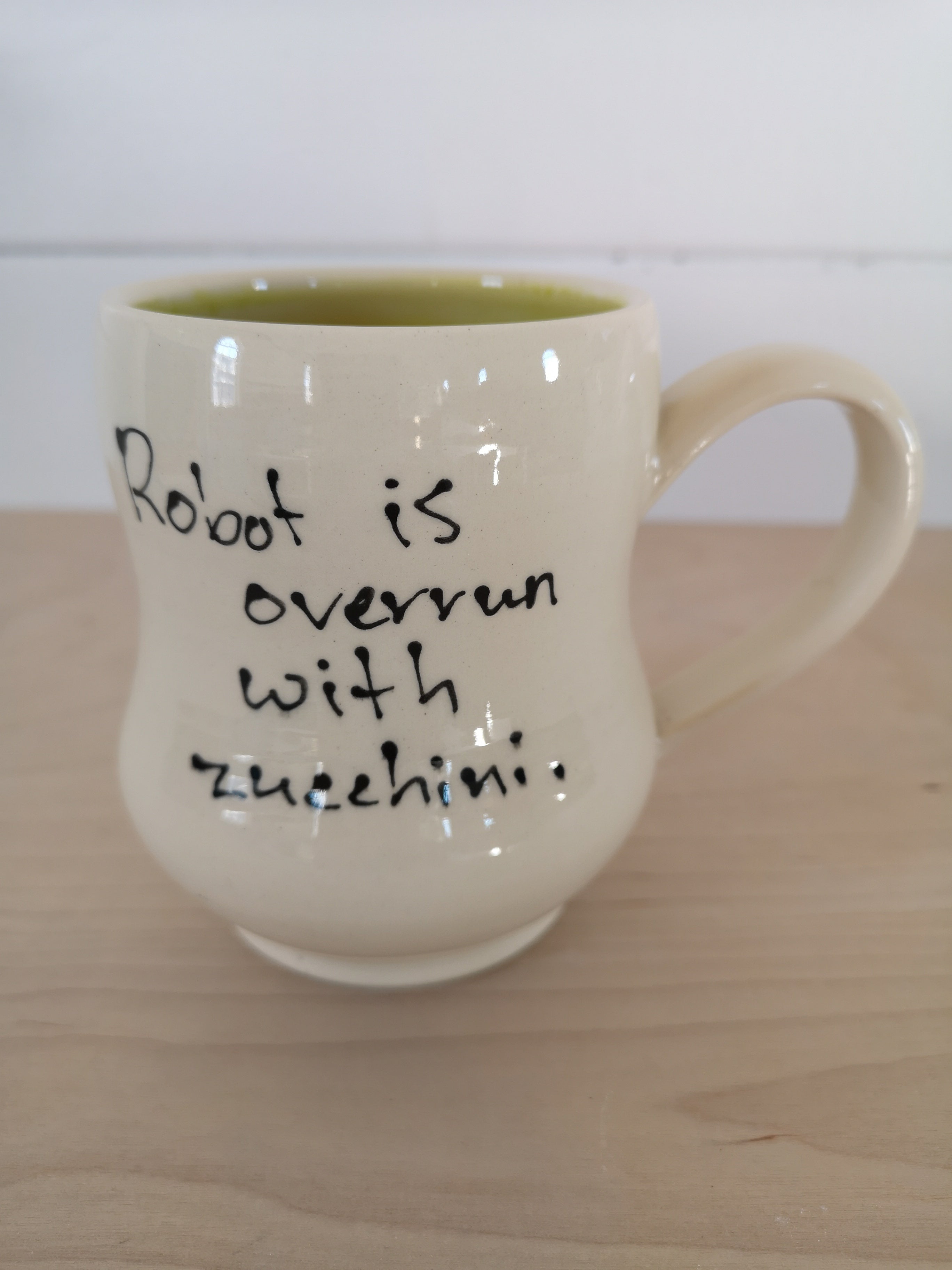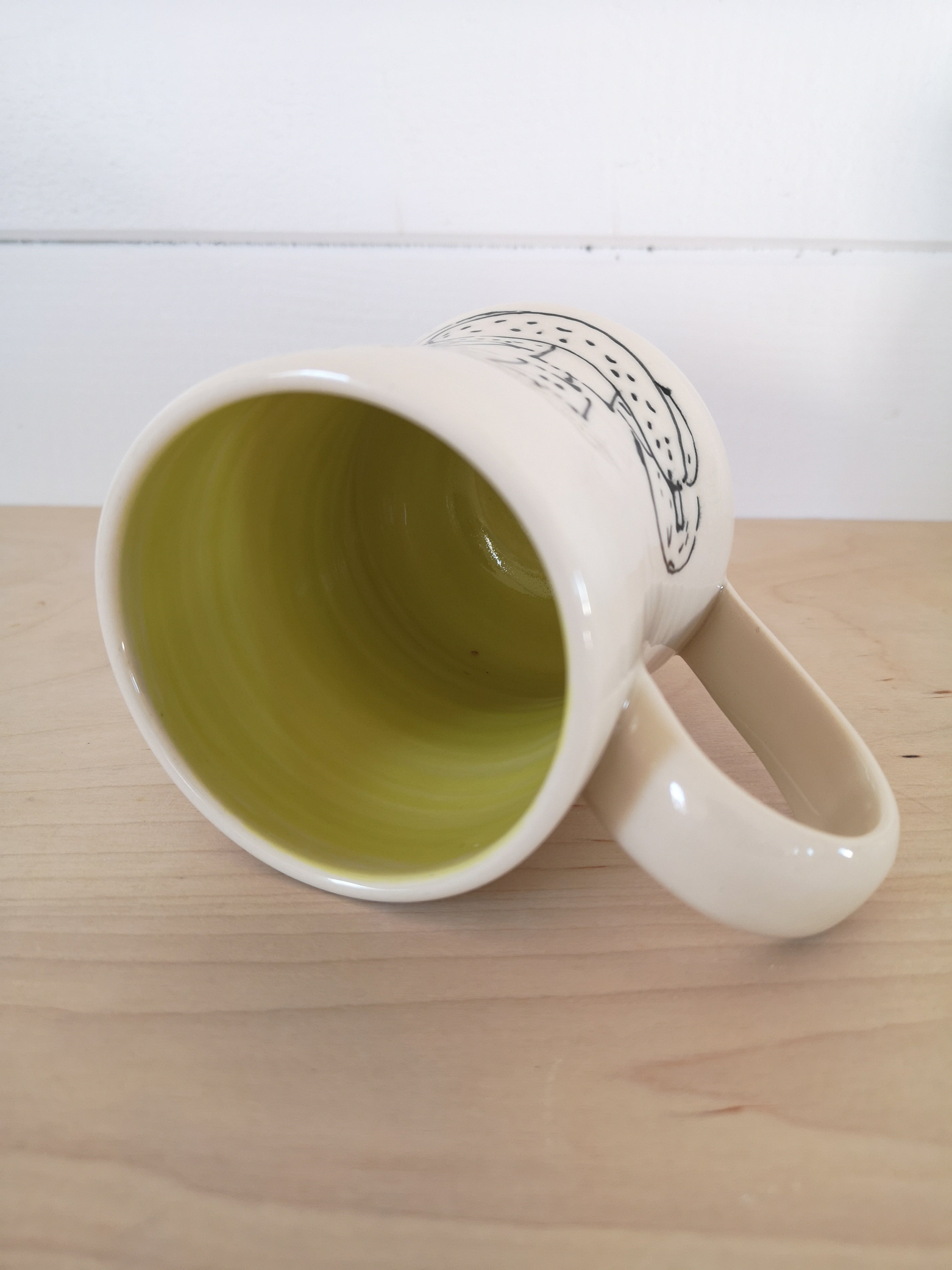 This handmade porcelain mug holds about 475mL/16oz.