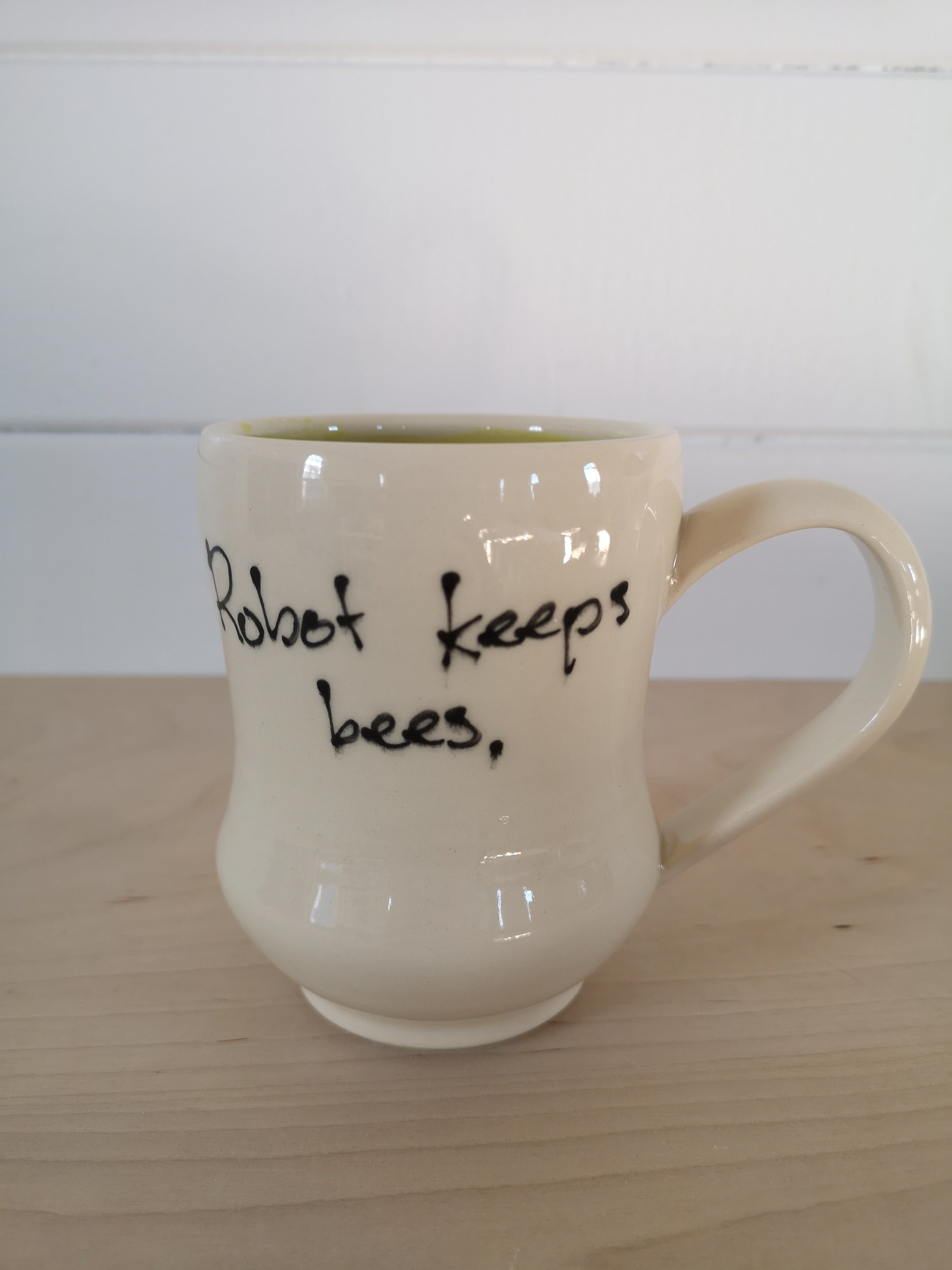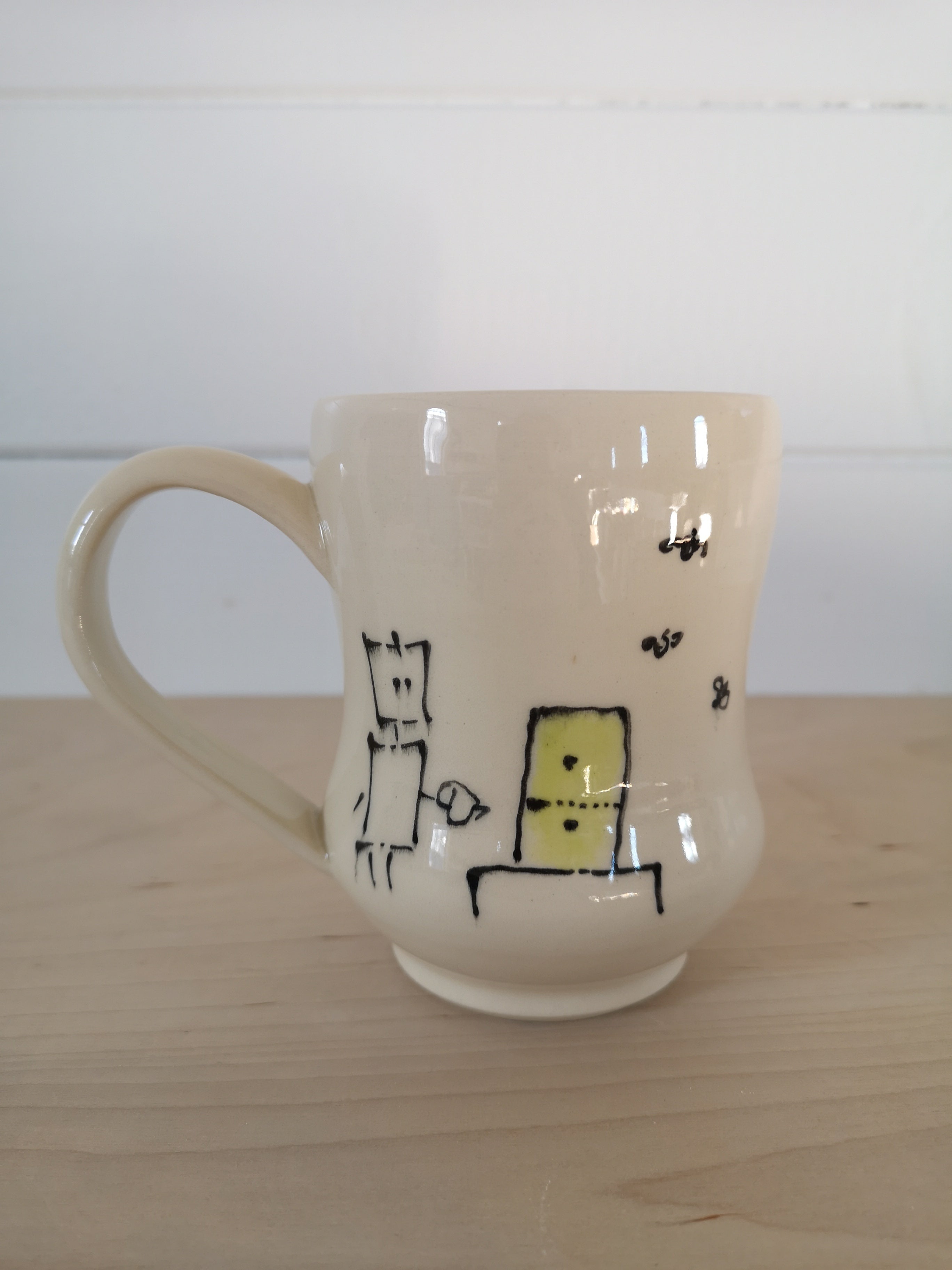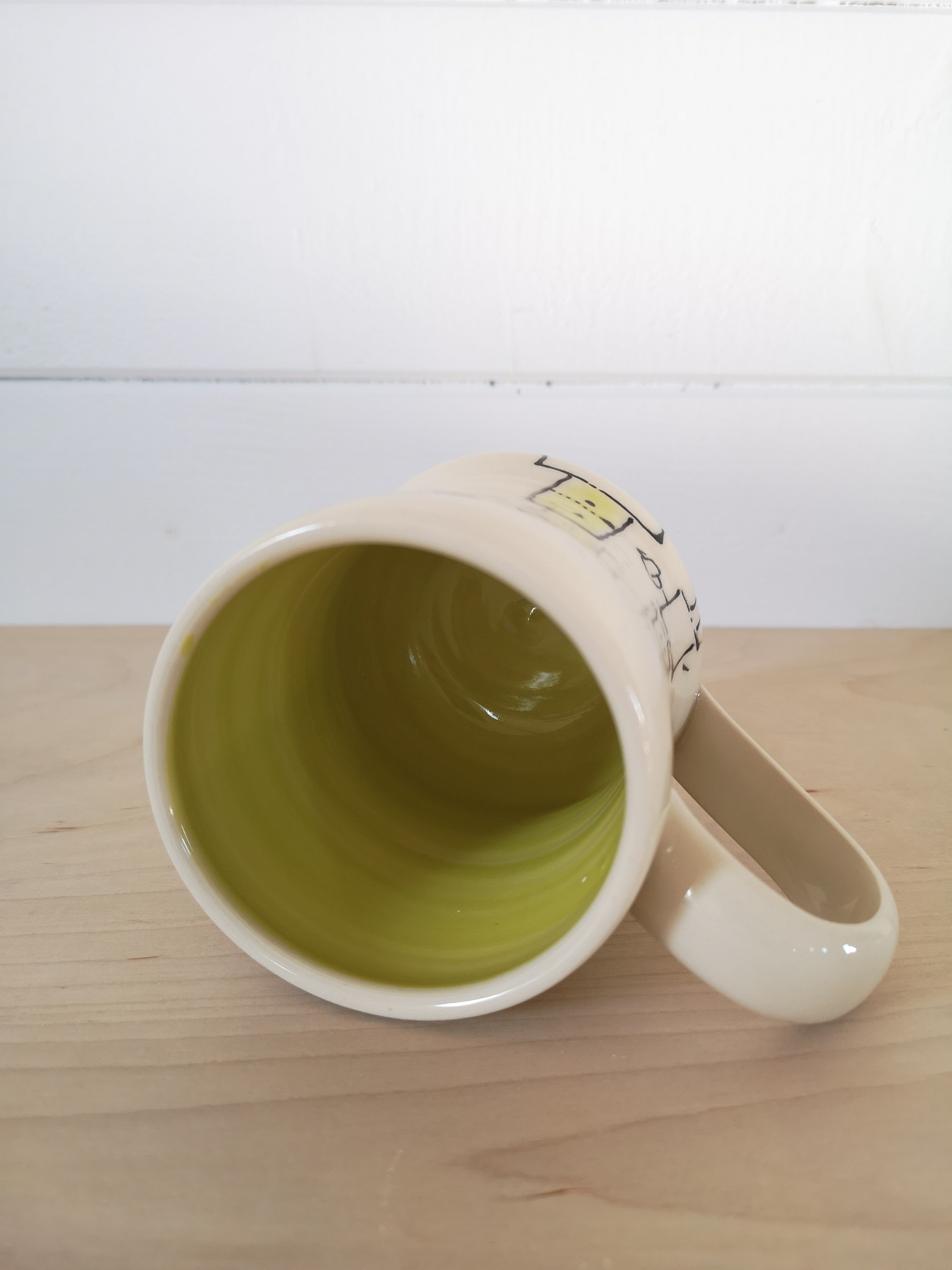 This handmade porcelain mug holds about 475mL/16oz. The inside is a very captainly shade of red.