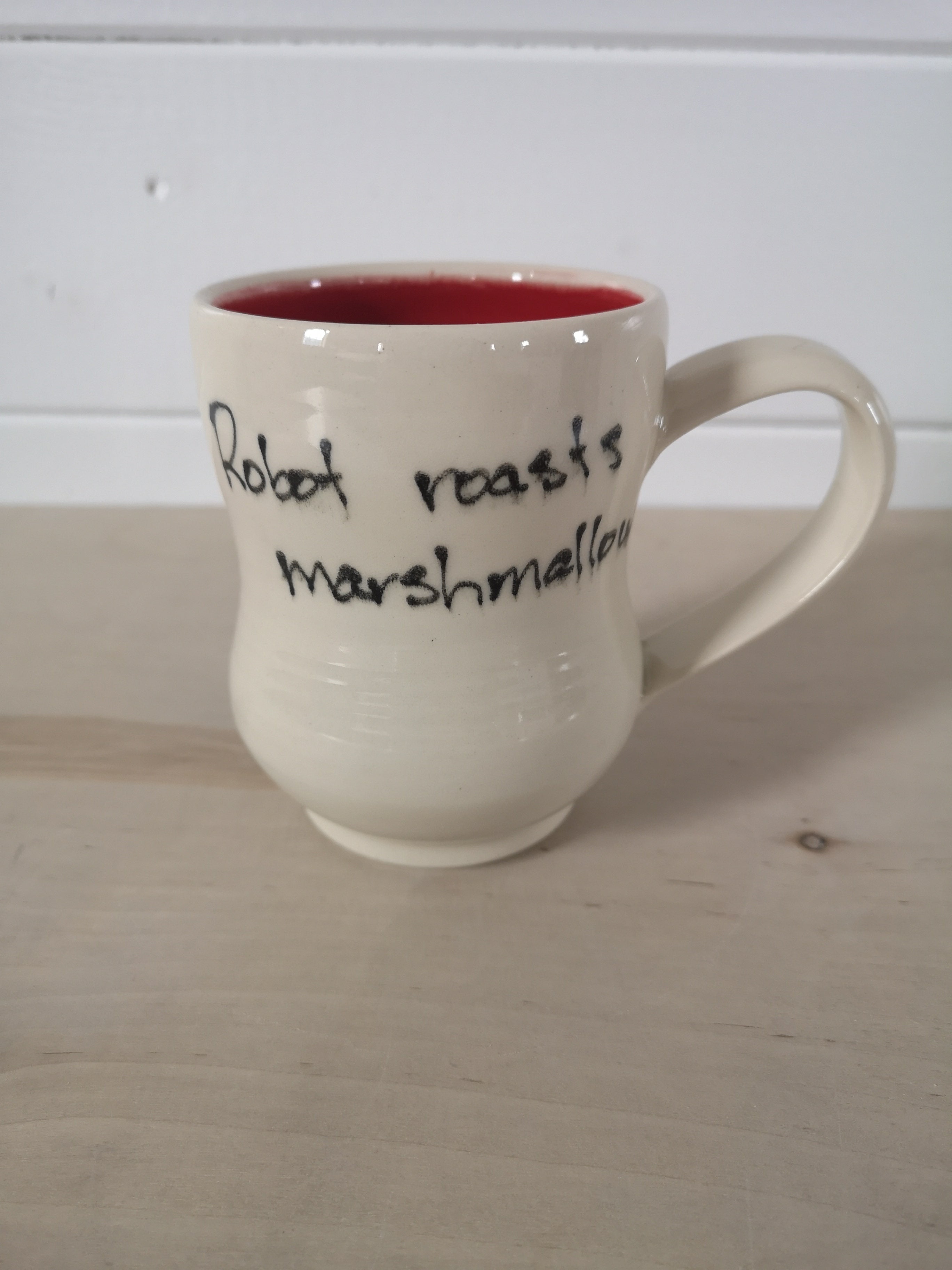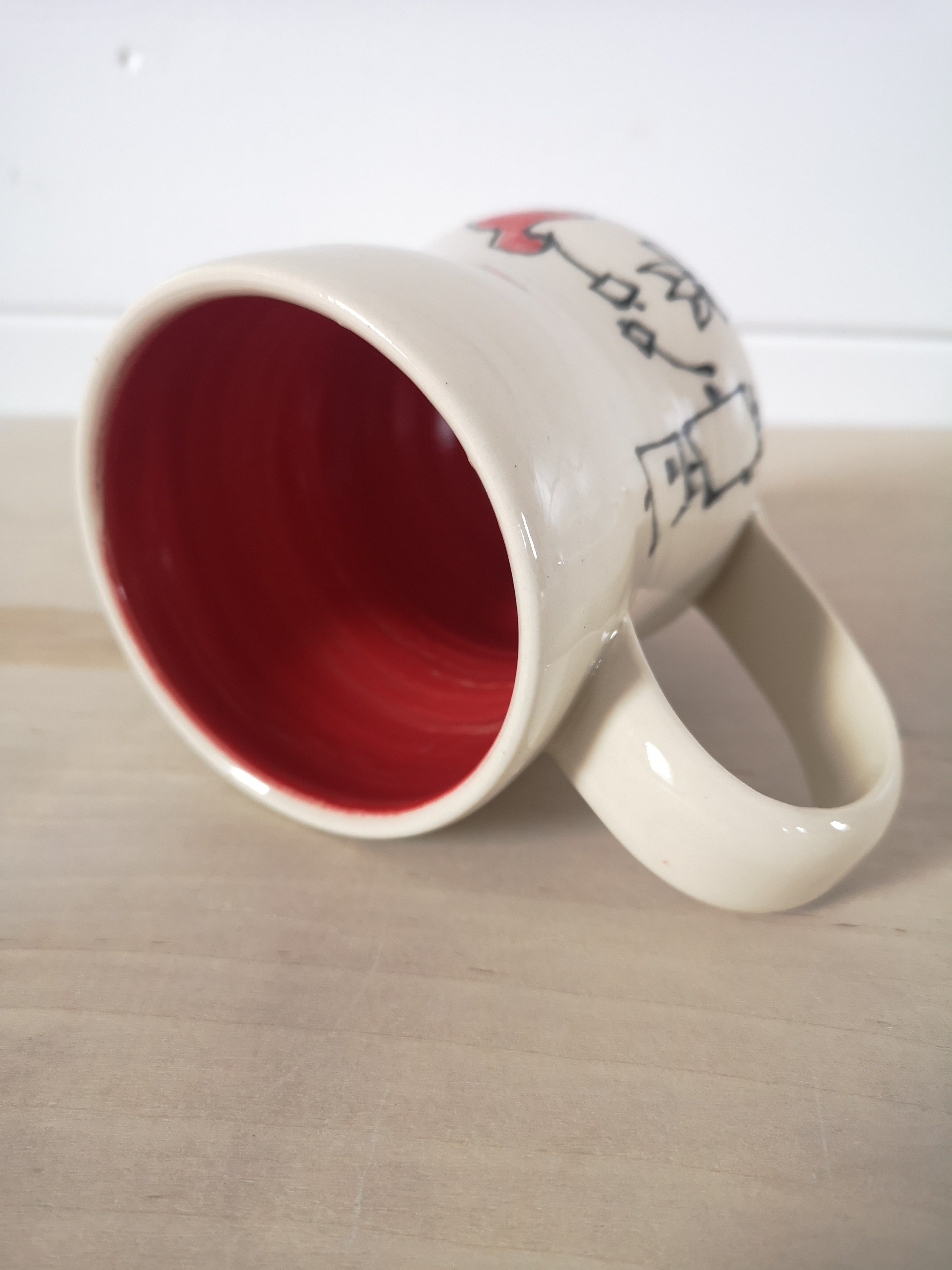 This handmade porcelain mug holds about 475mL/16oz.