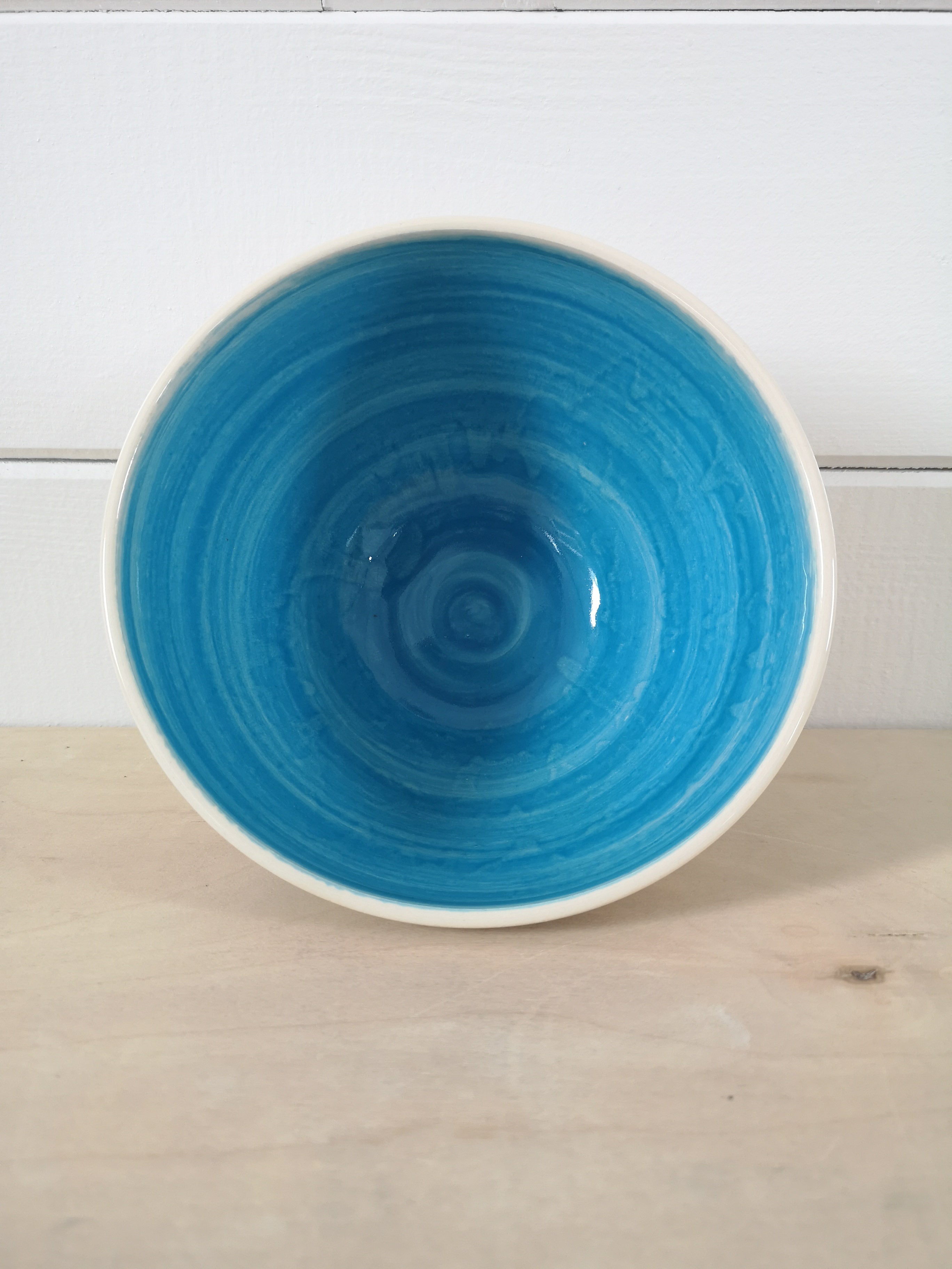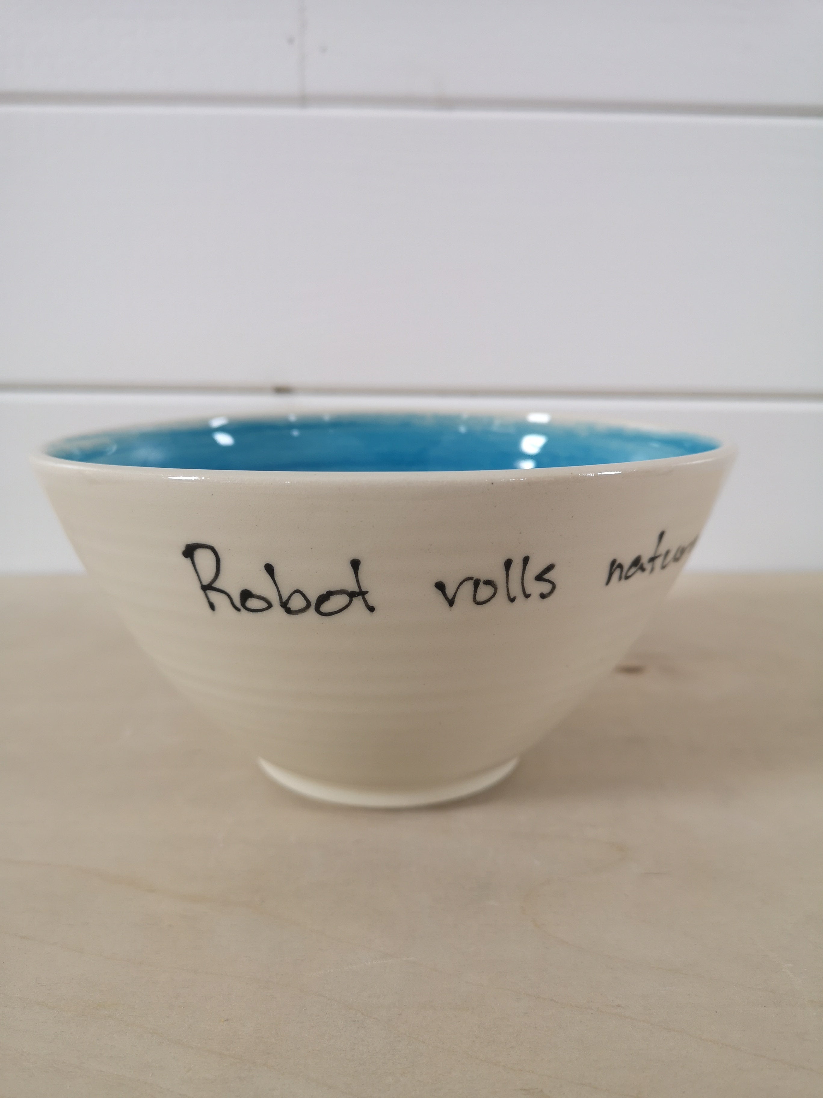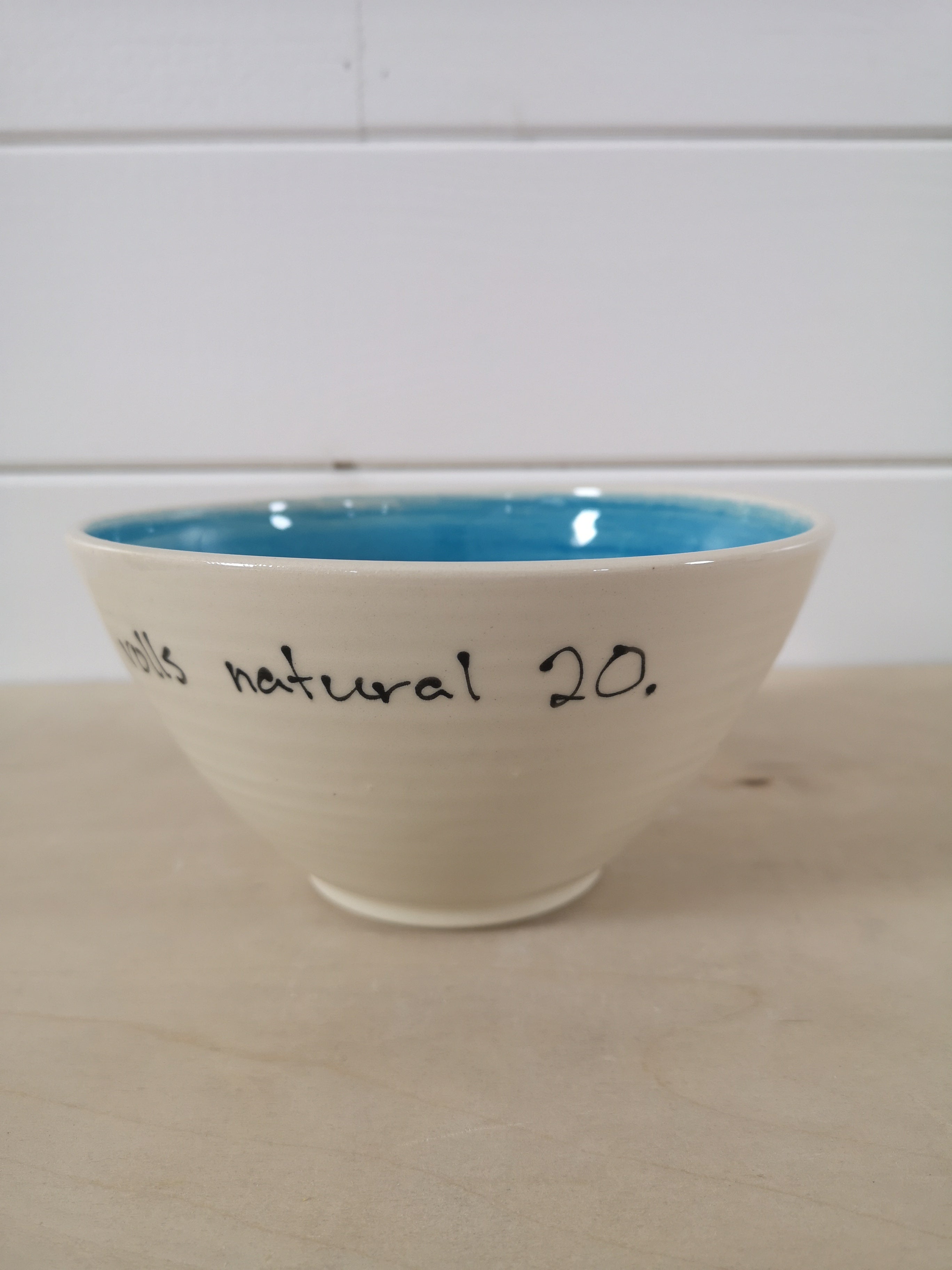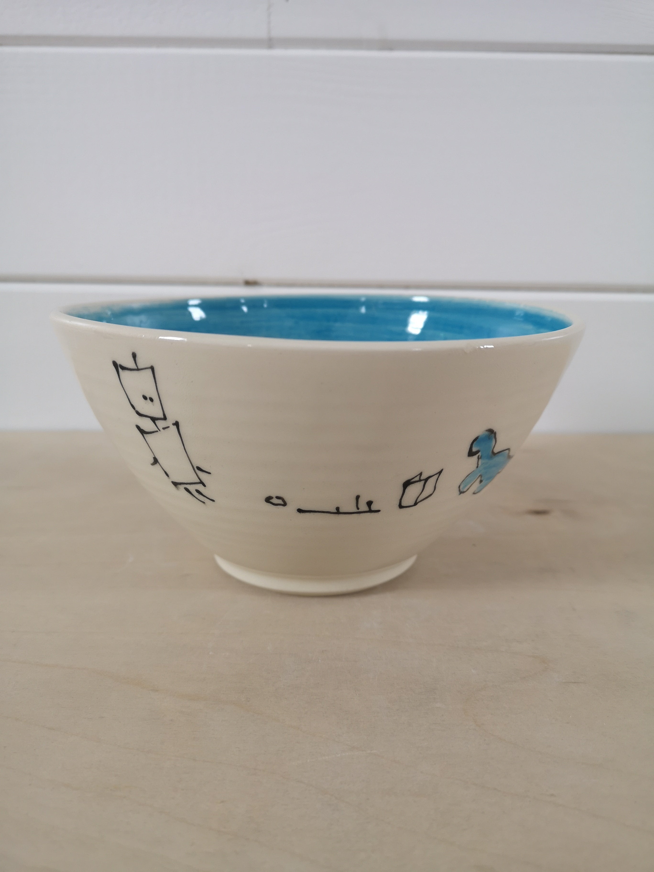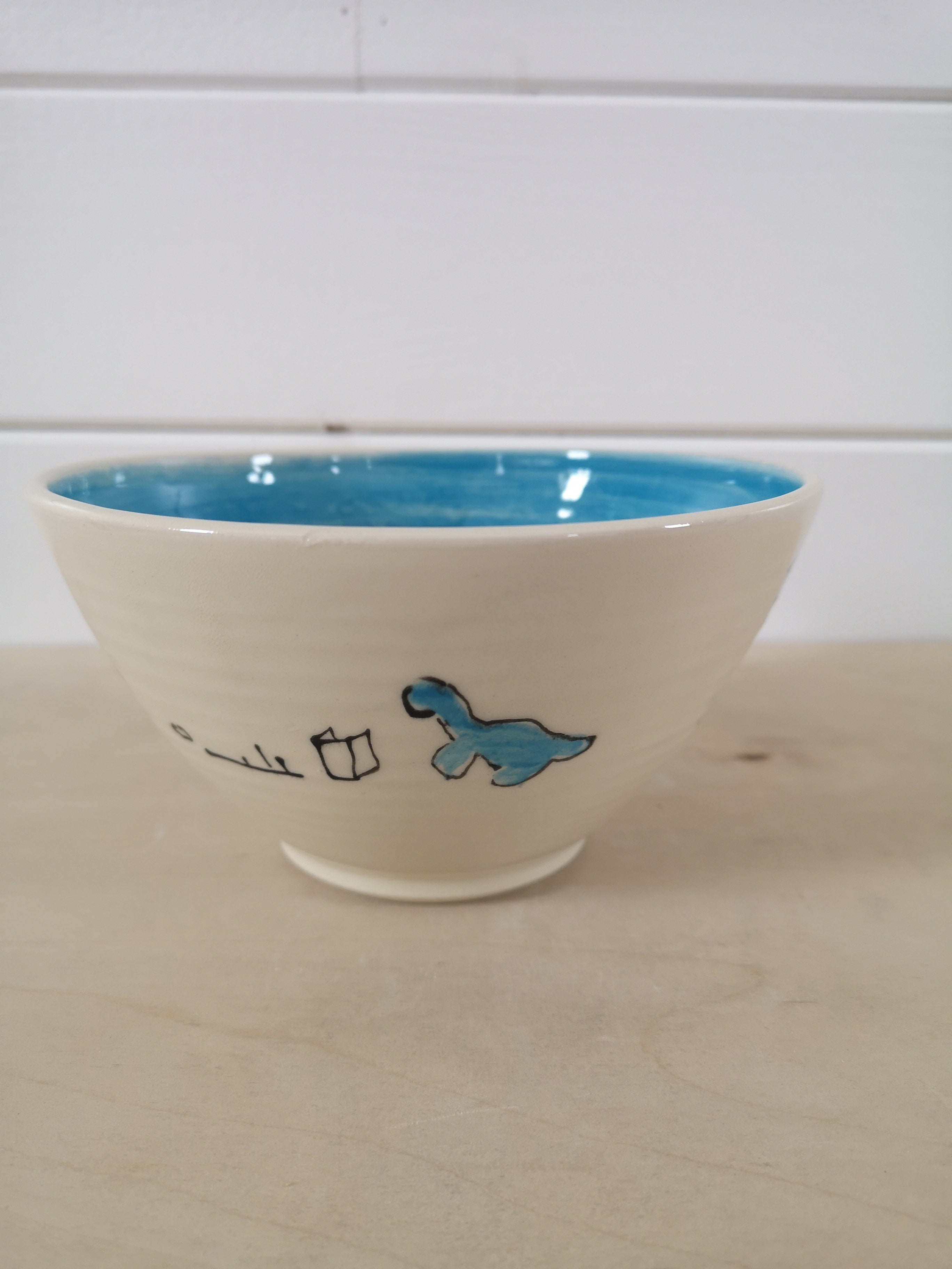 This handmade porcelain bowl features a cartoon of Robot and Dinosaur playing a popular RPG. Robot is doing quite well. It's about 17 cm wide and 8 cm tall. (6 1/2 inches by 3 inches.) The inside is glazed bright blue.