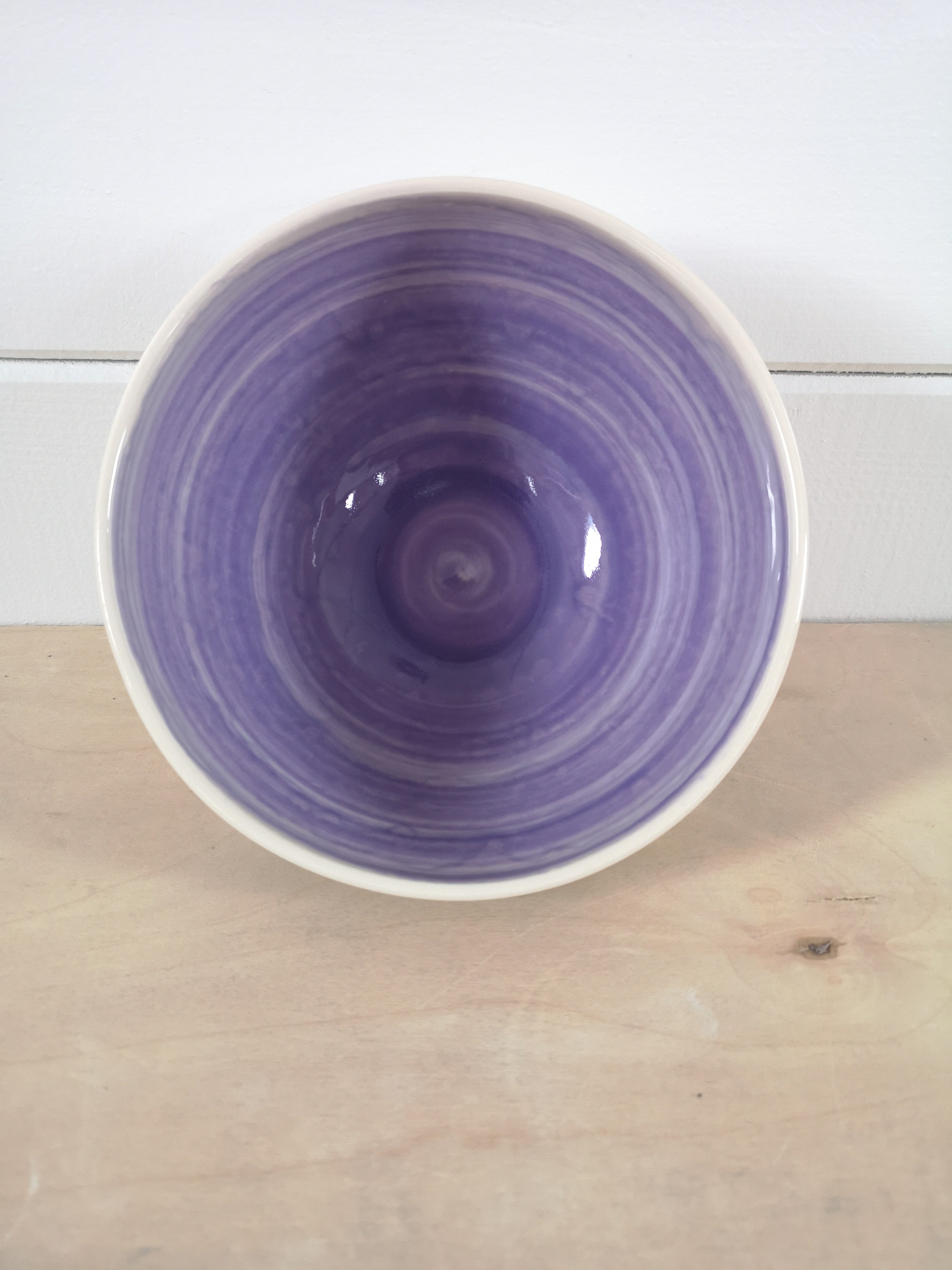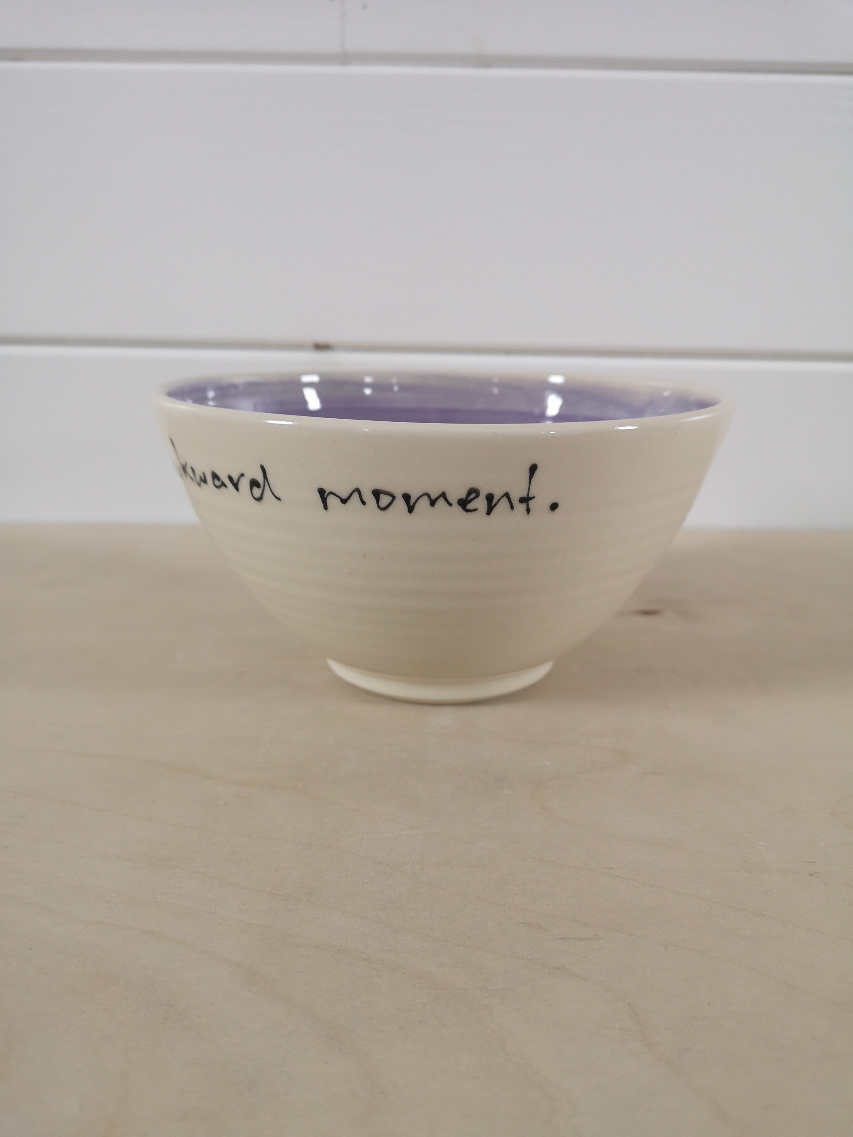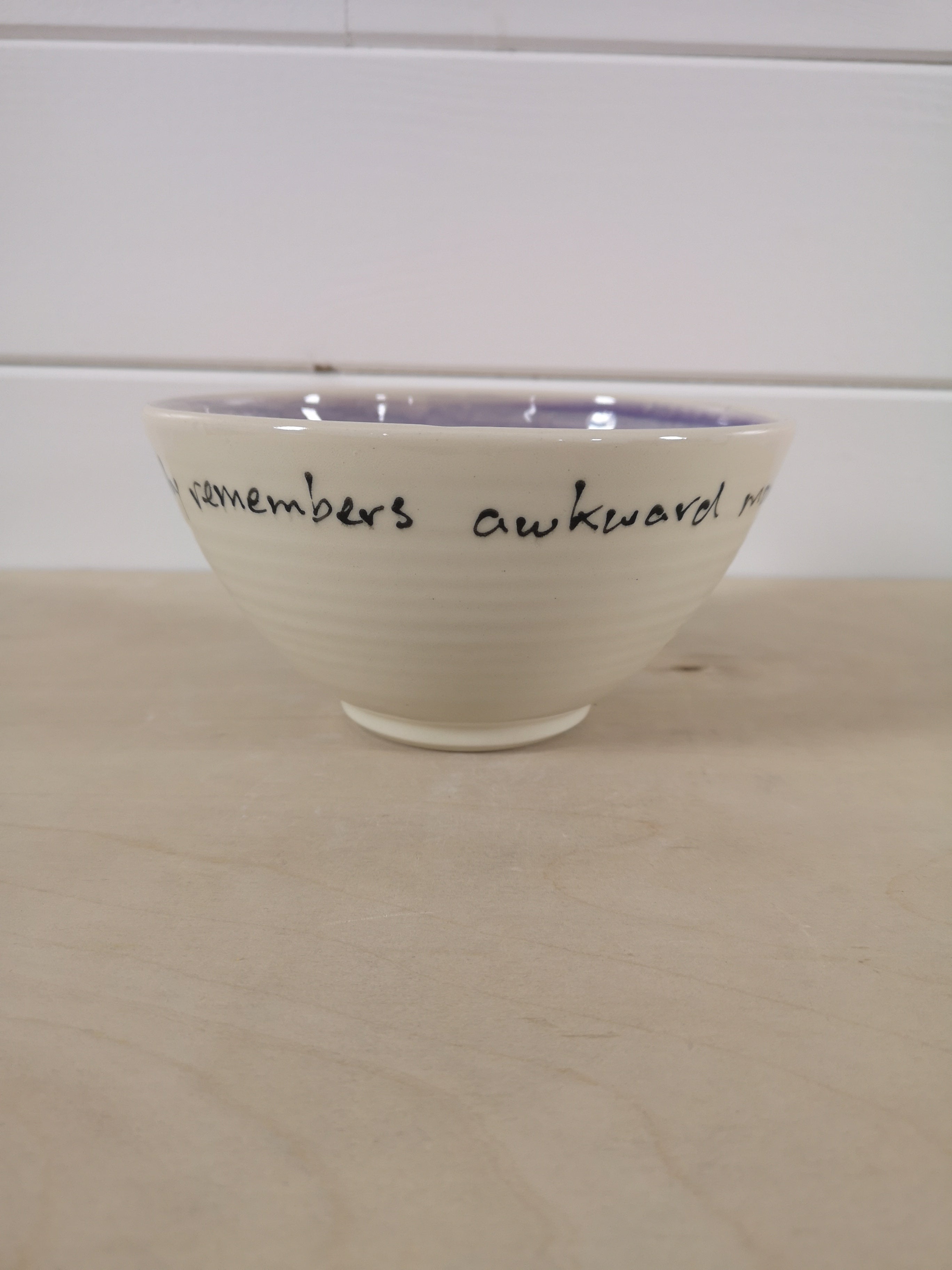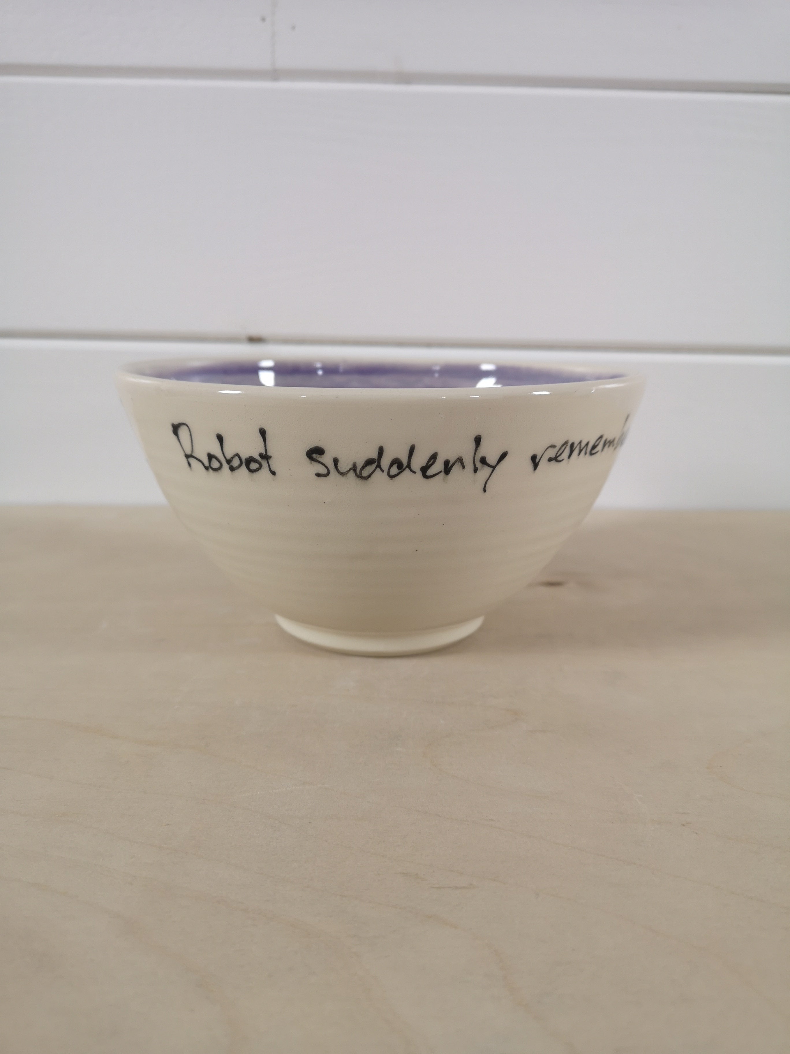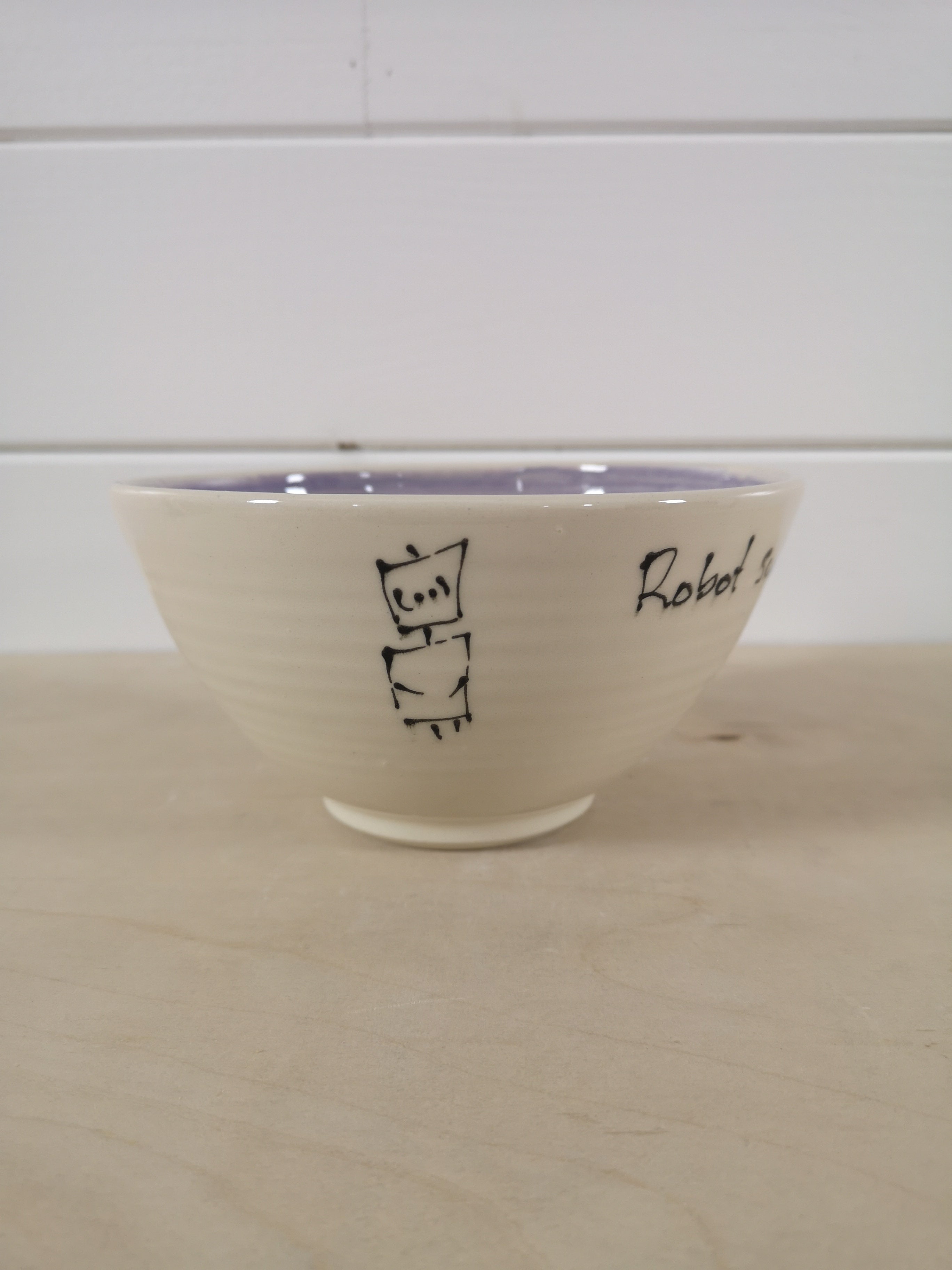 This handmade porcelain bowl features a cartoon of Robot looking mortified. It's about 17 cm wide and 8 cm tall. (6 1/2 inches by 3 inches.) The inside is glazed purple.