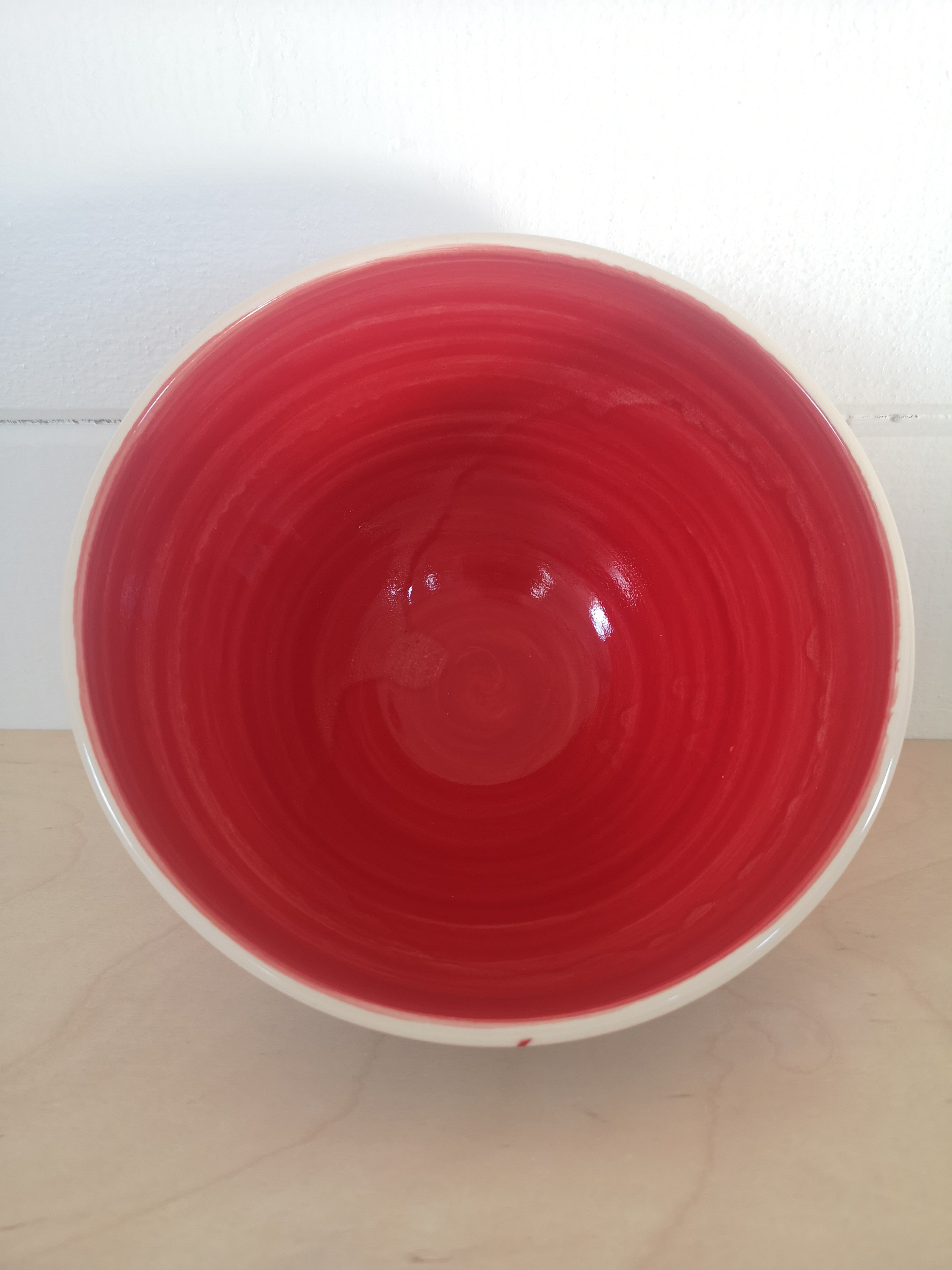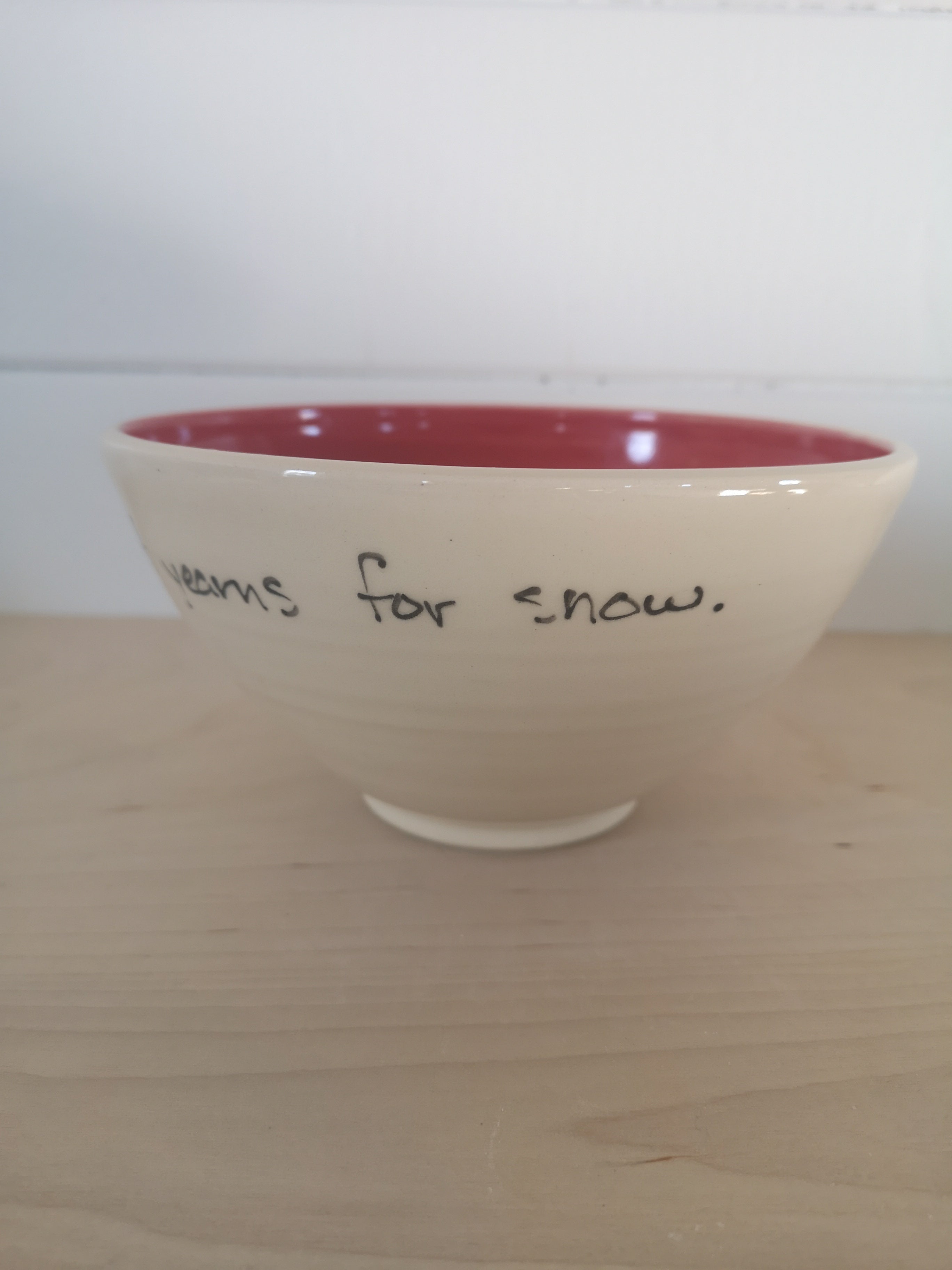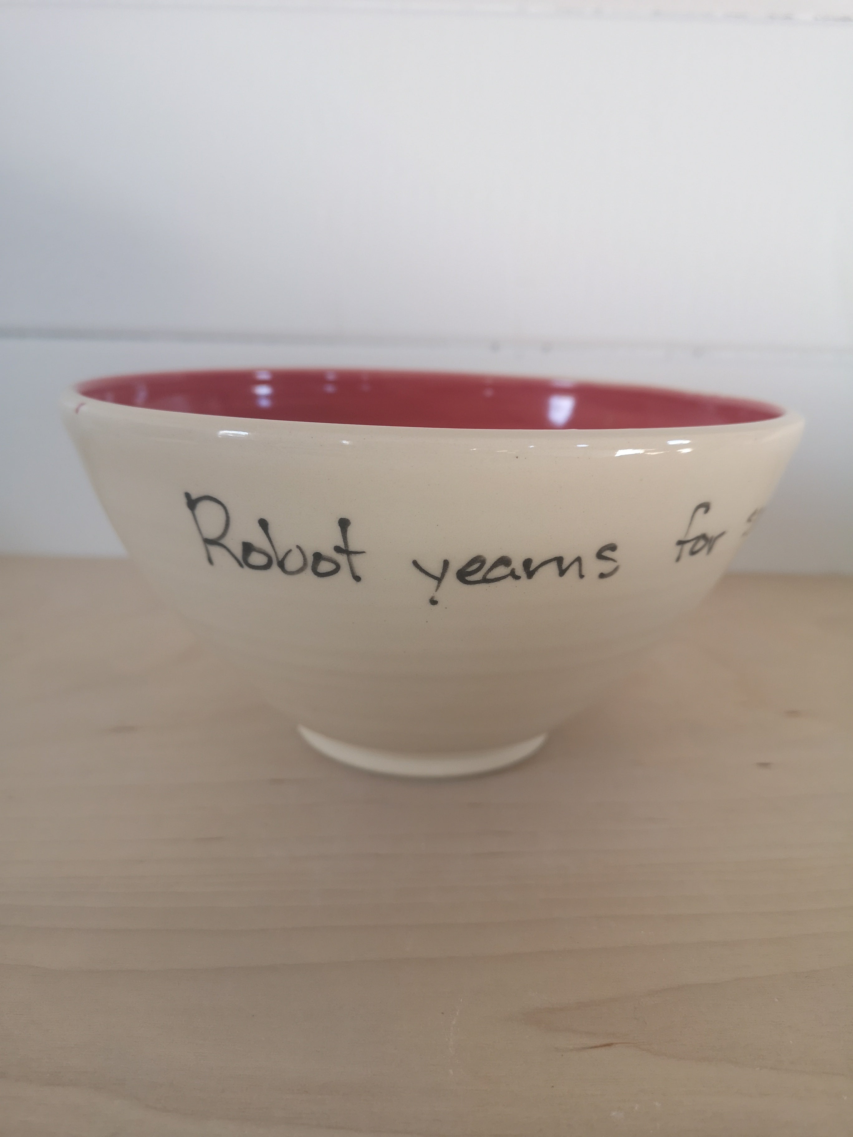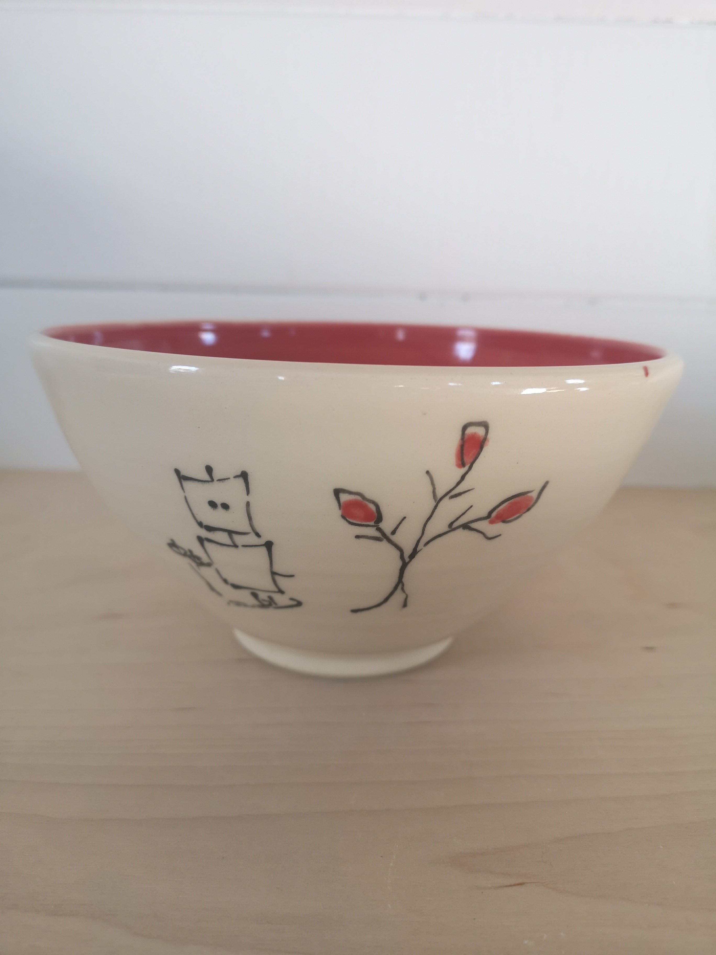 This handmade porcelain bowl features a cartoon of Robot in skis, looking at a tree with a few fall leaves hanging on. It's about 17 cm wide and 8 cm tall. (6 1/2 inches by 3 inches.)