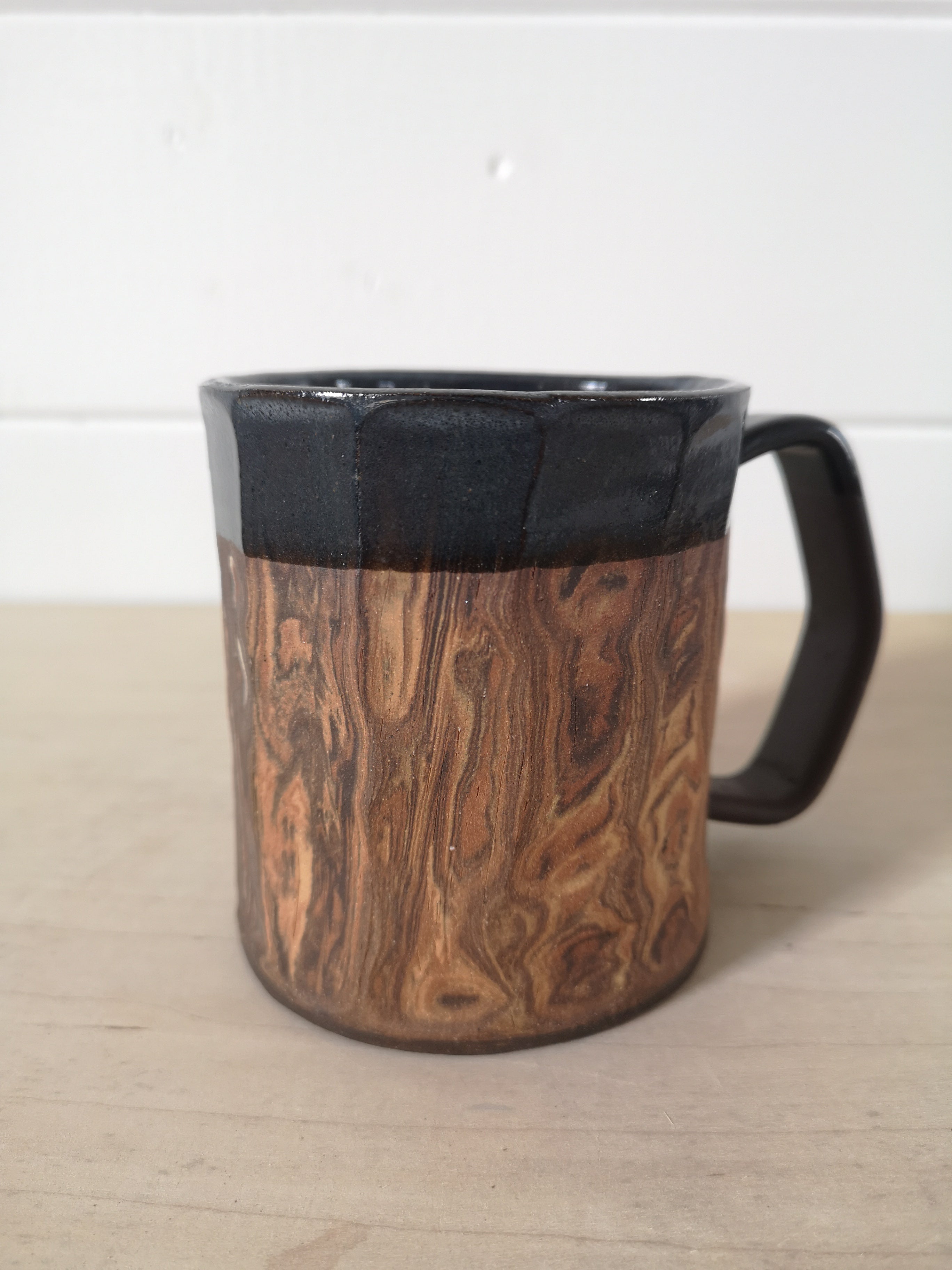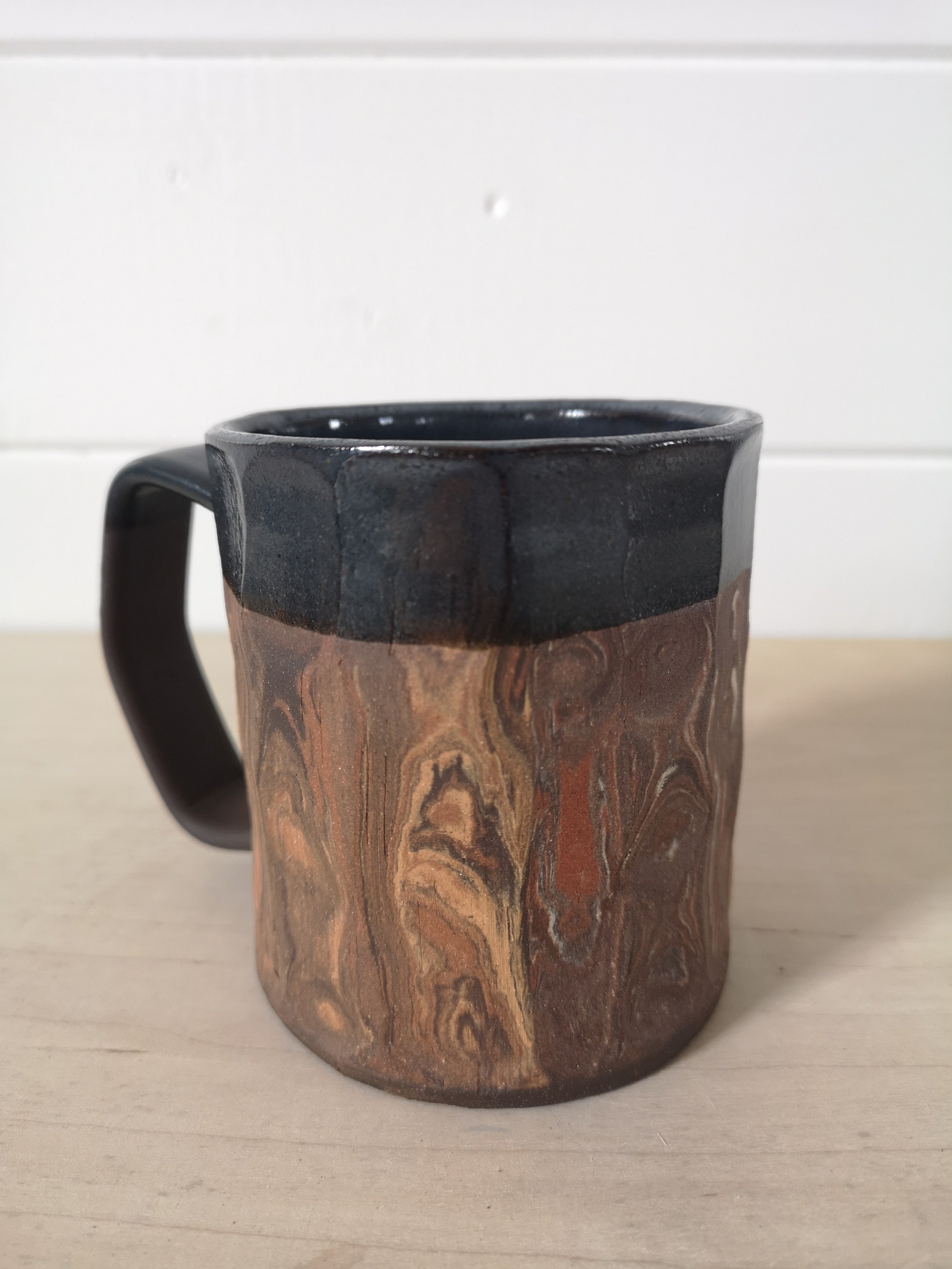 When Jason makes these mugs, he says, "I start by layering and patterning different colours of clay into blocks. I then roll the blocks into slabs, which I cut into pieces and use to handbuild the mugs. I then carve and facet the sides to reveal the patterns in the clay. Each mug is unique and impossible to replicate."