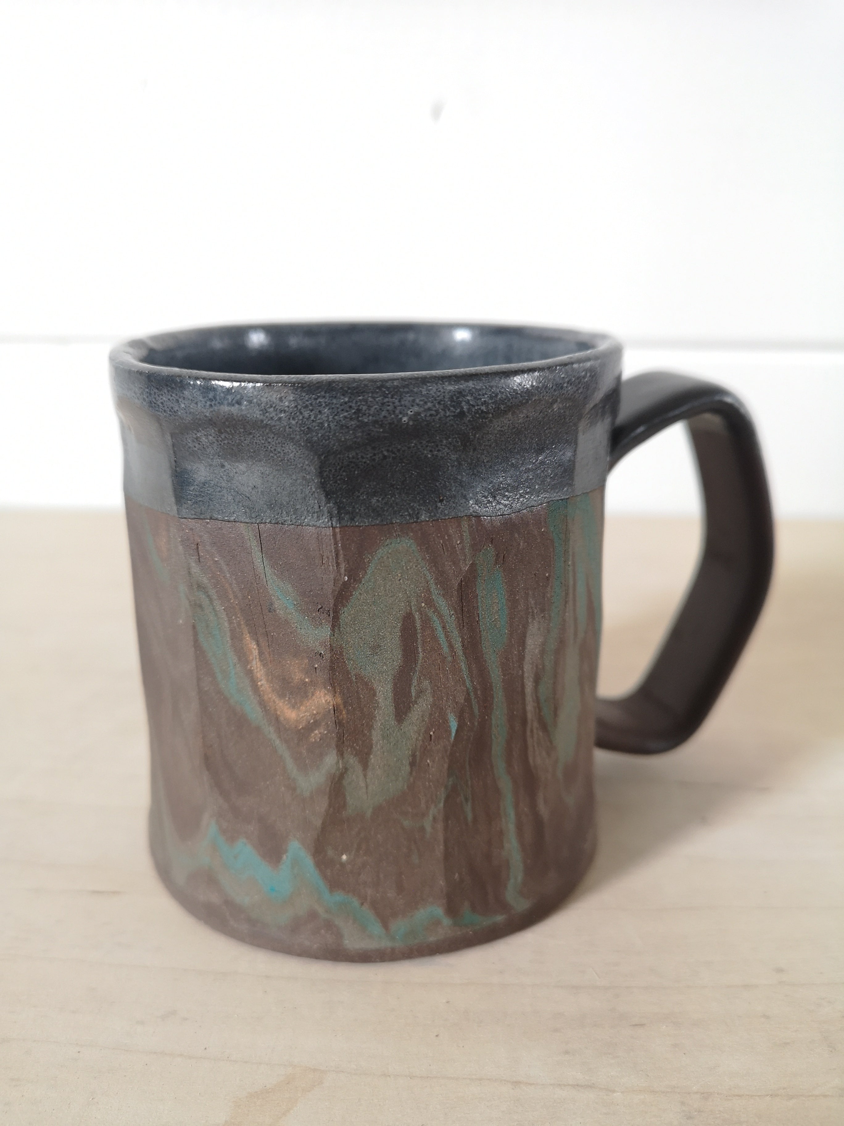 When Jason makes these mugs, he says, "I start by layering and patterning different colours of clay into blocks. I then roll the blocks into slabs, which I cut into pieces and use to handbuild the mugs. I then carve and facet the sides to reveal the patterns in the clay. Each mug is unique and impossible to replicate."