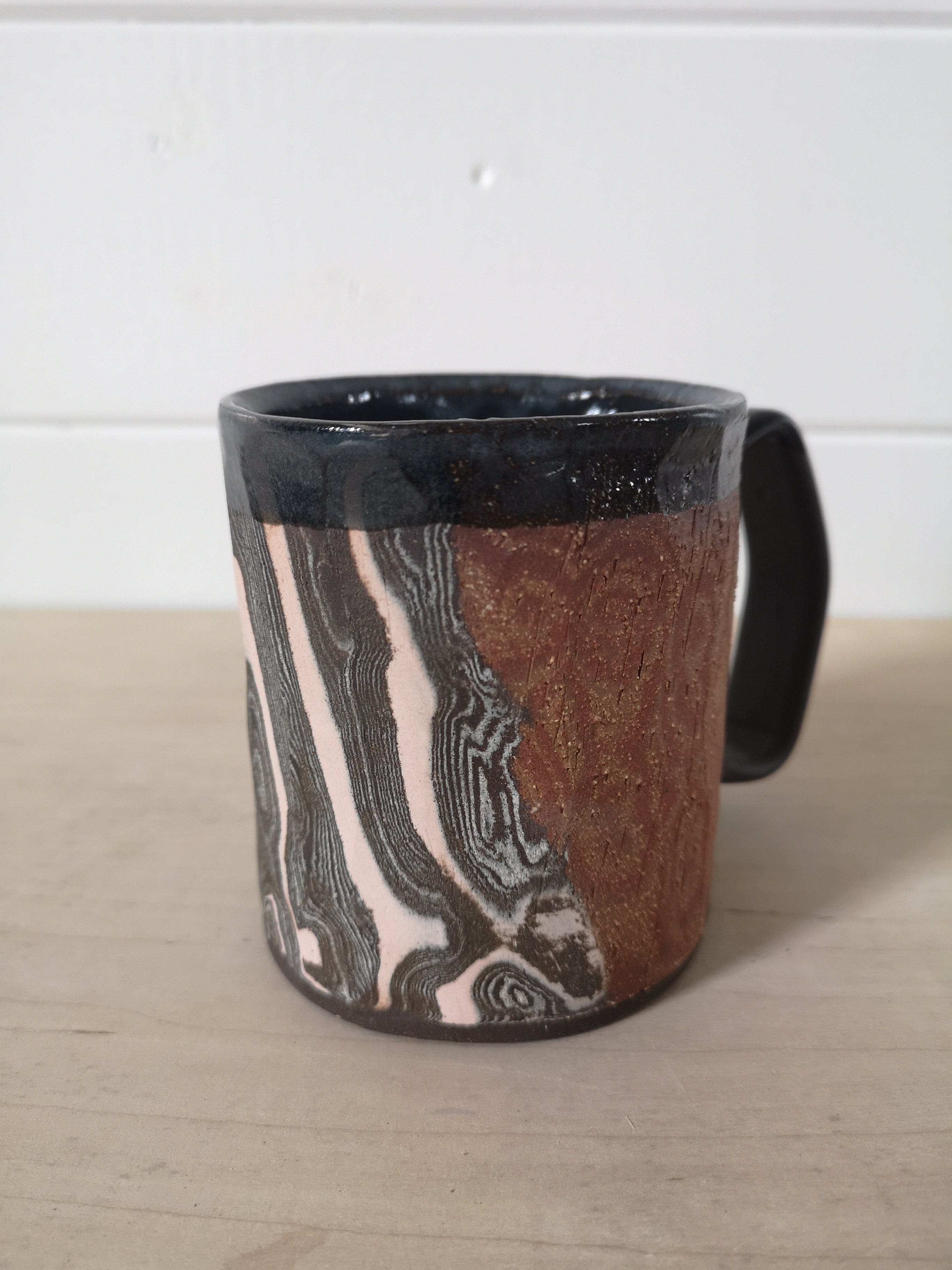 When Jason makes these mugs, he says, "I start by layering and patterning different colours of clay into blocks. I then roll the blocks into slabs, which I cut into pieces and use to handbuild the mugs. I then carve and facet the sides to reveal the patterns in the clay. Each mug is unique and impossible to replicate."