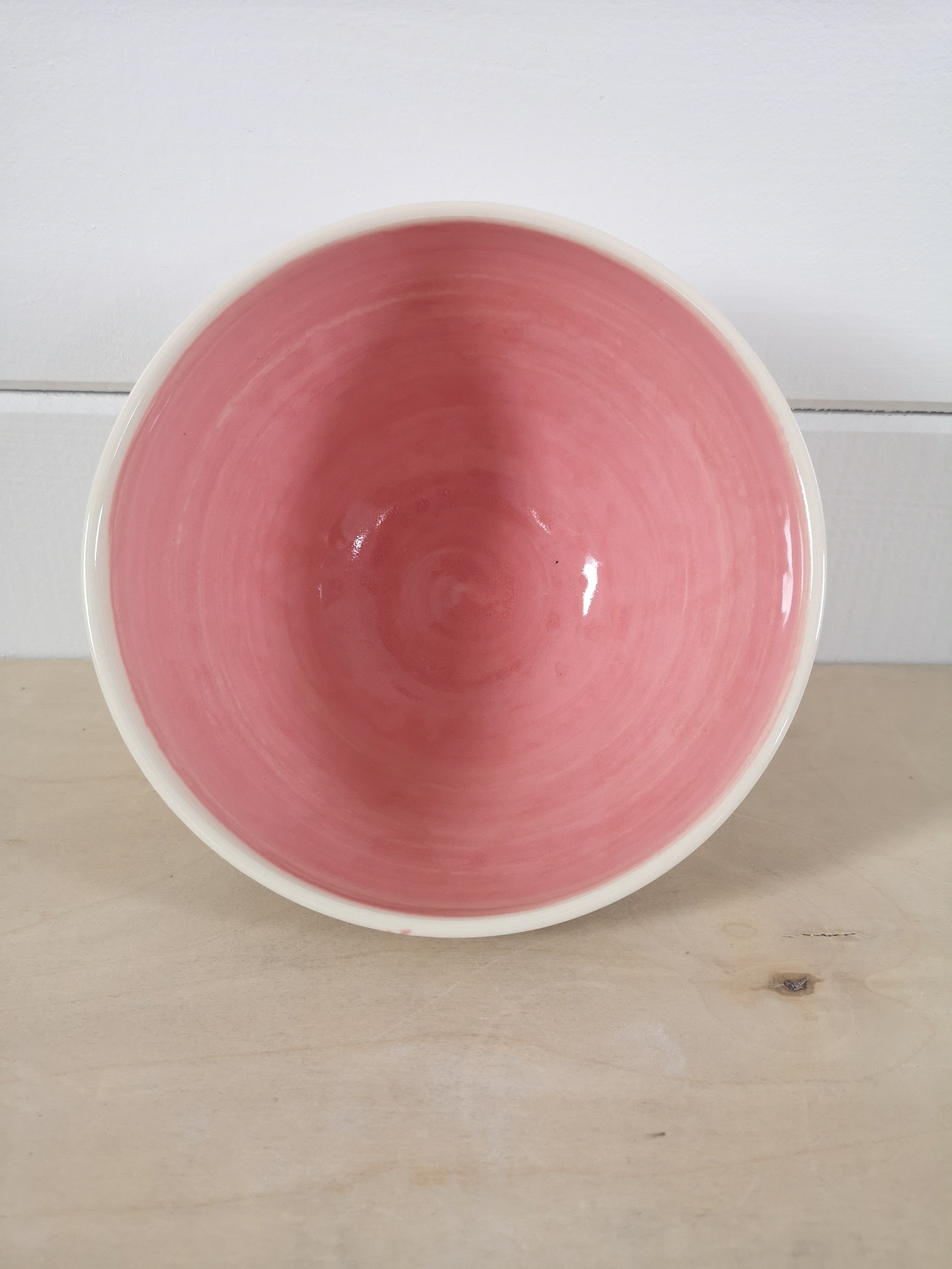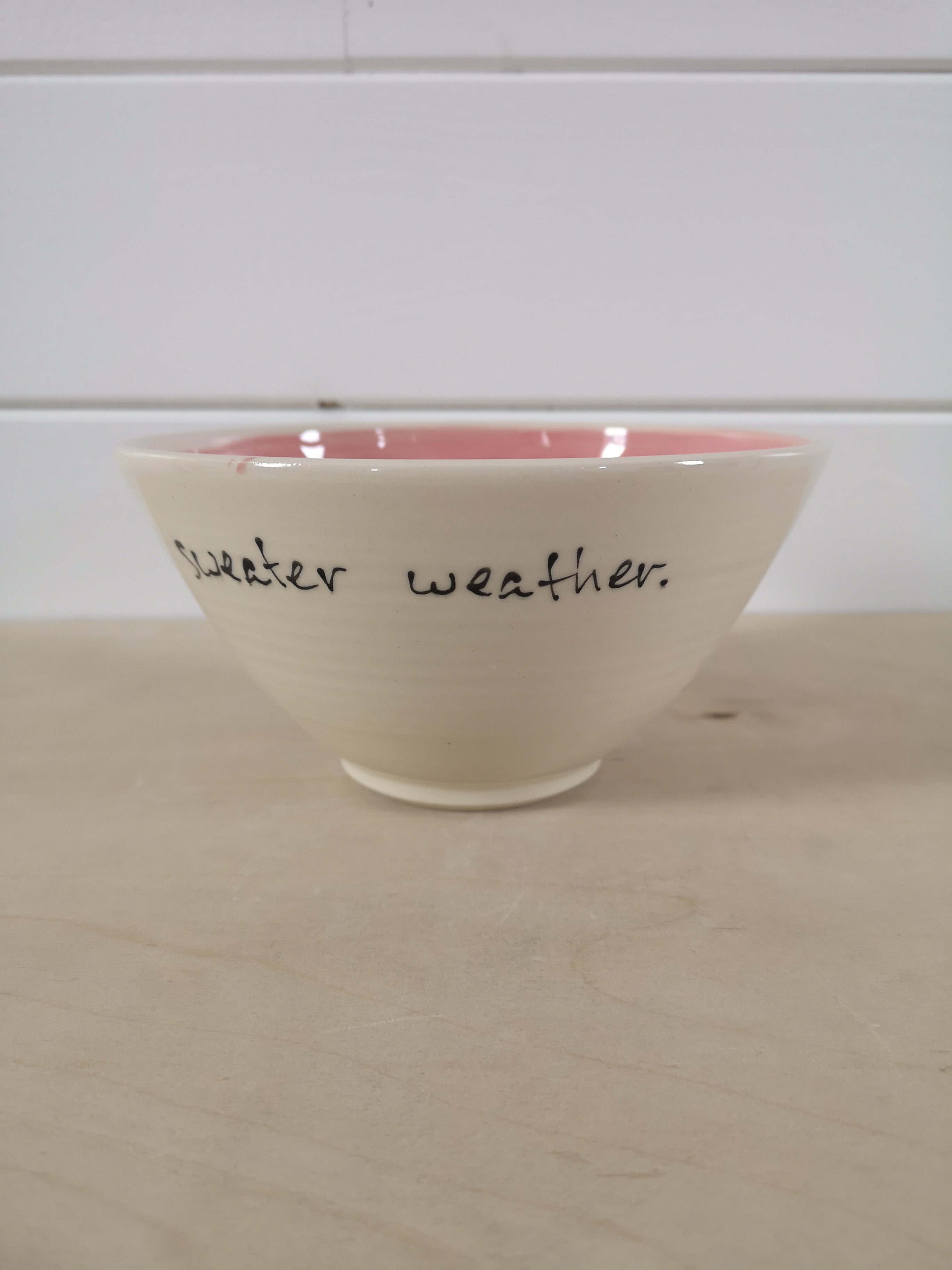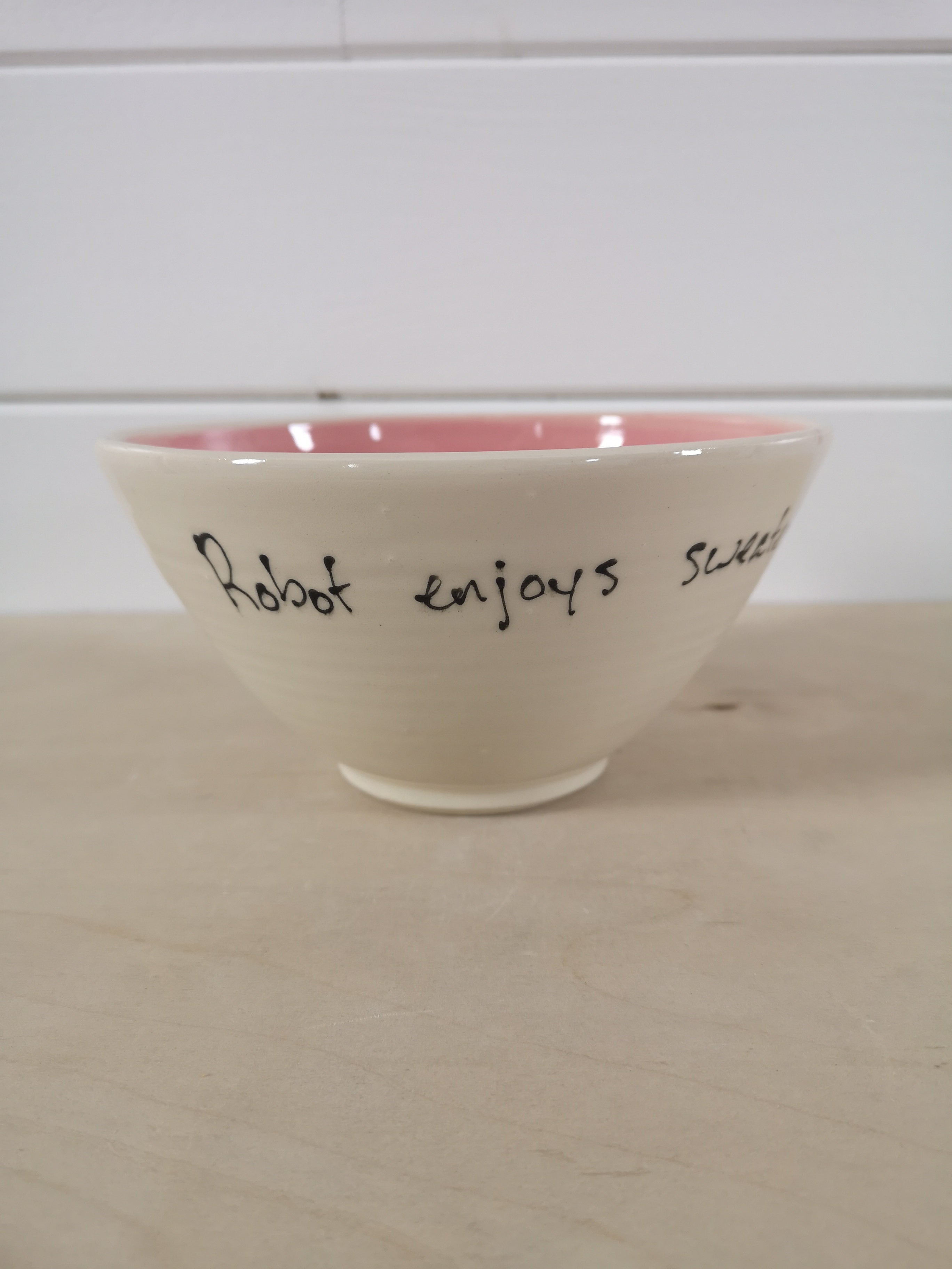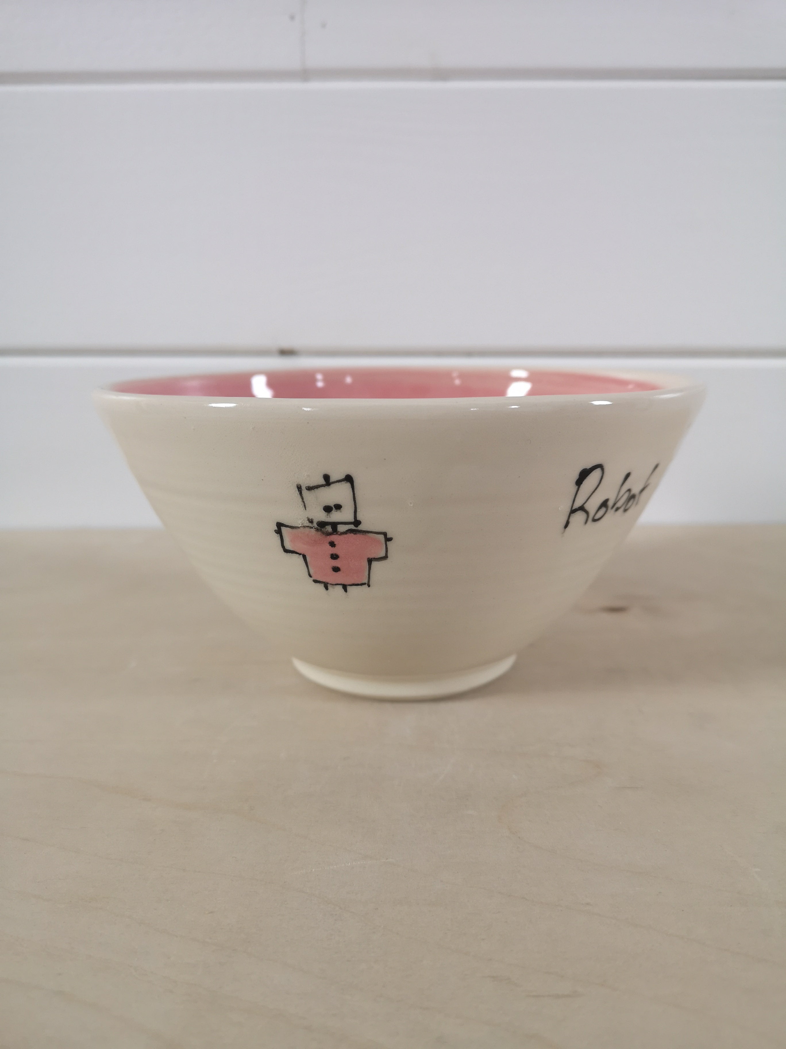 This handmade porcelain bowl features a cartoon of Robot wearing a very large sweater. It's about 17 cm wide and 8 cm tall. (6 1/2 inches by 3 inches.) The inside is glazed bright pink.