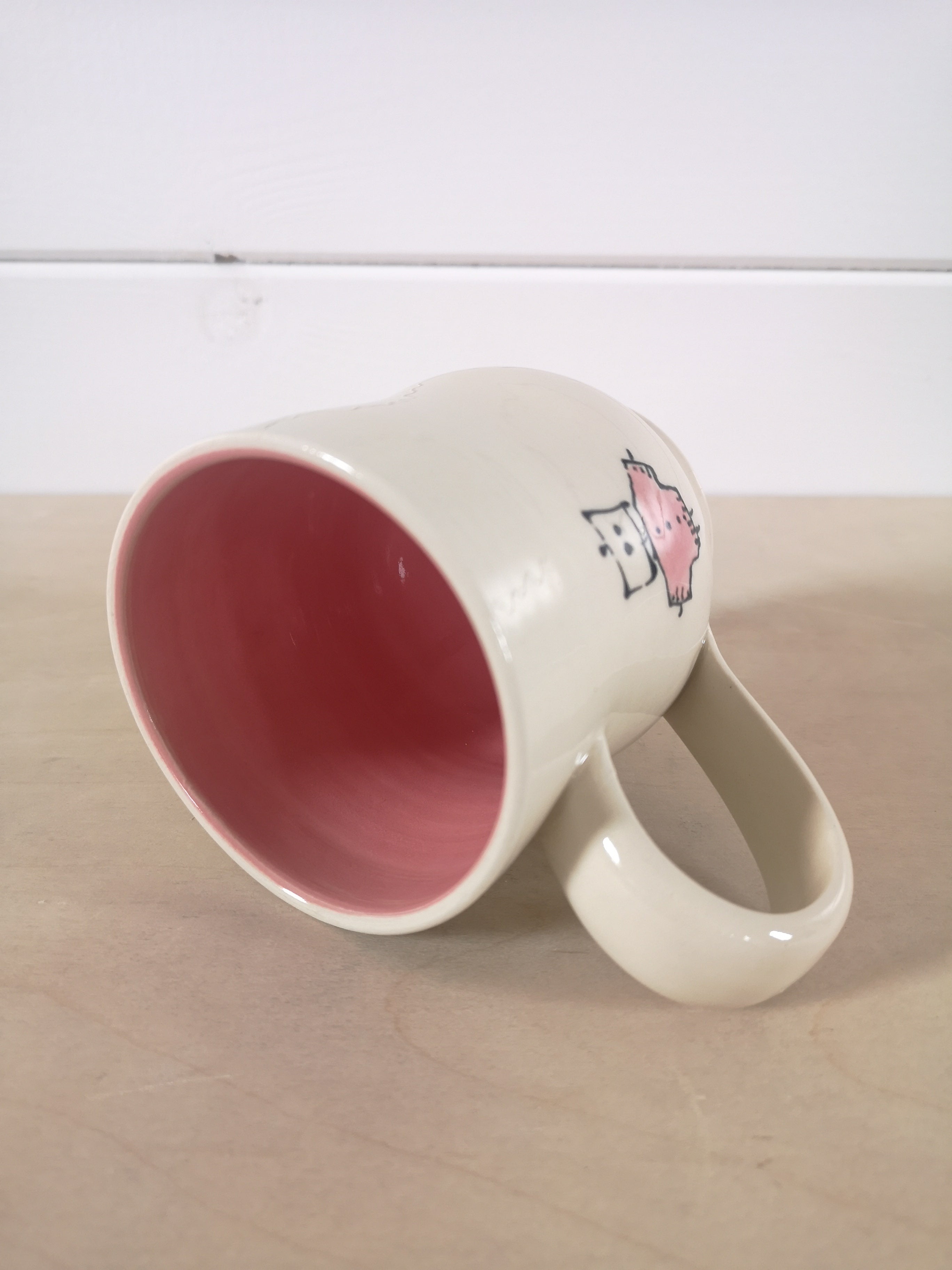 This handmade porcelain mug holds about 475mL/16oz. The inside is painted pink.