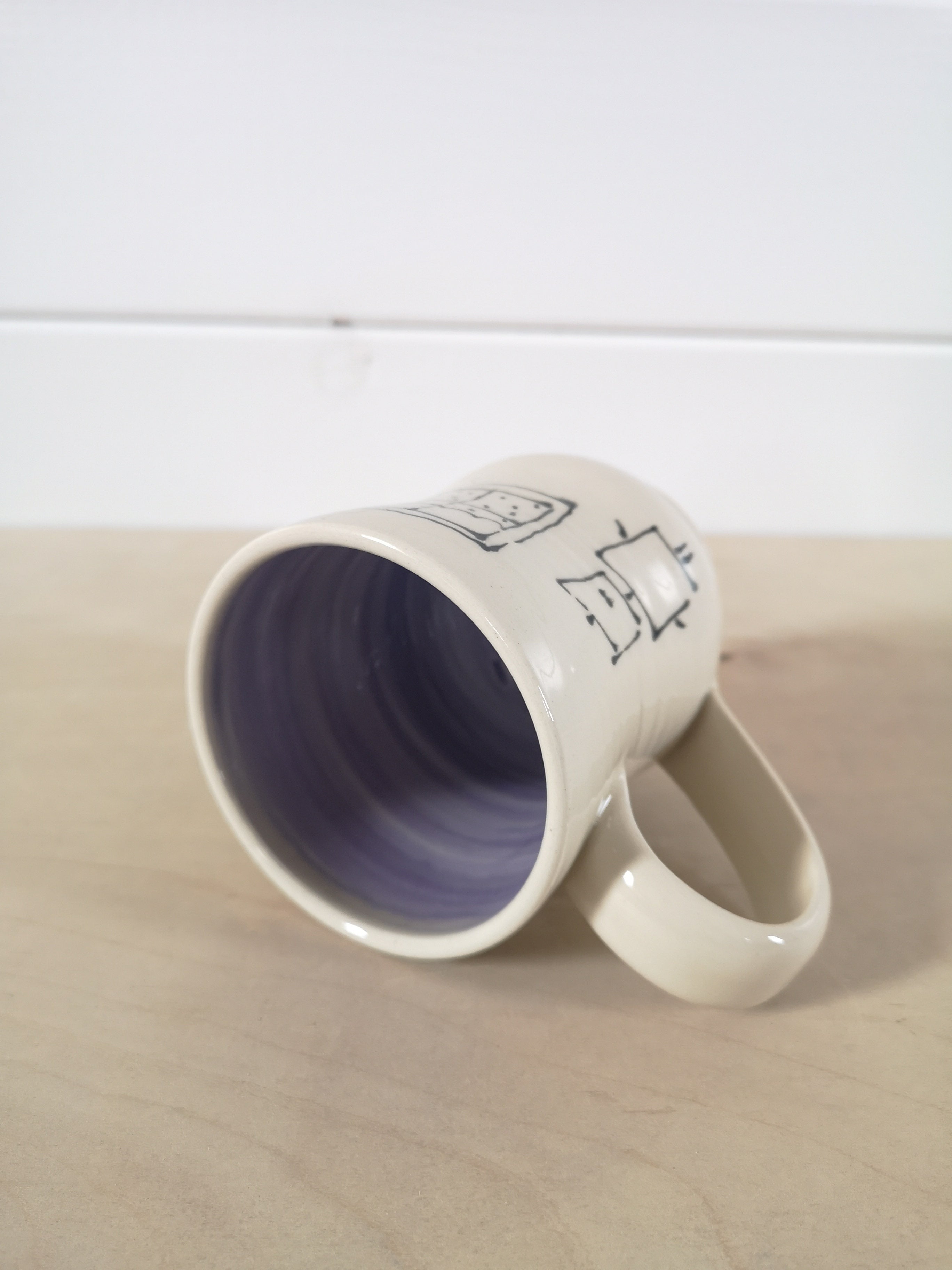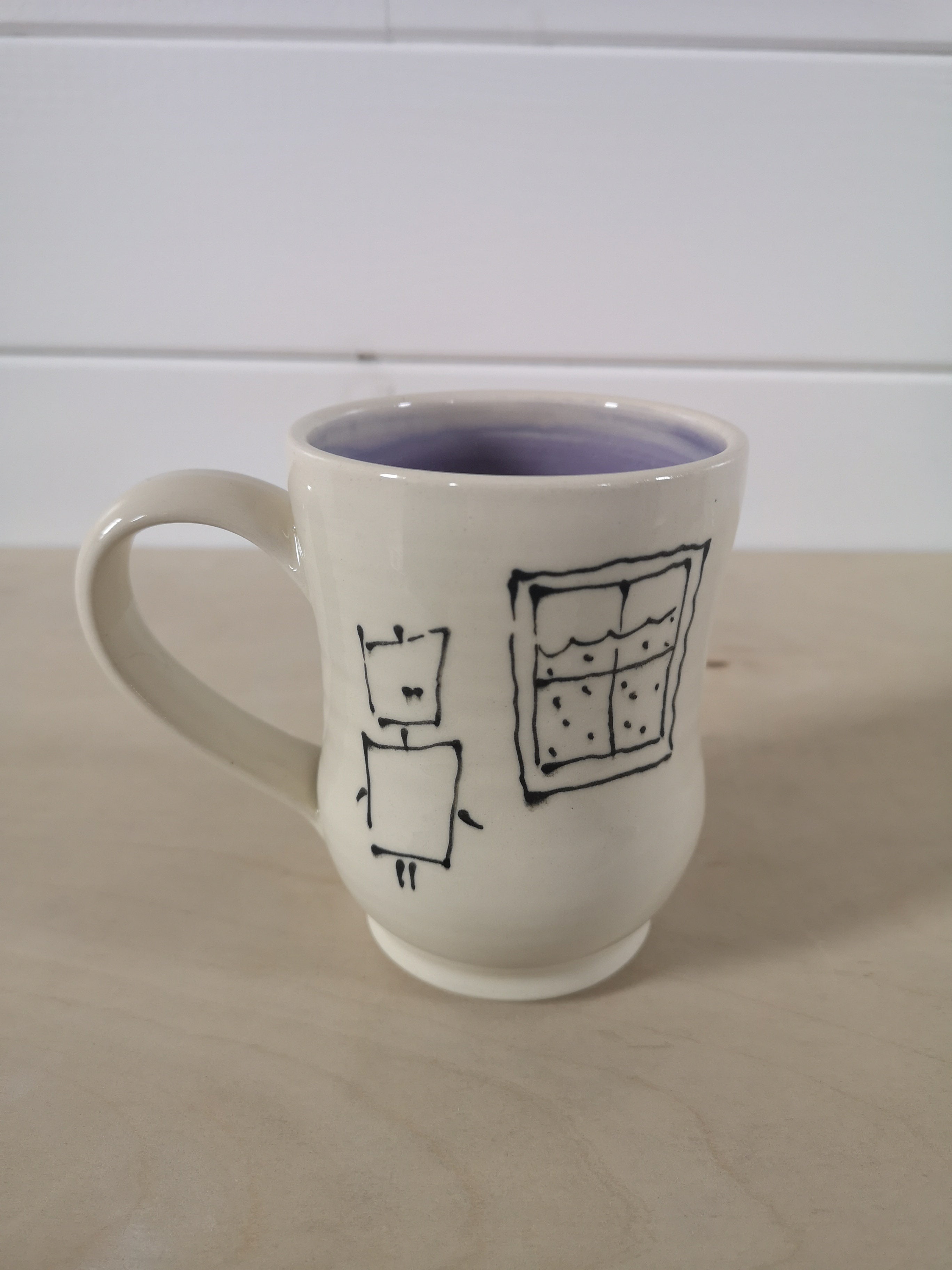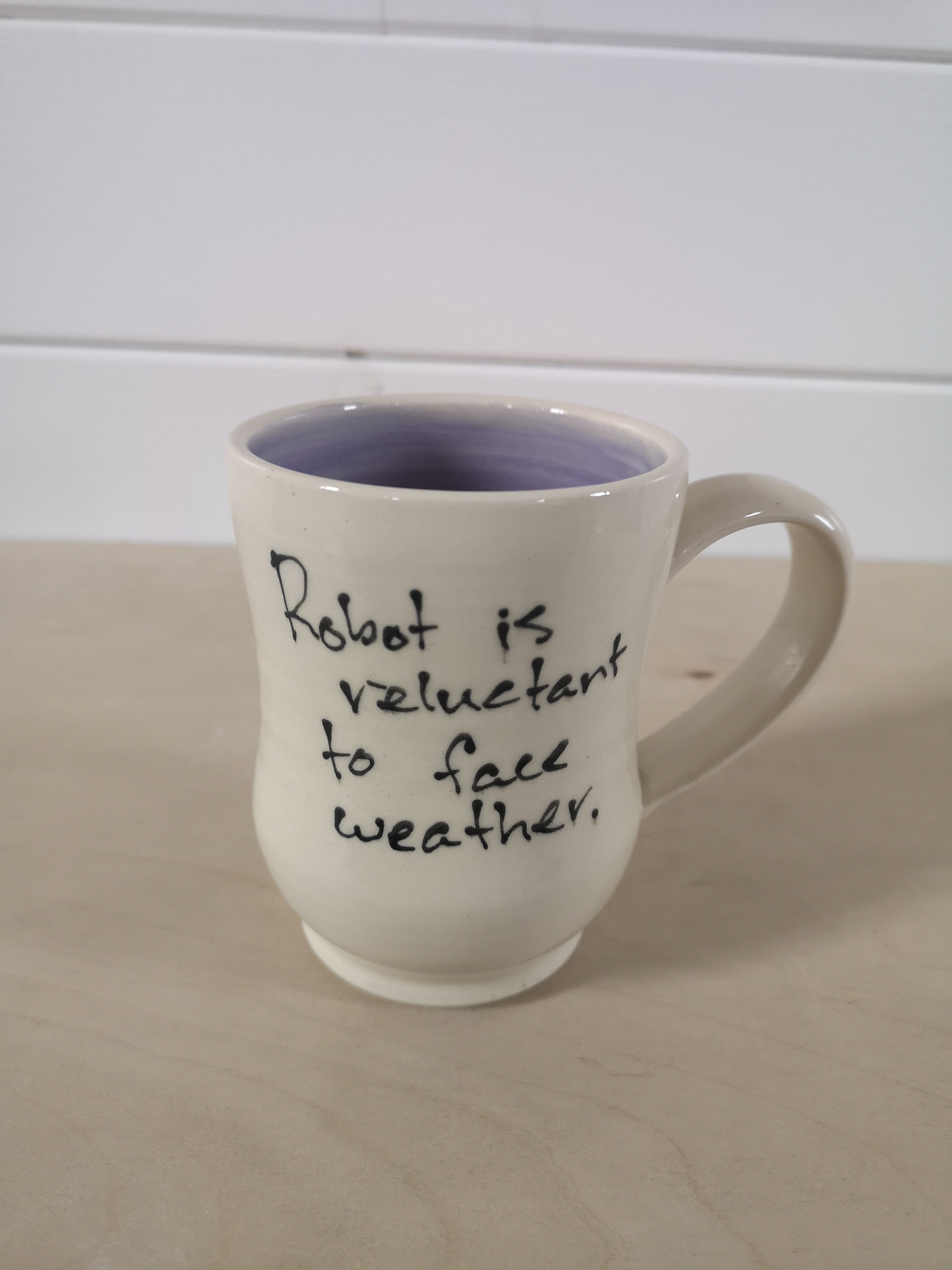 This handmade porcelain mug features a cartoon of Robot, looking out a window at the rain. It holds about 475 ml/16 oz.